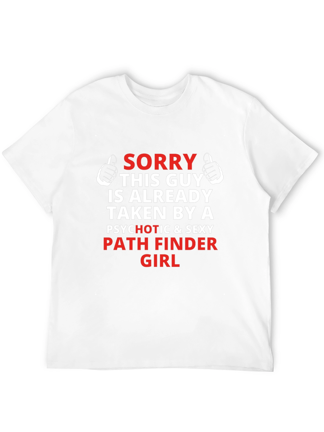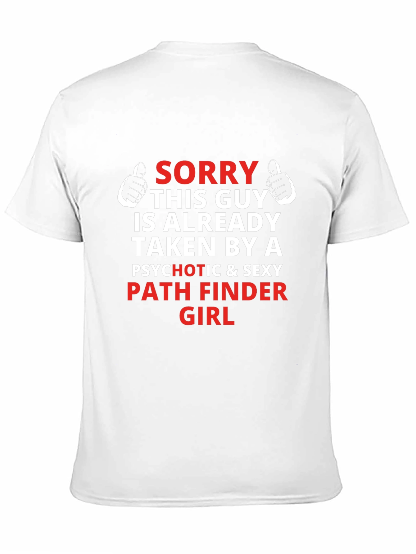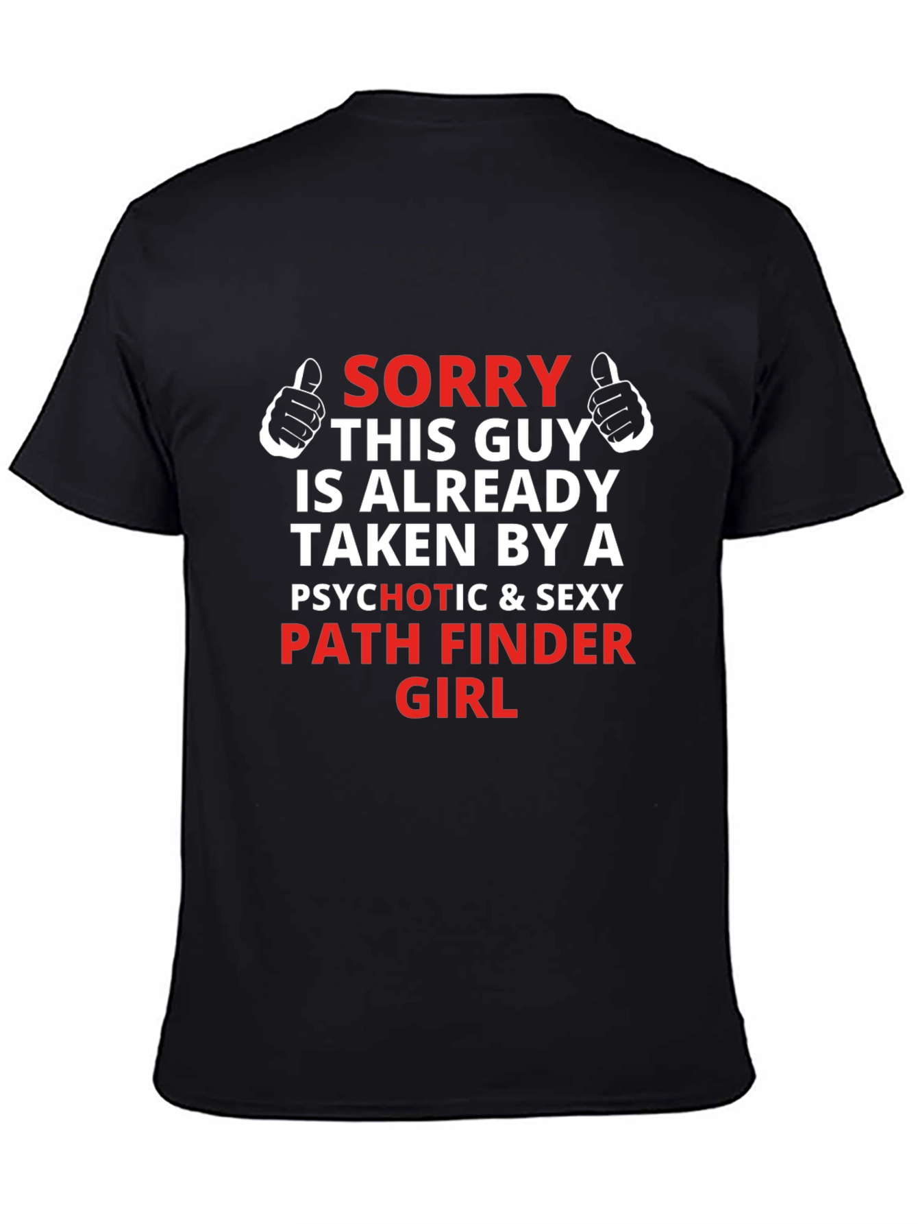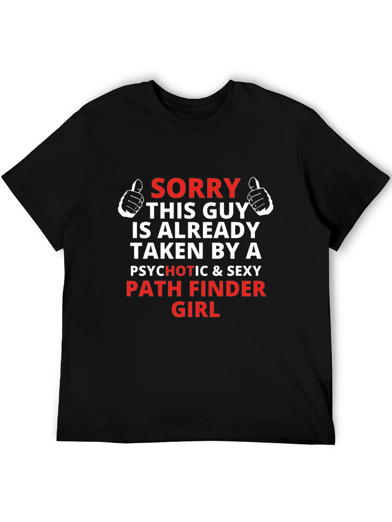 Muestra tu humor con esta camiseta negra para hombre. El diseño presenta un texto llamativo en blanco y rojo que dice: "Sorry, This Guy is Already Taken By a Psychotic & Sexy Pathfinder Girl". Dos ilustraciones de pulgares arriba en blanco flanquean la palabra "Sorry". Esta camiseta de corte clásico parece estar hecha de algodón suave, ideal para uso diario casual. Una opción perfecta para hombres con sentido del humor y parejas aventureras. Ideal para regalar a tu pareja o para llevar en salidas informales.