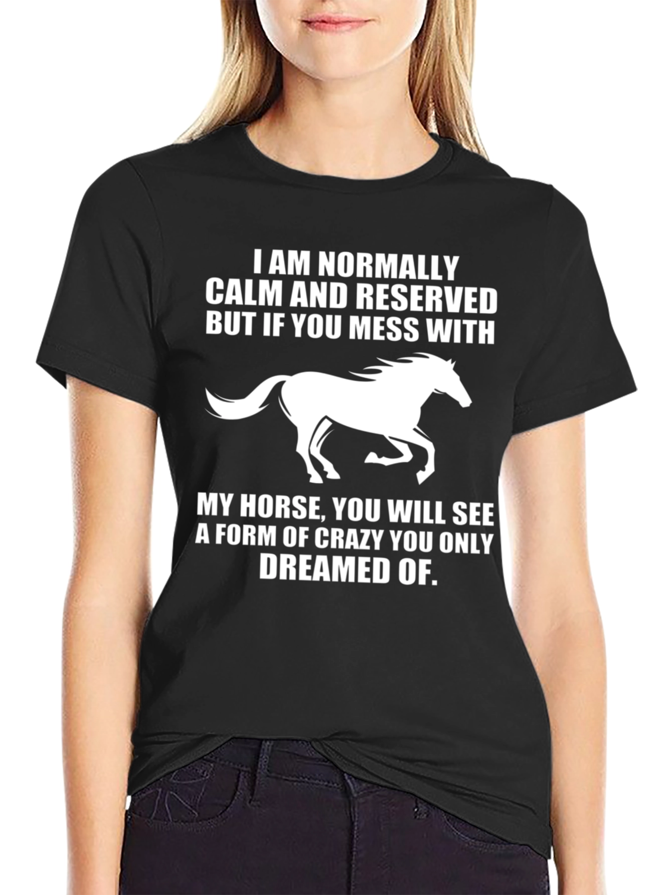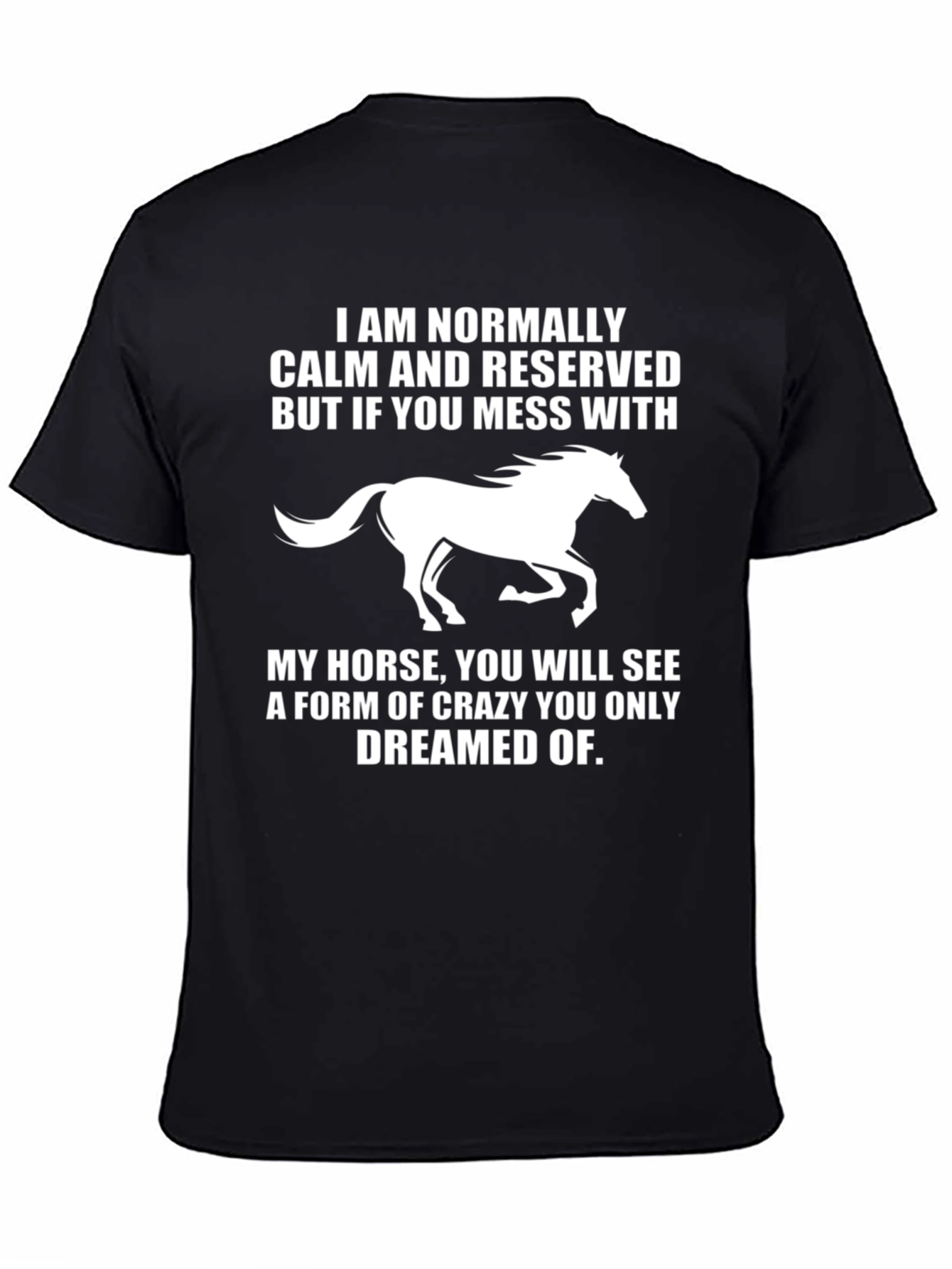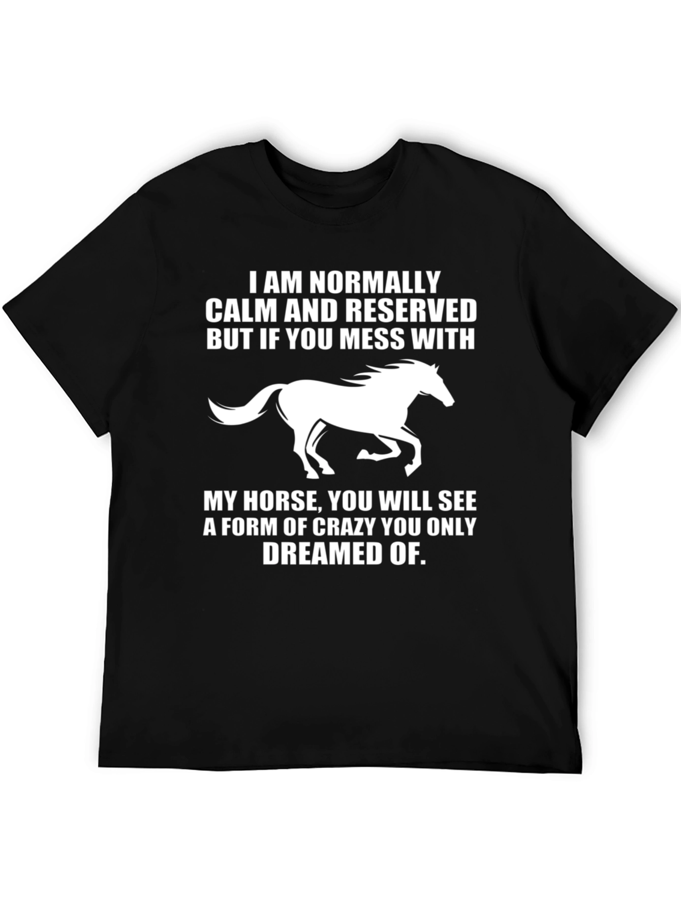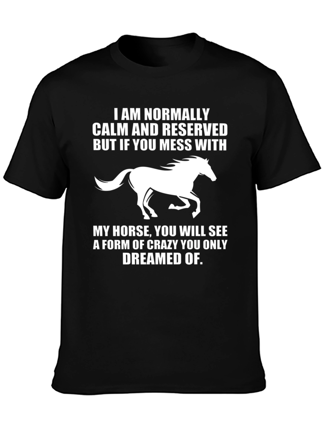 Luce esta llamativa camiseta negra para hombre con un diseño único. Presenta una frase divertida en letras blancas: "I AM NORMALLY CALM AND RESERVED BUT IF YOU MESS WITH MY HORSE, YOU WILL SEE A FORM OF CRAZY YOU ONLY DREAMED OF." (Normalmente soy tranquilo y reservado, pero si te metes con mi caballo, verás una forma de locura con la que solo has soñado). La camiseta también incluye la silueta de un caballo blanco corriendo, lo que la hace perfecta para los amantes de los caballos y aquellos con un sentido del humor audaz. Ideal para uso casual, eventos ecuestres o como un regalo original. Confeccionada en un material suave y cómodo, esta camiseta te permitirá expresar tu personalidad con estilo.