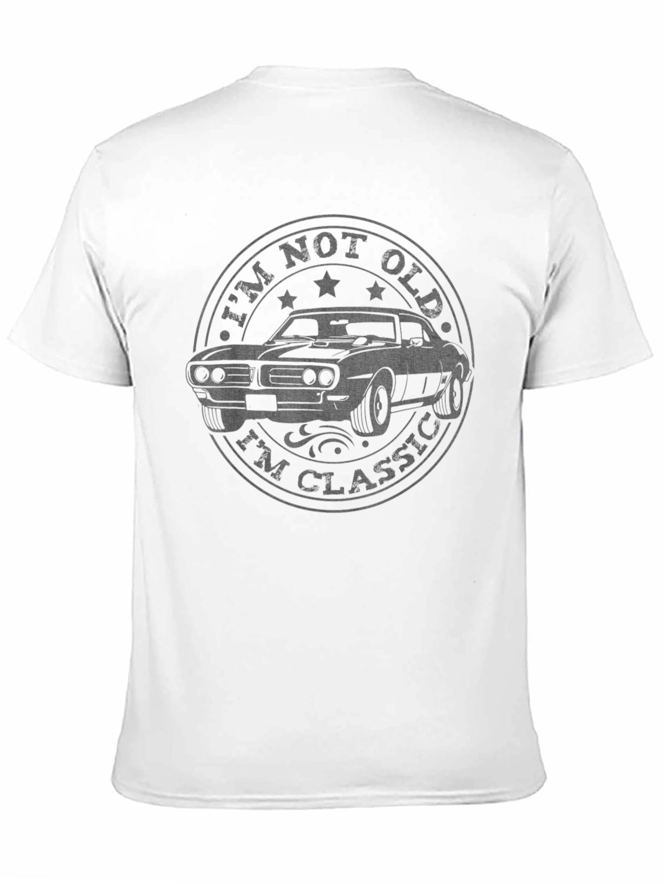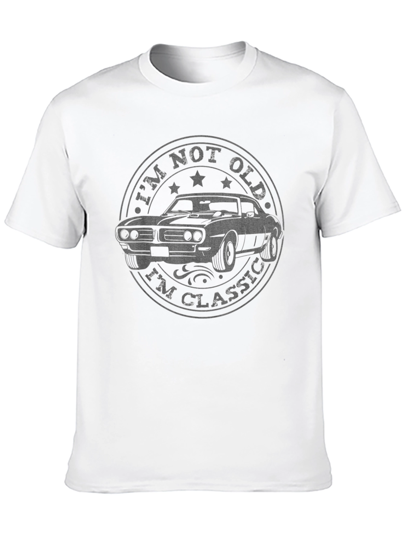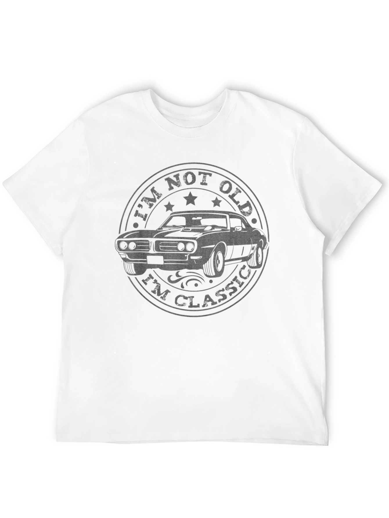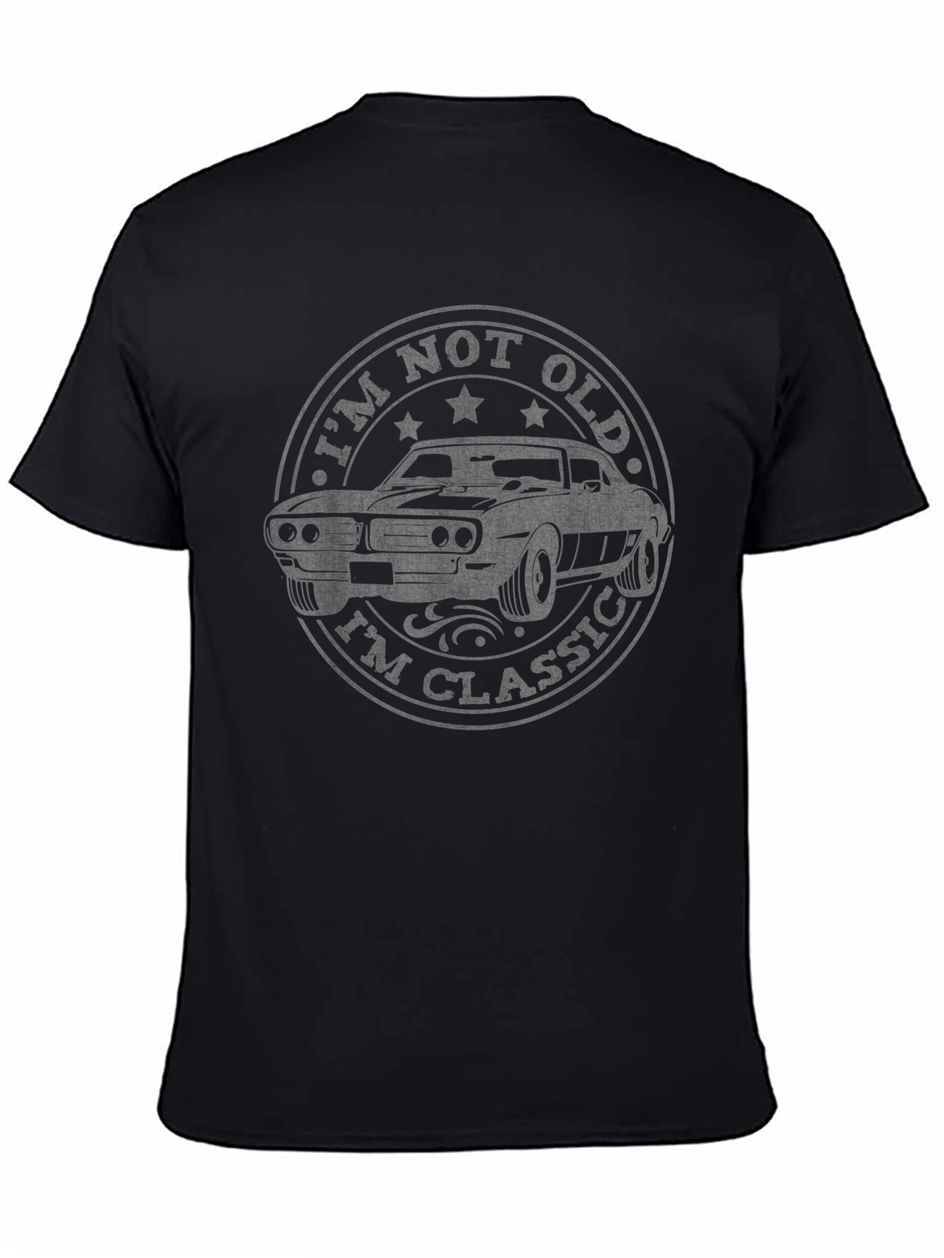 Esta camiseta negra para hombre presenta un diseño clásico y llamativo. En el centro, se puede apreciar un gráfico circular con un coche antiguo estilizado, rodeado de la frase "I'm Not Old, I'm Classic" (No soy viejo, soy clásico). La impresión tiene un efecto desgastado que le da un toque vintage. Ideal para los amantes de los coches clásicos y aquellos que aprecian un estilo retro con un mensaje ingenioso. Esta camiseta de manga corta es perfecta para uso casual, ya sea para salir con amigos, asistir a eventos de coches antiguos o simplemente para expresar tu pasión por lo clásico con un toque de humor. Su diseño único la convierte en una excelente opción para regalar.