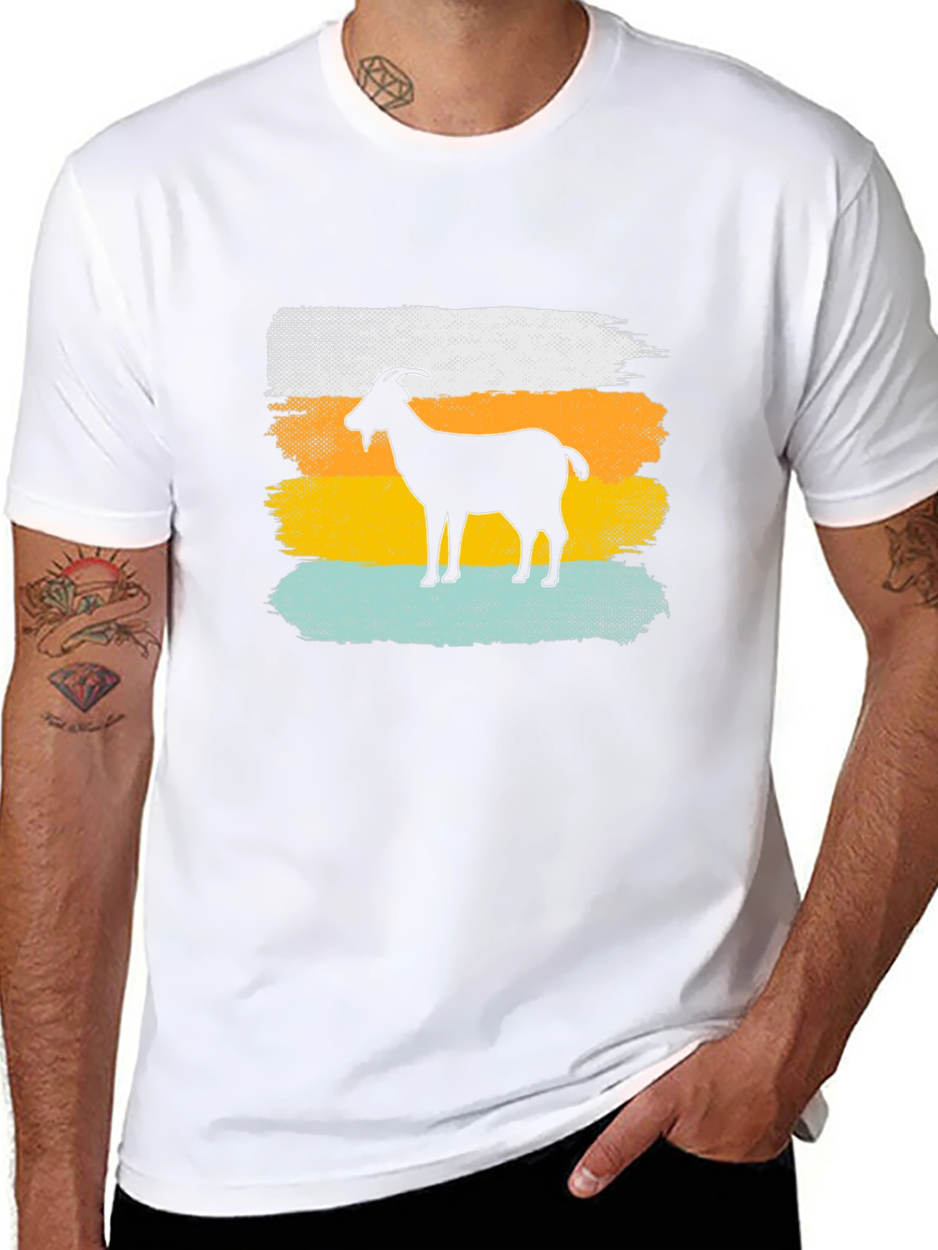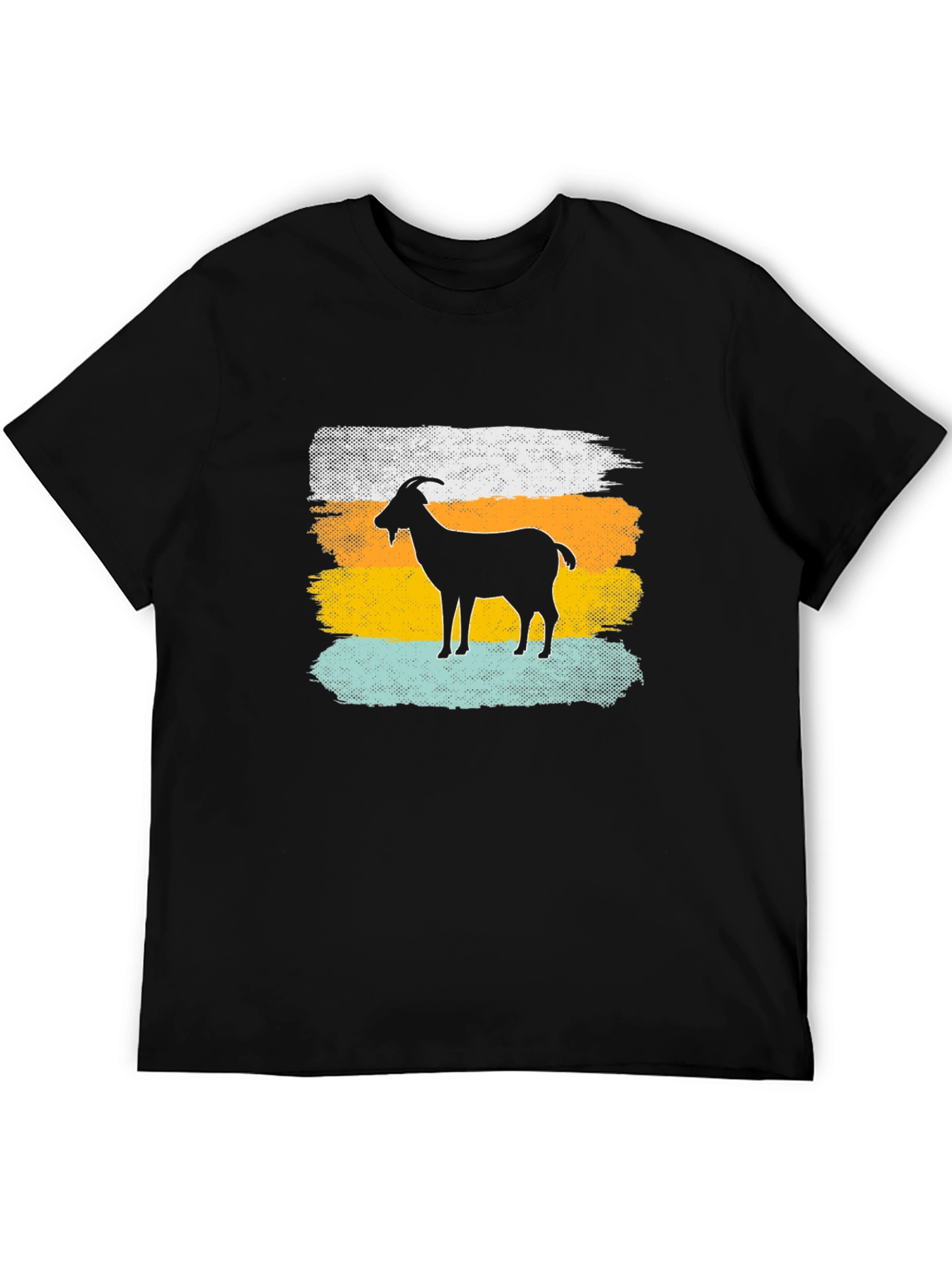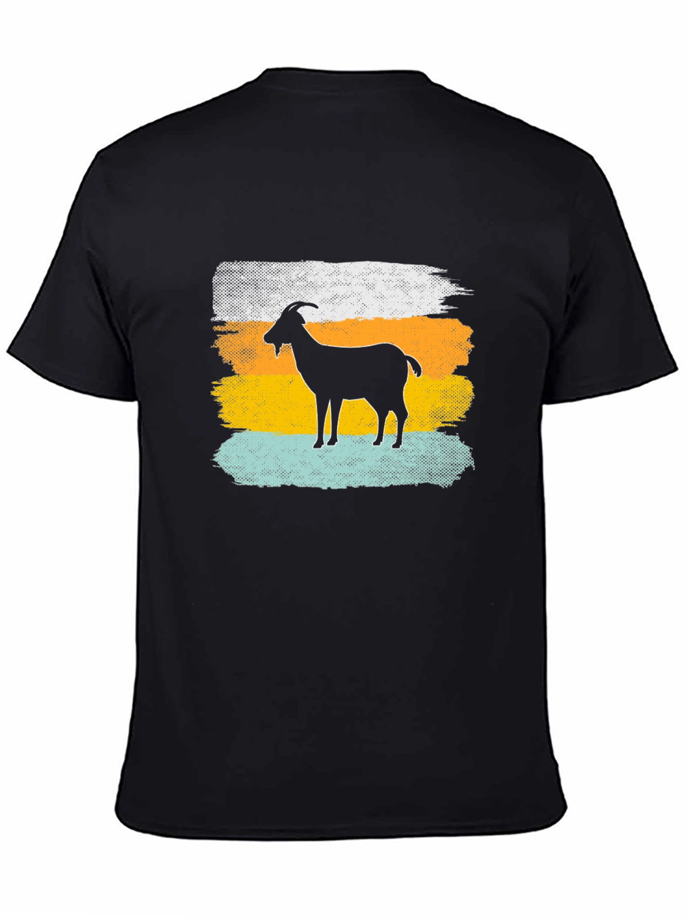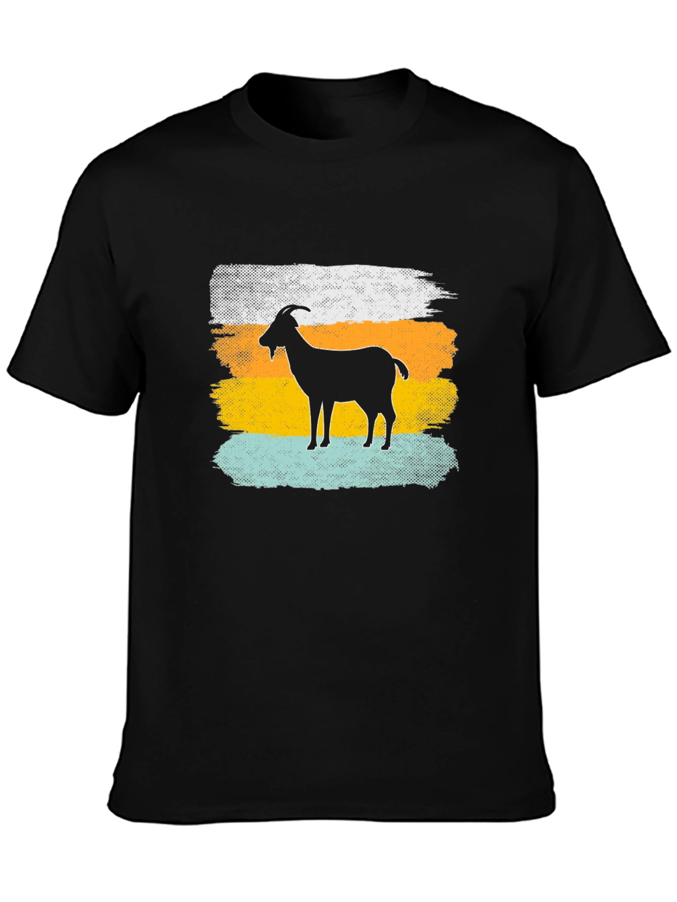 Luce con estilo esta camiseta negra para hombre con un original diseño retro. Presenta una silueta de cabra en color negro sobre un fondo de franjas horizontales en blanco, naranja, amarillo y celeste, con un efecto desgastado que le da un toque vintage. Perfecta para un look casual y relajado, esta camiseta de manga corta es ideal para usar a diario o para un evento informal. Su diseño único te hará destacar entre la multitud. Combínala con tus jeans o pantalones favoritos para un estilo moderno y cómodo.