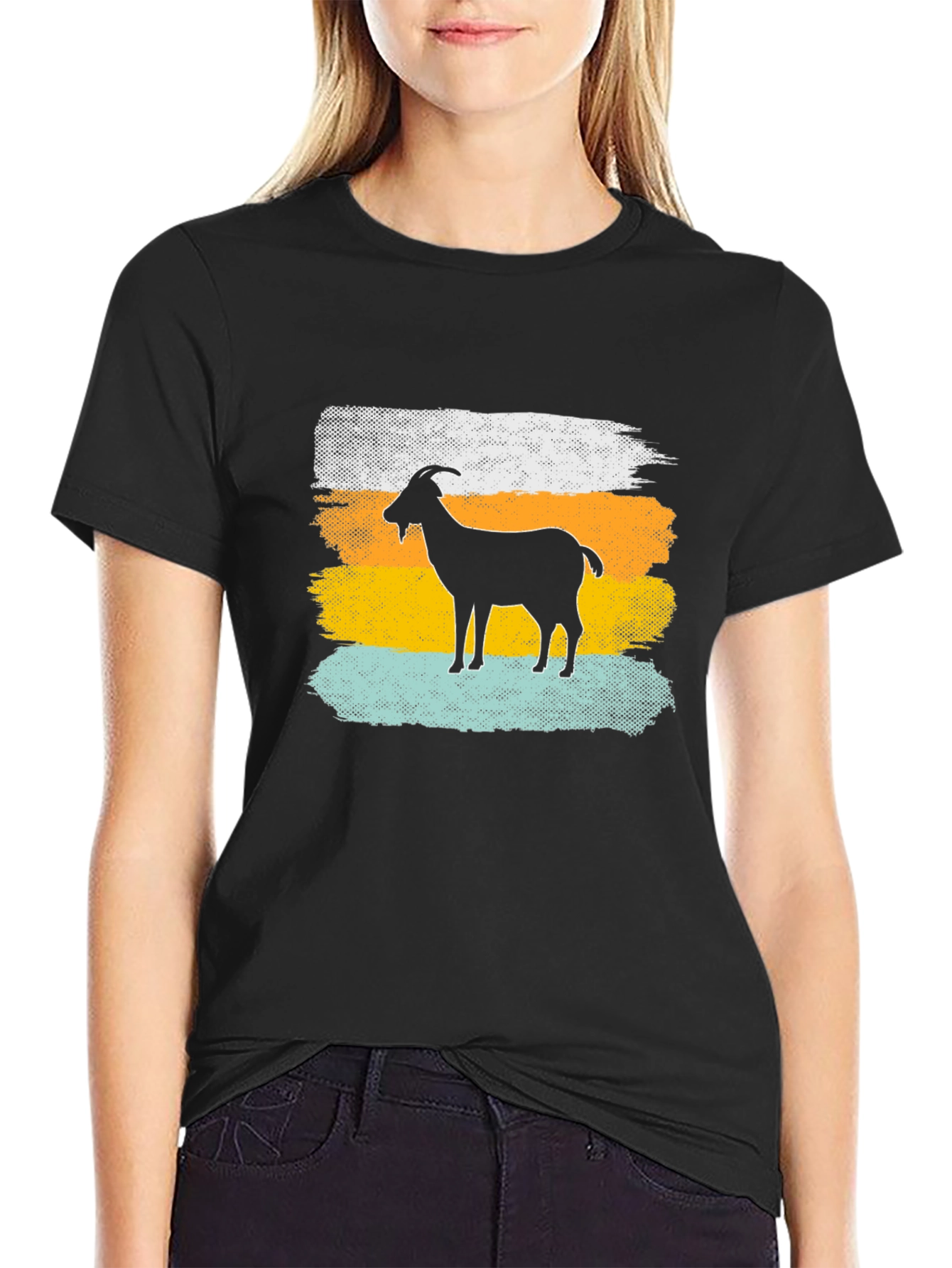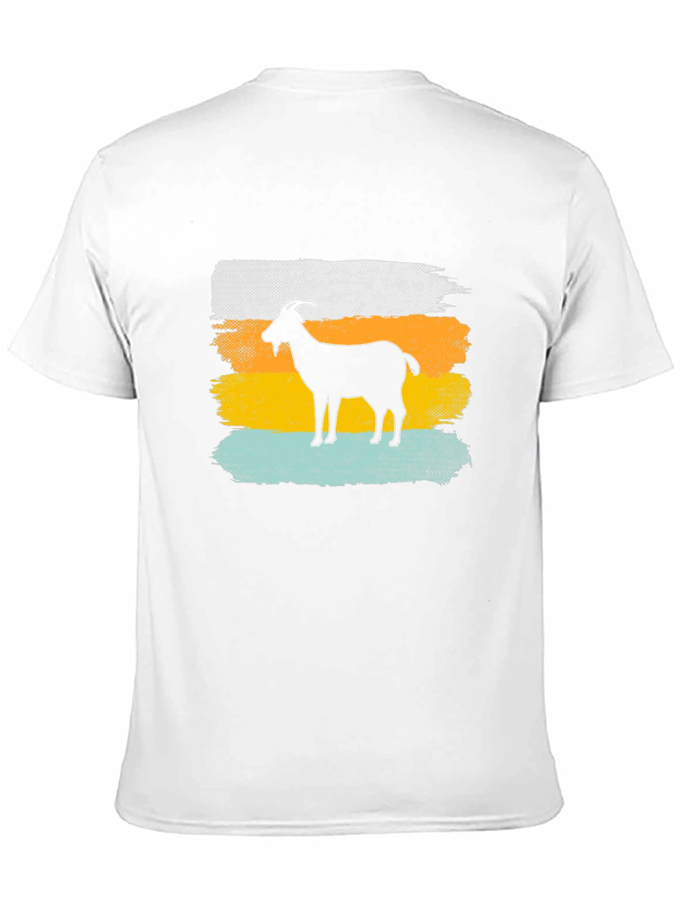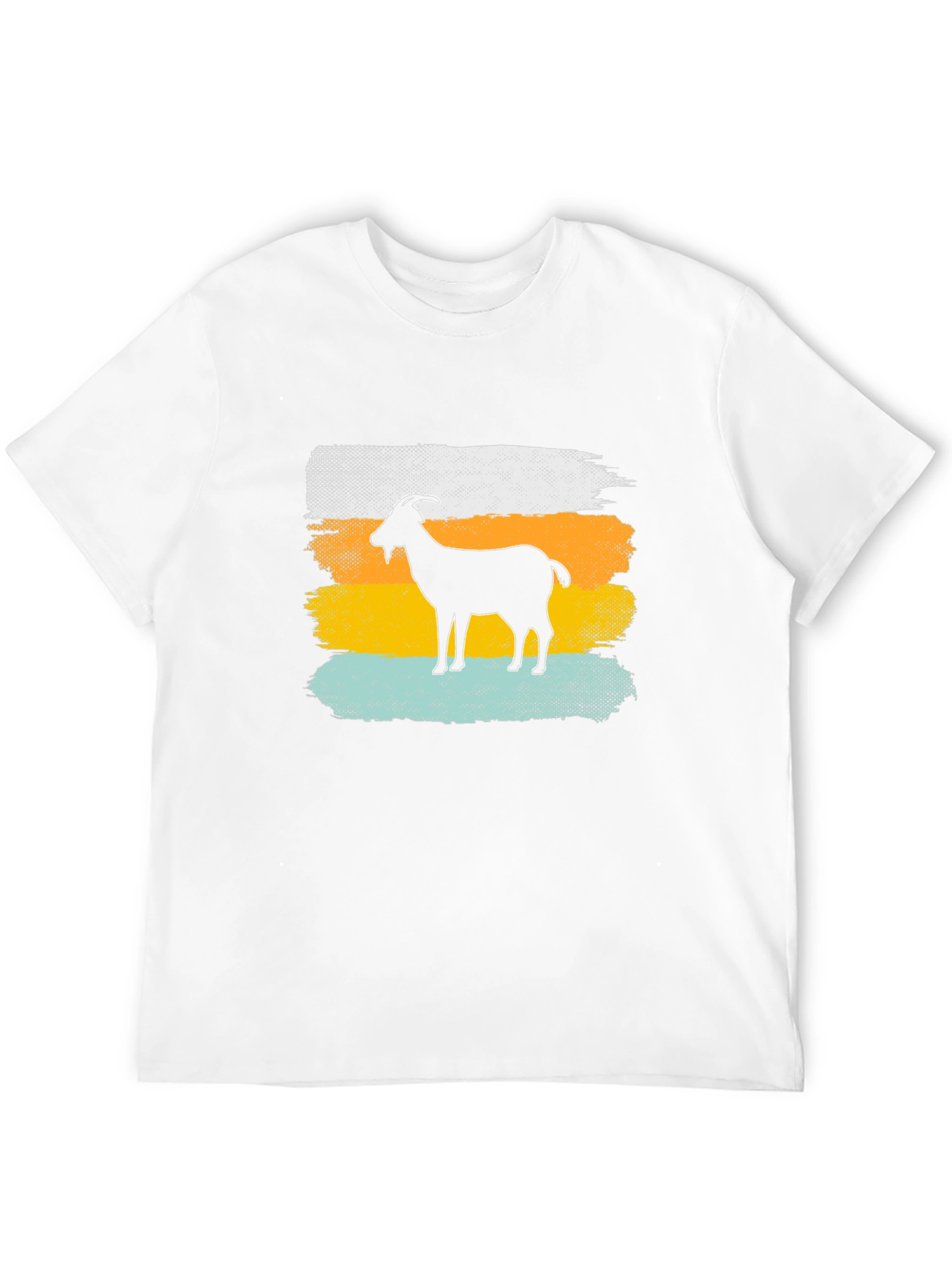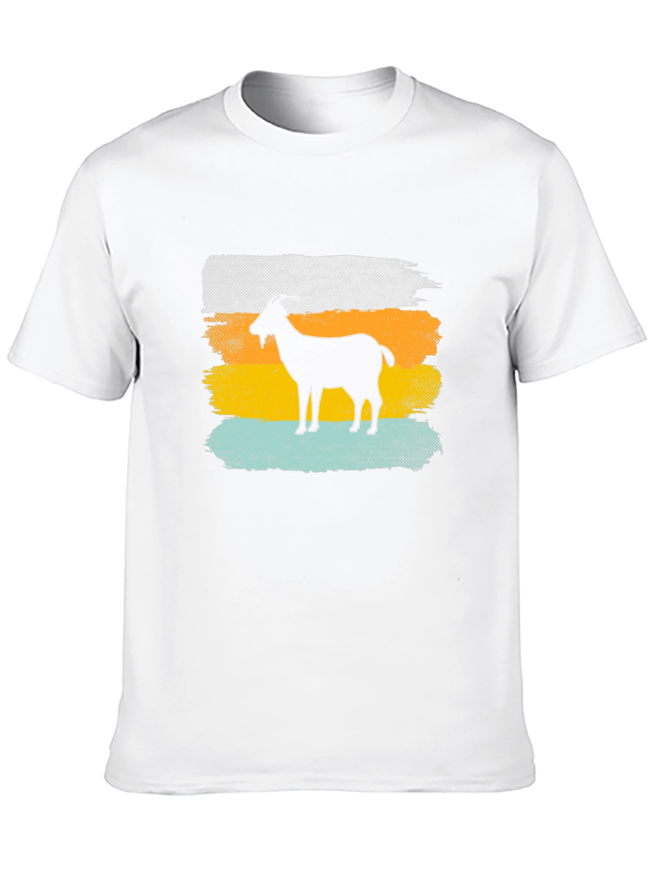 Luce con estilo esta camiseta negra para hombre con un original diseño retro. Presenta una silueta de cabra en color negro sobre un fondo de franjas horizontales en blanco, naranja, amarillo y celeste, con un efecto desgastado que le da un toque vintage. Perfecta para un look casual y relajado, esta camiseta de manga corta es ideal para usar a diario o para un evento informal. Su diseño único te hará destacar entre la multitud. Combínala con tus jeans o pantalones favoritos para un estilo moderno y cómodo.