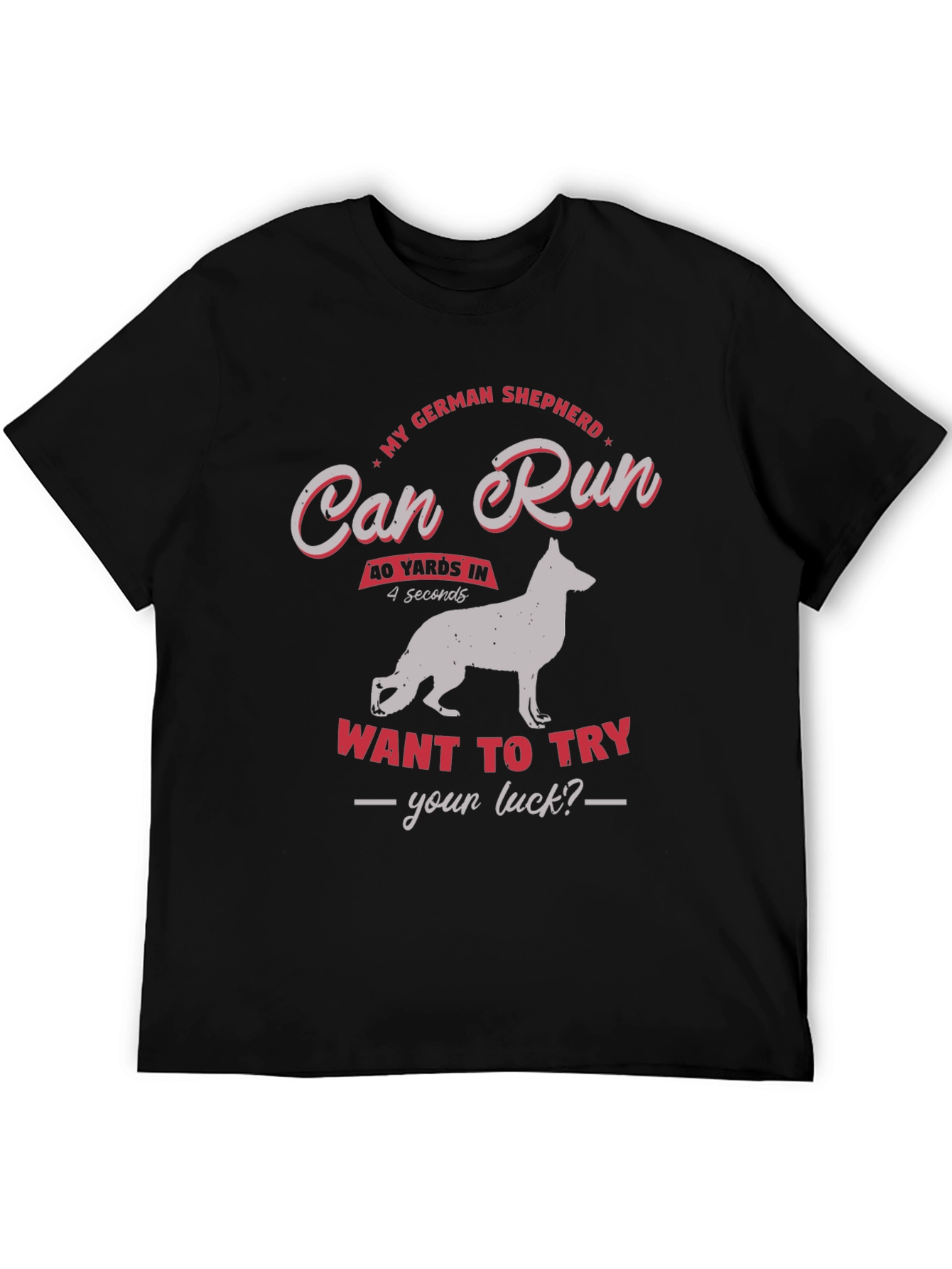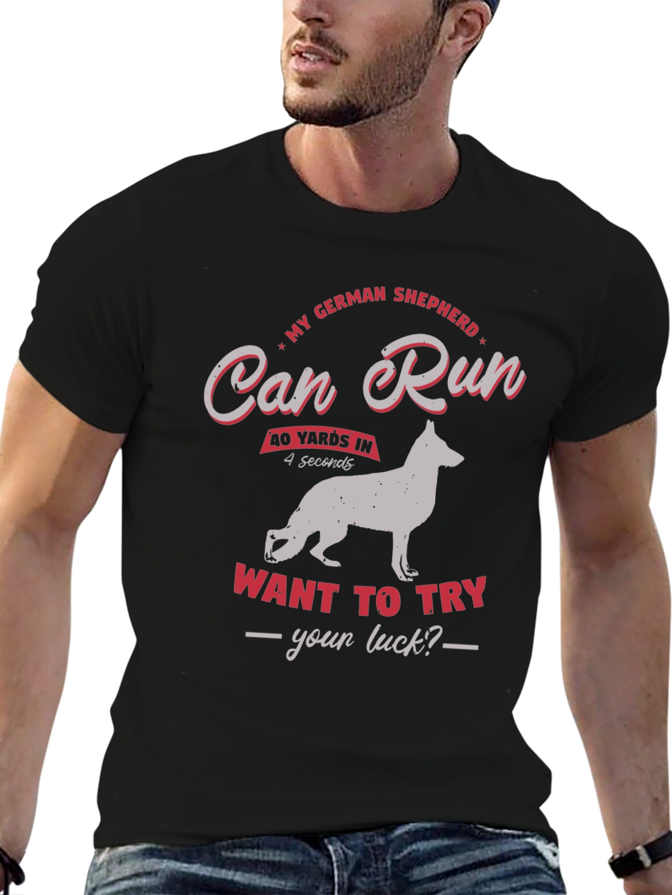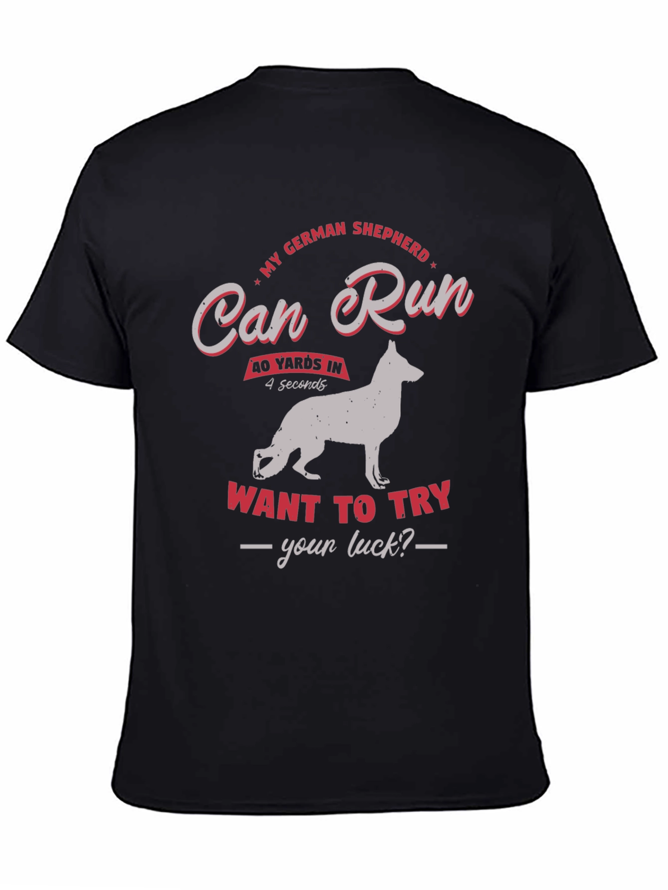 Esta camiseta negra para hombre presenta un divertido y llamativo diseño temático de pastor alemán. Muestra la frase "My German Shepherd Can Run" en una tipografía llamativa de color rojo y blanco, junto con la silueta de un pastor alemán. Abajo, la frase "Want to try your luck?", invita con humor a intentar competir con la velocidad del perro. Ideal para los amantes de los pastores alemanes y dueños orgullosos que desean expresar su cariño por esta raza. Perfecta para uso diario, paseos informales y para presumir el amor por tu mascota con estilo y originalidad.
