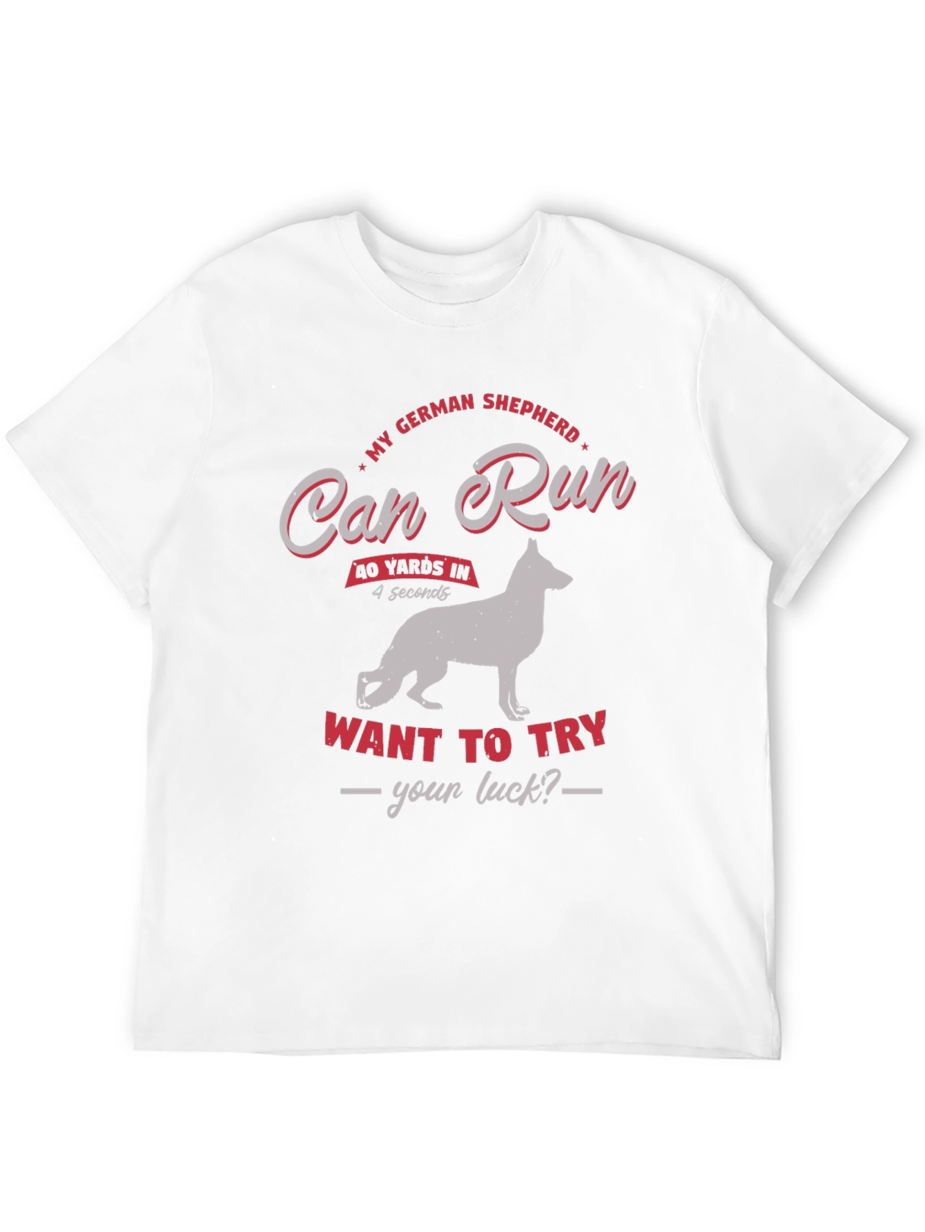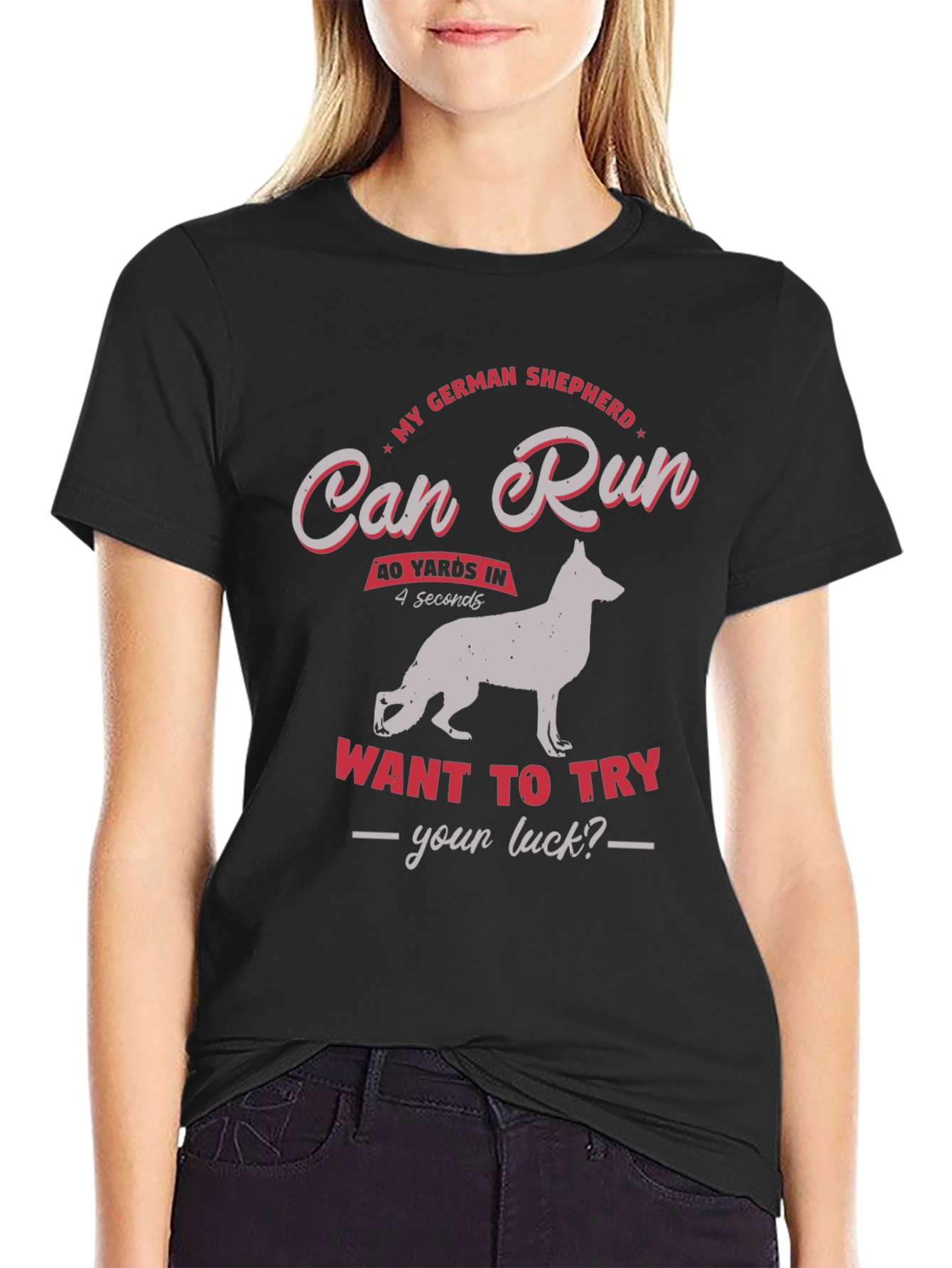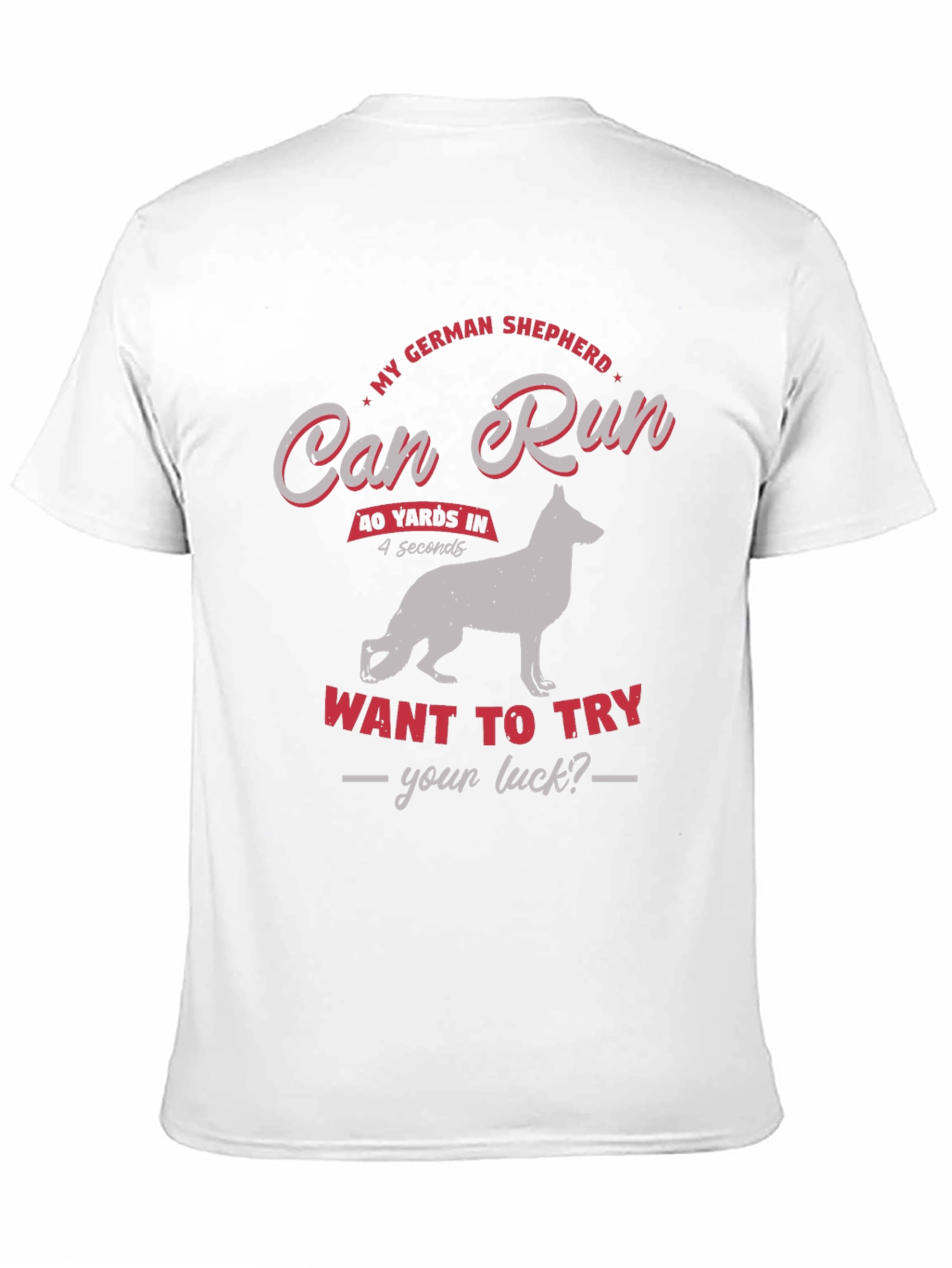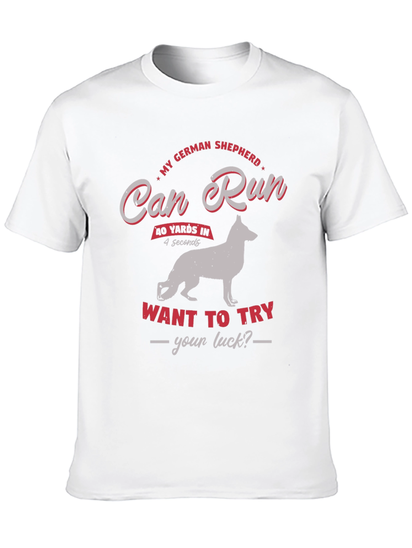 Esta camiseta negra para hombre presenta un divertido y llamativo diseño temático de pastor alemán. Muestra la frase "My German Shepherd Can Run" en una tipografía llamativa de color rojo y blanco, junto con la silueta de un pastor alemán. Abajo, la frase "Want to try your luck?", invita con humor a intentar competir con la velocidad del perro. Ideal para los amantes de los pastores alemanes y dueños orgullosos que desean expresar su cariño por esta raza. Perfecta para uso diario, paseos informales y para presumir el amor por tu mascota con estilo y originalidad.
