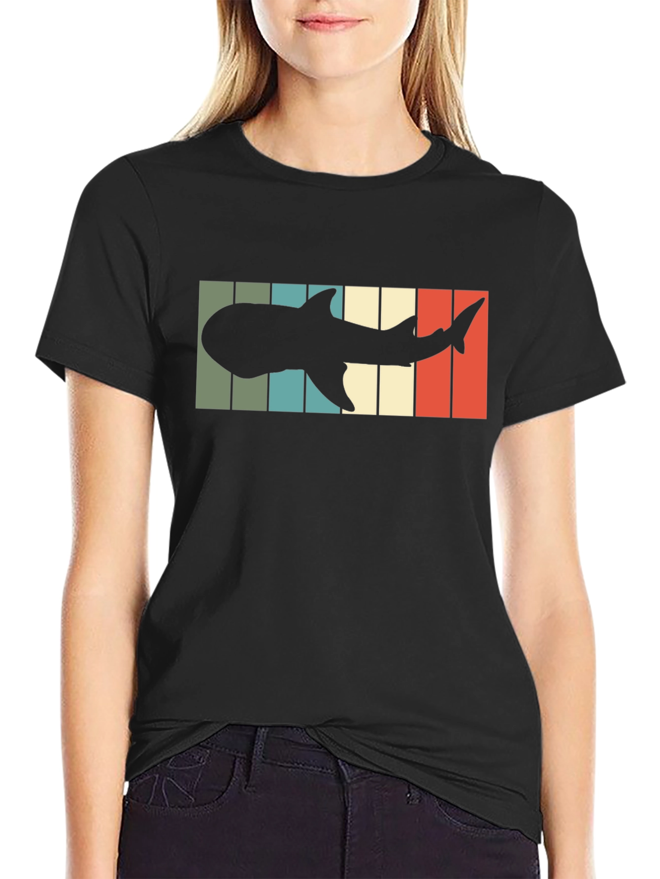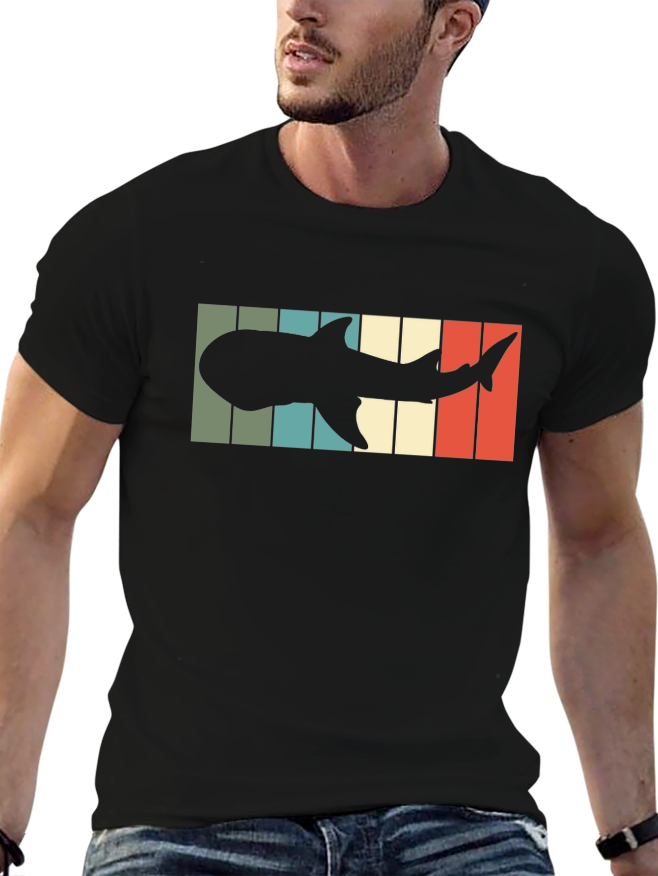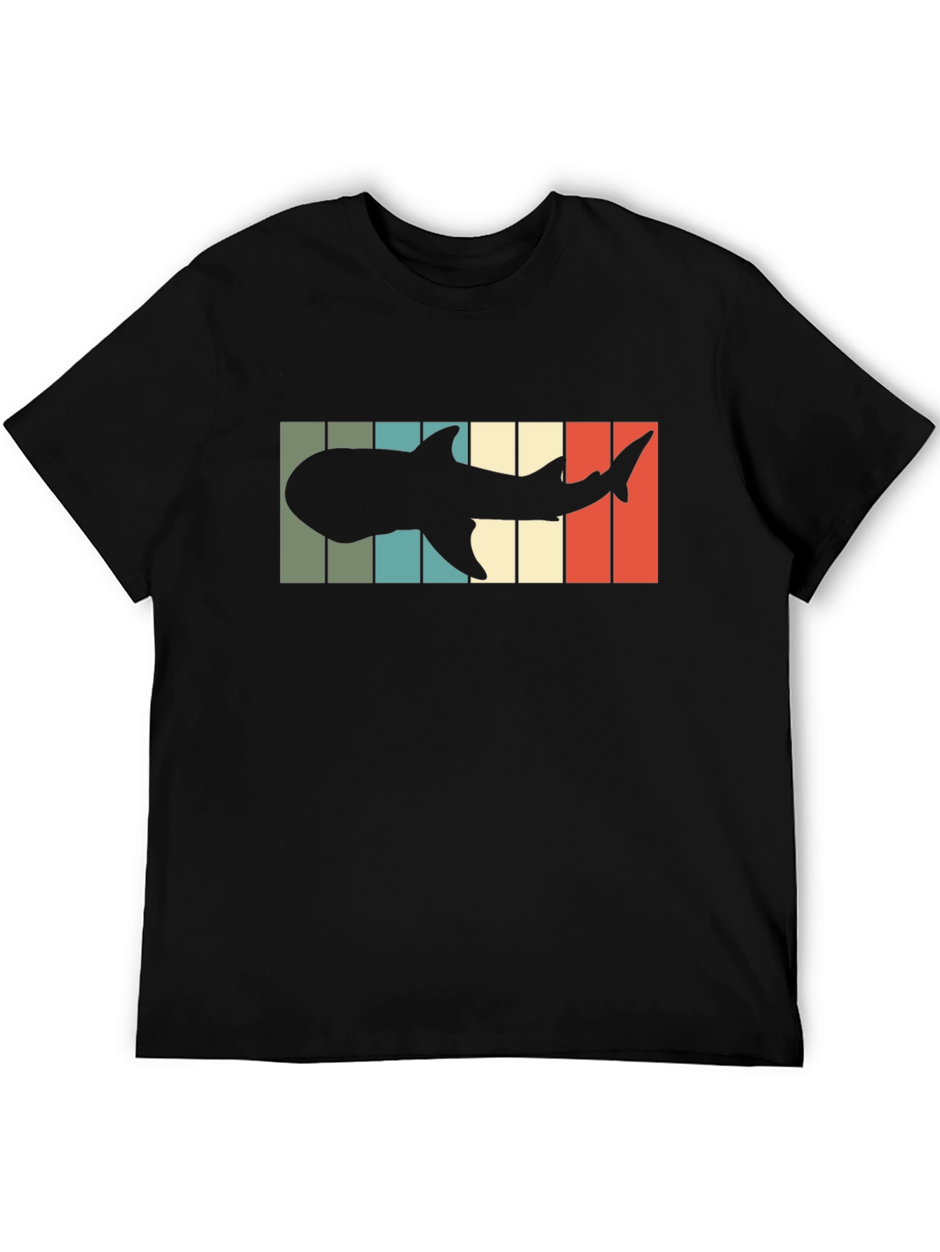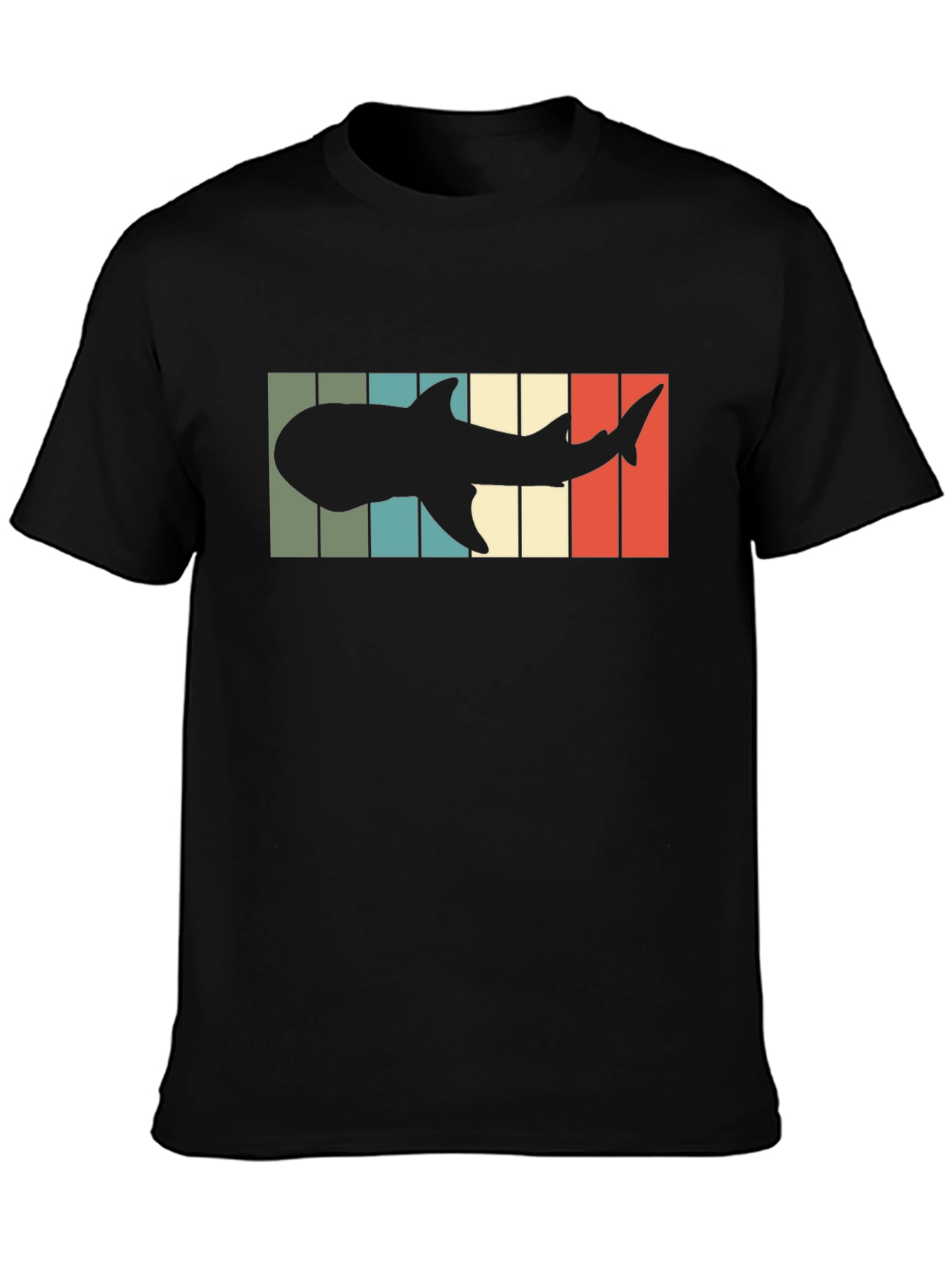 Esta camiseta negra para hombre presenta un diseño retro único con una silueta de tiburón ballena sobre un fondo de rayas verticales en tonos verde, azul, beige y rojo. La camiseta de manga corta tiene un corte clásico, ideal para un look casual y relajado. Su diseño llamativo la convierte en una prenda perfecta para expresar tu amor por la vida marina y el estilo vintage. Fabricada con materiales suaves y cómodos, esta camiseta es perfecta para usar a diario, ya sea para salir con amigos, ir a la playa o simplemente relajarte en casa. ¡Añade un toque original a tu guardarropa con esta prenda única!