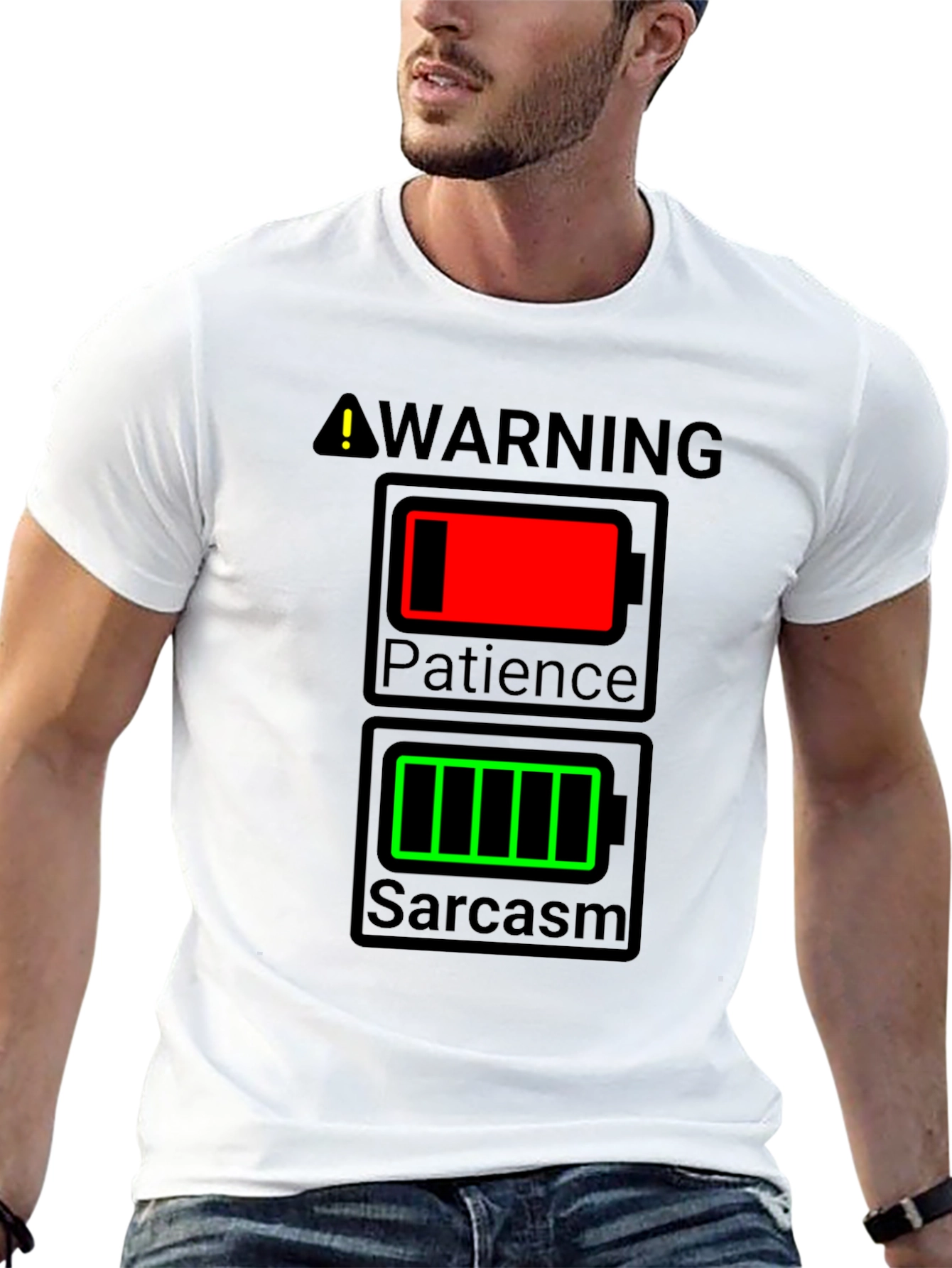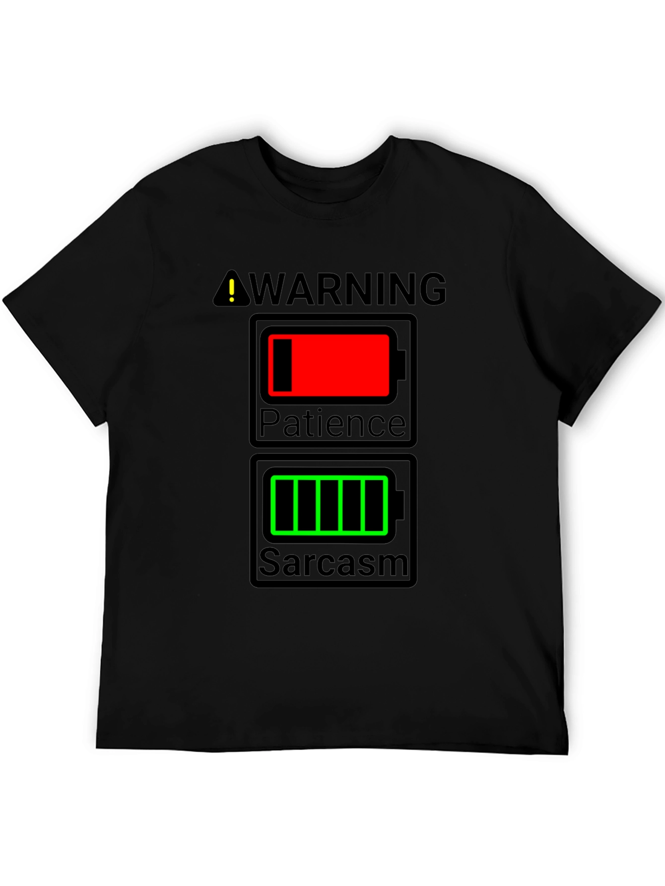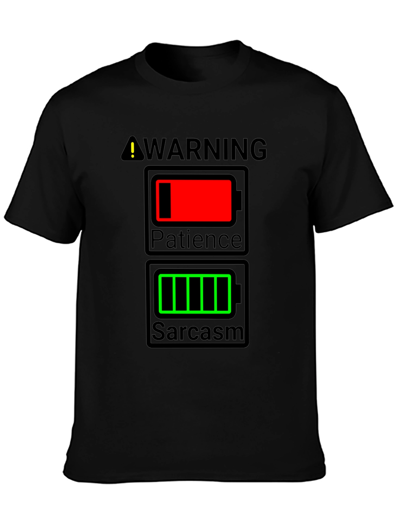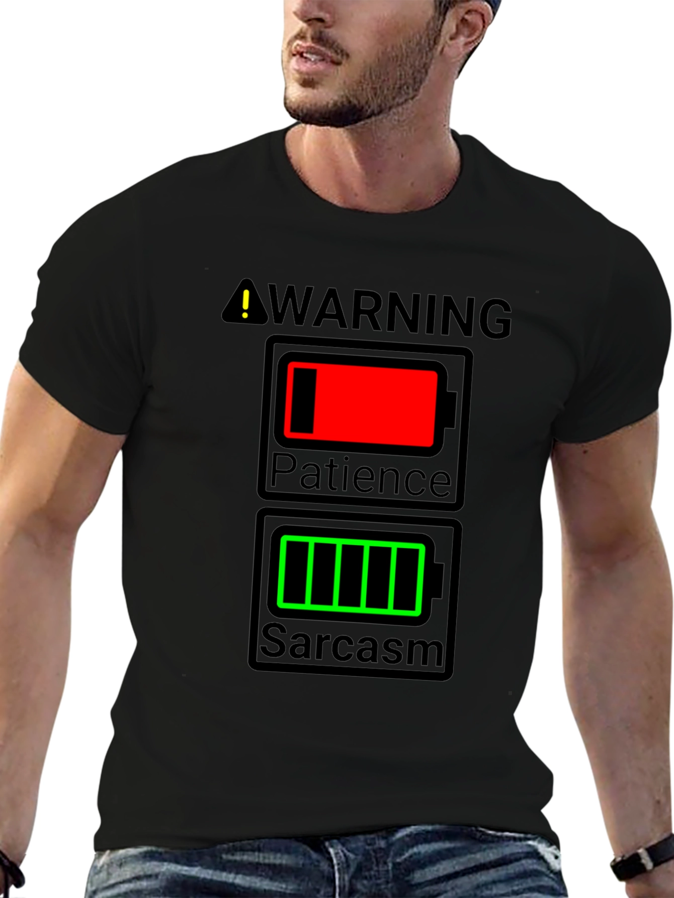Esta camiseta negra para hombre presenta un diseño divertido y llamativo, ideal para aquellos con un sentido del humor agudo. El estampado muestra una alerta de advertencia sobre los niveles de paciencia y sarcasmo. La batería de "Patience" está casi agotada, representada en rojo, mientras que la batería de "Sarcasm" está completamente llena y en verde. Fabricada con un tejido suave y cómodo, esta camiseta de manga corta es perfecta para el uso diario, ya sea para salir con amigos, relajarse en casa o hacer una declaración humorística. Su diseño original y divertido seguramente llamará la atención y provocará conversaciones. ¡Ideal para regalar a ese amigo o familiar sarcástico!