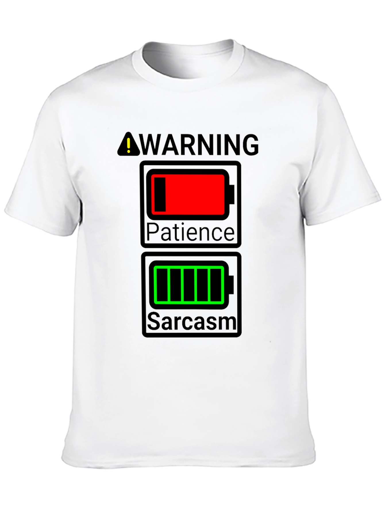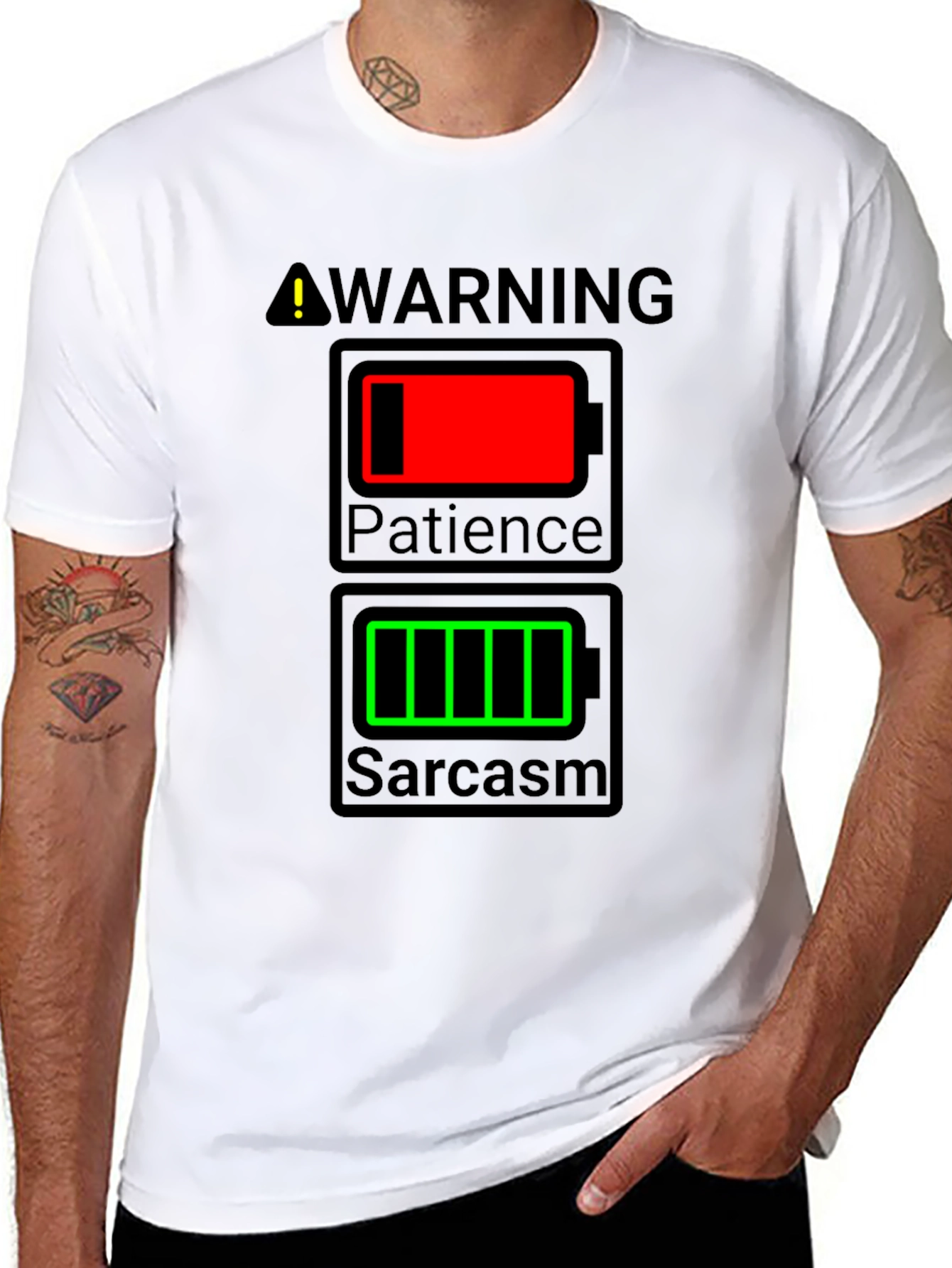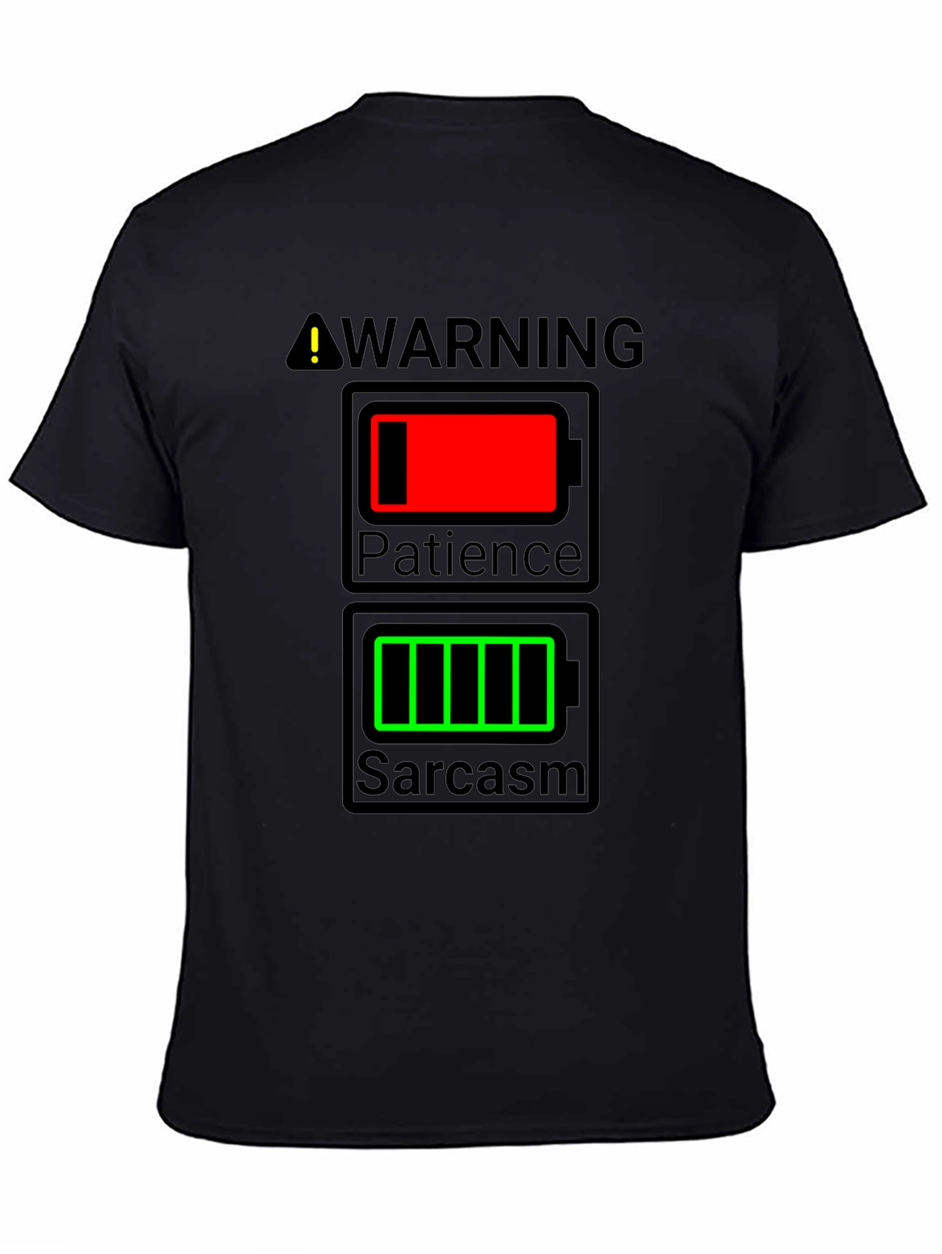 Esta camiseta negra para hombre presenta un diseño divertido y llamativo, ideal para aquellos con un sentido del humor agudo. El estampado muestra una alerta de advertencia sobre los niveles de paciencia y sarcasmo. La batería de "Patience" está casi agotada, representada en rojo, mientras que la batería de "Sarcasm" está completamente llena y en verde. Fabricada con un tejido suave y cómodo, esta camiseta de manga corta es perfecta para el uso diario, ya sea para salir con amigos, relajarse en casa o hacer una declaración humorística. Su diseño original y divertido seguramente llamará la atención y provocará conversaciones. ¡Ideal para regalar a ese amigo o familiar sarcástico!