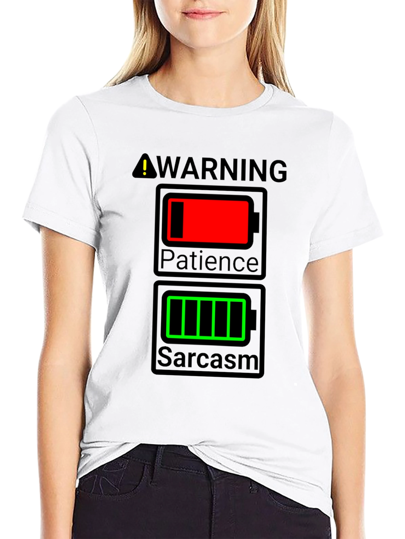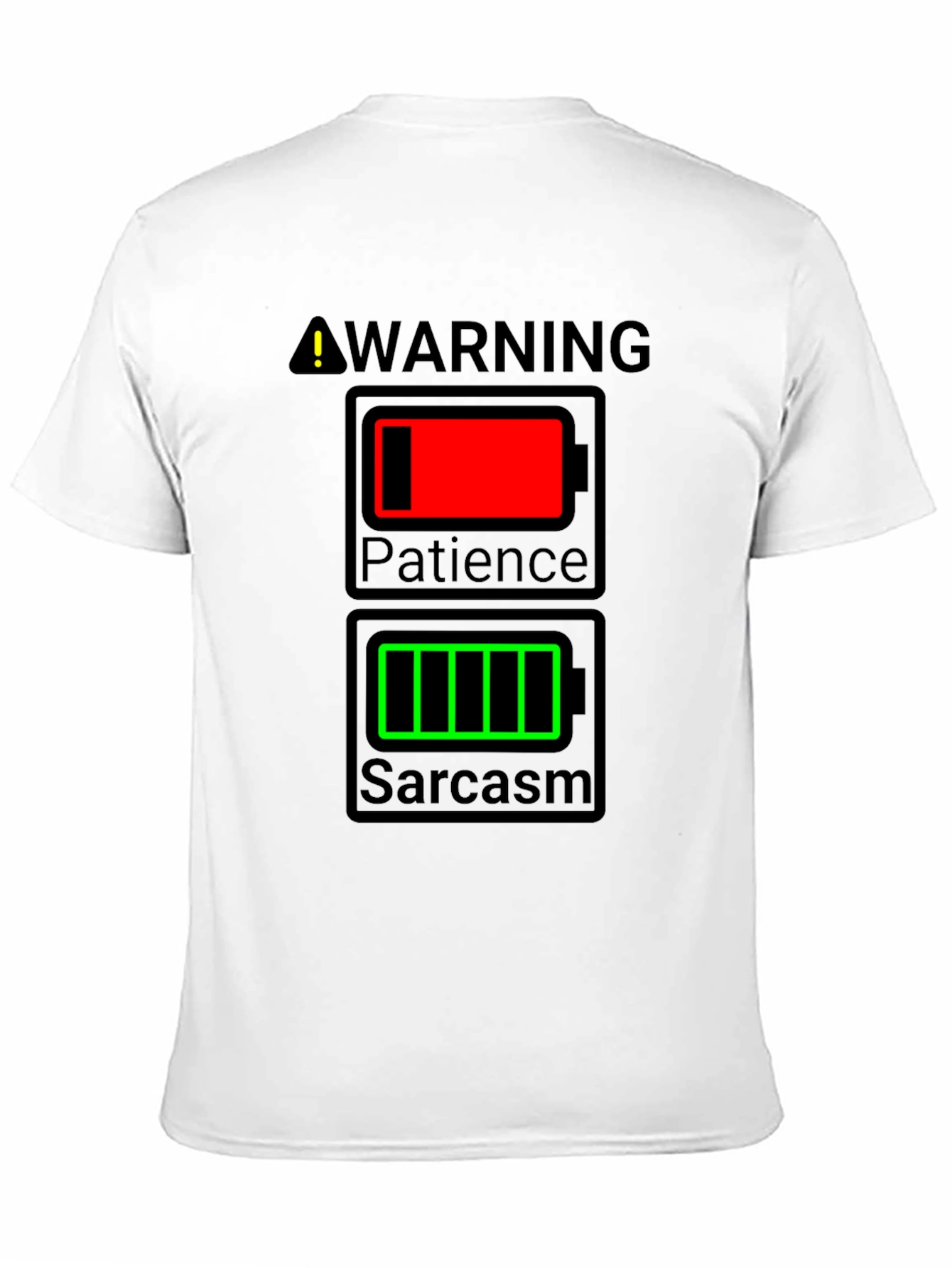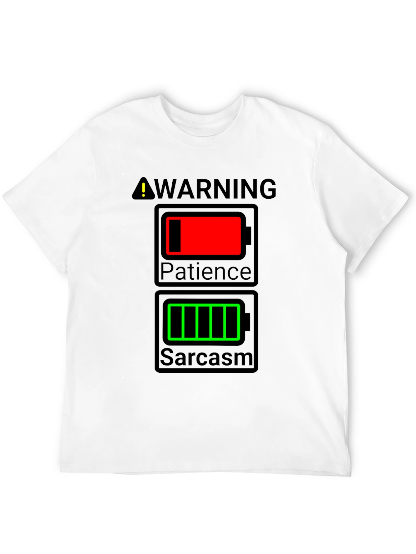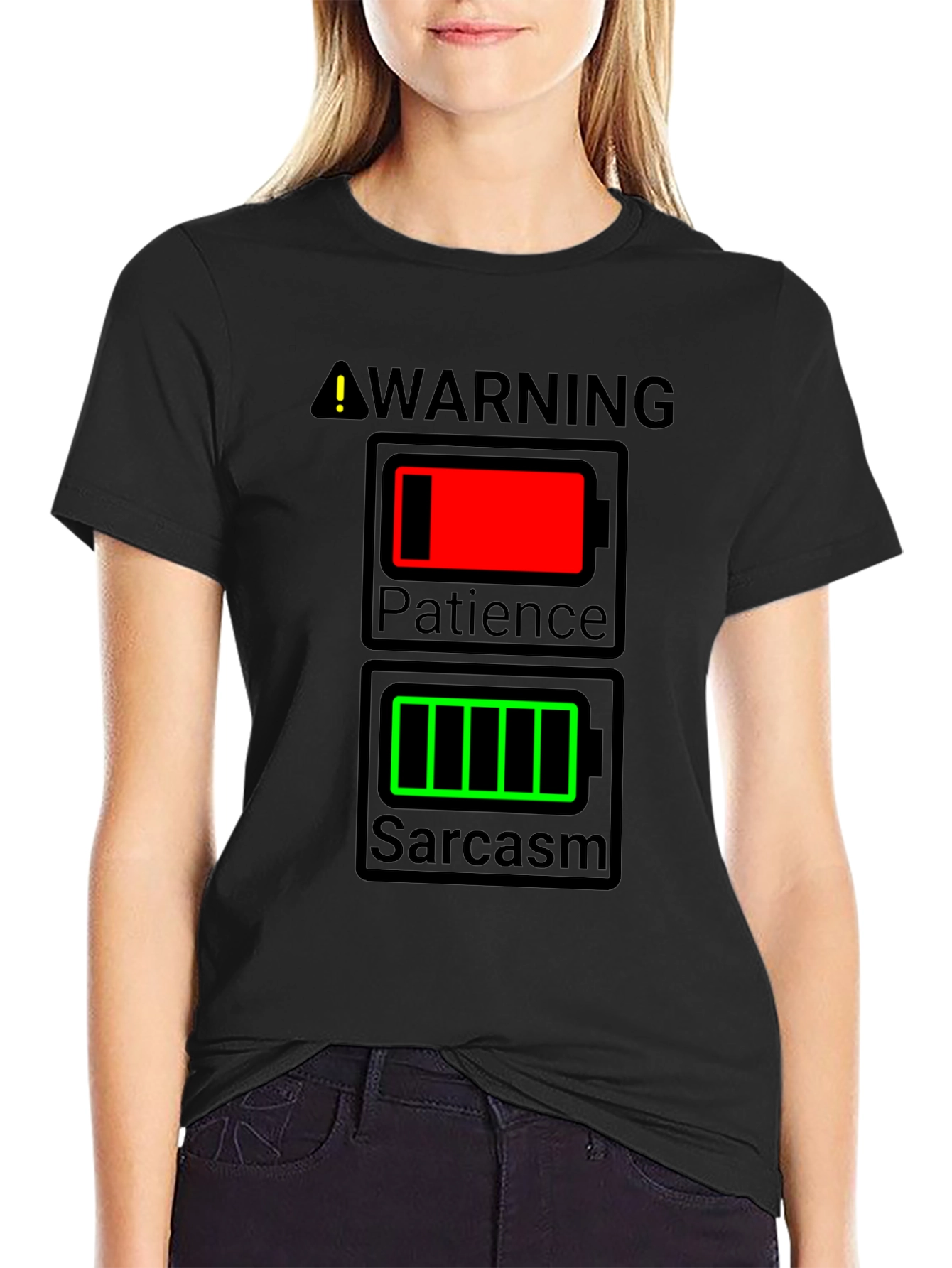 Esta camiseta negra para hombre presenta un diseño divertido y llamativo, ideal para aquellos con un sentido del humor agudo. El estampado muestra una alerta de advertencia sobre los niveles de paciencia y sarcasmo. La batería de "Patience" está casi agotada, representada en rojo, mientras que la batería de "Sarcasm" está completamente llena y en verde. Fabricada con un tejido suave y cómodo, esta camiseta de manga corta es perfecta para el uso diario, ya sea para salir con amigos, relajarse en casa o hacer una declaración humorística. Su diseño original y divertido seguramente llamará la atención y provocará conversaciones. ¡Ideal para regalar a ese amigo o familiar sarcástico!