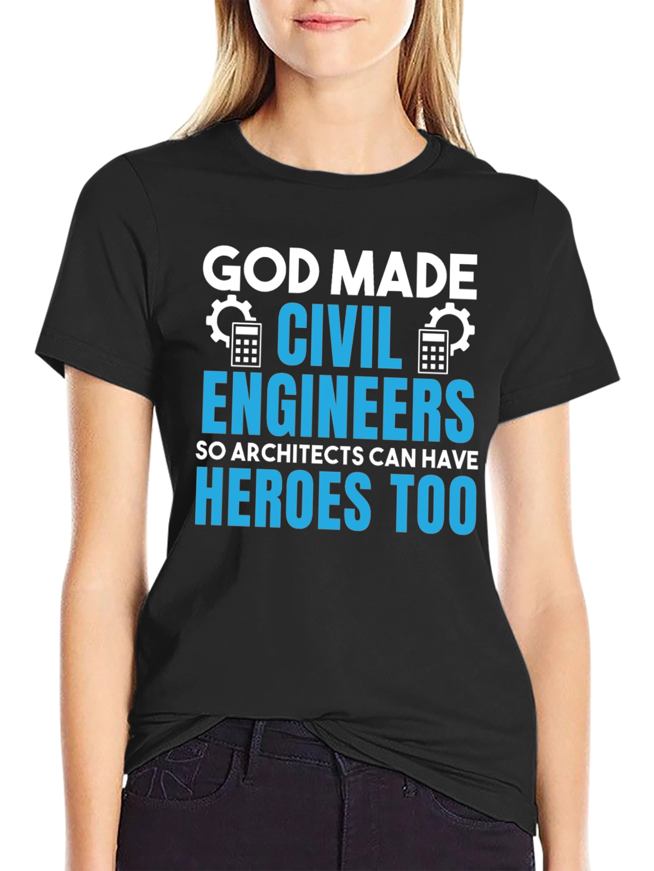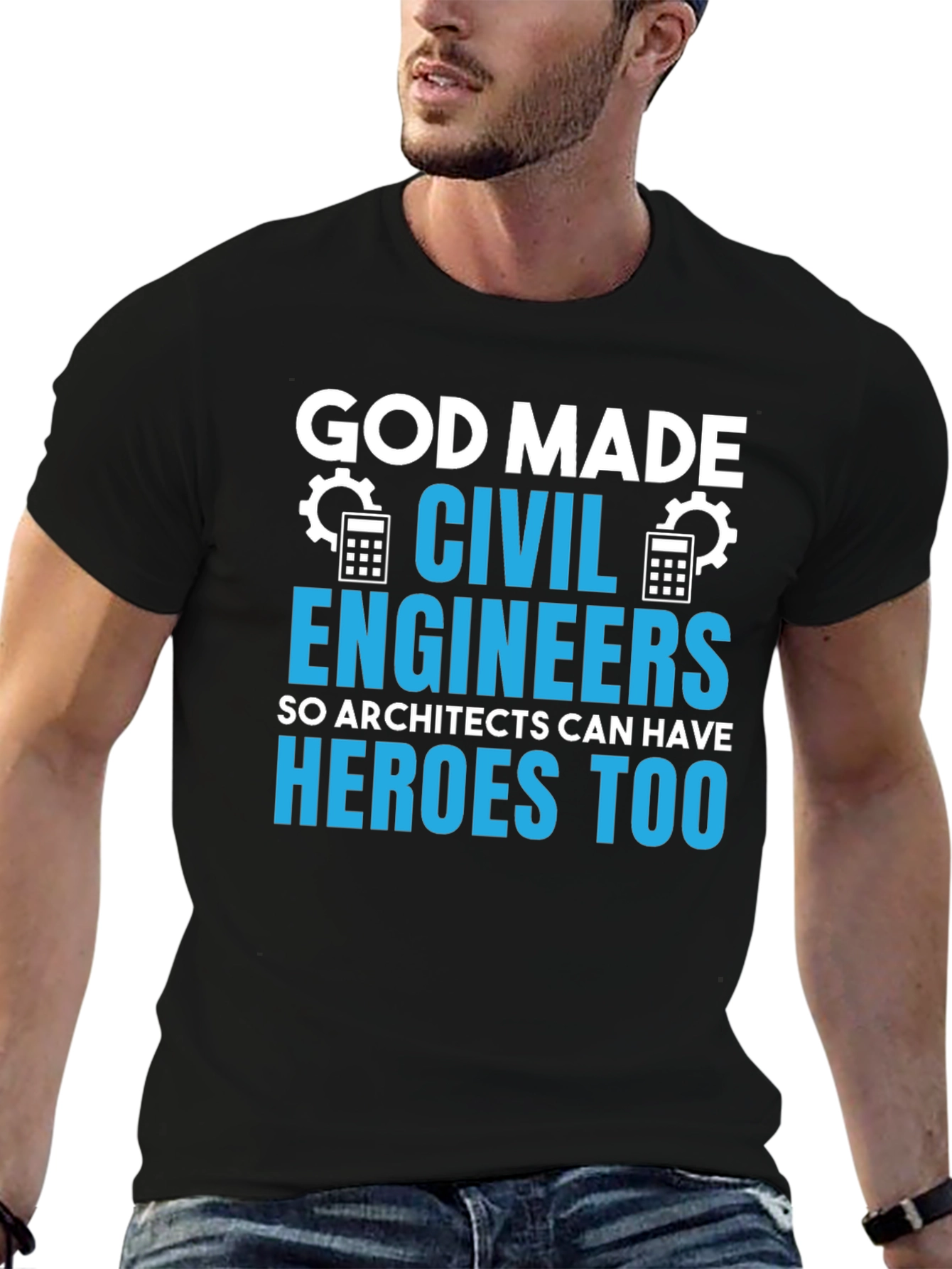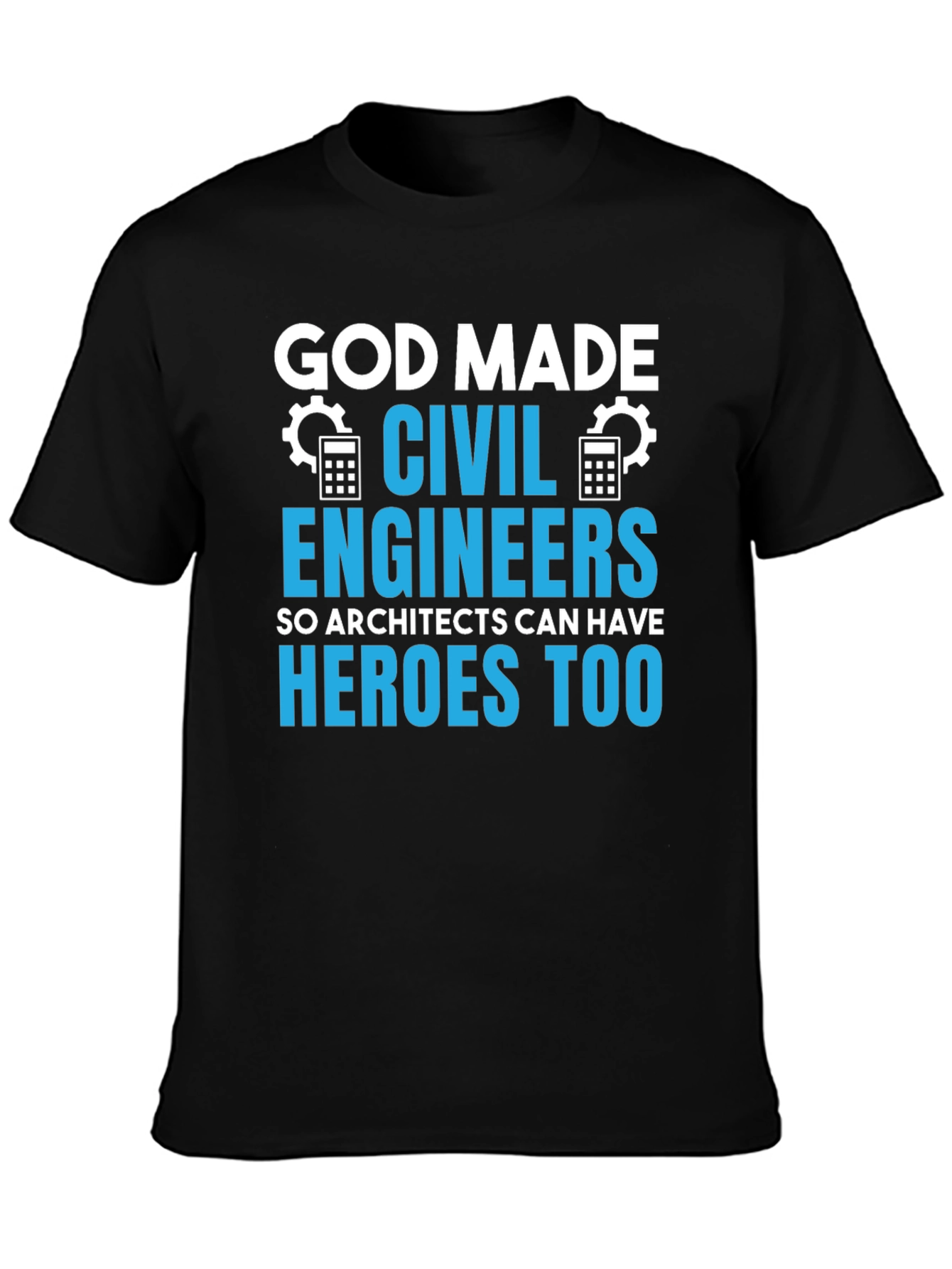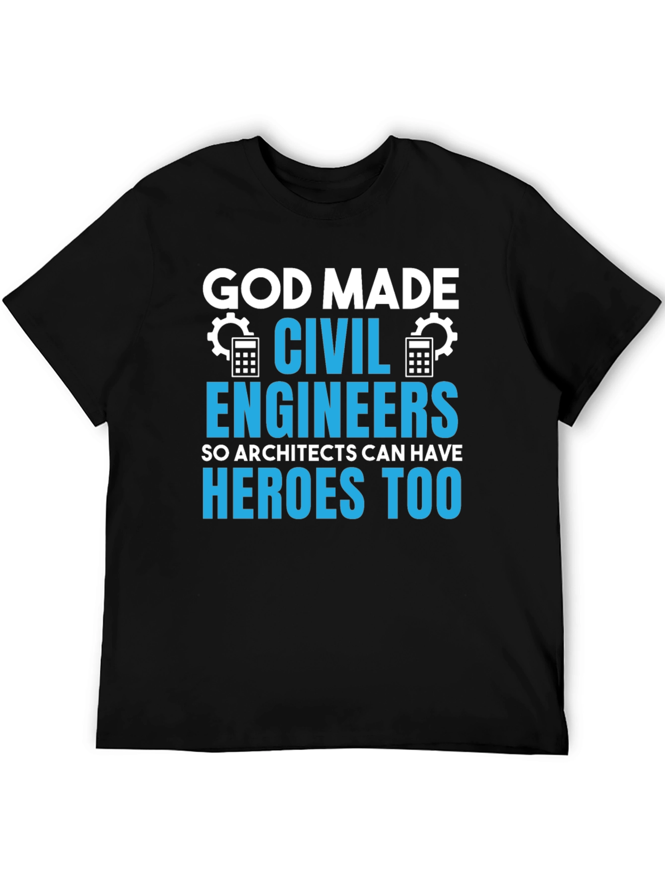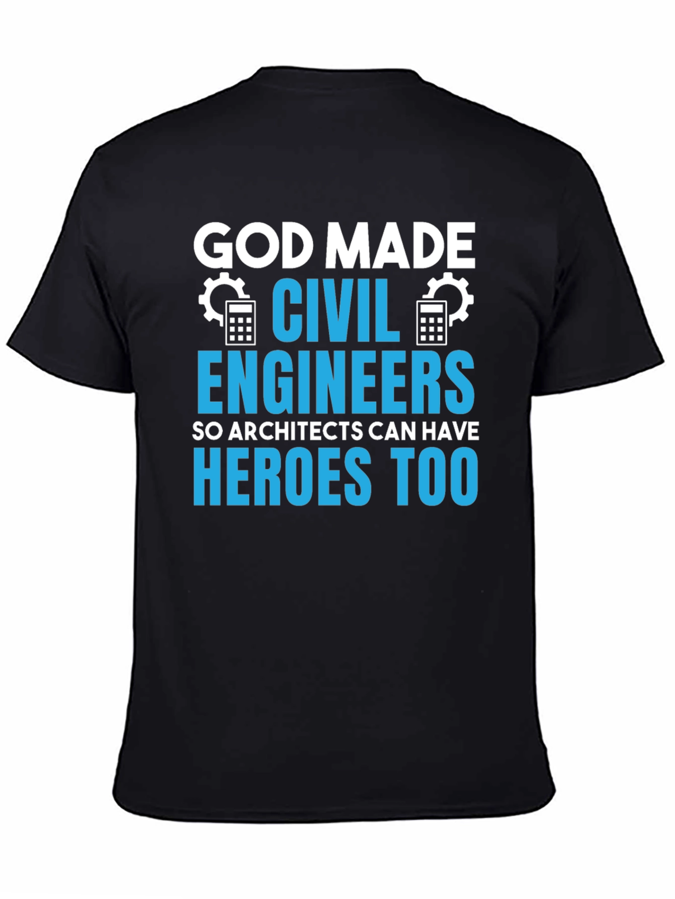 Esta camiseta negra para hombre presenta un diseño divertido y llamativo. En la parte delantera, se puede leer la frase "GOD MADE CIVIL ENGINEERS SO ARCHITECTS CAN HAVE HEROES TOO" (Dios hizo ingenieros civiles para que los arquitectos también tengan héroes). La frase está escrita en letras blancas y azules, con iconos de calculadora y engranajes que añaden un toque distintivo. Ideal para ingenieros civiles con sentido del humor o como un regalo original. Perfecta para usar en el trabajo, eventos informales o simplemente para expresar tu profesión con orgullo.