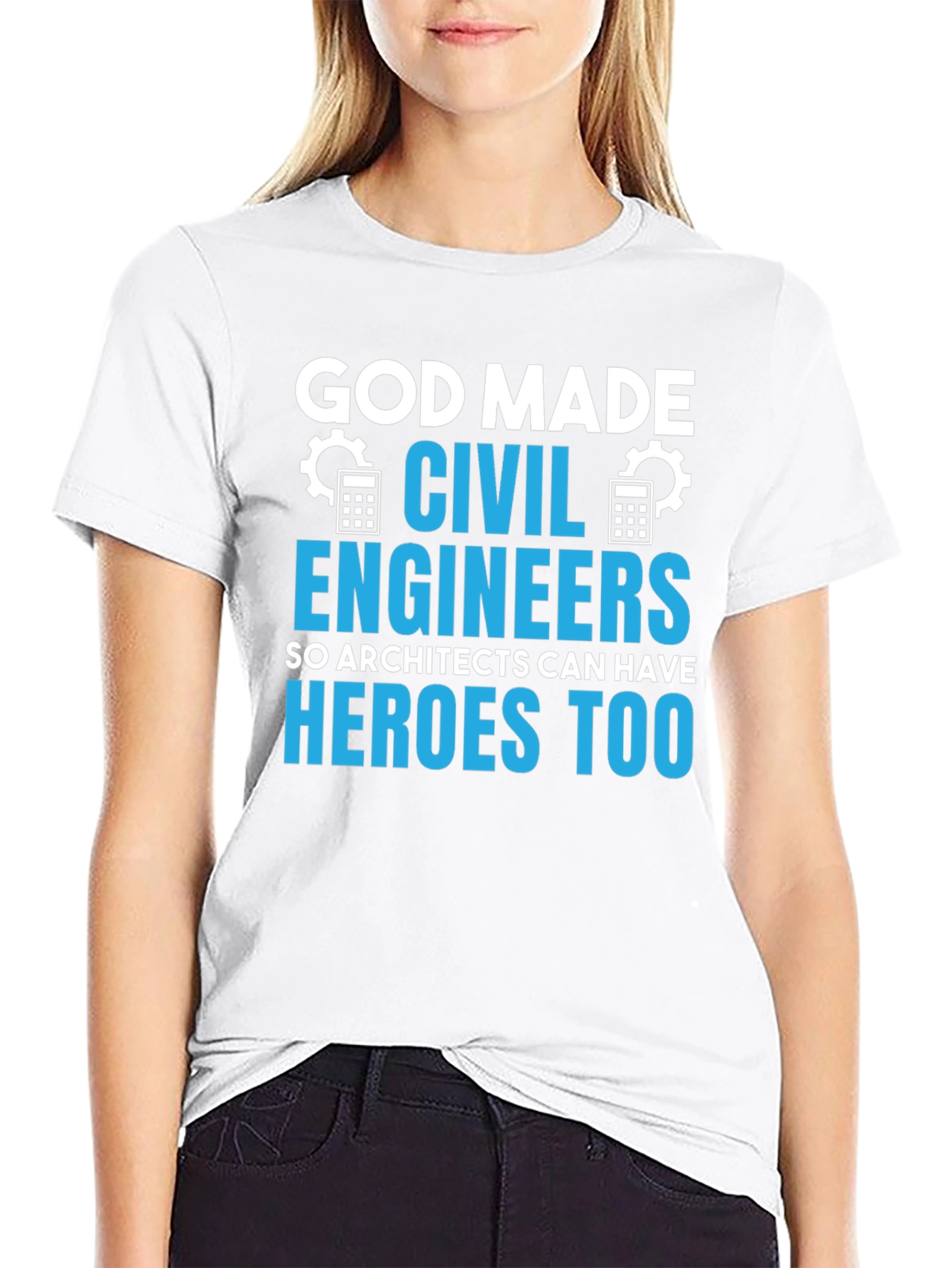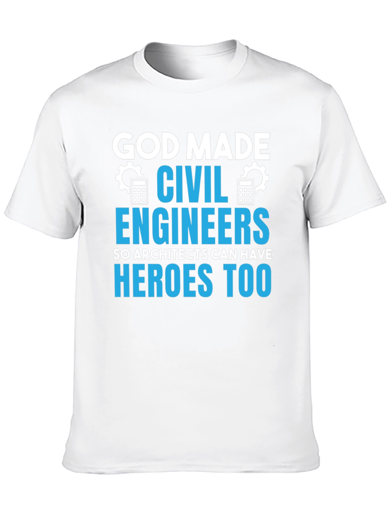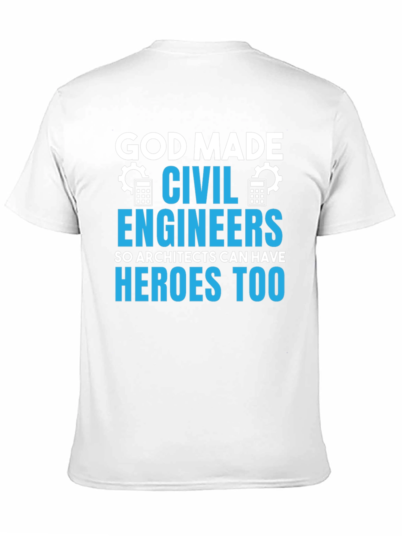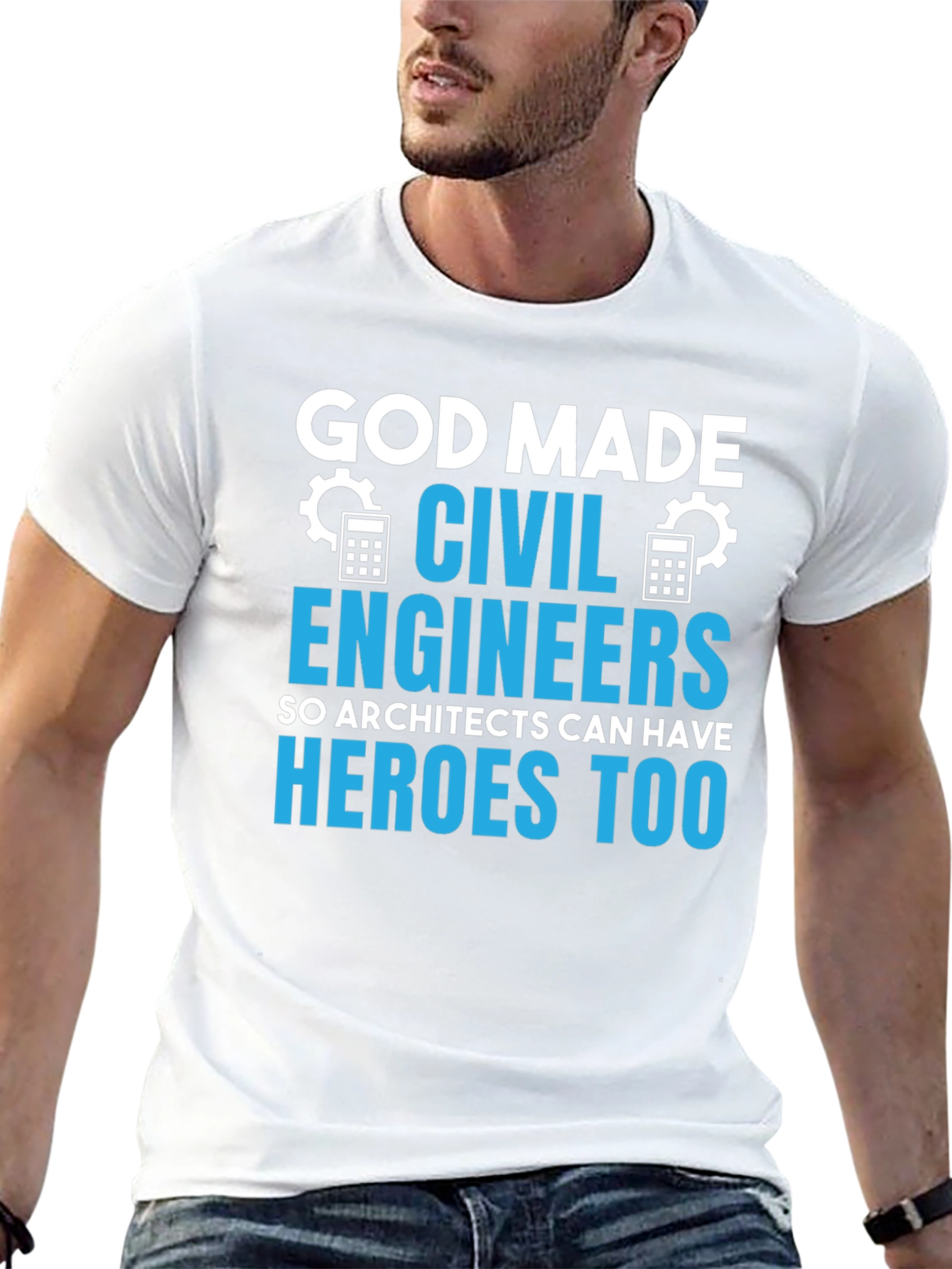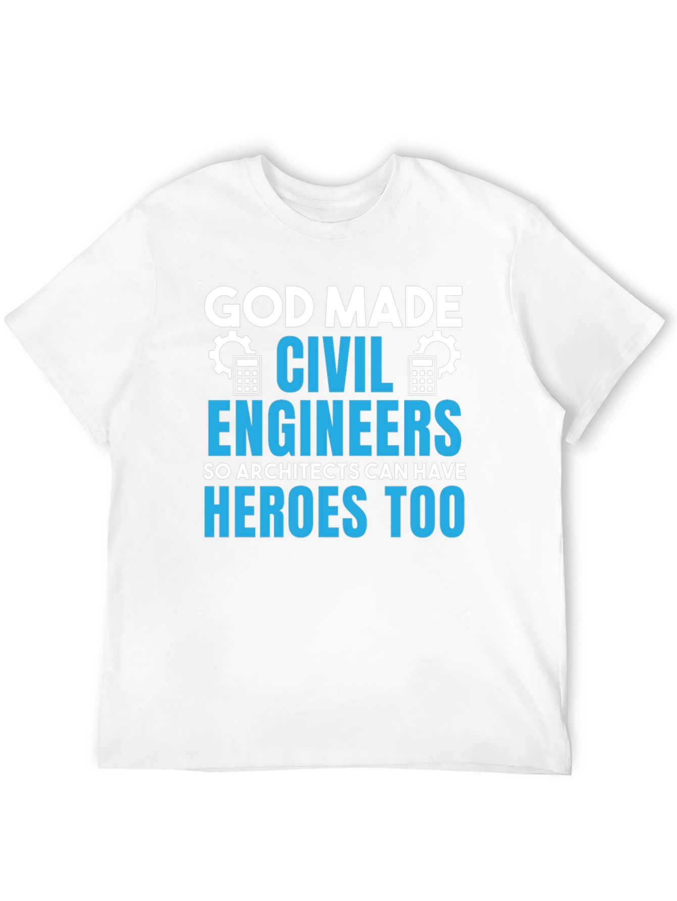 Esta camiseta negra para hombre presenta un diseño divertido y llamativo. En la parte delantera, se puede leer la frase "GOD MADE CIVIL ENGINEERS SO ARCHITECTS CAN HAVE HEROES TOO" (Dios hizo ingenieros civiles para que los arquitectos también tengan héroes). La frase está escrita en letras blancas y azules, con iconos de calculadora y engranajes que añaden un toque distintivo. Ideal para ingenieros civiles con sentido del humor o como un regalo original. Perfecta para usar en el trabajo, eventos informales o simplemente para expresar tu profesión con orgullo.