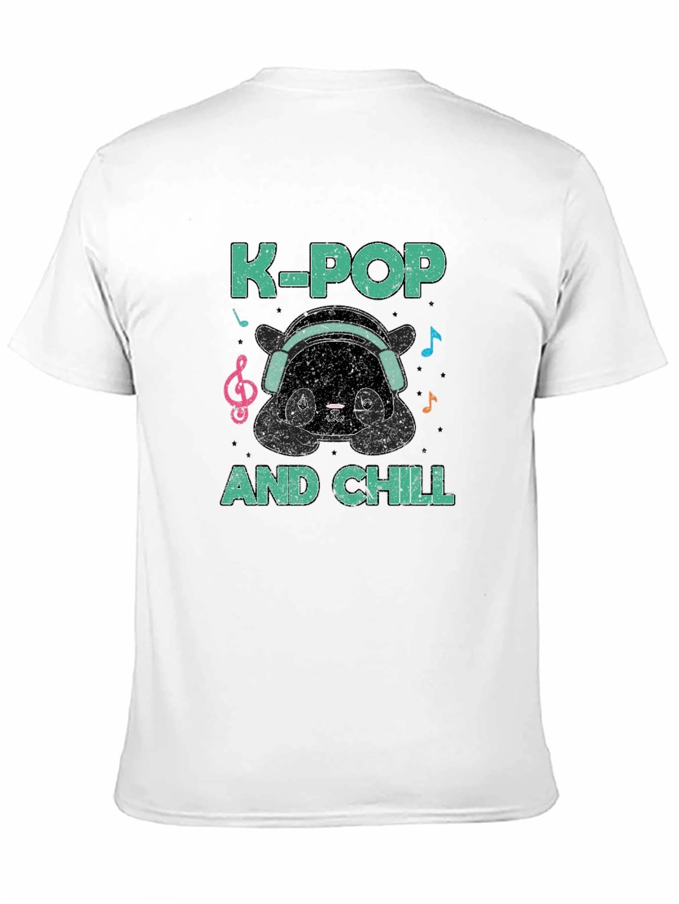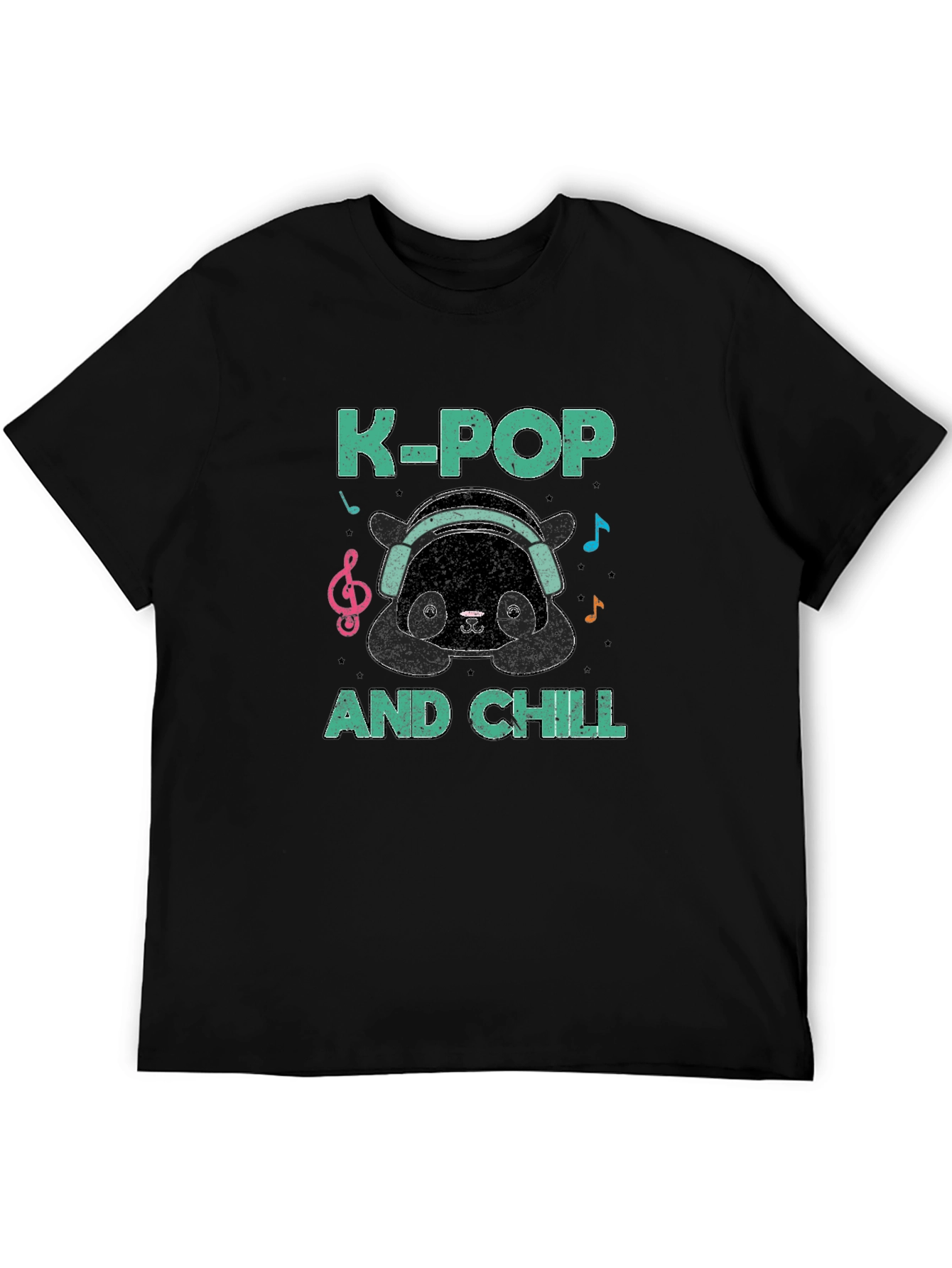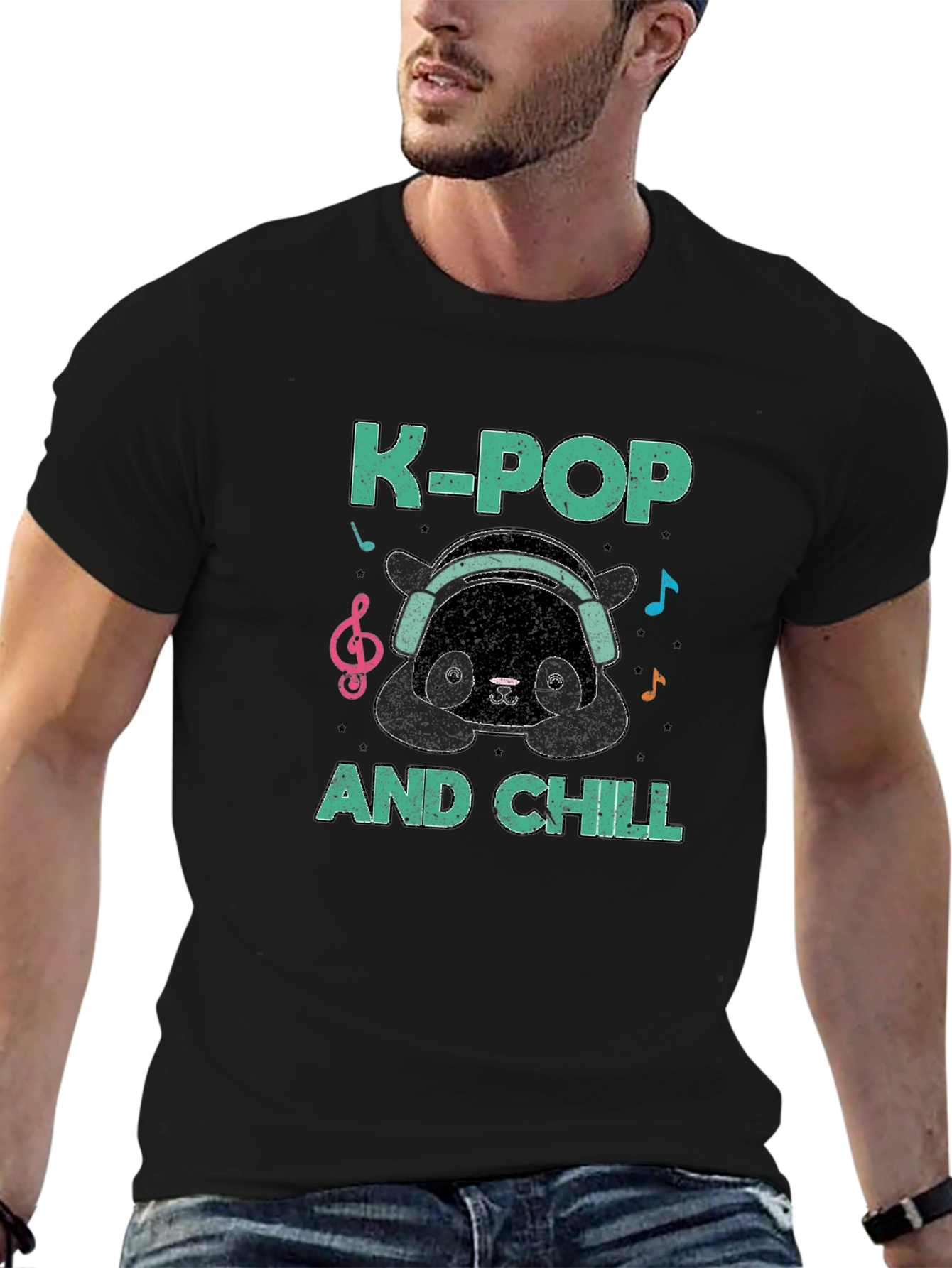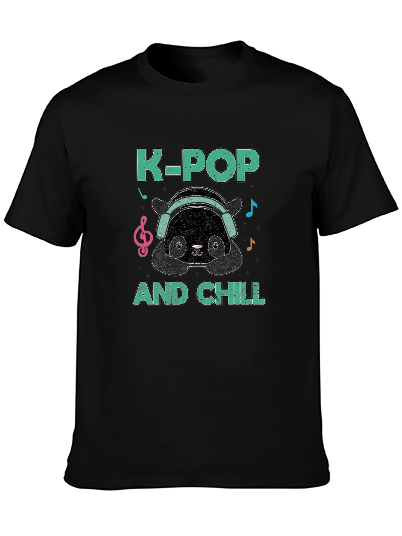 Muestra tu amor por el K-Pop con esta divertida camiseta negra para hombre. El diseño presenta un adorable panda con auriculares, rodeado de notas musicales y las palabras "K-Pop and Chill" en vibrantes tonos turquesa. Ideal para llevar en conciertos, reuniones con amigos o simplemente para relajarte en casa. Fabricada con un tejido suave y cómodo, esta camiseta es perfecta para cualquier fan del K-Pop que quiera lucir un estilo original y relajado. ¡Consigue la tuya y presume de tus gustos musicales con estilo!