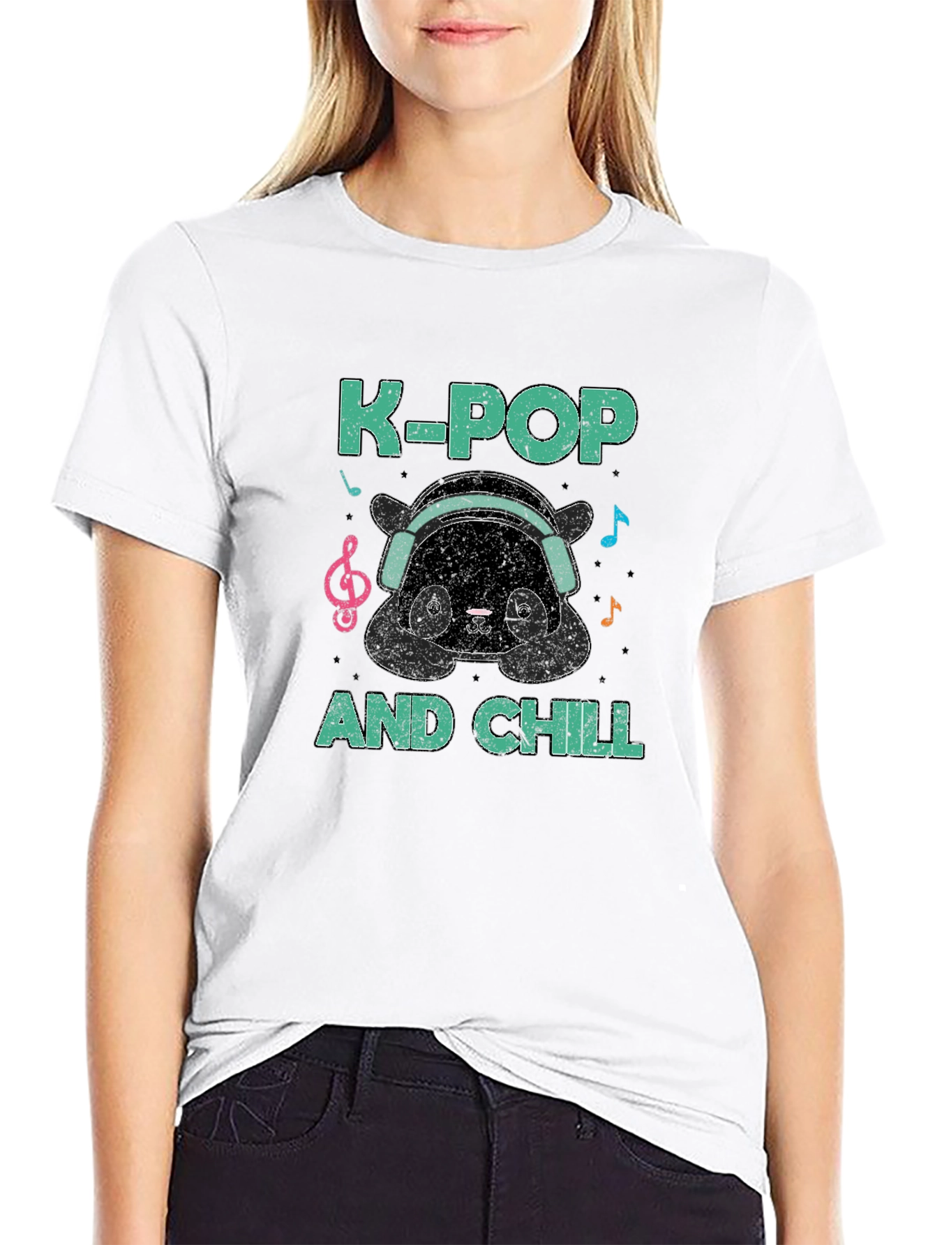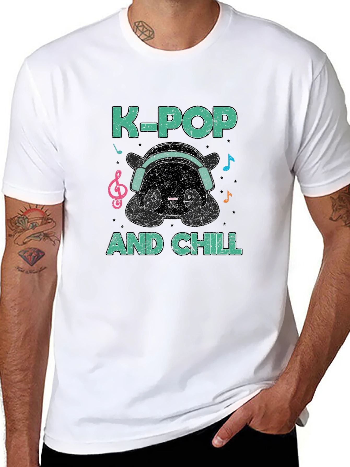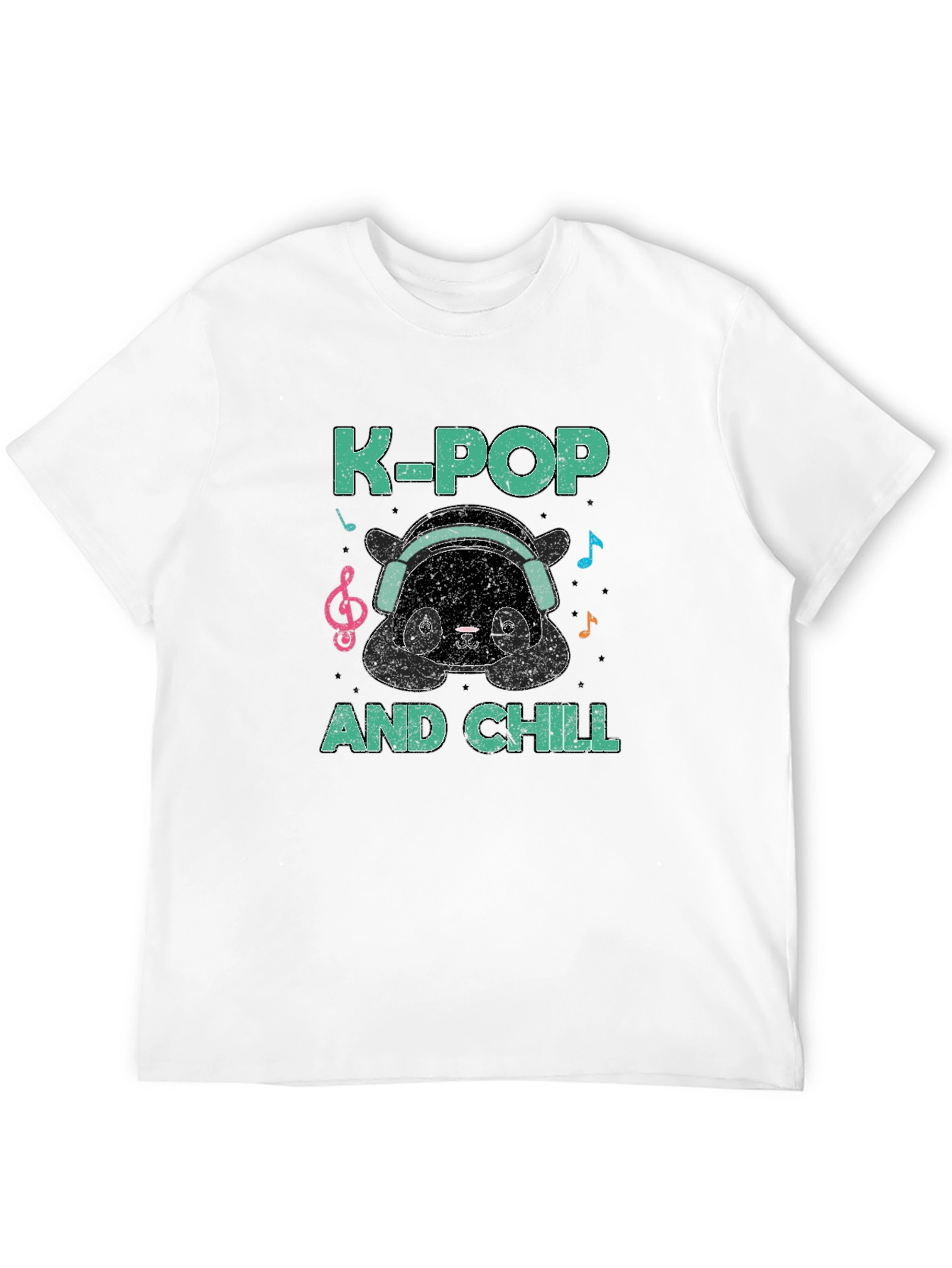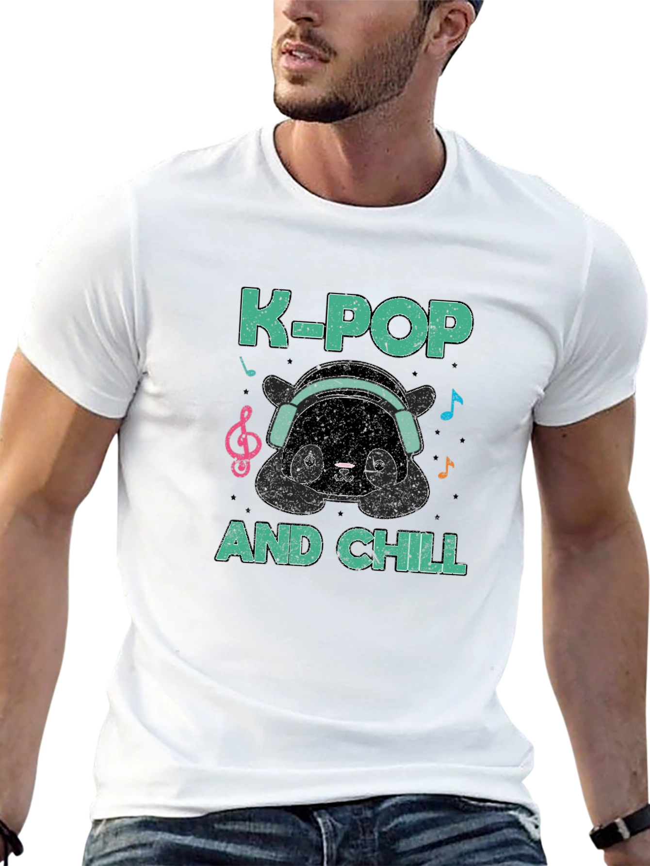Muestra tu amor por el K-Pop con esta divertida camiseta negra para hombre. El diseño presenta un adorable panda con auriculares, rodeado de notas musicales y las palabras "K-Pop and Chill" en vibrantes tonos turquesa. Ideal para llevar en conciertos, reuniones con amigos o simplemente para relajarte en casa. Fabricada con un tejido suave y cómodo, esta camiseta es perfecta para cualquier fan del K-Pop que quiera lucir un estilo original y relajado. ¡Consigue la tuya y presume de tus gustos musicales con estilo!