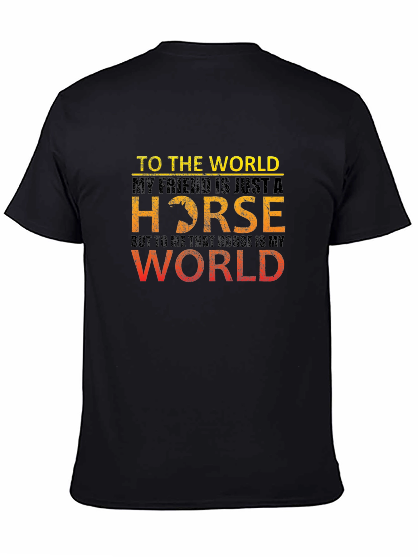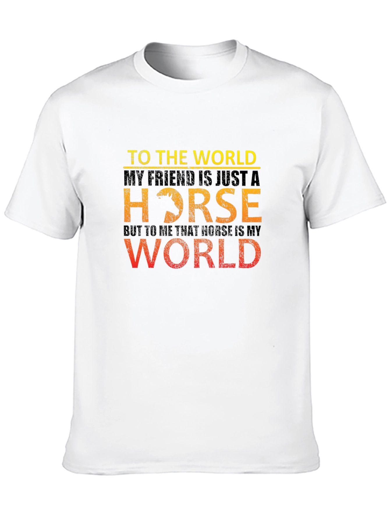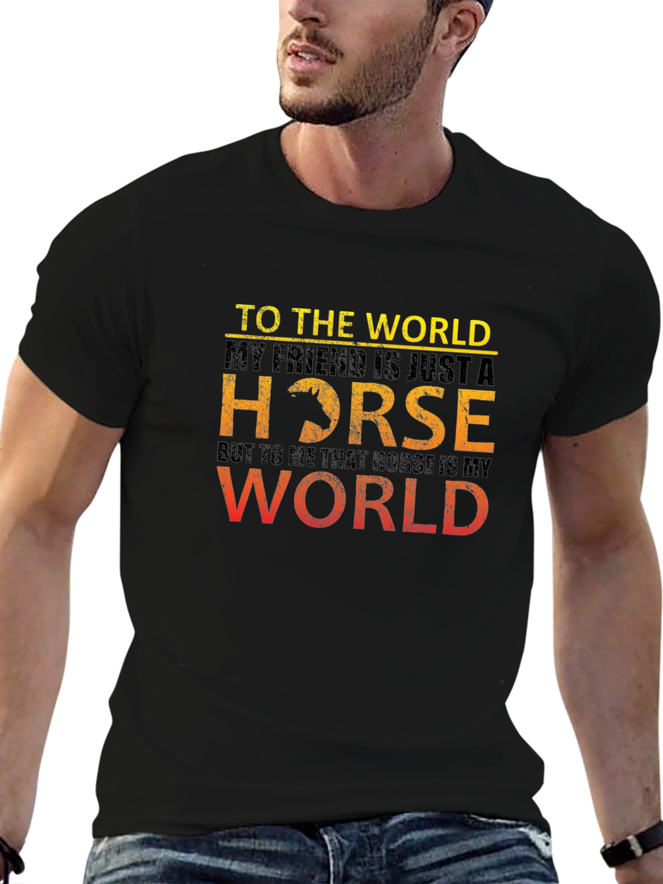 Muestra tu amor por los caballos con esta camiseta negra para hombre. Presenta un llamativo diseño degradado en amarillo y rojo con el texto "To the World, my friend is just a HORSE, but to me that horse is my WORLD". Perfecta para cualquier amante de los caballos, esta camiseta casual es ideal para usar a diario, en el establo o en eventos ecuestres. El tejido suave y cómodo asegura un ajuste perfecto, mientras que el diseño único llamará la atención. ¡Expresa tu pasión por los caballos con esta prenda imprescindible!