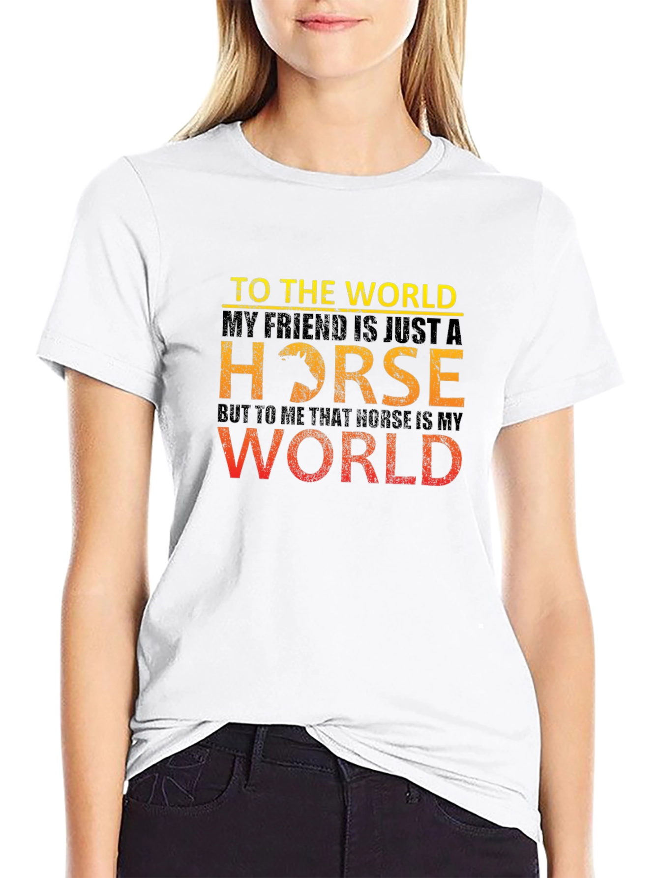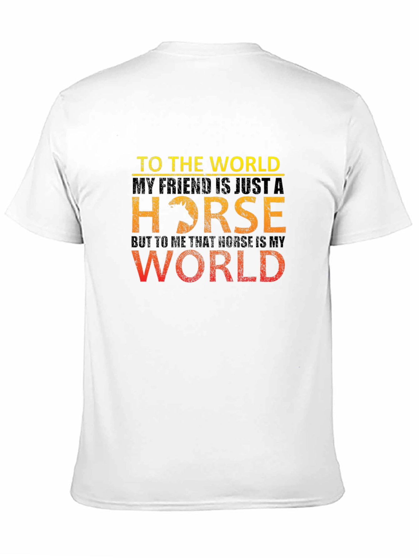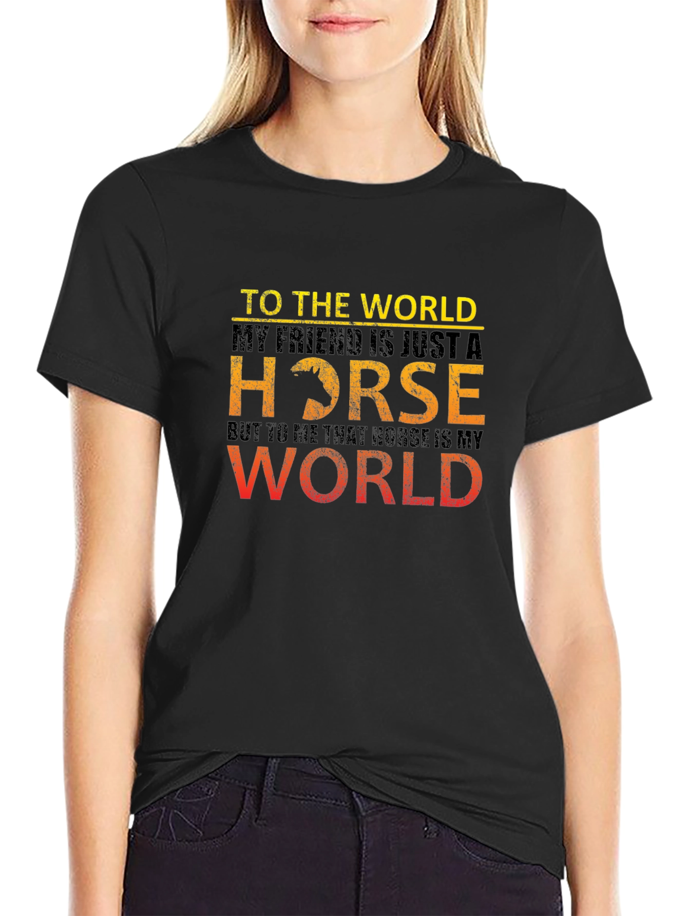 Muestra tu amor por los caballos con esta camiseta negra para hombre. Presenta un llamativo diseño degradado en amarillo y rojo con el texto "To the World, my friend is just a HORSE, but to me that horse is my WORLD". Perfecta para cualquier amante de los caballos, esta camiseta casual es ideal para usar a diario, en el establo o en eventos ecuestres. El tejido suave y cómodo asegura un ajuste perfecto, mientras que el diseño único llamará la atención. ¡Expresa tu pasión por los caballos con esta prenda imprescindible!