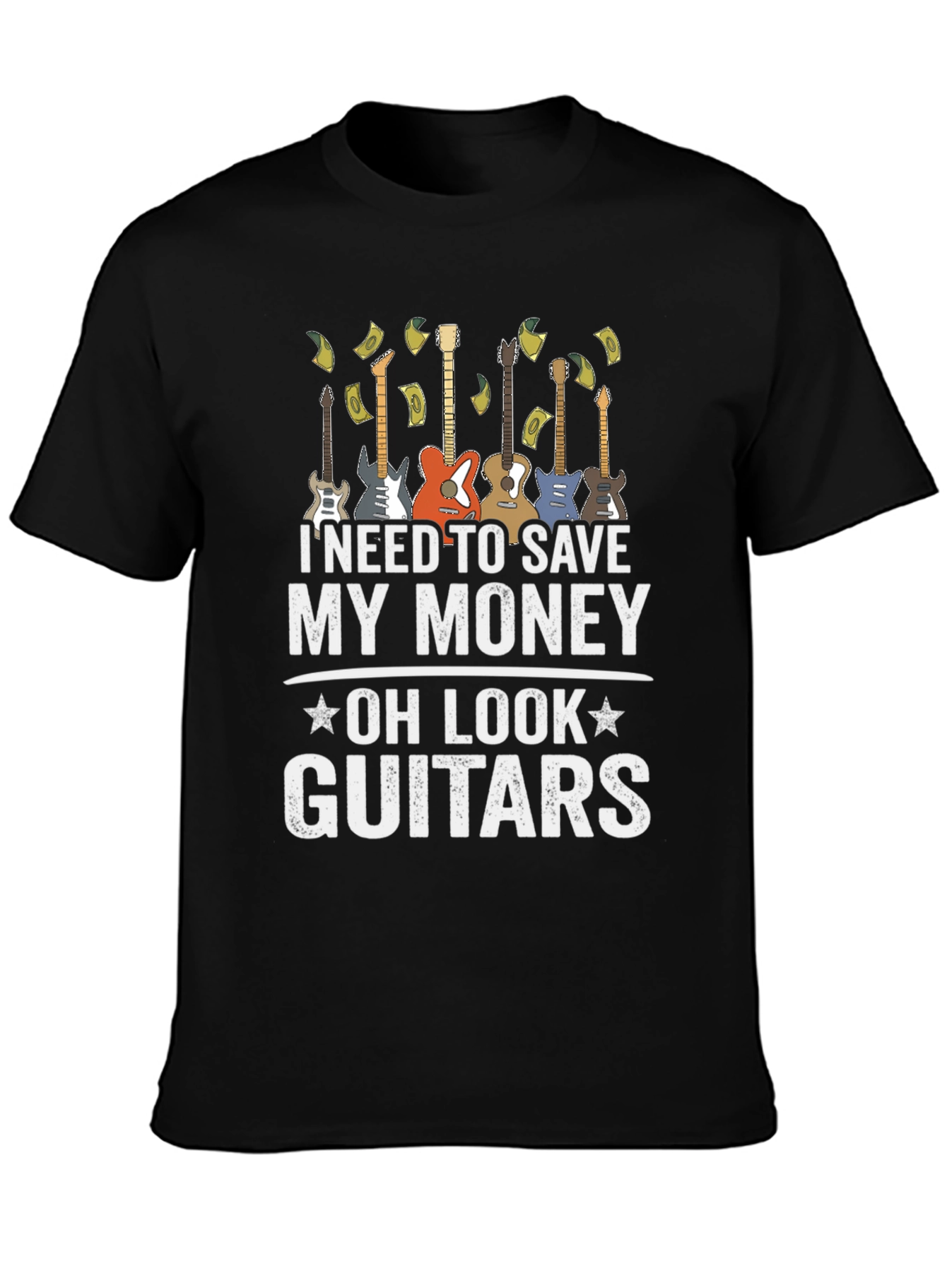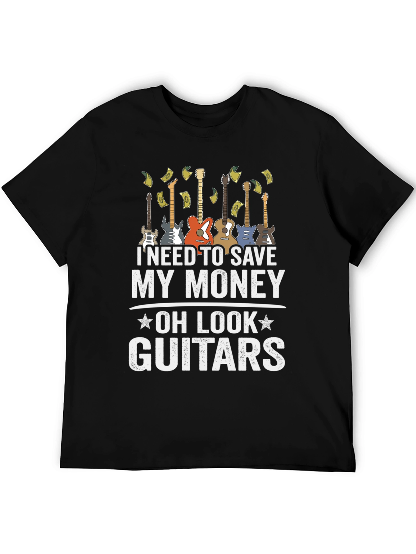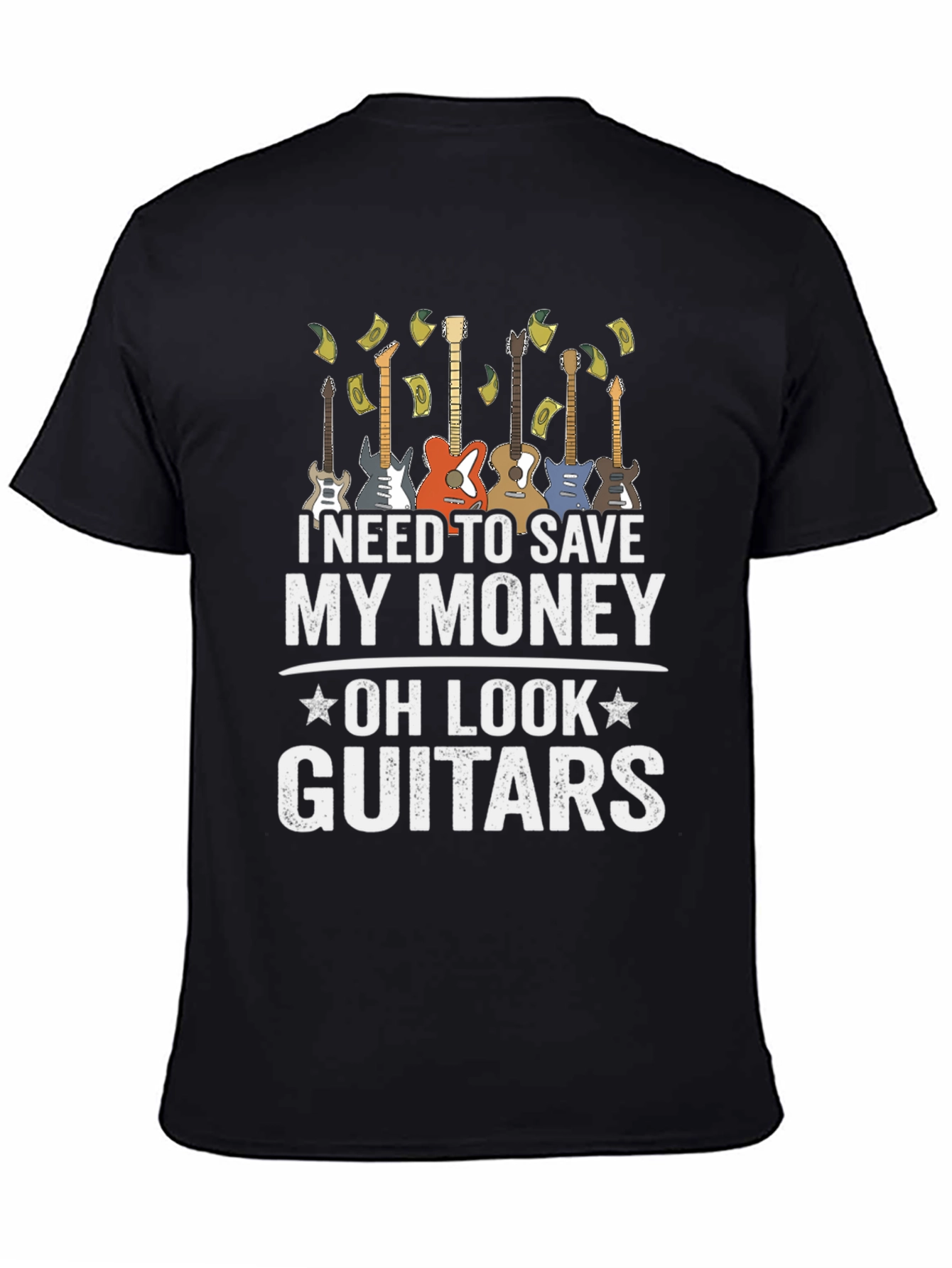 Esta camiseta negra para hombre presenta un diseño divertido y atractivo. Muestra una fila de guitarras eléctricas y la frase "I NEED TO SAVE MY MONEY - OH LOOK - GUITARS", sugiriendo un amor irresistible por la música. La impresión es de alta calidad, destacando sobre el fondo negro de la camiseta. Ideal para músicos, amantes de la guitarra o cualquiera que aprecie un diseño original y con humor. Perfecta para usar en conciertos, reuniones casuales o simplemente para expresar tu pasión por la música. Fabricada con materiales cómodos y duraderos, esta camiseta será una excelente adición a tu guardarropa.