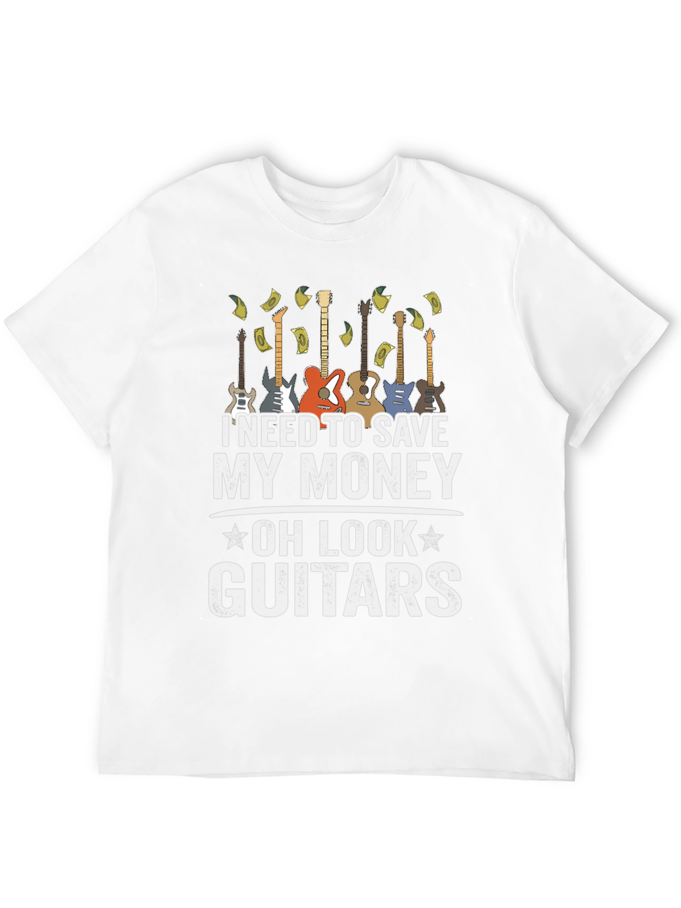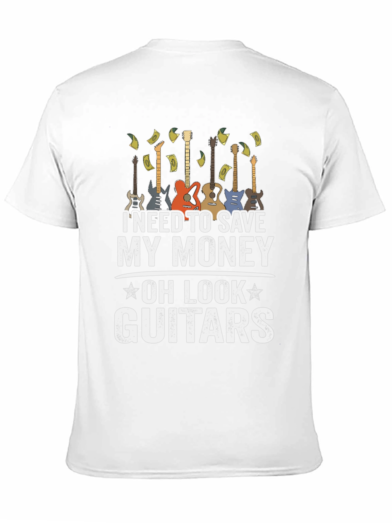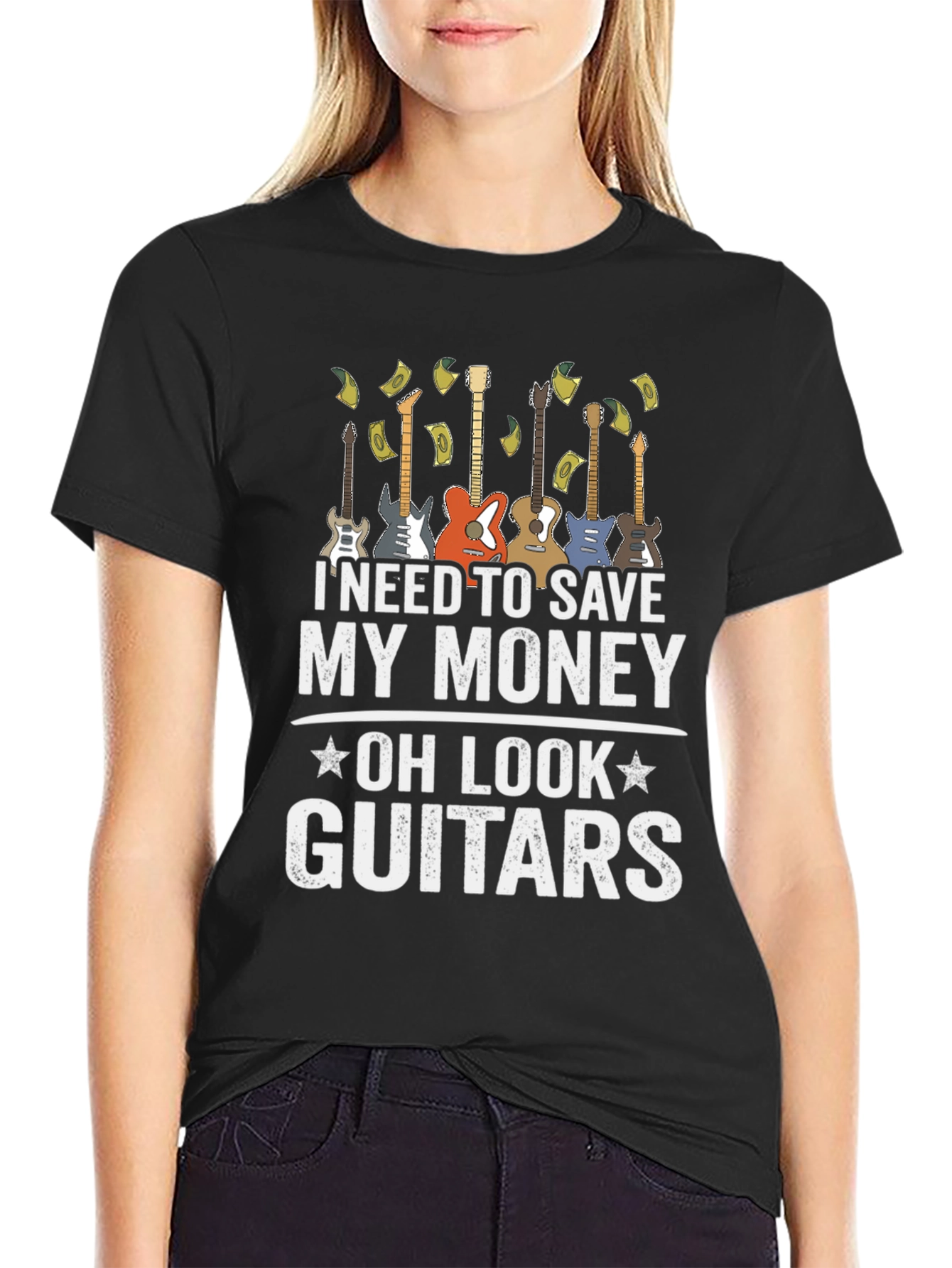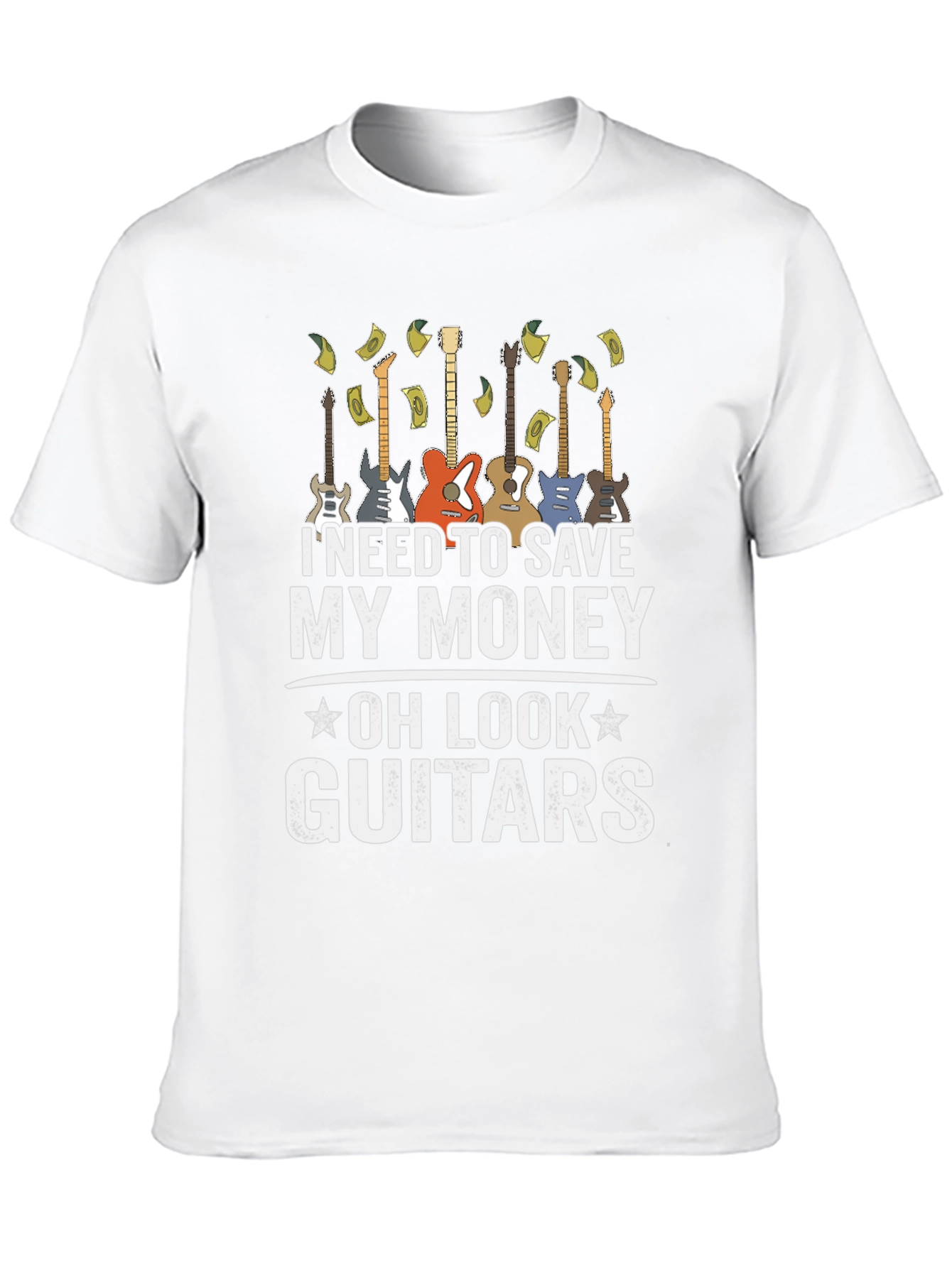 Esta camiseta negra para hombre presenta un diseño divertido y atractivo. Muestra una fila de guitarras eléctricas y la frase "I NEED TO SAVE MY MONEY - OH LOOK - GUITARS", sugiriendo un amor irresistible por la música. La impresión es de alta calidad, destacando sobre el fondo negro de la camiseta. Ideal para músicos, amantes de la guitarra o cualquiera que aprecie un diseño original y con humor. Perfecta para usar en conciertos, reuniones casuales o simplemente para expresar tu pasión por la música. Fabricada con materiales cómodos y duraderos, esta camiseta será una excelente adición a tu guardarropa.