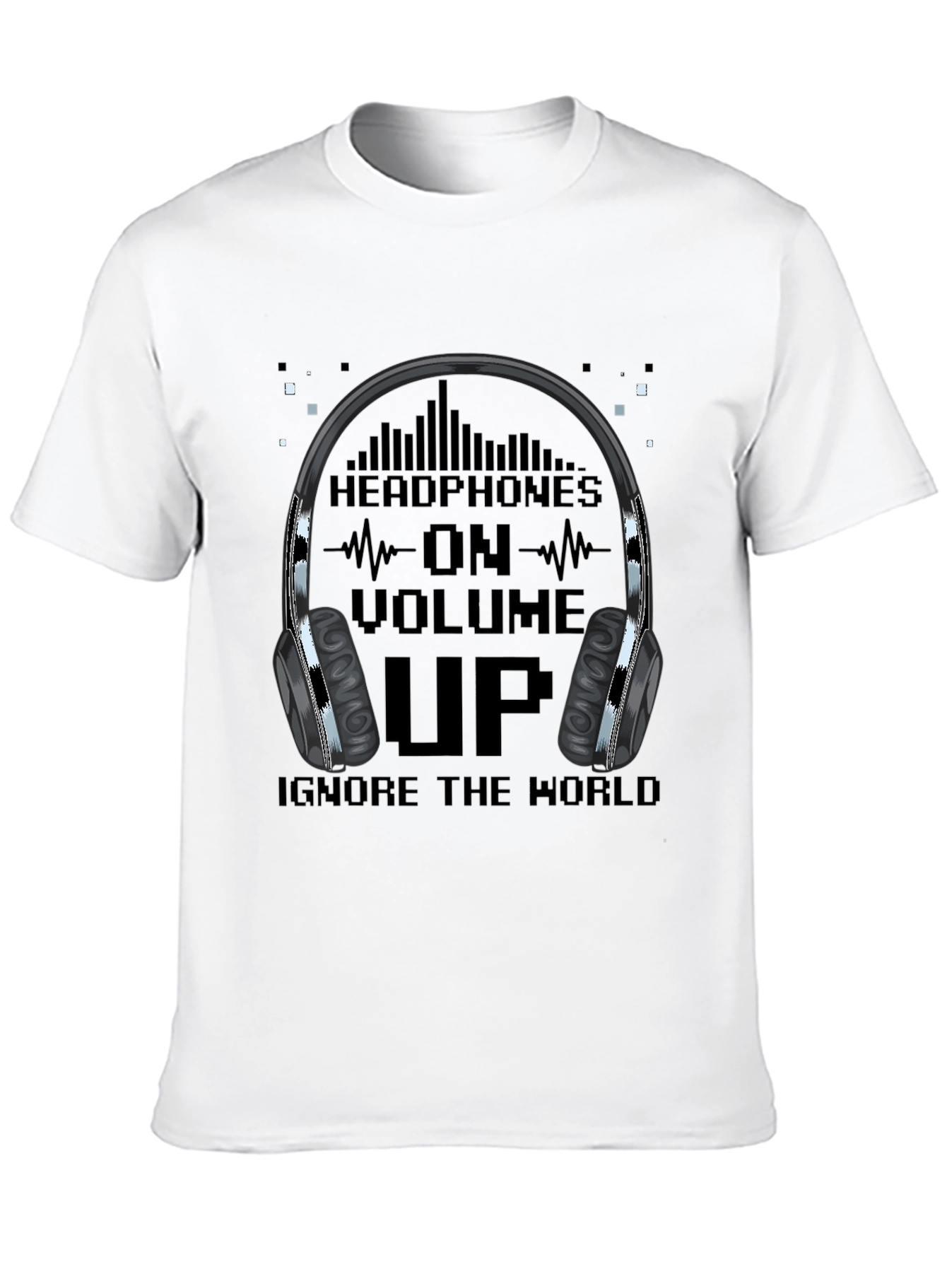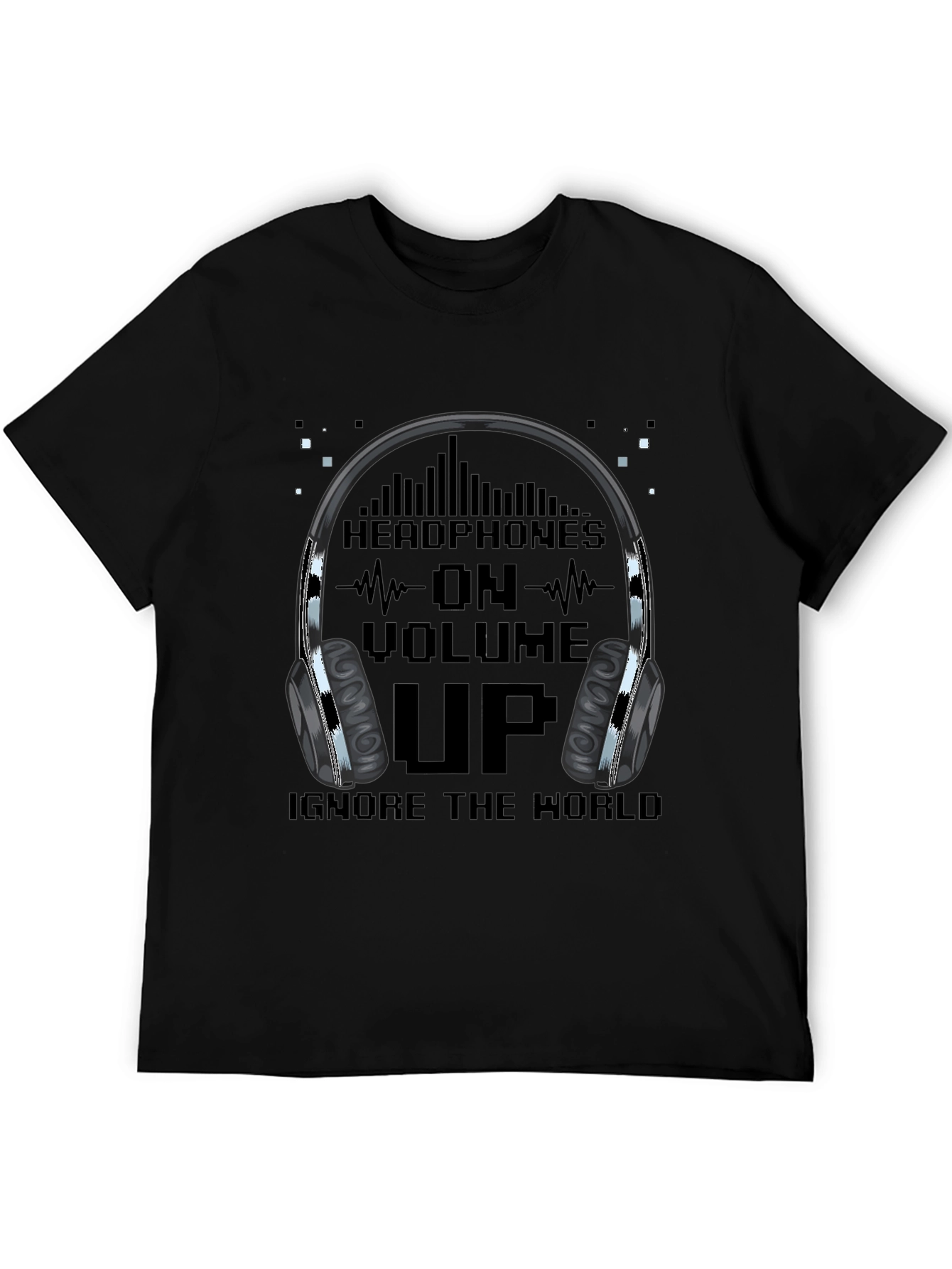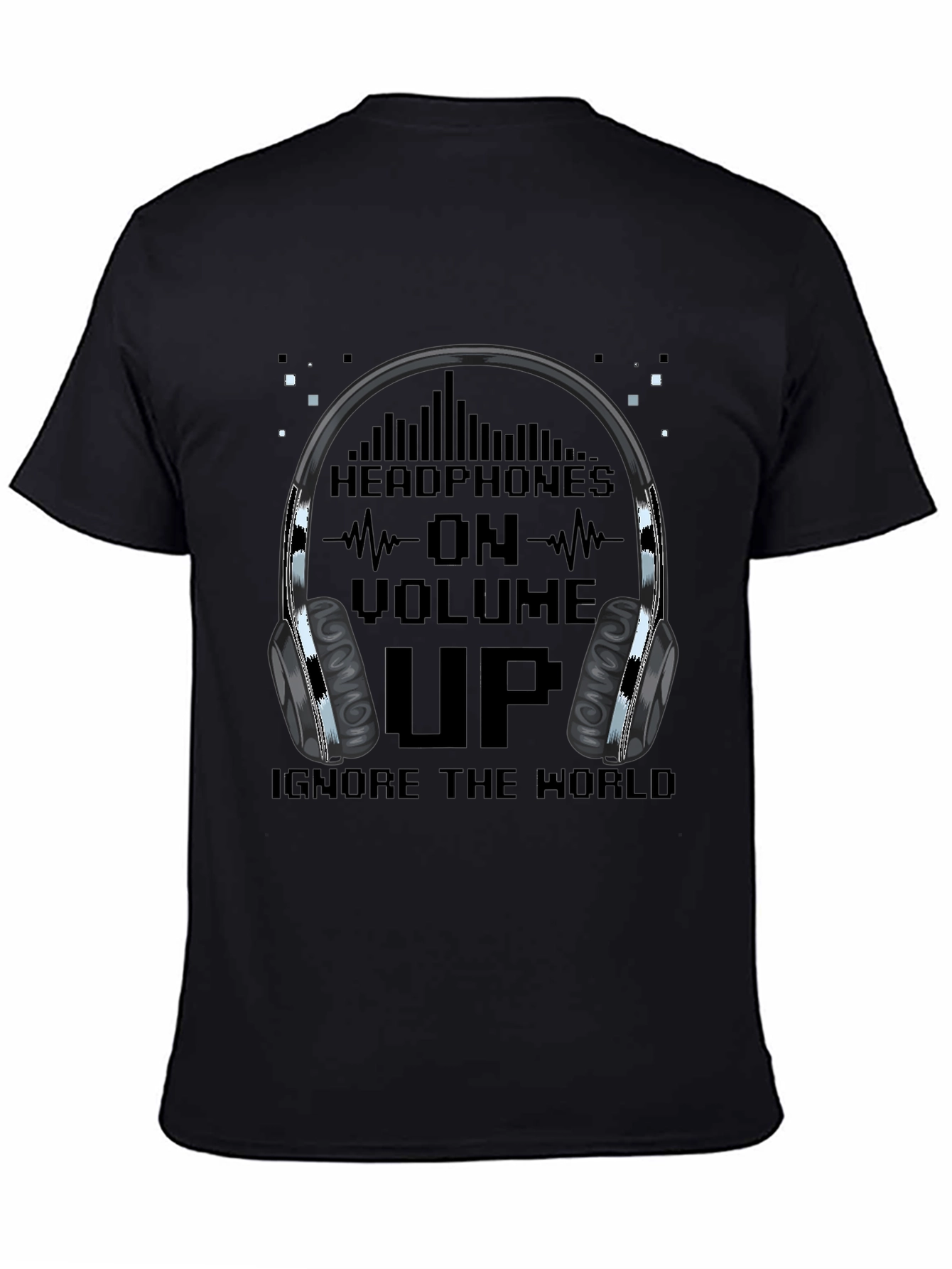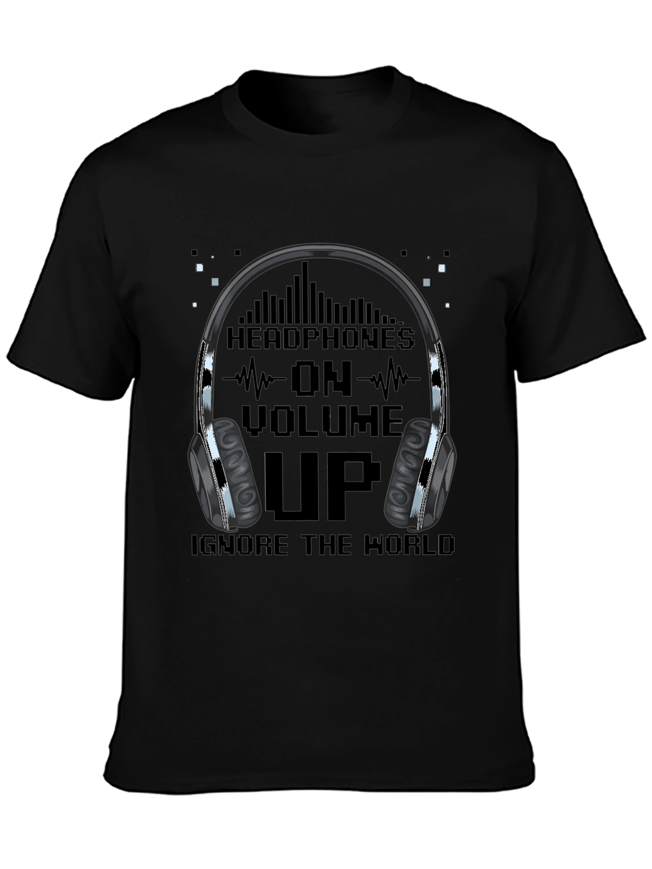 Esta camiseta negra para hombre presenta un diseño atractivo y moderno. En el frente, destaca una ilustración de auriculares estilizados, acompañada de la frase "Headphones On Volume Up Ignore the World" en un estilo gráfico digital. Perfecta para los amantes de la música y aquellos que buscan expresar su personalidad. Ideal para usar en conciertos, salidas casuales o simplemente para relajarse en casa con tu música favorita. Su diseño único la convierte en una prenda llamativa y cómoda para cualquier ocasión informal.