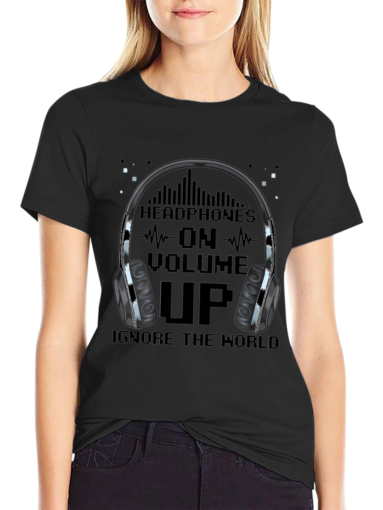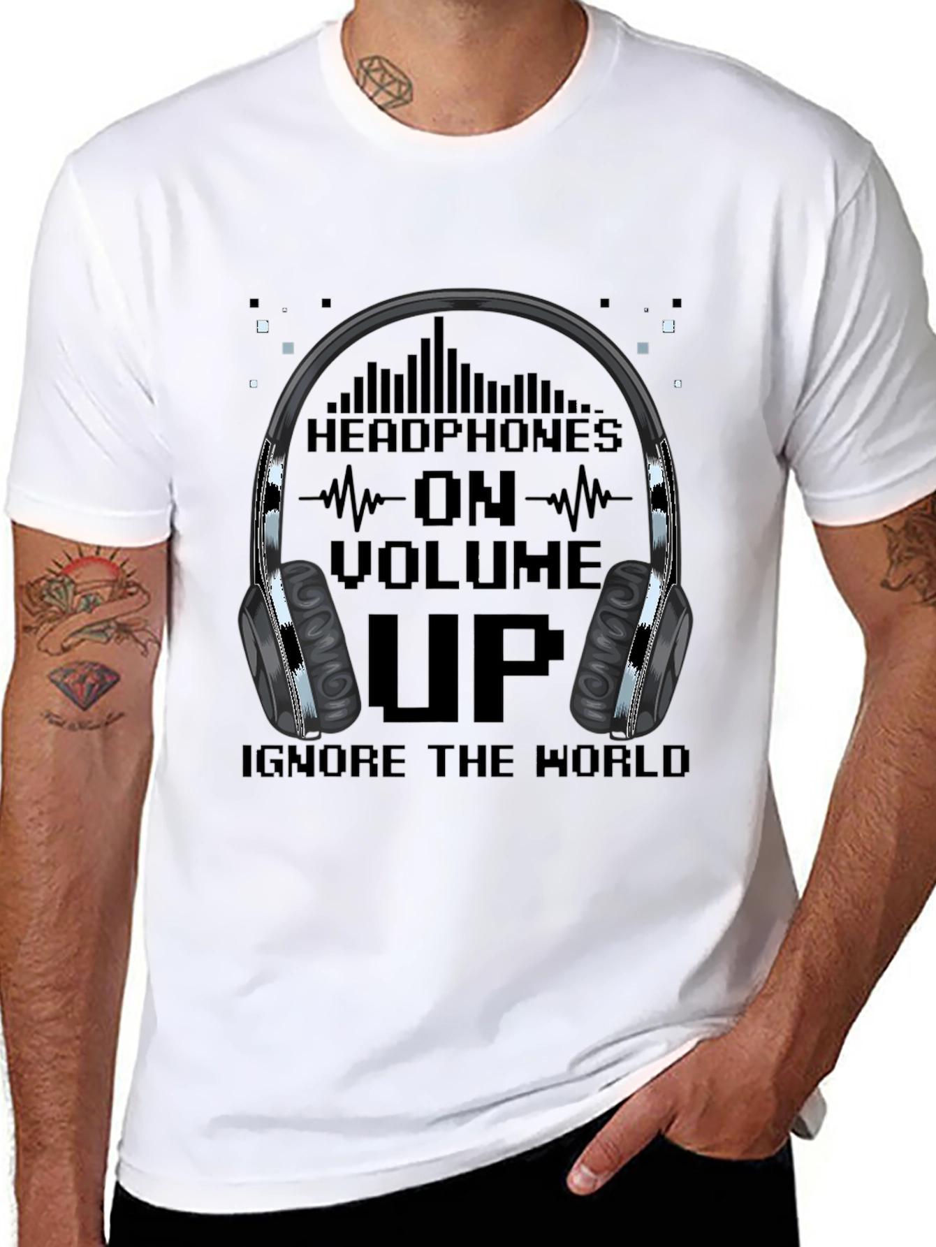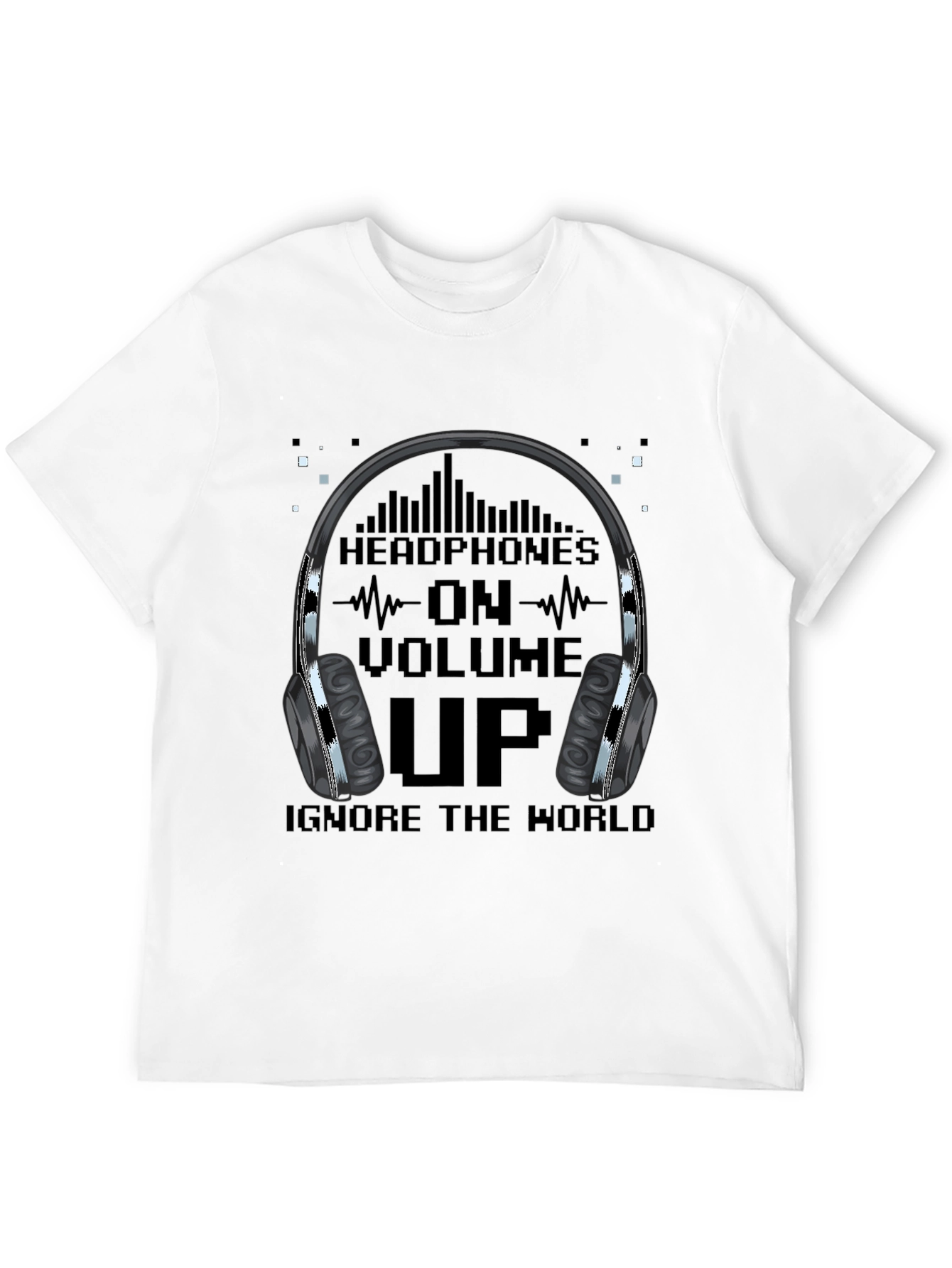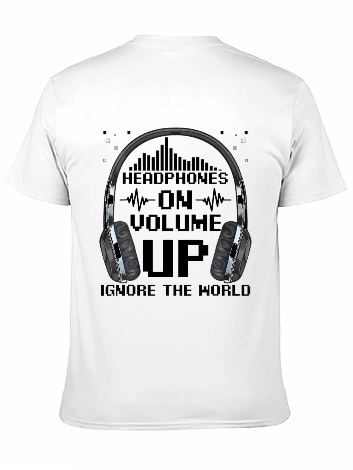 Esta camiseta negra para hombre presenta un diseño atractivo y moderno. En el frente, destaca una ilustración de auriculares estilizados, acompañada de la frase "Headphones On Volume Up Ignore the World" en un estilo gráfico digital. Perfecta para los amantes de la música y aquellos que buscan expresar su personalidad. Ideal para usar en conciertos, salidas casuales o simplemente para relajarse en casa con tu música favorita. Su diseño único la convierte en una prenda llamativa y cómoda para cualquier ocasión informal.