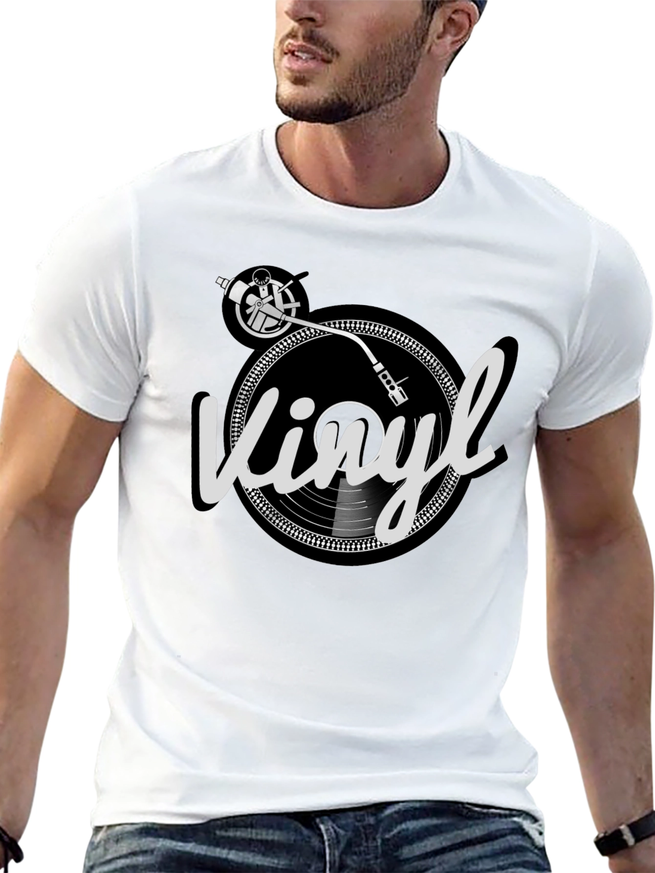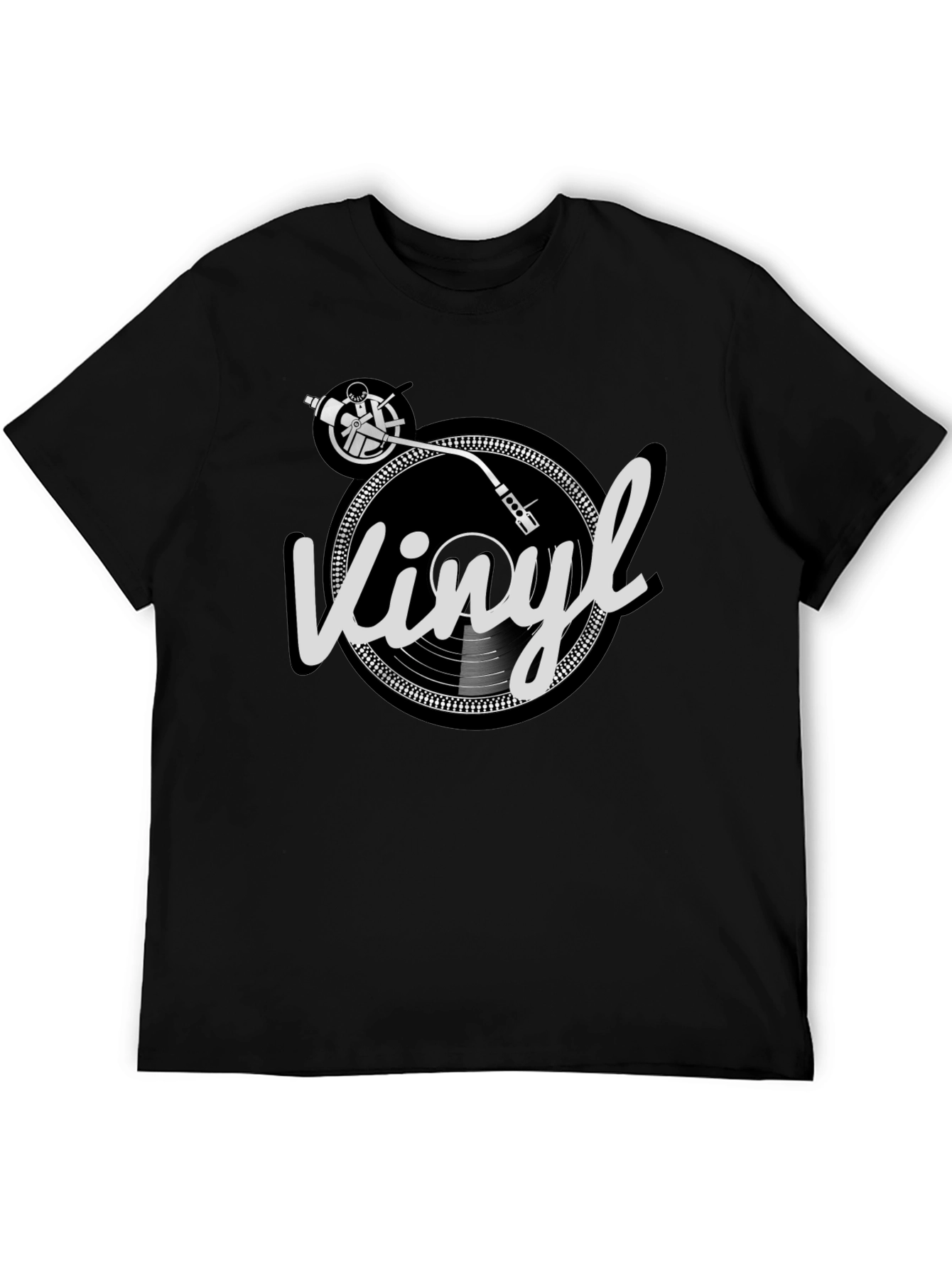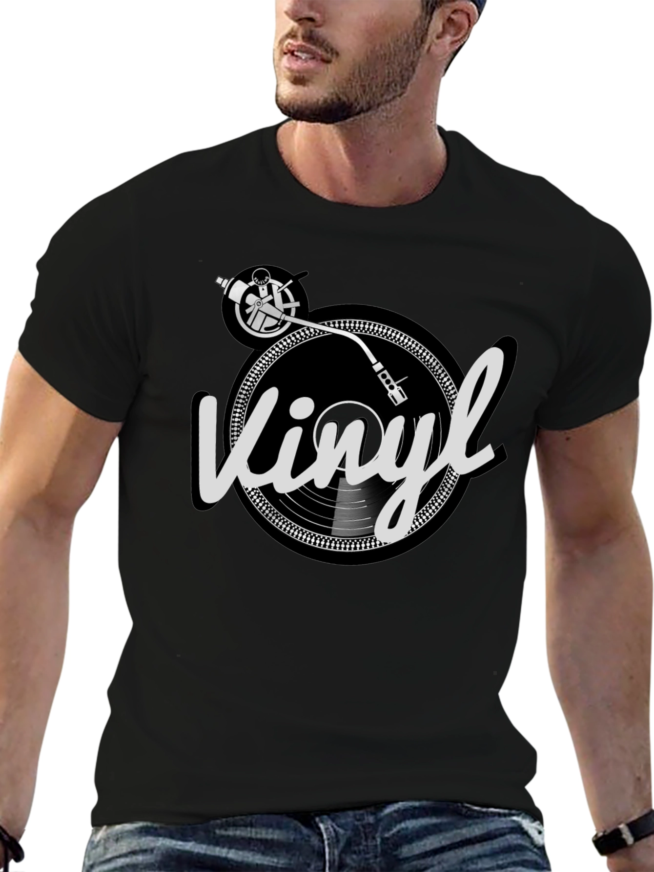 Luce un estilo clásico con esta camiseta negra de hombre. Presenta un diseño llamativo de un tocadiscos y la palabra "Vinyl" en una fuente retro. Perfecta para los amantes de la música y la cultura vintage. Confeccionada en un tejido suave y cómodo, ideal para el uso diario. Combina esta camiseta con tus jeans favoritos para un look casual y moderno. ¡Muestra tu pasión por la música con esta prenda única y original!