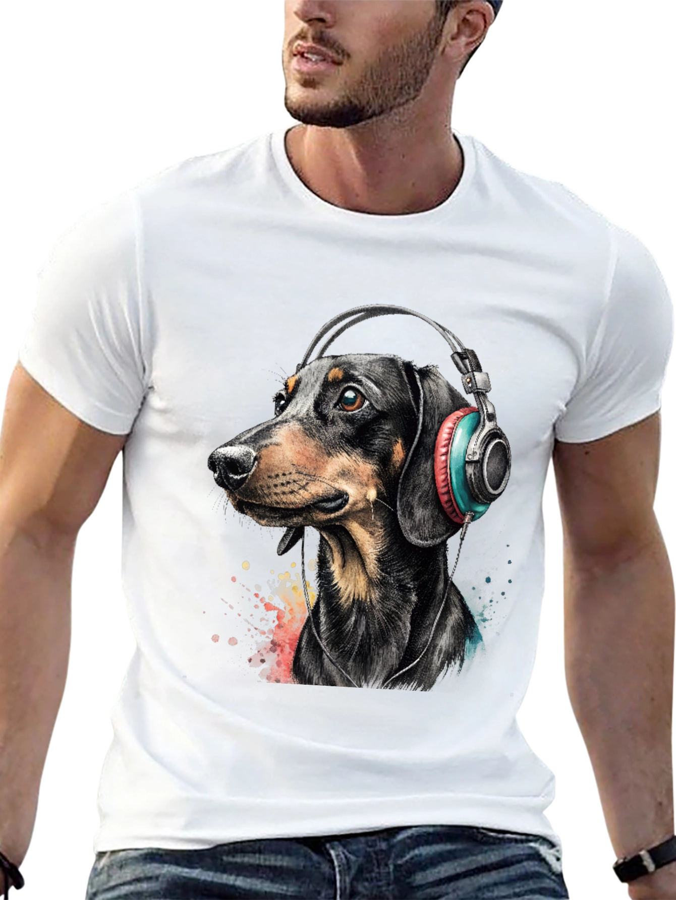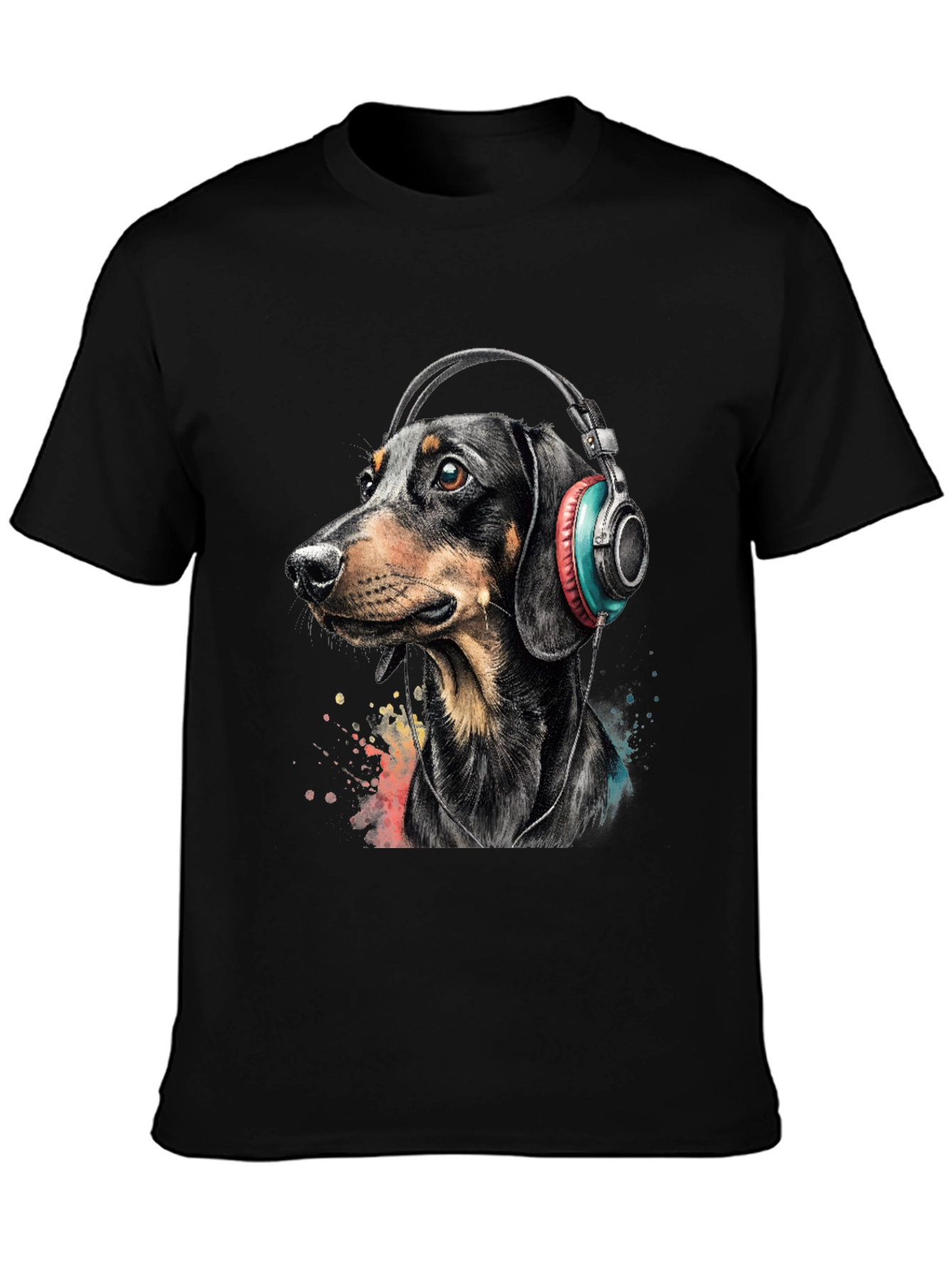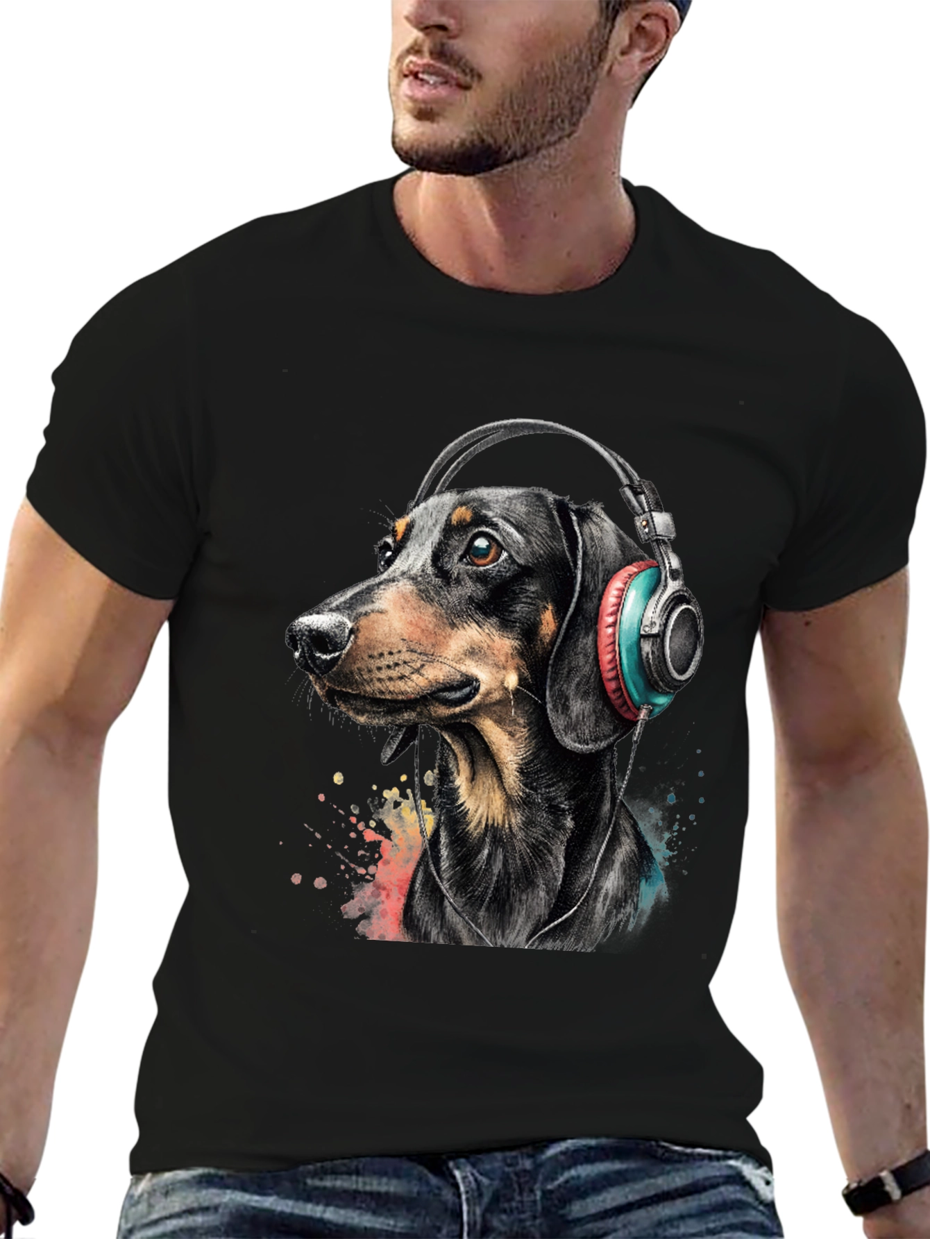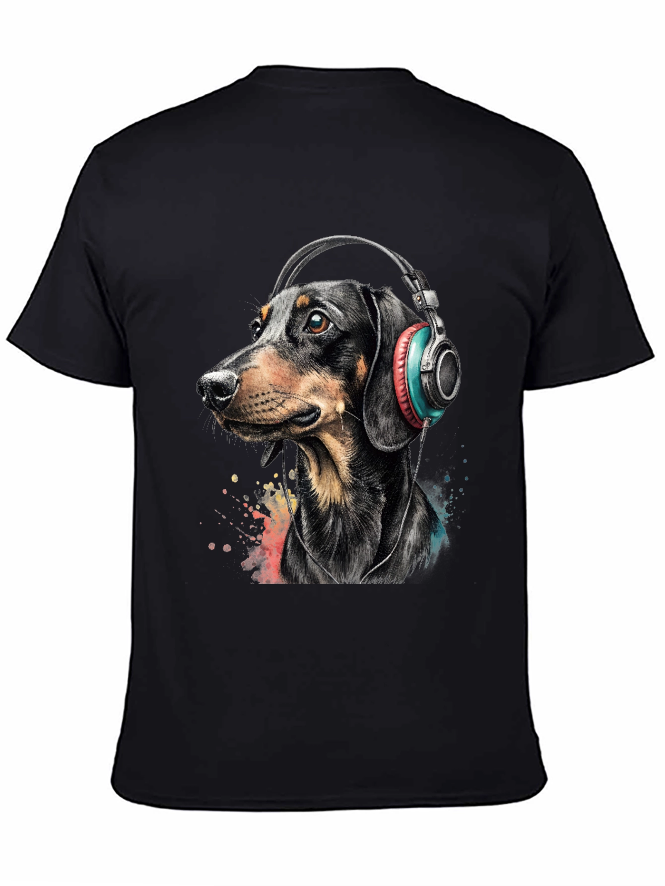 Esta camiseta negra de hombre presenta un llamativo diseño de un perro Dachshund usando auriculares. La impresión detallada muestra al perro con una expresión adorable y los auriculares de colores brillantes añaden un toque divertido. Fabricada con un tejido suave y cómodo, esta camiseta es perfecta para el uso diario. Ideal para los amantes de los perros y la música, esta camiseta es una excelente manera de expresar tu personalidad y estilo único. Combina fácilmente con jeans, pantalones cortos o joggers para un look casual y relajado. Perfecta para regalar.