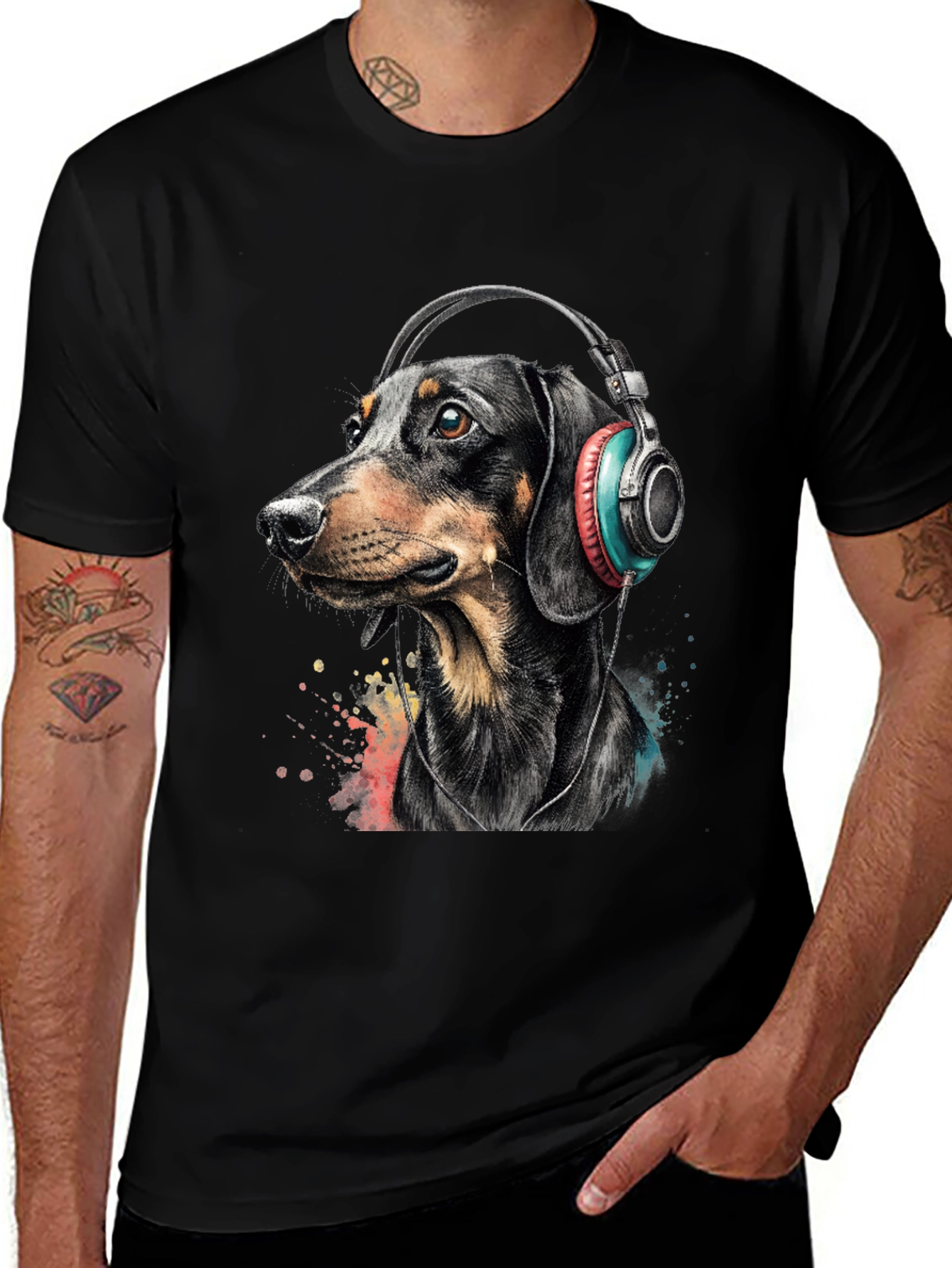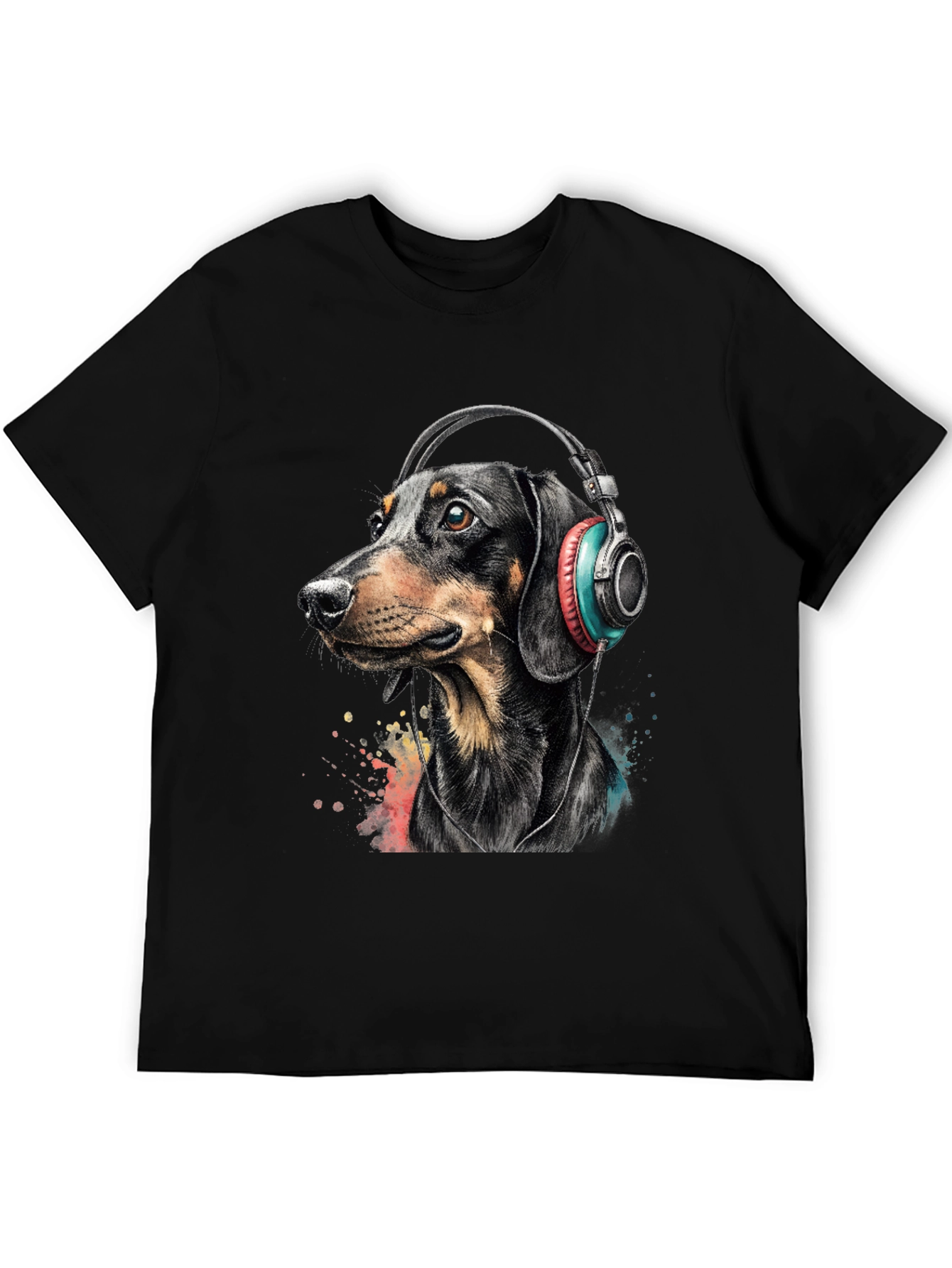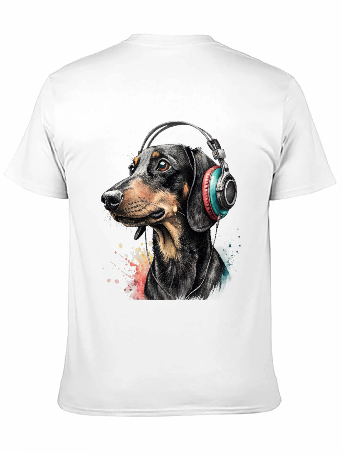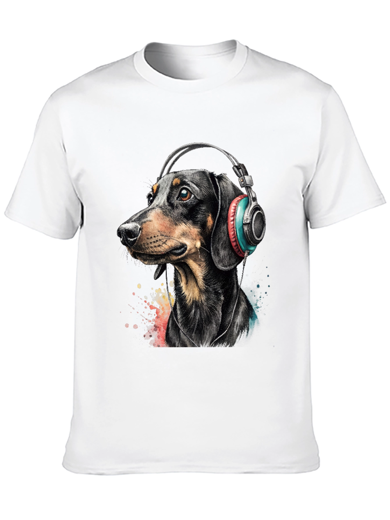 Esta camiseta negra de hombre presenta un llamativo diseño de un perro Dachshund usando auriculares. La impresión detallada muestra al perro con una expresión adorable y los auriculares de colores brillantes añaden un toque divertido. Fabricada con un tejido suave y cómodo, esta camiseta es perfecta para el uso diario. Ideal para los amantes de los perros y la música, esta camiseta es una excelente manera de expresar tu personalidad y estilo único. Combina fácilmente con jeans, pantalones cortos o joggers para un look casual y relajado. Perfecta para regalar.