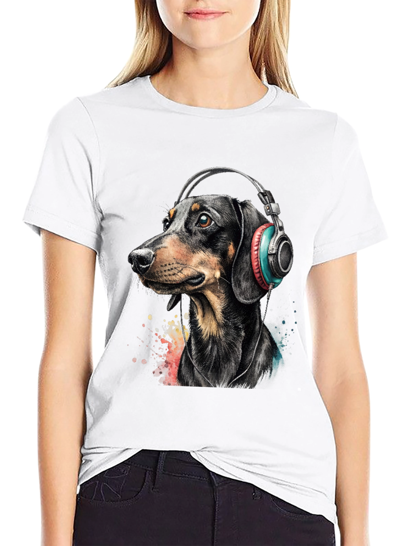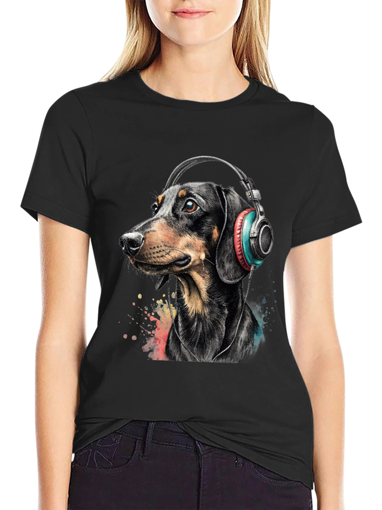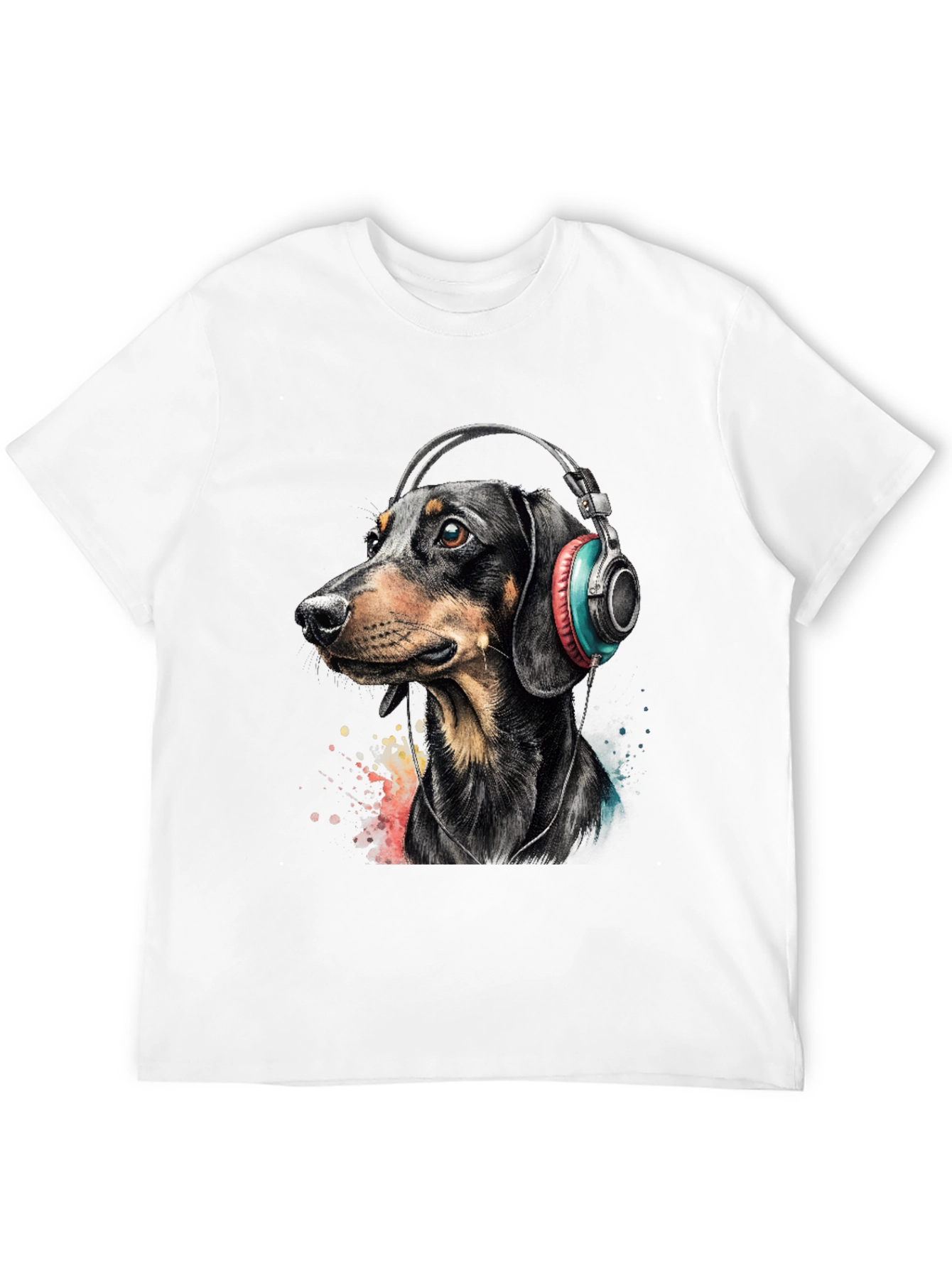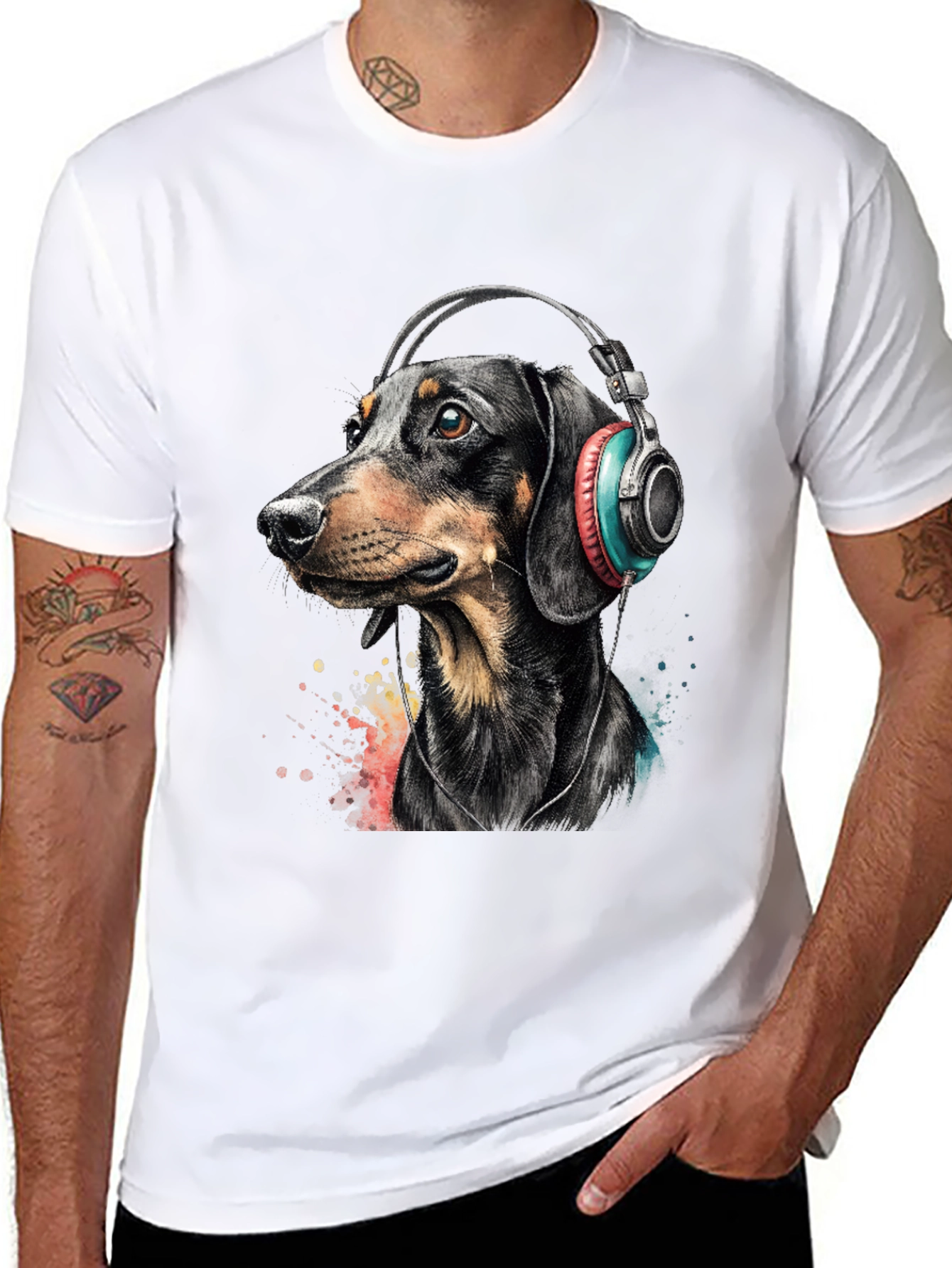 Esta camiseta negra de hombre presenta un llamativo diseño de un perro Dachshund usando auriculares. La impresión detallada muestra al perro con una expresión adorable y los auriculares de colores brillantes añaden un toque divertido. Fabricada con un tejido suave y cómodo, esta camiseta es perfecta para el uso diario. Ideal para los amantes de los perros y la música, esta camiseta es una excelente manera de expresar tu personalidad y estilo único. Combina fácilmente con jeans, pantalones cortos o joggers para un look casual y relajado. Perfecta para regalar.