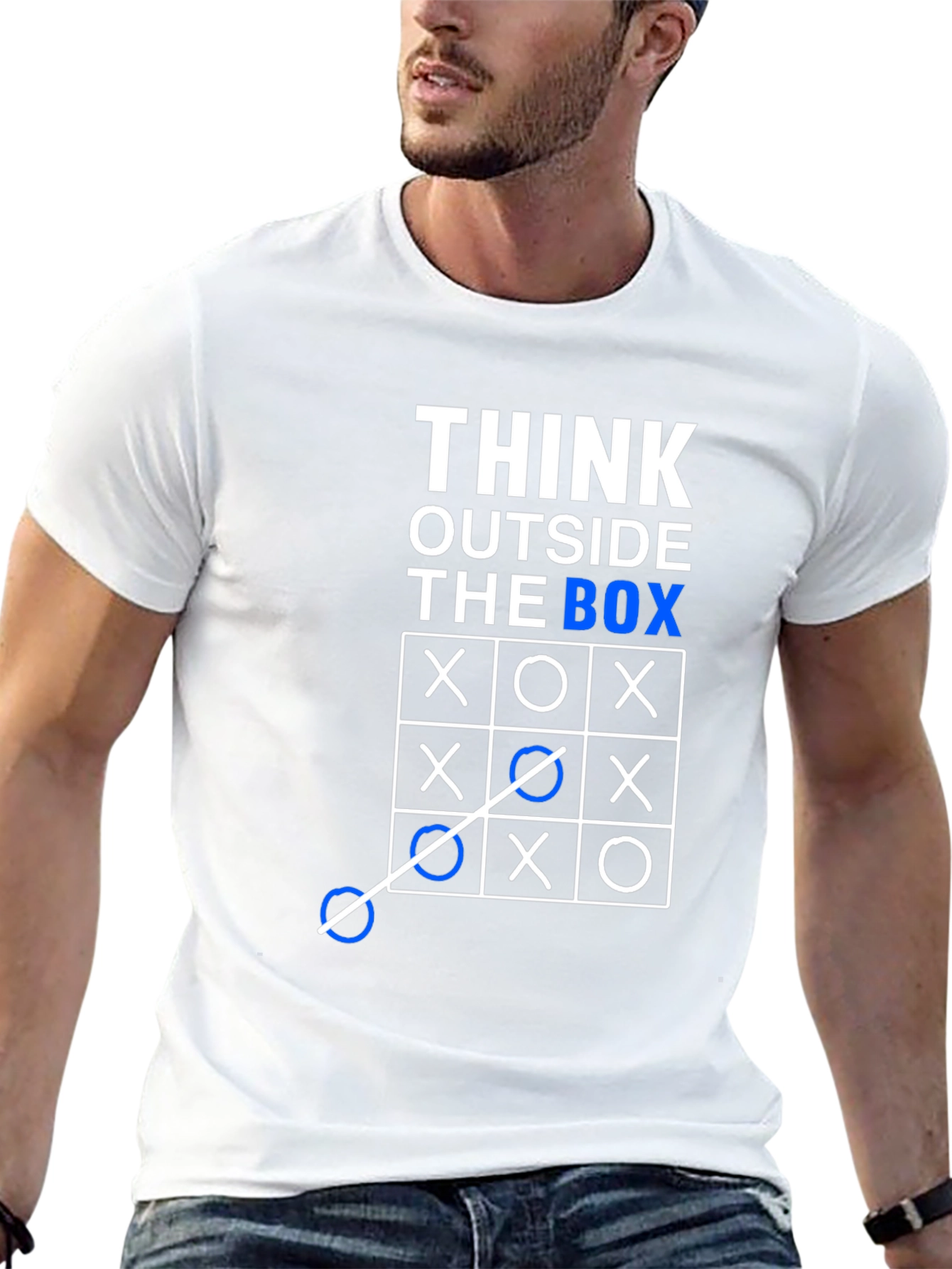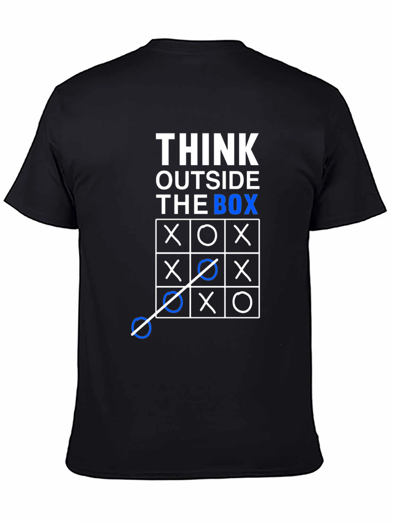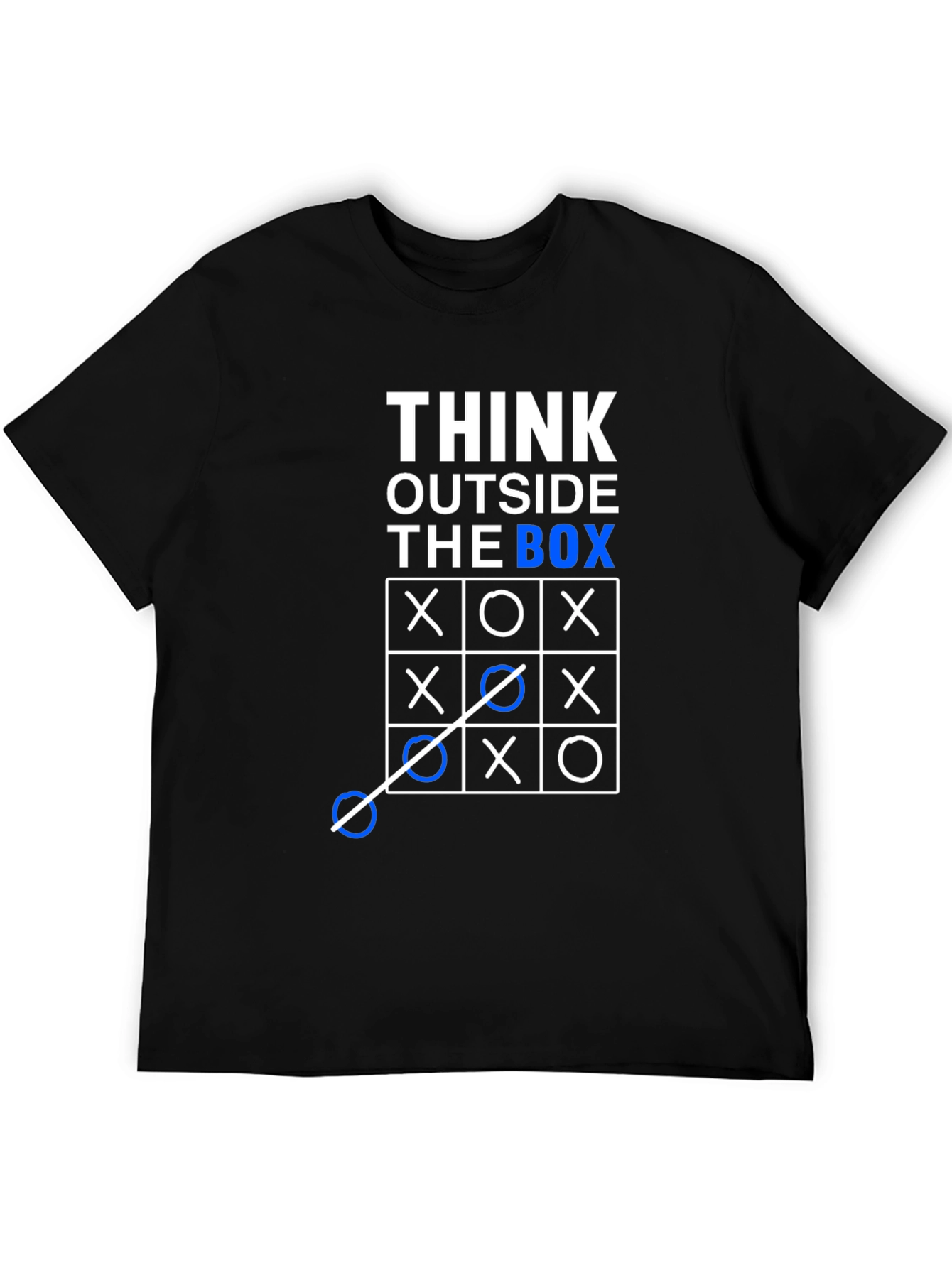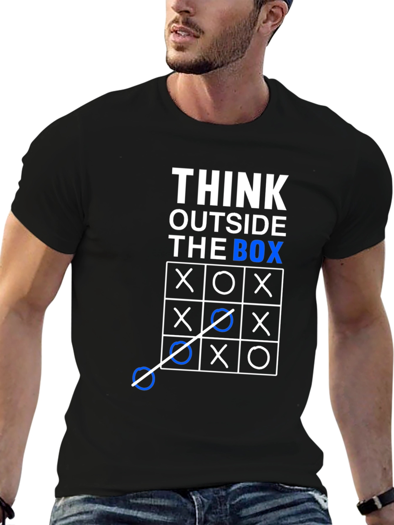 Luce esta original camiseta negra de hombre con un diseño único. La camiseta presenta un llamativo gráfico con la frase "THINK OUTSIDE THE BOX" (Piensa Fuera de la Caja) sobre un dibujo de un juego de tres en raya con círculos y cruces, algunos en color azul. Fabricada en suave tejido de algodón, esta camiseta de manga corta ofrece comodidad y estilo. Perfecta para expresar tu individualidad y sentido del humor. Ideal para uso casual, salidas con amigos o simplemente para relajarte en casa. Su diseño distintivo la convierte en un excelente tema de conversación.