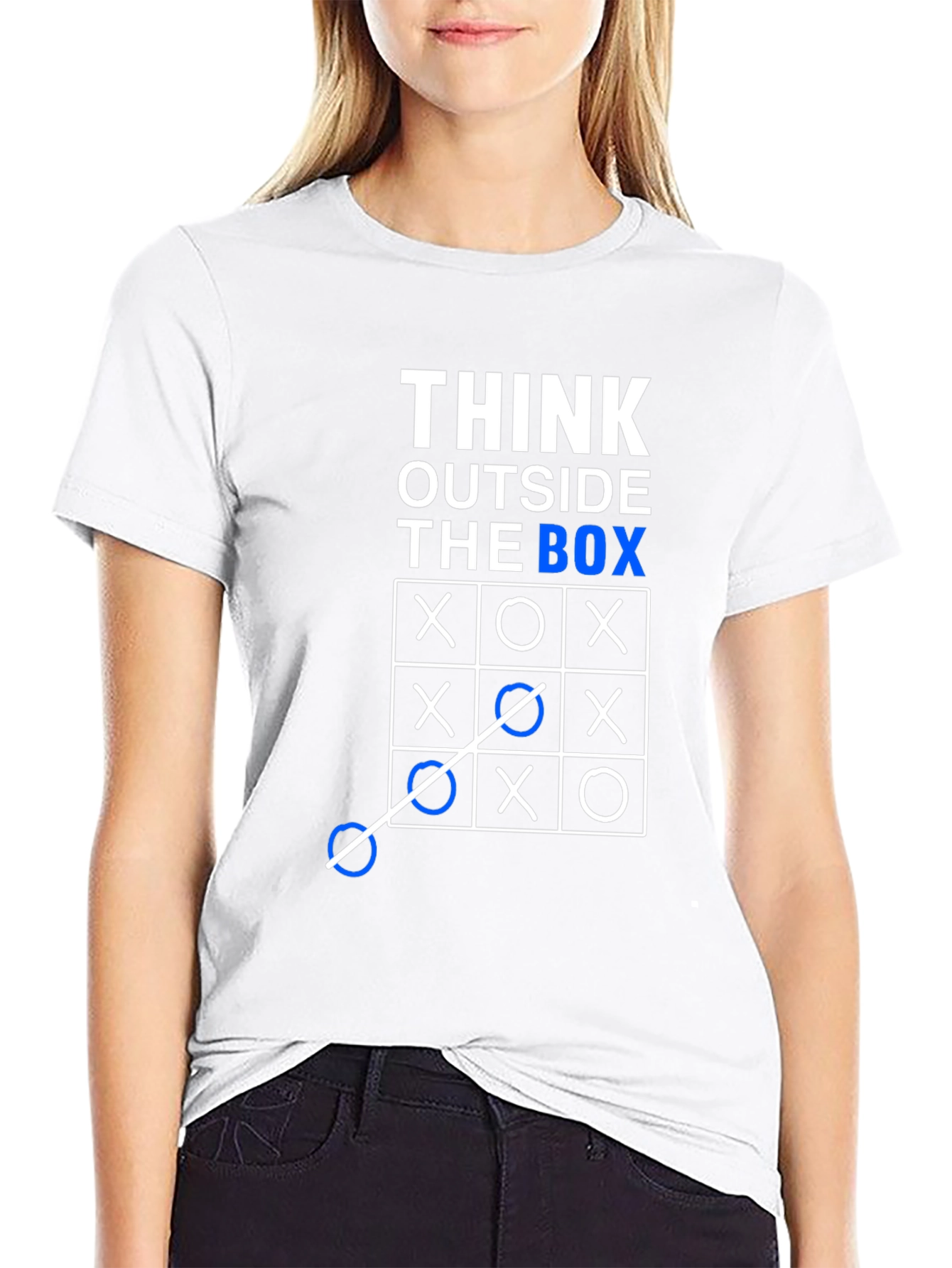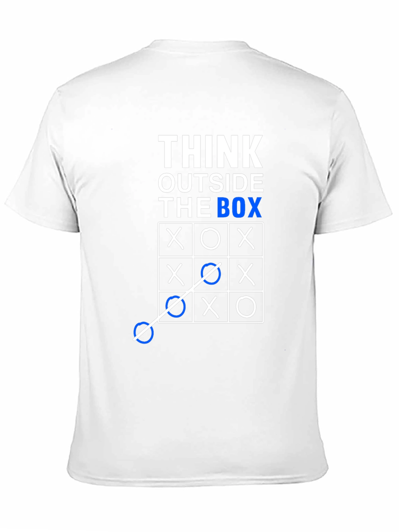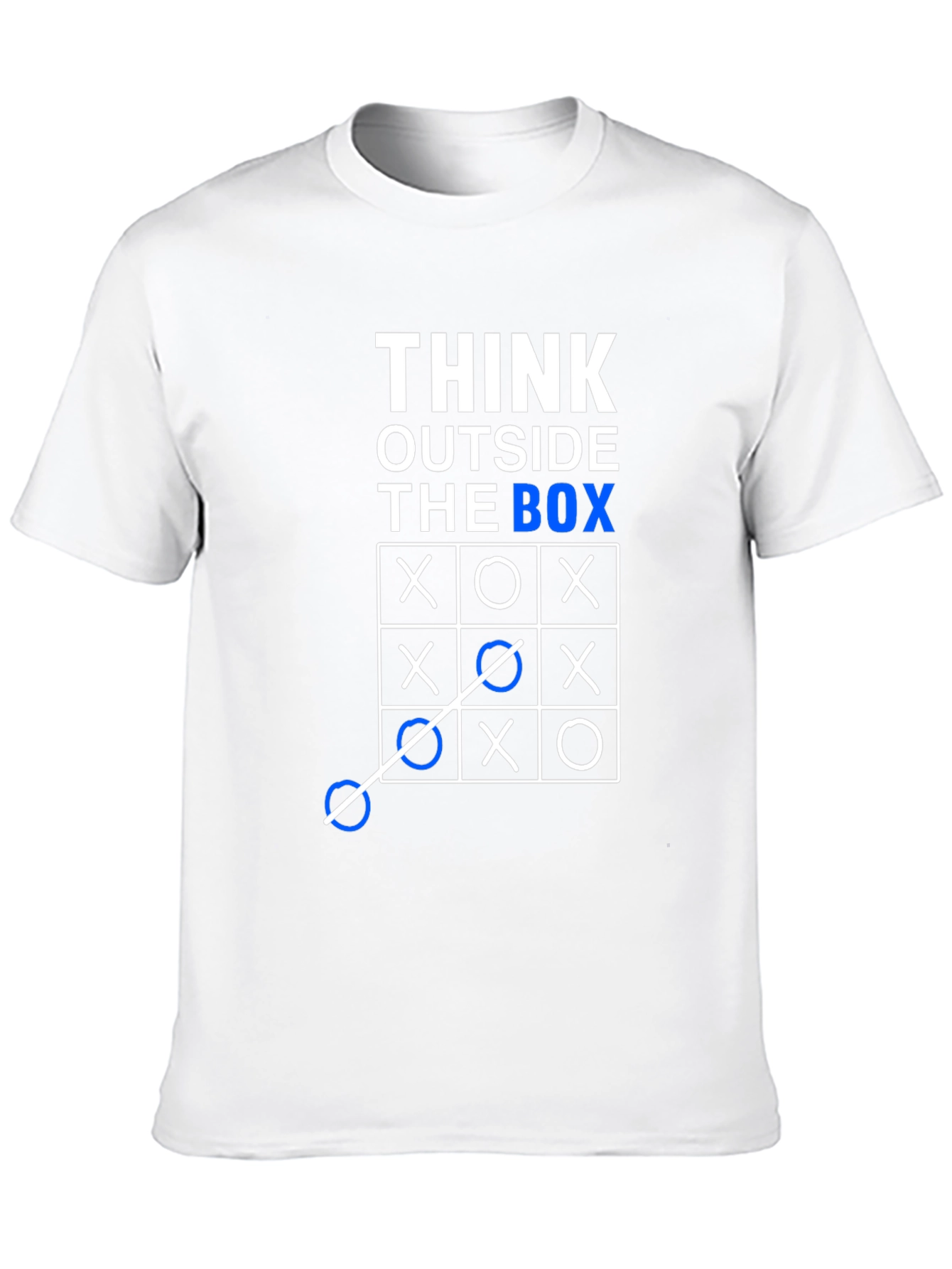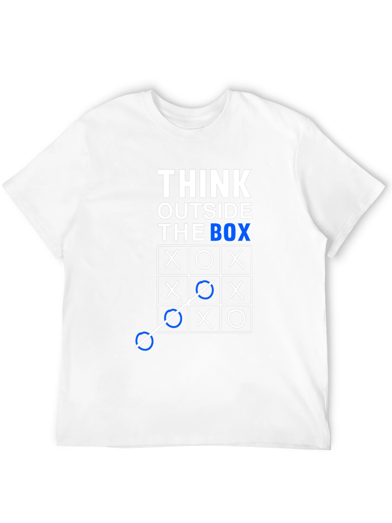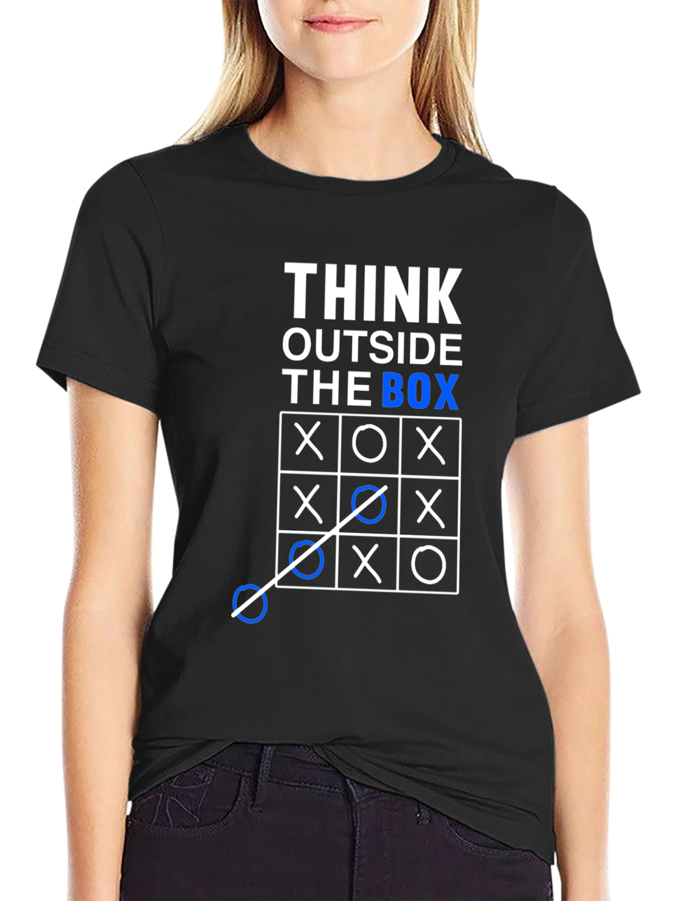 Luce esta original camiseta negra de hombre con un diseño único. La camiseta presenta un llamativo gráfico con la frase "THINK OUTSIDE THE BOX" (Piensa Fuera de la Caja) sobre un dibujo de un juego de tres en raya con círculos y cruces, algunos en color azul. Fabricada en suave tejido de algodón, esta camiseta de manga corta ofrece comodidad y estilo. Perfecta para expresar tu individualidad y sentido del humor. Ideal para uso casual, salidas con amigos o simplemente para relajarte en casa. Su diseño distintivo la convierte en un excelente tema de conversación.