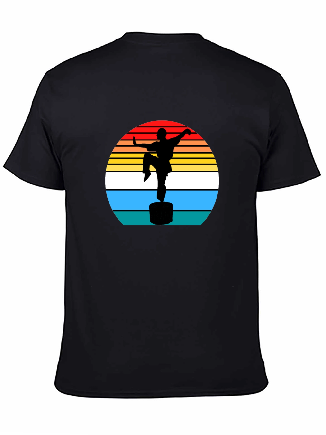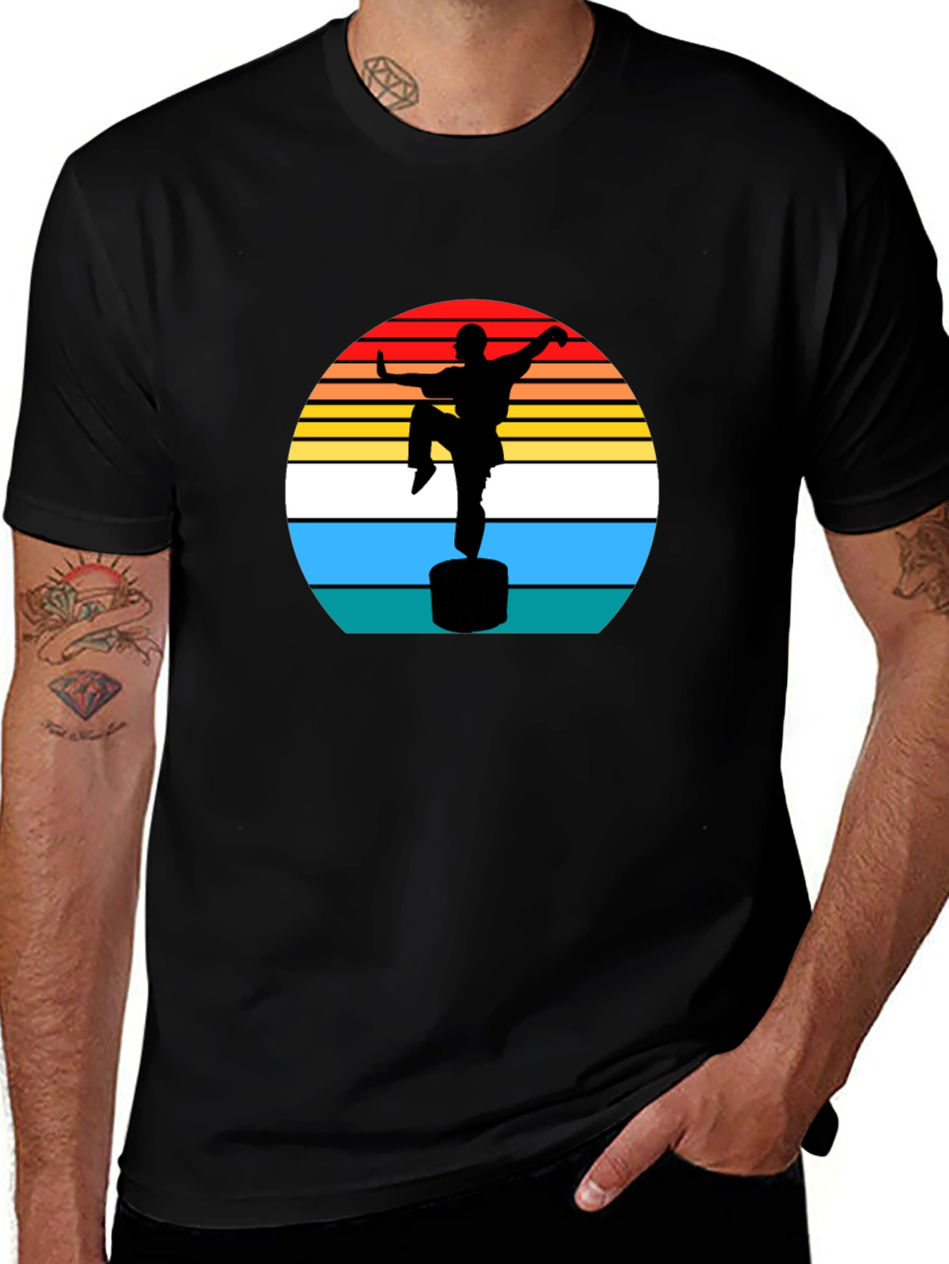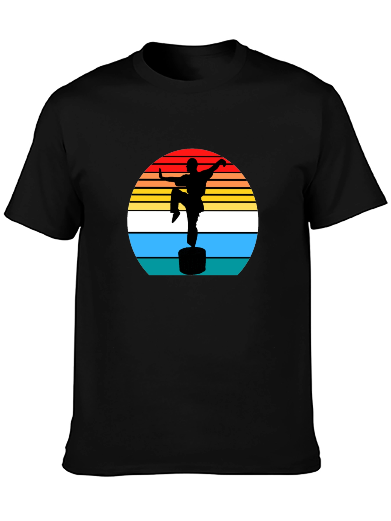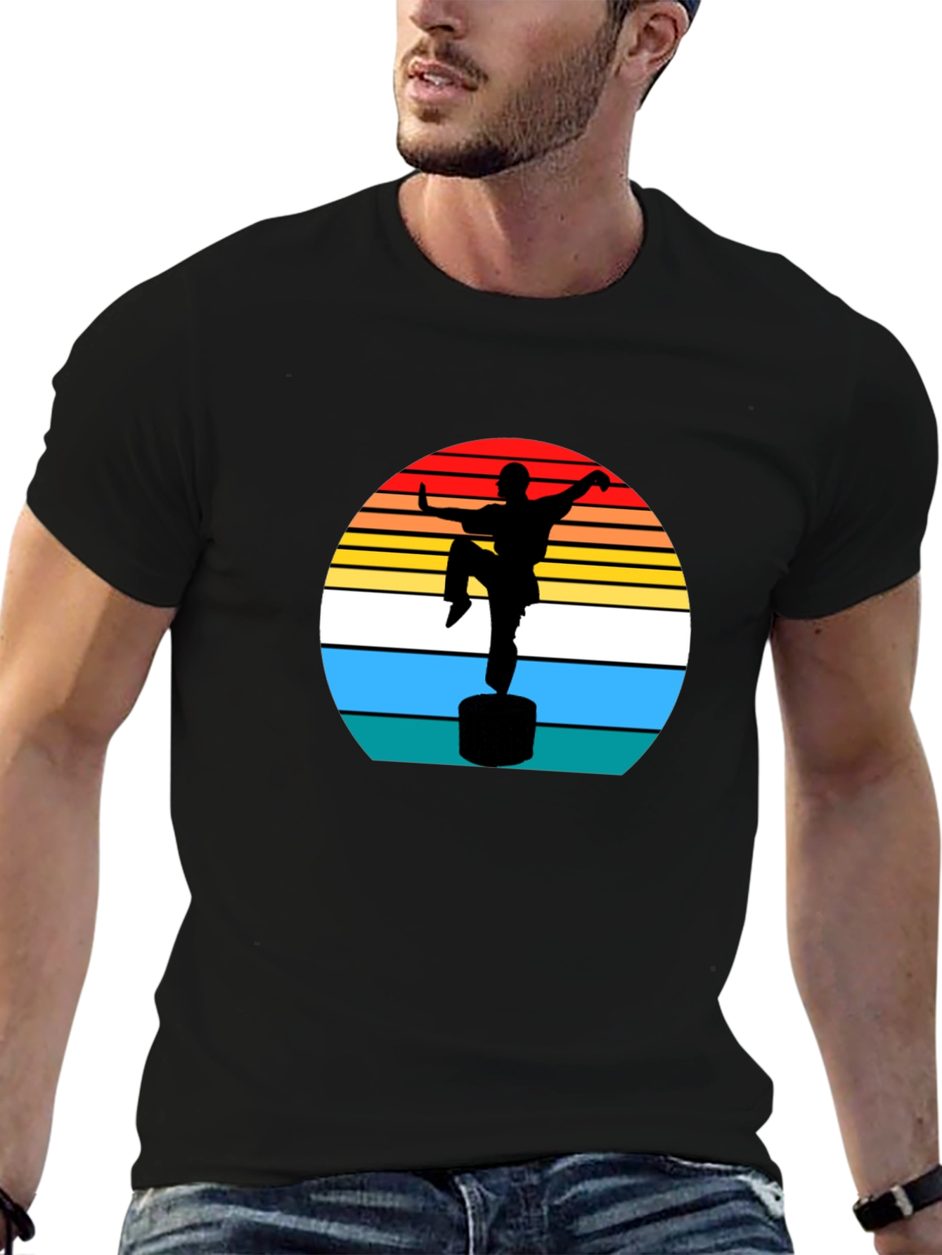 Eleva tu estilo con esta llamativa camiseta negra para hombre. El diseño presenta una silueta de un artista de kung fu sobre un fondo circular retro con franjas de colores rojo, amarillo, blanco, azul claro y verde azulado, evocando un estilo vintage. Perfecta para destacar entre la multitud, esta camiseta es ideal para los amantes de las artes marciales y la moda retro. El tejido parece ser de algodón suave y cómodo, ideal para uso diario. Combínala con tus jeans favoritos o pantalones deportivos para un look casual pero con actitud. ¡Muestra tu pasión por el kung fu con esta prenda única!
