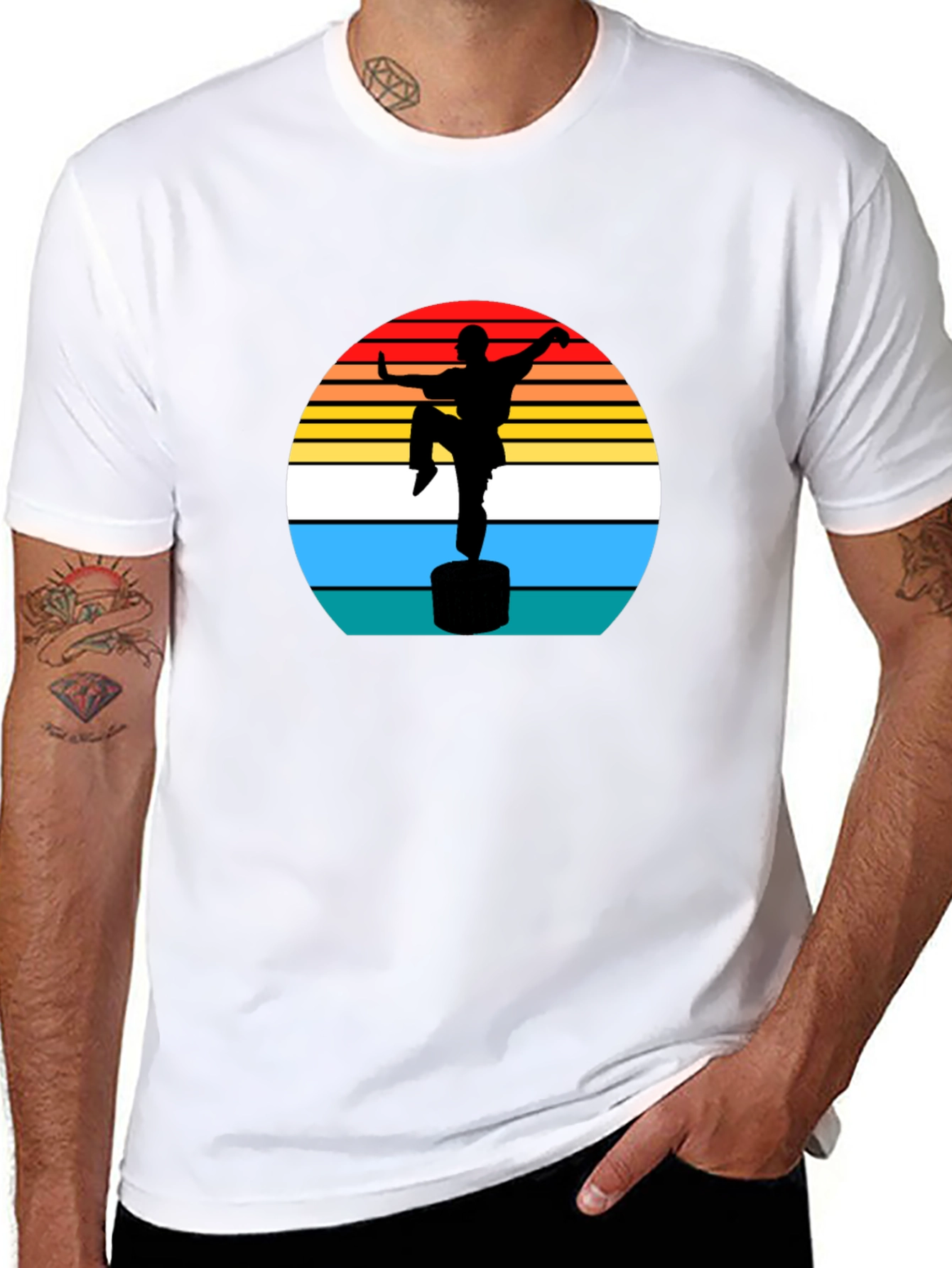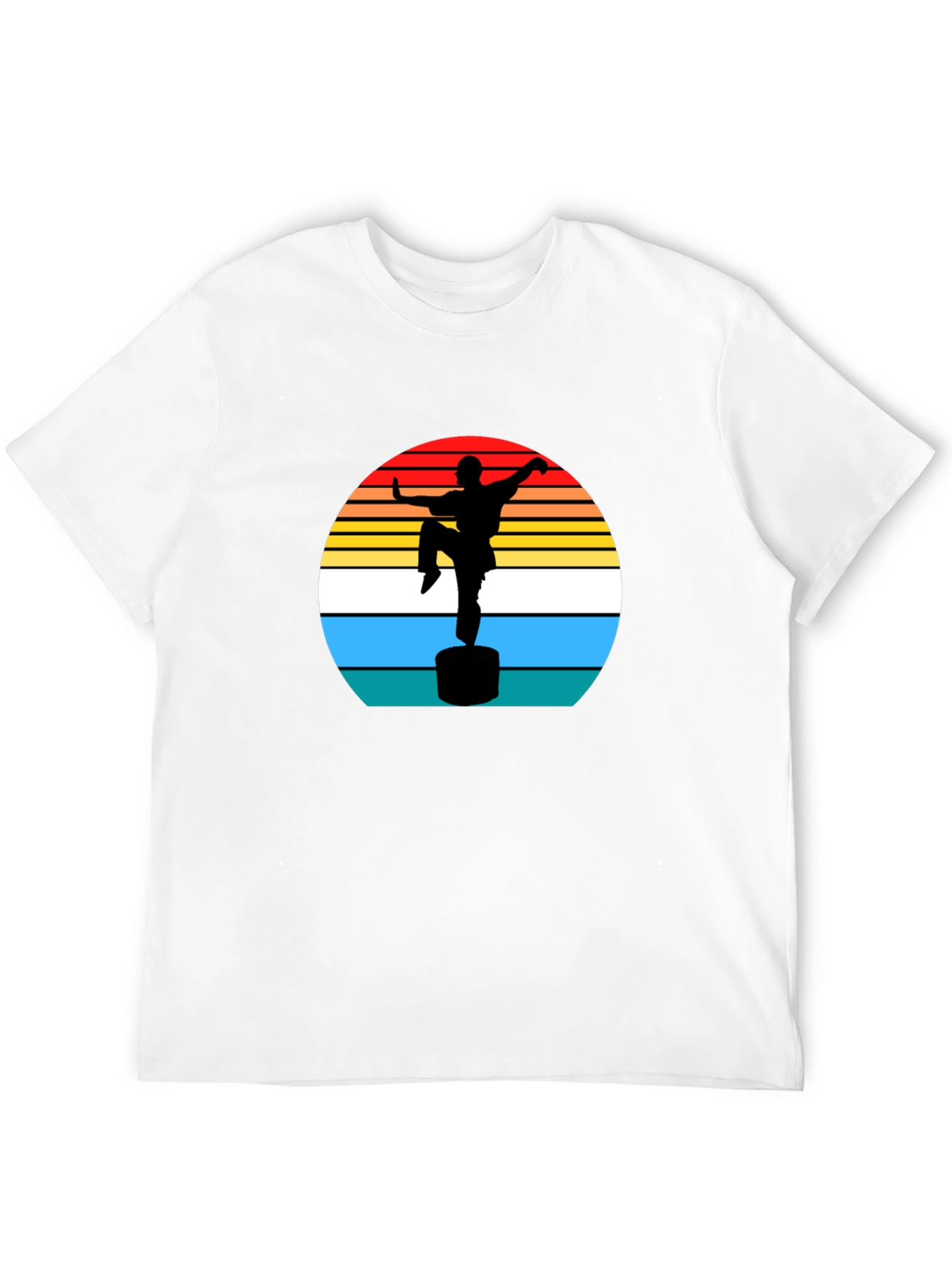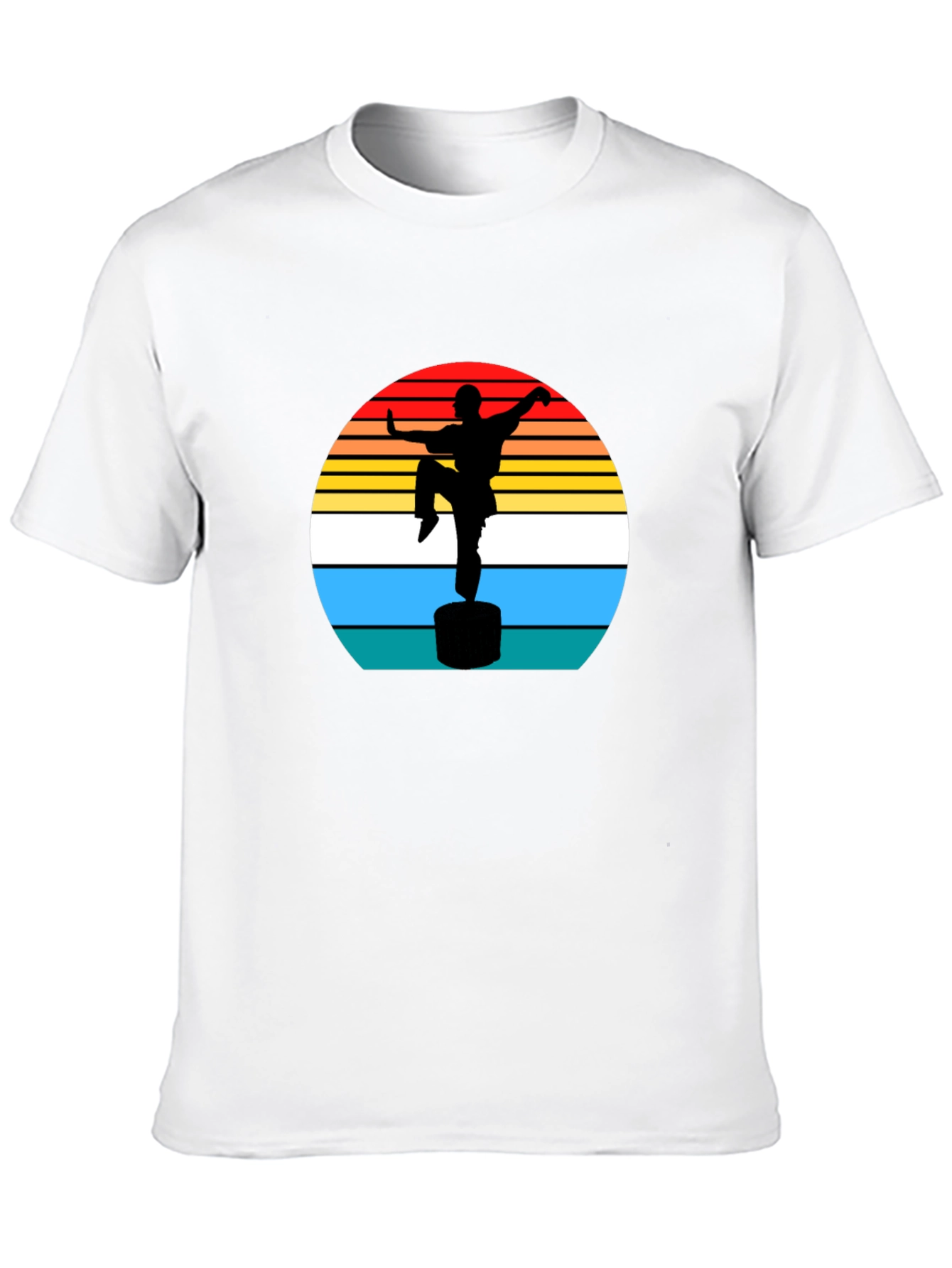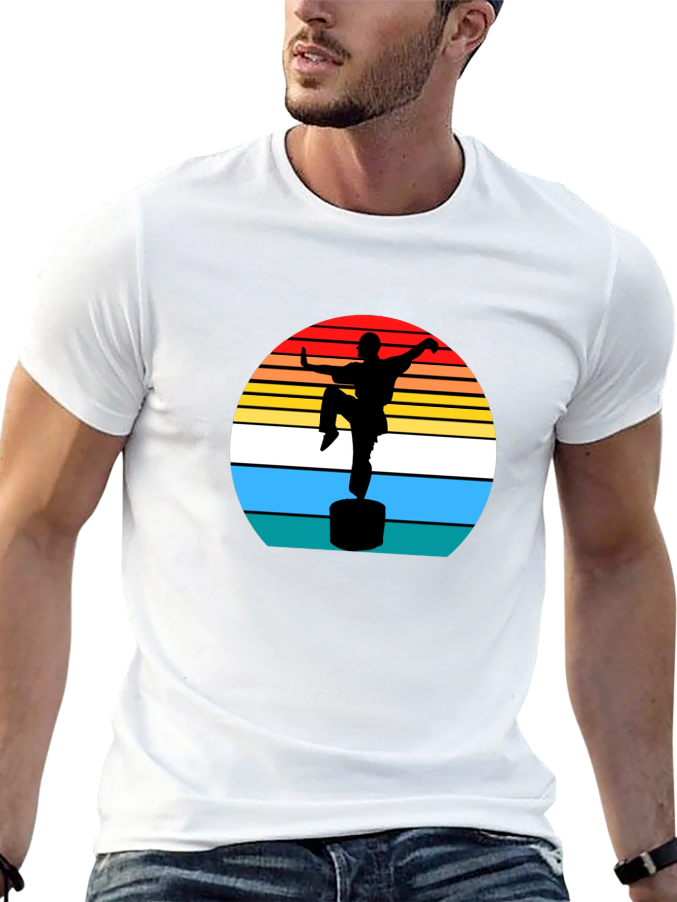 Eleva tu estilo con esta llamativa camiseta negra para hombre. El diseño presenta una silueta de un artista de kung fu sobre un fondo circular retro con franjas de colores rojo, amarillo, blanco, azul claro y verde azulado, evocando un estilo vintage. Perfecta para destacar entre la multitud, esta camiseta es ideal para los amantes de las artes marciales y la moda retro. El tejido parece ser de algodón suave y cómodo, ideal para uso diario. Combínala con tus jeans favoritos o pantalones deportivos para un look casual pero con actitud. ¡Muestra tu pasión por el kung fu con esta prenda única!