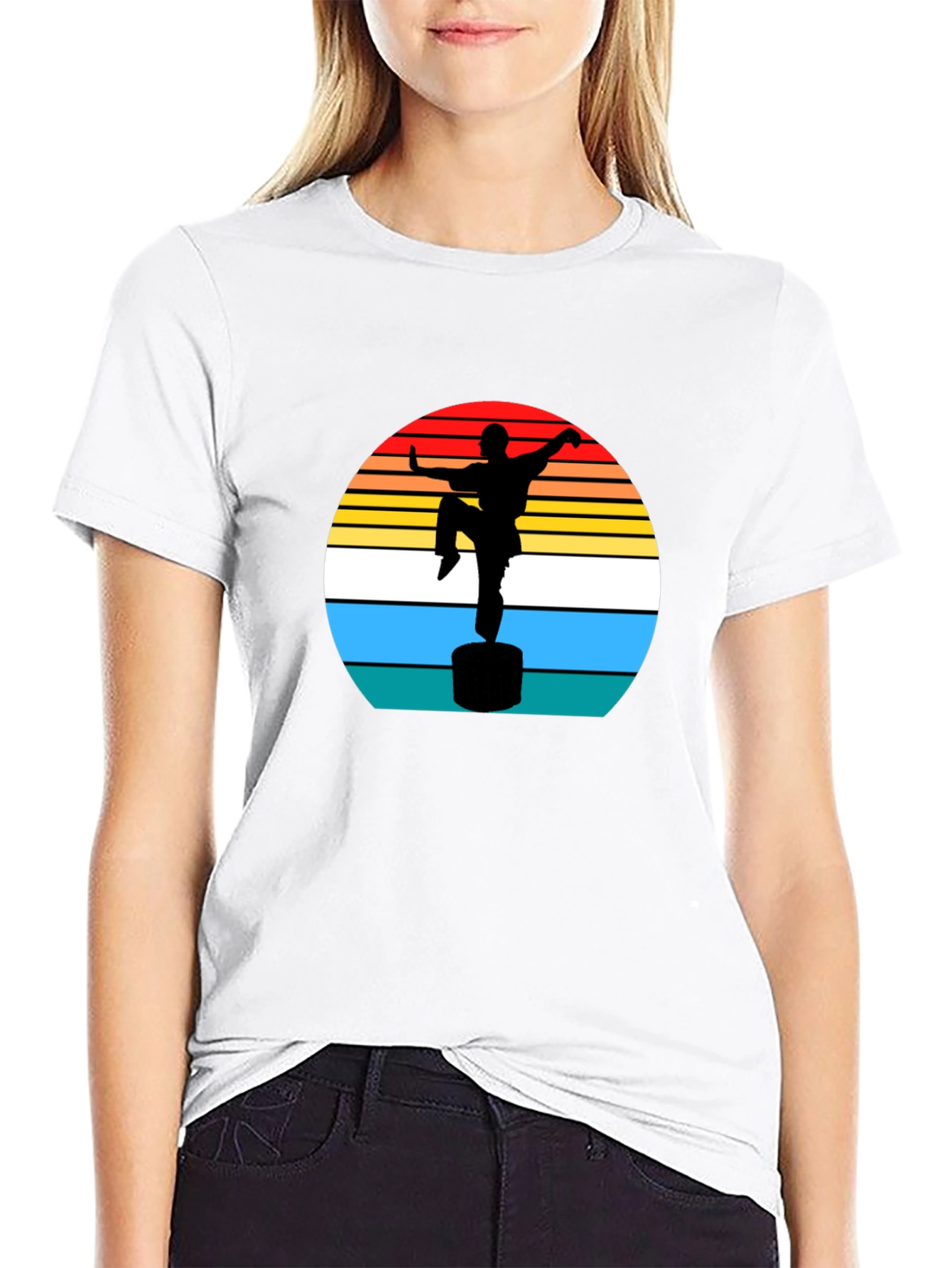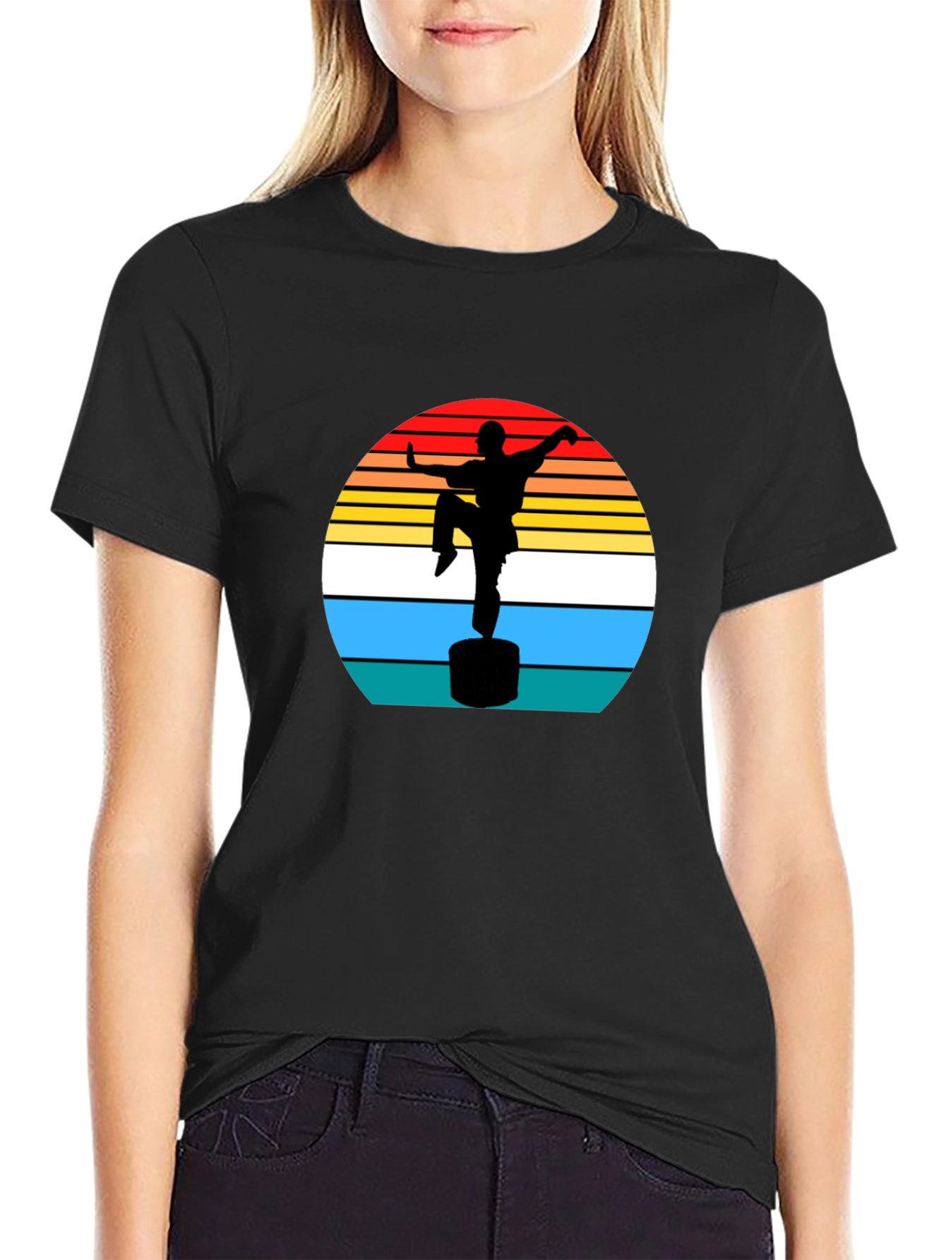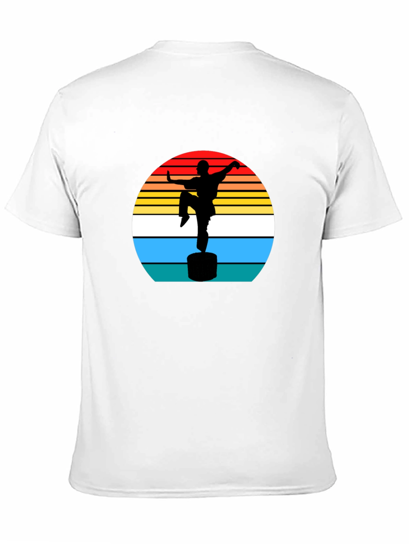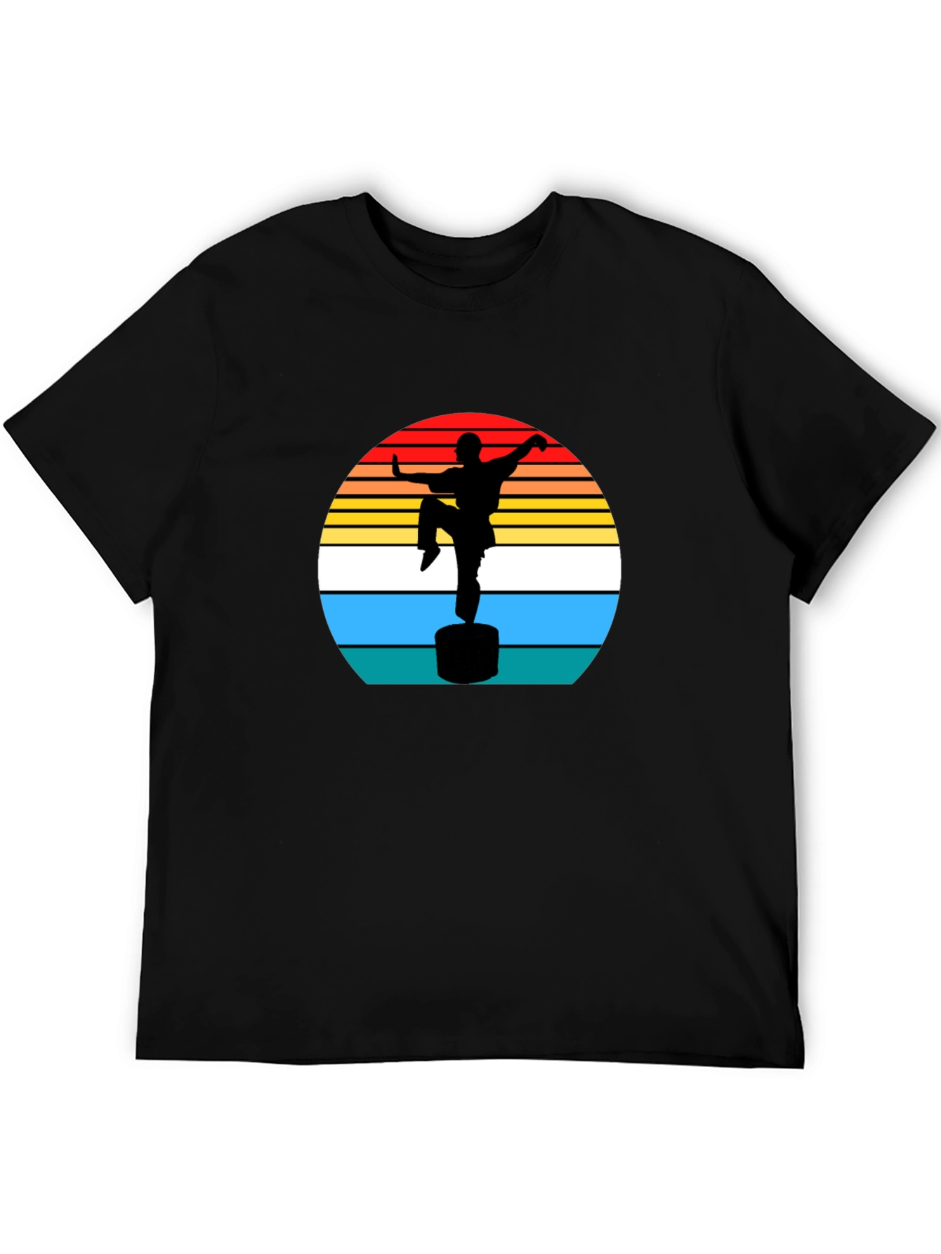 Eleva tu estilo con esta llamativa camiseta negra para hombre. El diseño presenta una silueta de un artista de kung fu sobre un fondo circular retro con franjas de colores rojo, amarillo, blanco, azul claro y verde azulado, evocando un estilo vintage. Perfecta para destacar entre la multitud, esta camiseta es ideal para los amantes de las artes marciales y la moda retro. El tejido parece ser de algodón suave y cómodo, ideal para uso diario. Combínala con tus jeans favoritos o pantalones deportivos para un look casual pero con actitud. ¡Muestra tu pasión por el kung fu con esta prenda única!
