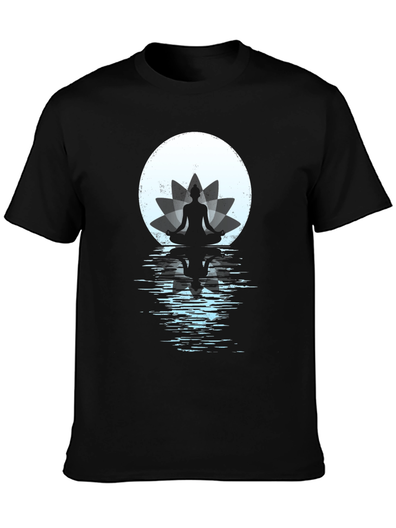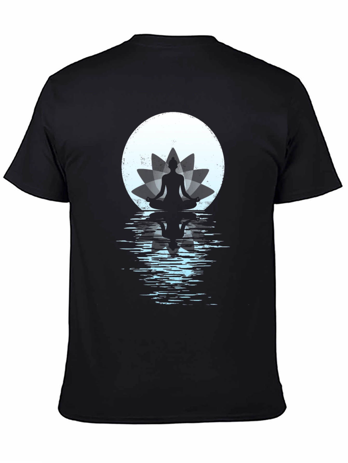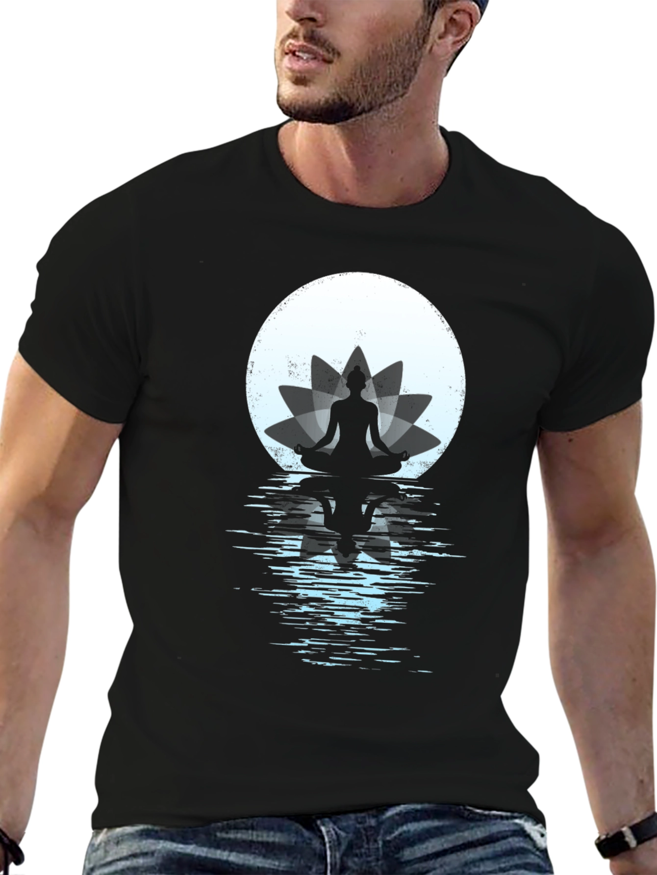 Esta camiseta negra para hombre presenta un diseño zen con una figura de yoga en silueta frente a una luna llena y un loto, reflejada en el agua. Ideal para amantes del yoga y la meditación, esta prenda ofrece un estilo relajado y espiritual. Fabricada con materiales suaves y cómodos, es perfecta para el uso diario, clases de yoga o simplemente para relajarse en casa. Su diseño único te permite expresar tu conexión con la naturaleza y la serenidad. Combínala con jeans o pantalones deportivos para un look casual y consciente.