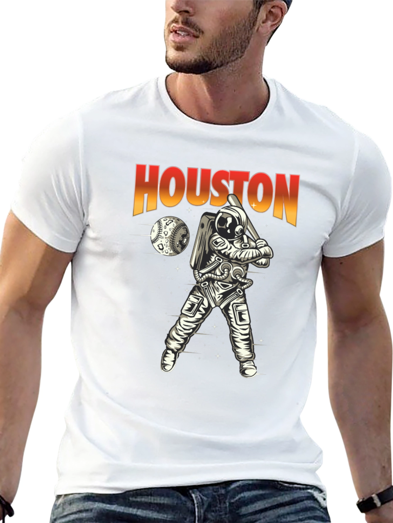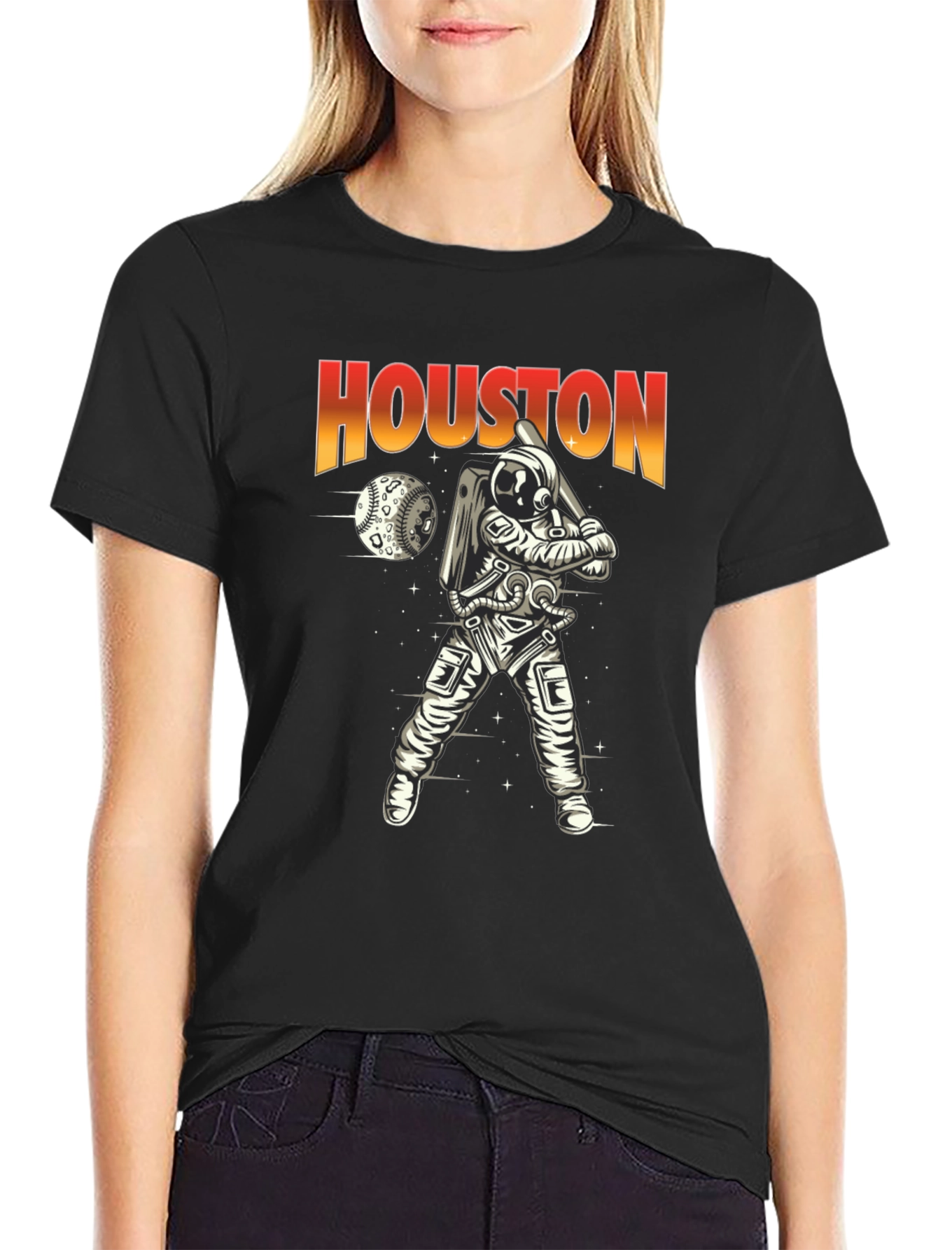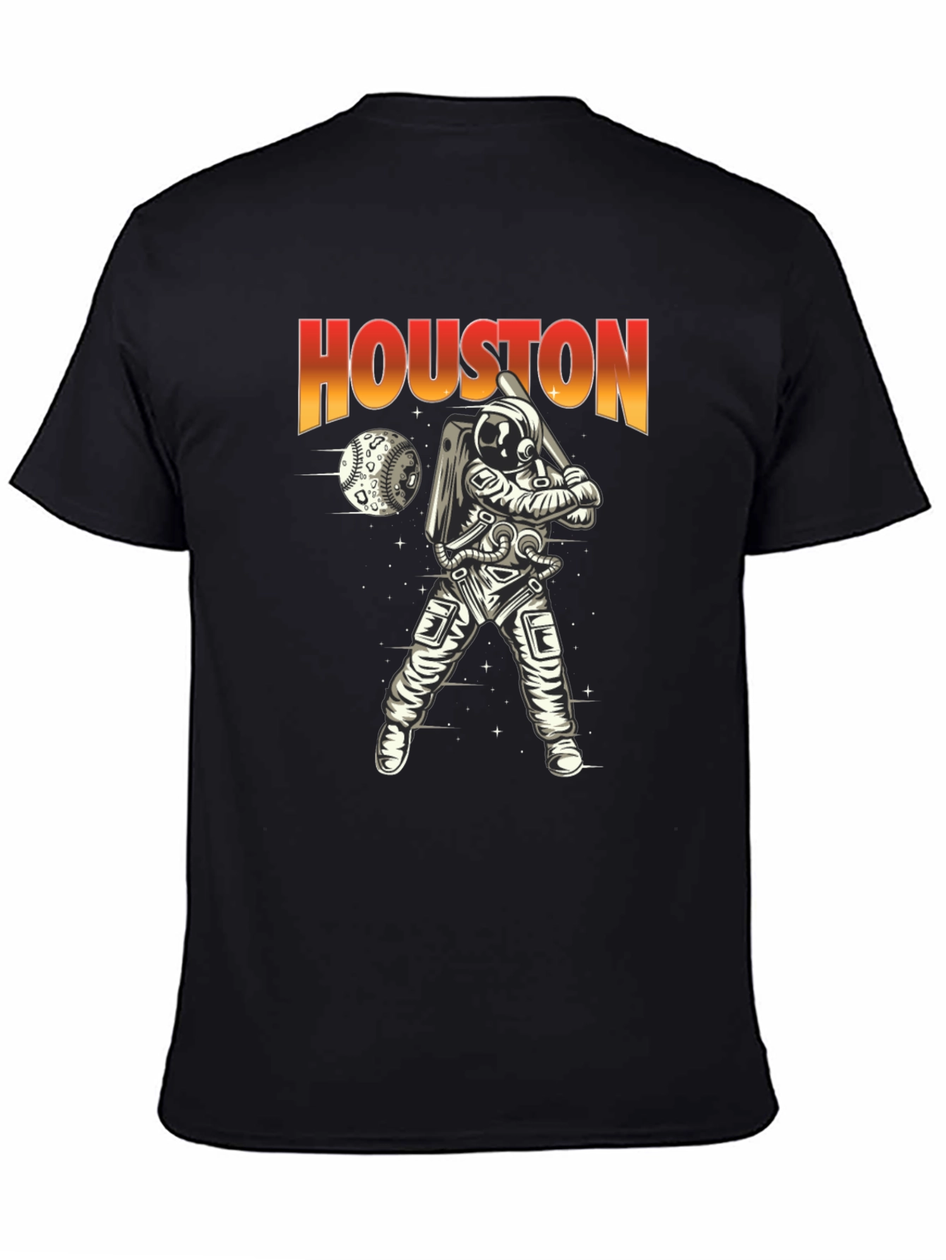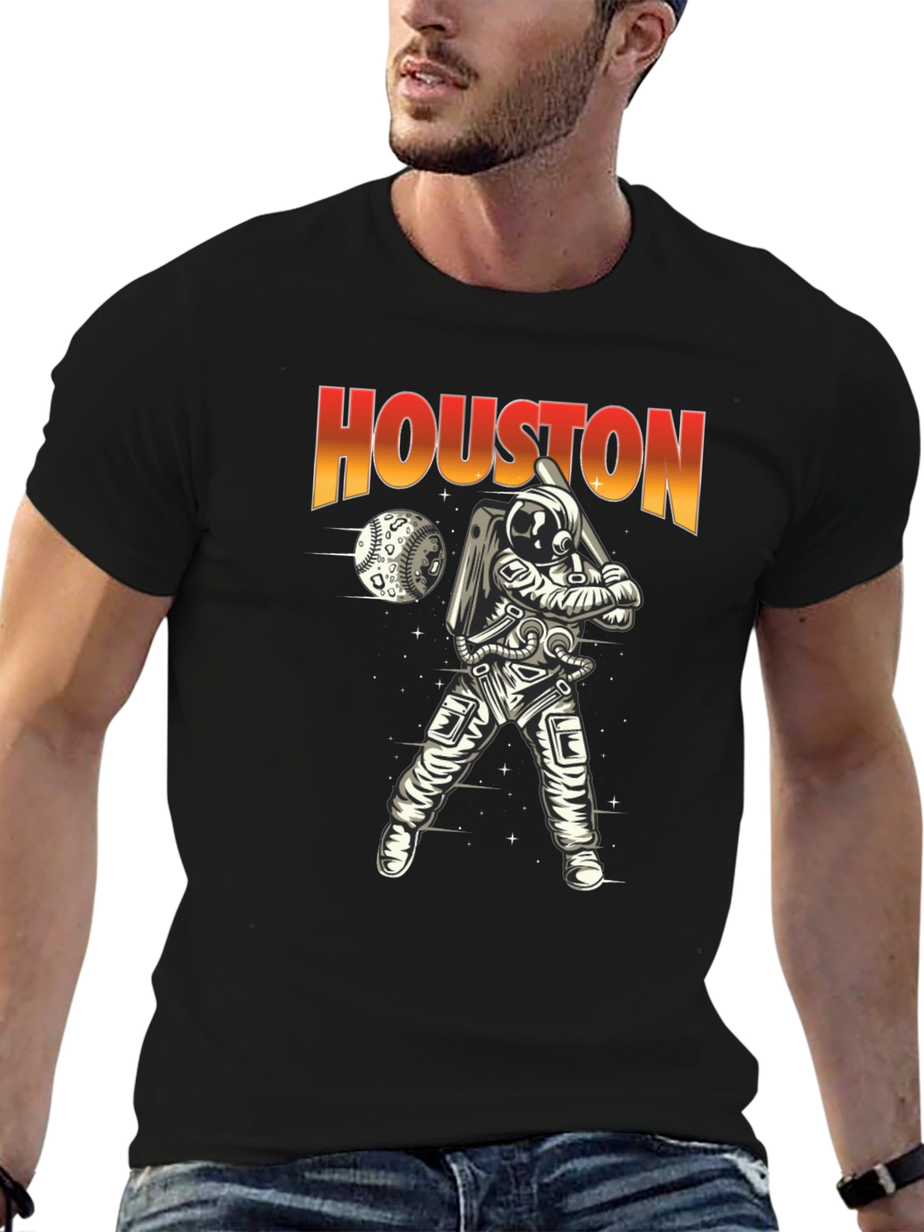 Luce esta original camiseta negra con un diseño audaz que combina el béisbol y el espacio. Presenta la palabra 'HOUSTON' en llamativas letras degradadas de naranja a amarillo, sobre un astronauta en traje espacial empuñando un bate, listo para golpear una pelota de béisbol con detalles lunares. Perfecta para los fanáticos del béisbol y la exploración espacial, esta camiseta es ideal para usar en partidos, eventos casuales o simplemente para expresar tu estilo único. Hecha con materiales cómodos y duraderos, esta camiseta es una excelente adición a cualquier guardarropa. ¡Muestra tu amor por Houston y el cosmos con esta prenda única!