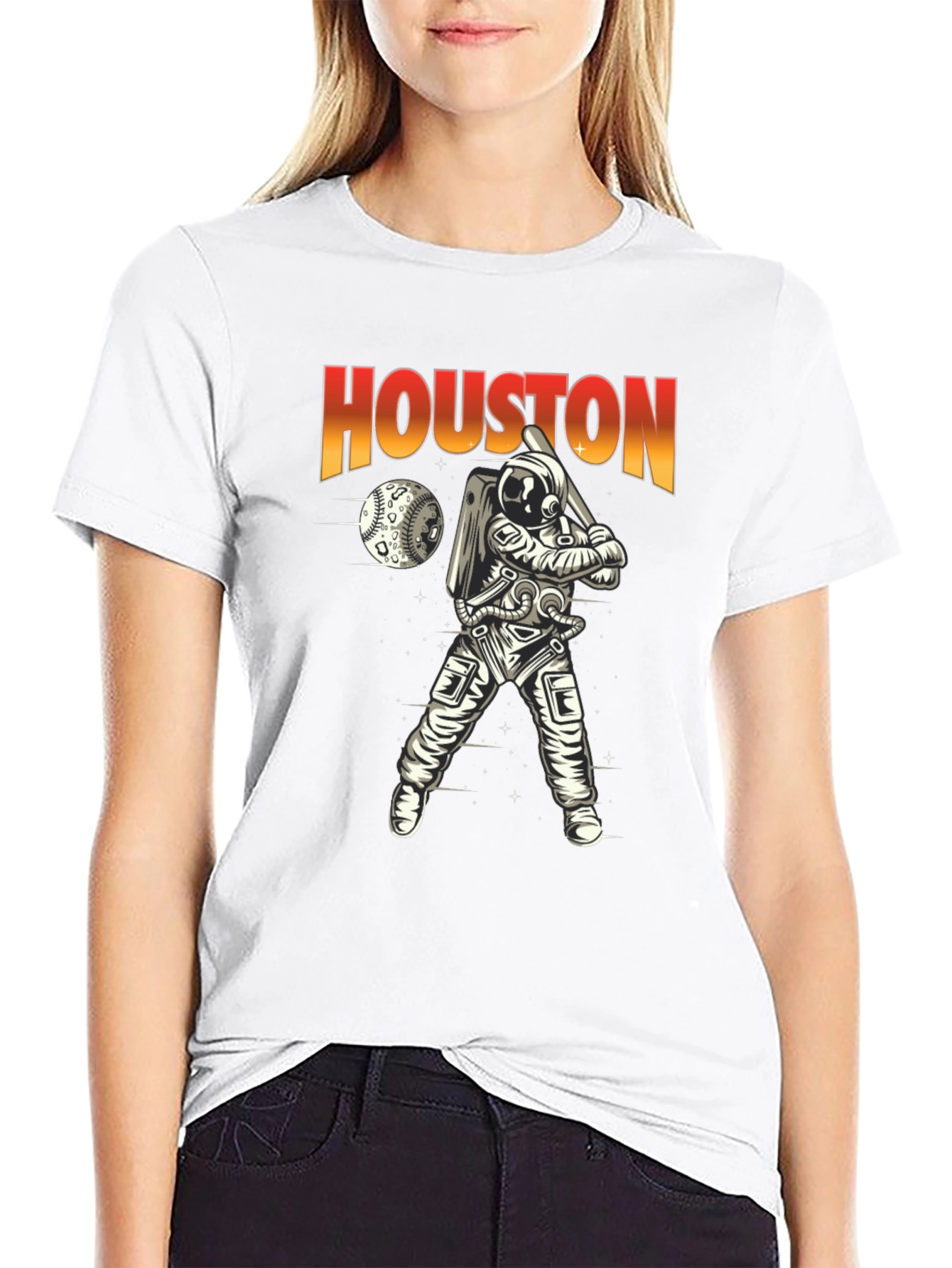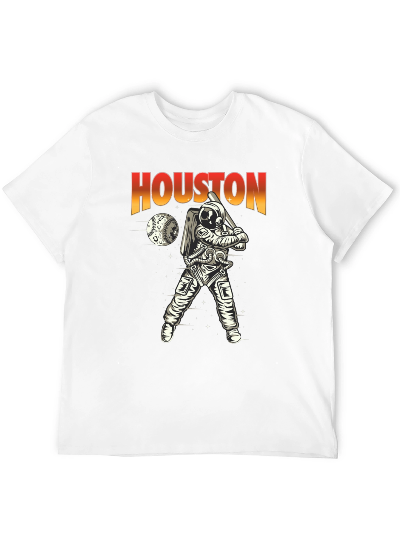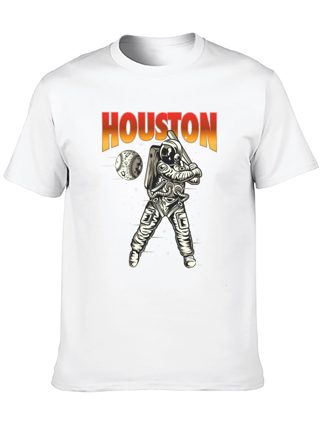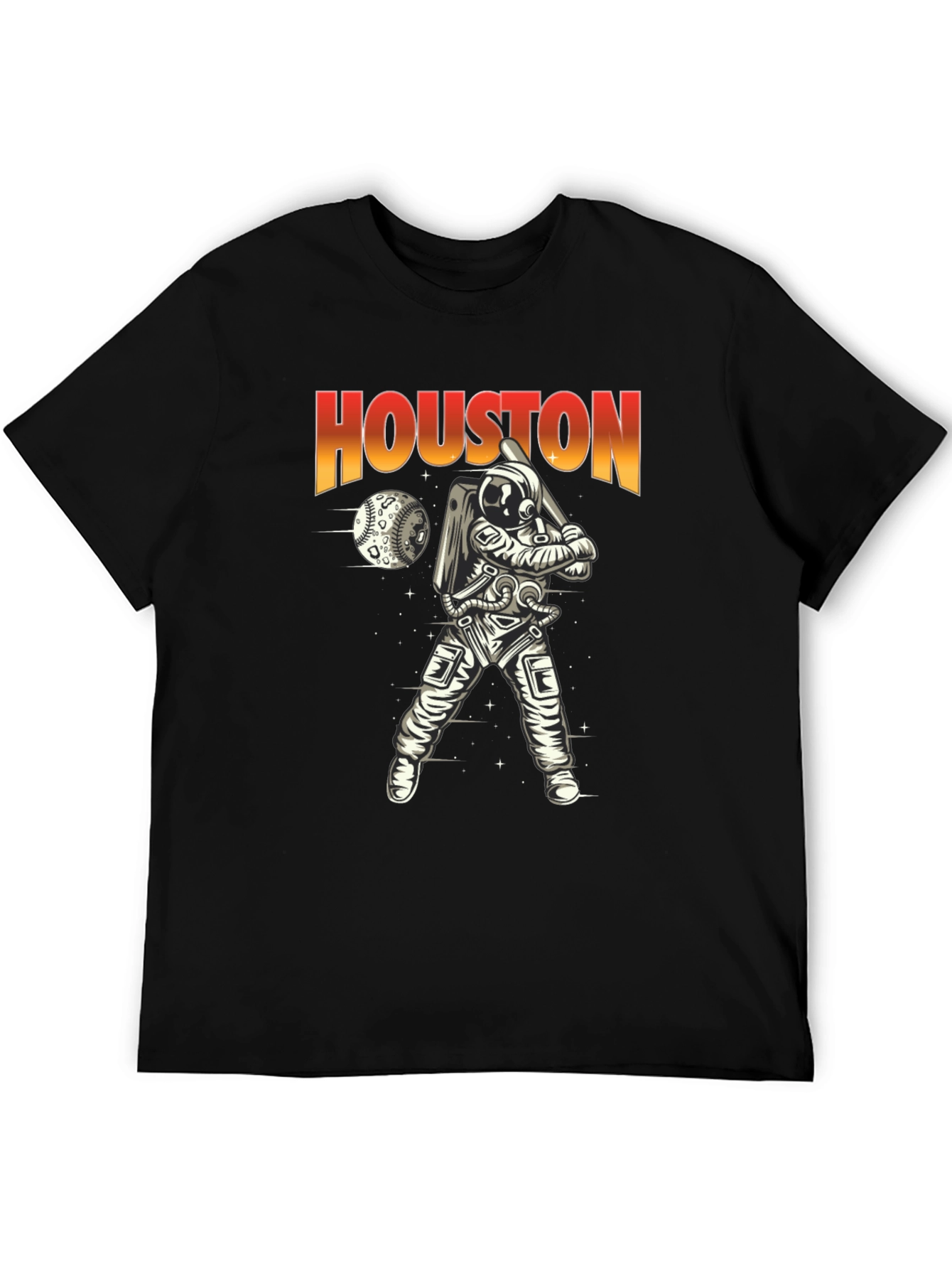 Luce esta original camiseta negra con un diseño audaz que combina el béisbol y el espacio. Presenta la palabra 'HOUSTON' en llamativas letras degradadas de naranja a amarillo, sobre un astronauta en traje espacial empuñando un bate, listo para golpear una pelota de béisbol con detalles lunares. Perfecta para los fanáticos del béisbol y la exploración espacial, esta camiseta es ideal para usar en partidos, eventos casuales o simplemente para expresar tu estilo único. Hecha con materiales cómodos y duraderos, esta camiseta es una excelente adición a cualquier guardarropa. ¡Muestra tu amor por Houston y el cosmos con esta prenda única!