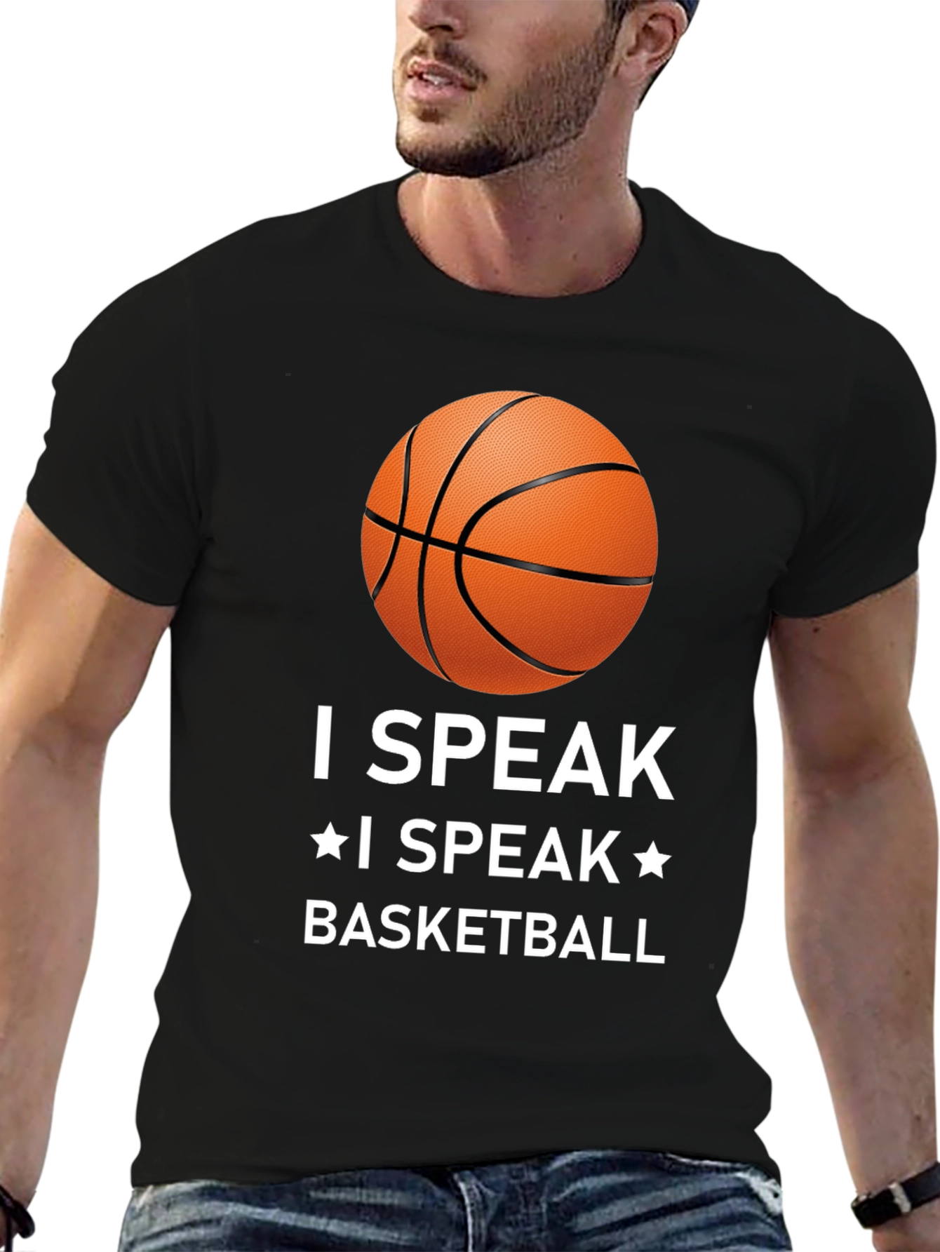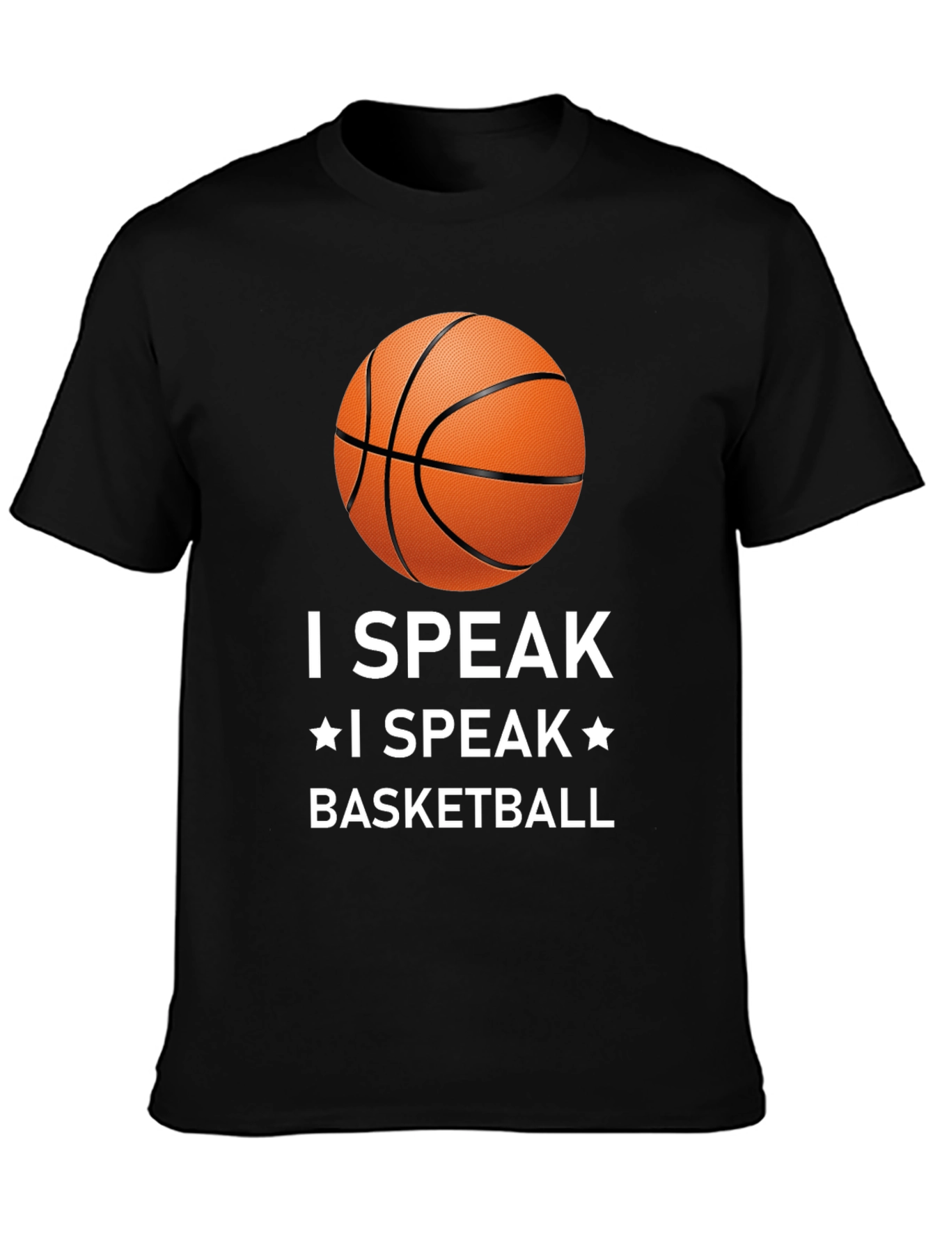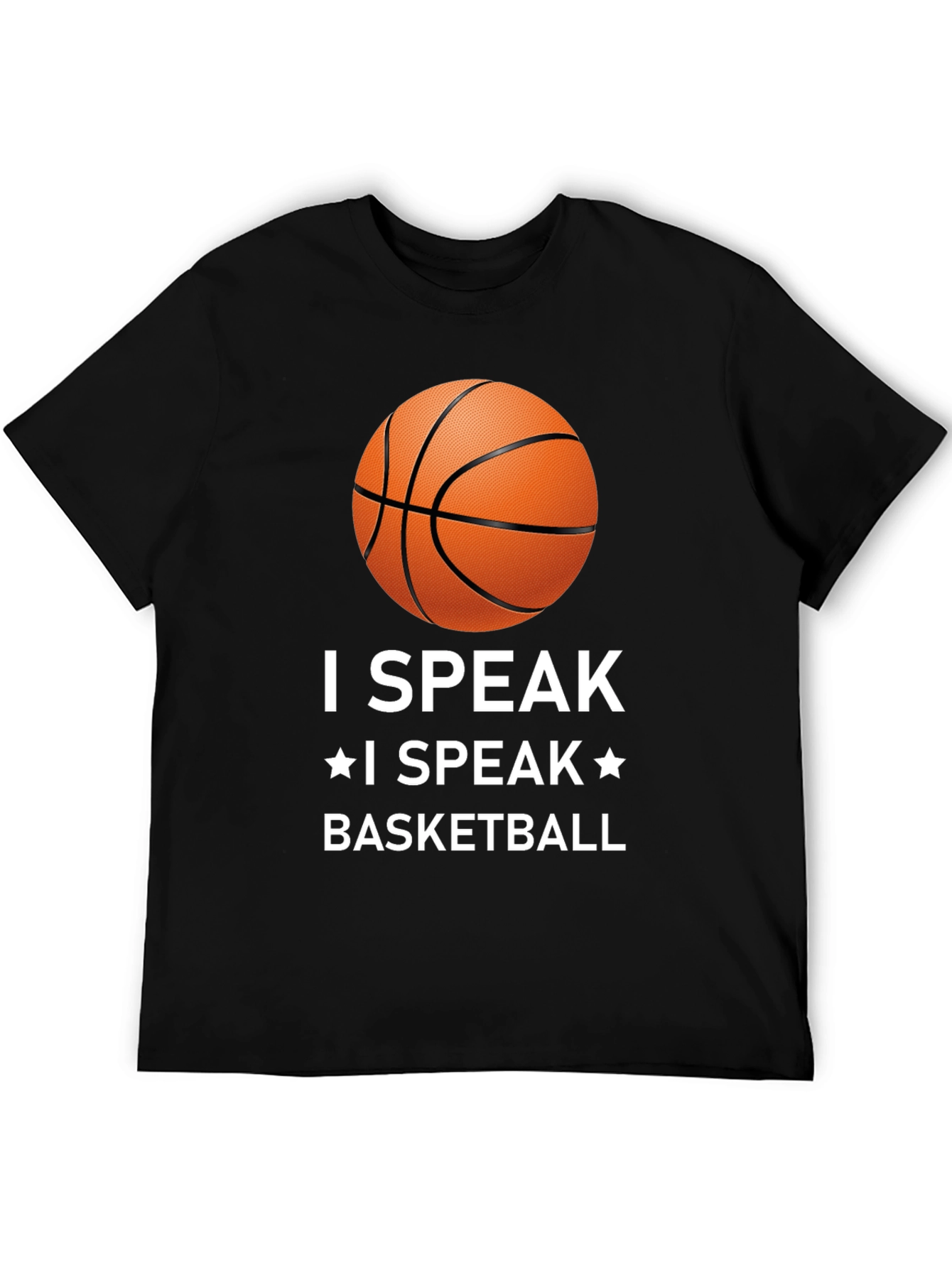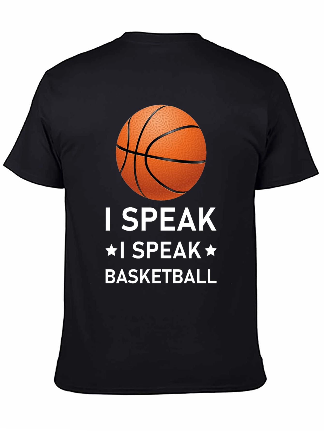 Muestra tu pasión por el baloncesto con esta camiseta negra de diseño llamativo. Con un estampado de un balón de baloncesto y la frase "I SPEAK * I SPEAK * BASKETBALL" en letras blancas, esta camiseta es perfecta para cualquier aficionado al baloncesto. Confeccionada con materiales cómodos y duraderos, es ideal para usar durante los partidos, entrenamientos o simplemente para lucir un estilo deportivo en tu día a día. Su corte clásico asegura un ajuste cómodo y favorecedor. Combínala con tus pantalones deportivos favoritos para un look completo de baloncesto.