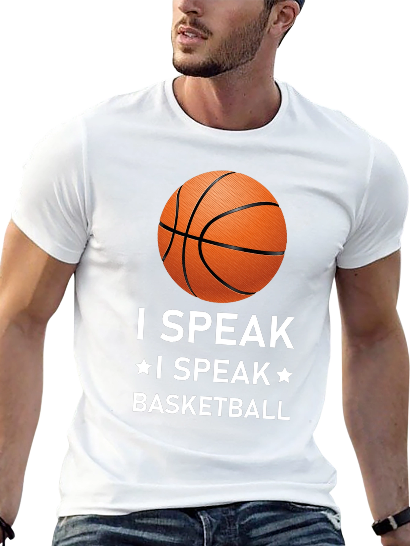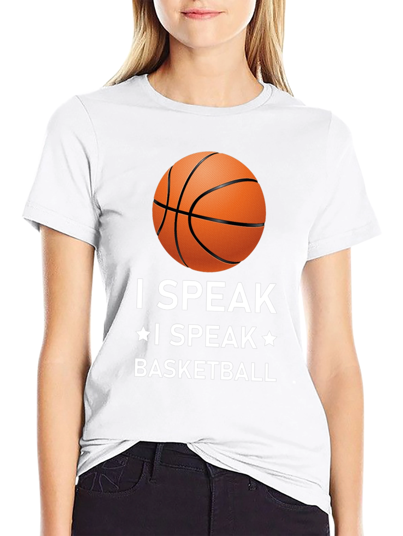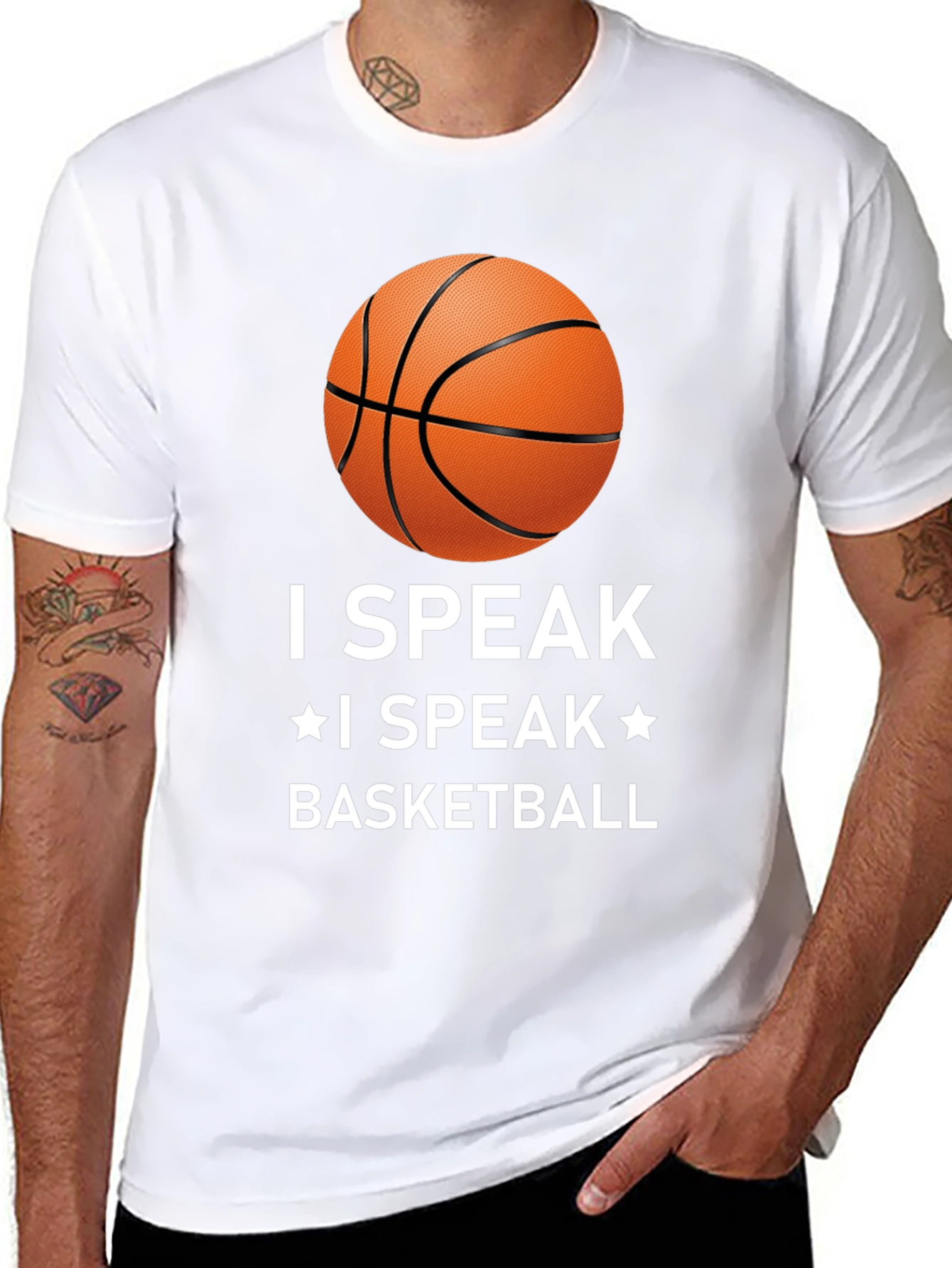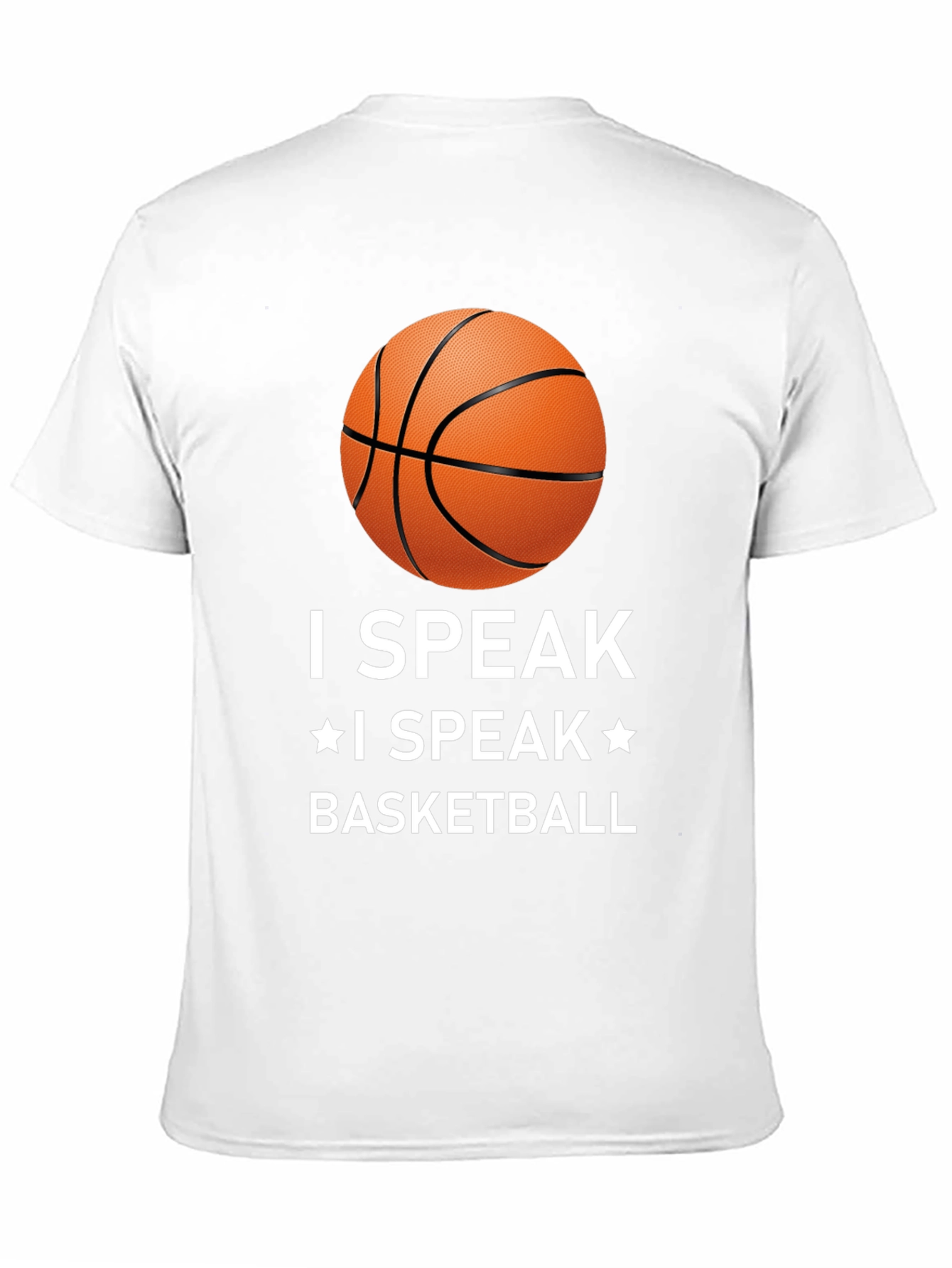 Muestra tu pasión por el baloncesto con esta camiseta negra de diseño llamativo. Con un estampado de un balón de baloncesto y la frase "I SPEAK * I SPEAK * BASKETBALL" en letras blancas, esta camiseta es perfecta para cualquier aficionado al baloncesto. Confeccionada con materiales cómodos y duraderos, es ideal para usar durante los partidos, entrenamientos o simplemente para lucir un estilo deportivo en tu día a día. Su corte clásico asegura un ajuste cómodo y favorecedor. Combínala con tus pantalones deportivos favoritos para un look completo de baloncesto.