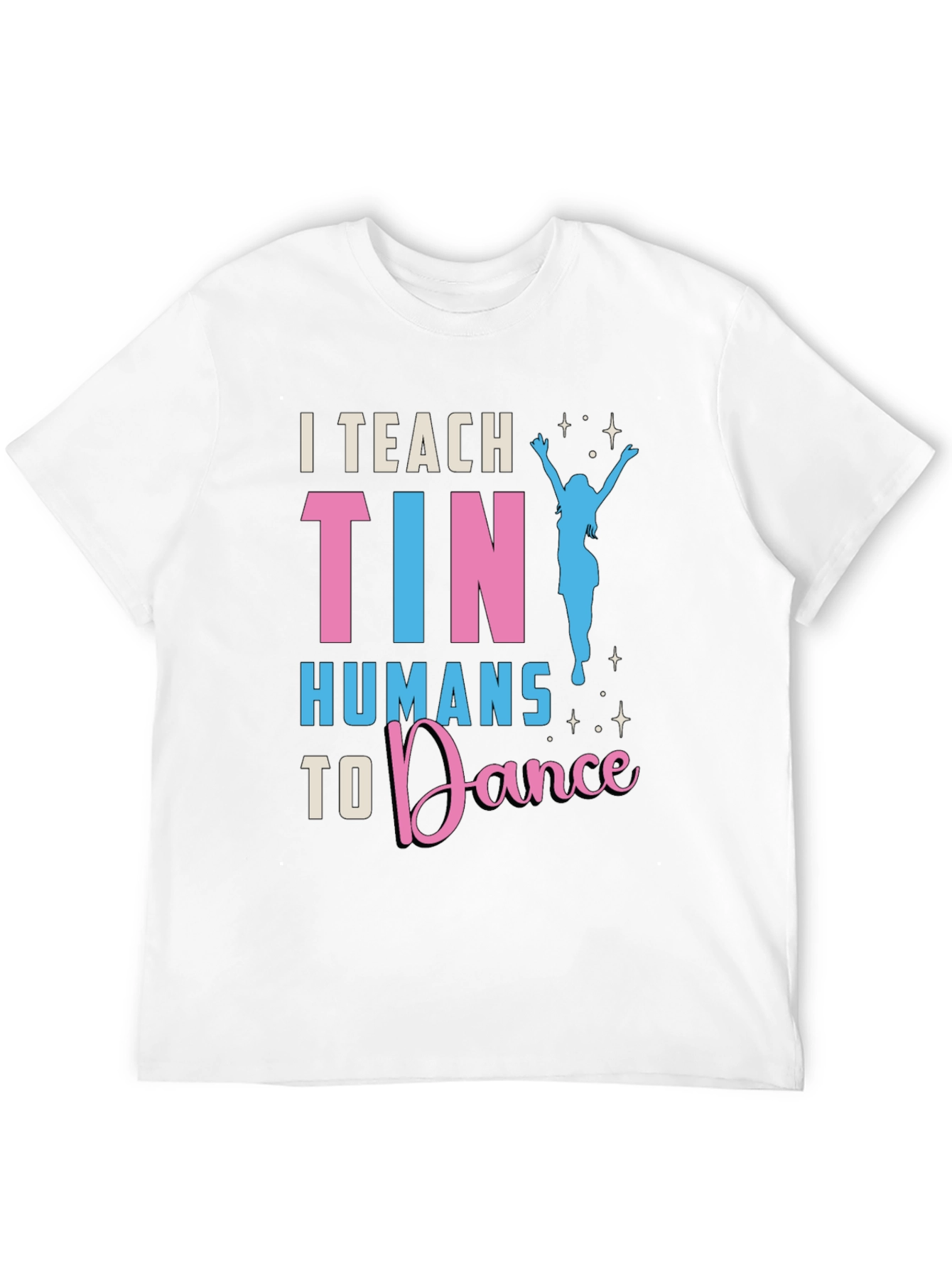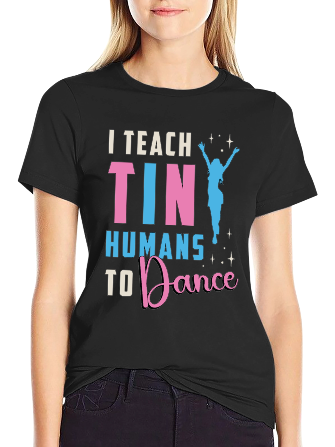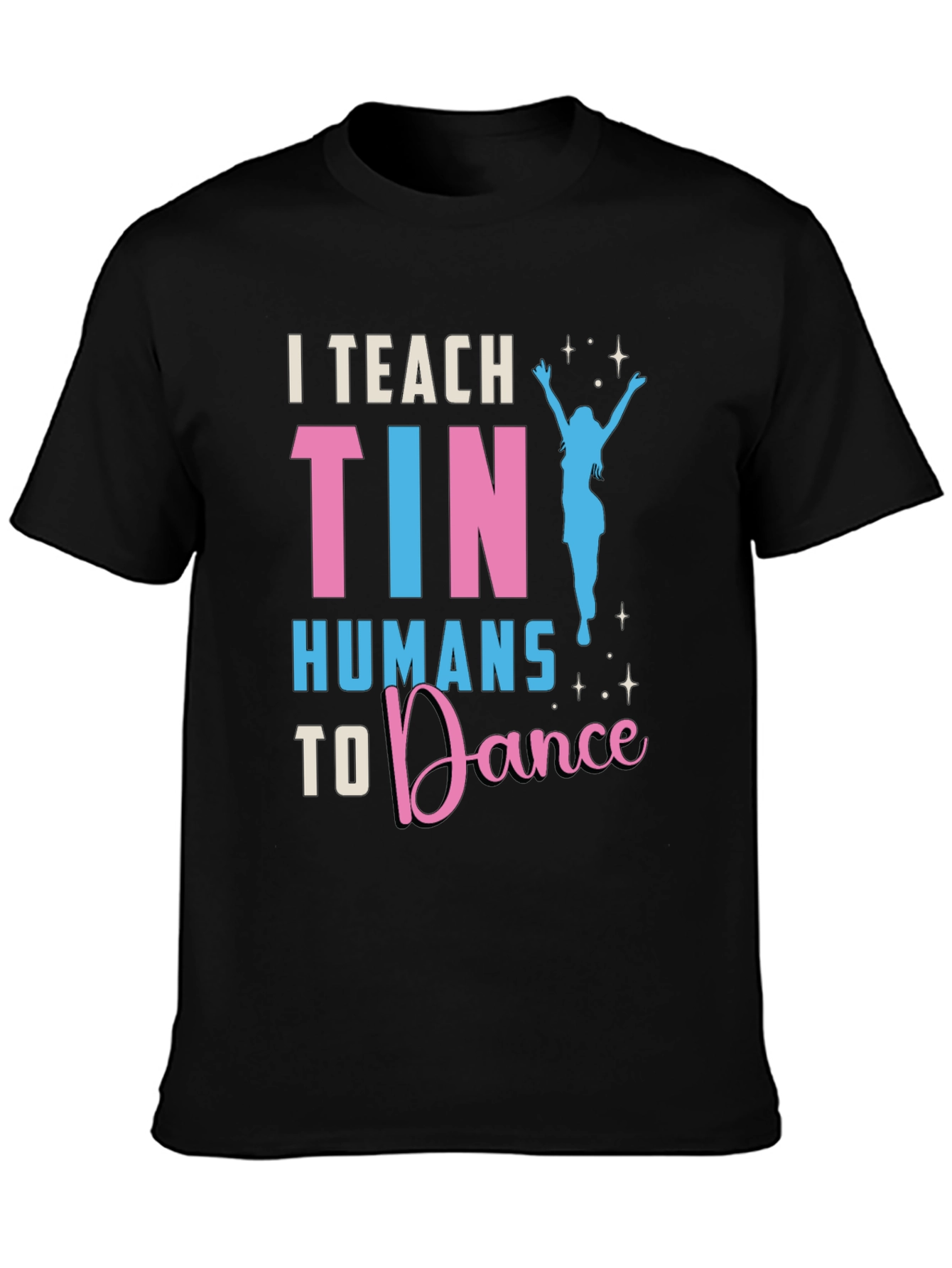 Luce esta divertida camiseta negra con el texto 'I Teach Tiny Humans to Dance' en llamativos colores rosa y celeste. El diseño incluye una silueta de bailarina, ideal para profesores de danza o cualquier persona que ame bailar. Fabricada con materiales cómodos y duraderos, esta camiseta es perfecta para usar en clases de baile, eventos informales o simplemente para expresar tu pasión por el baile en tu día a día. Destaca entre la multitud con este diseño único y muestra tu amor por la danza. ¡Una excelente opción para un regalo original!