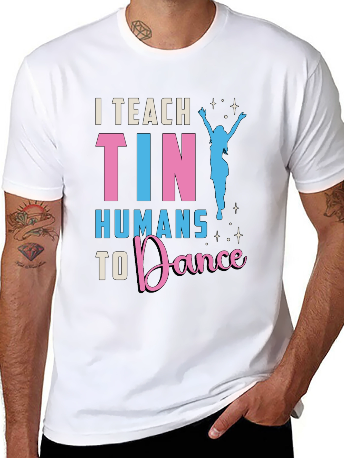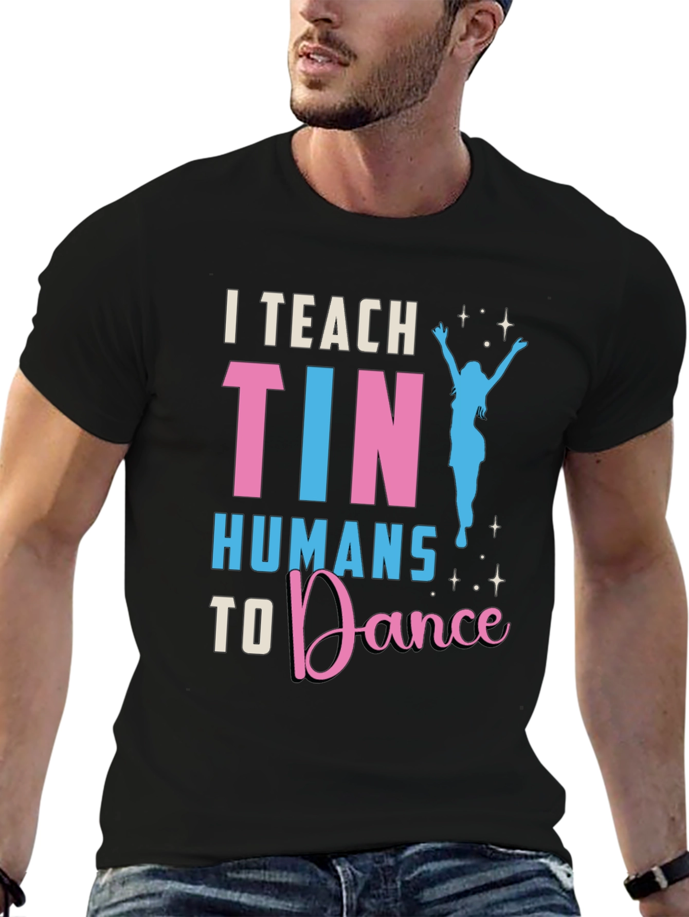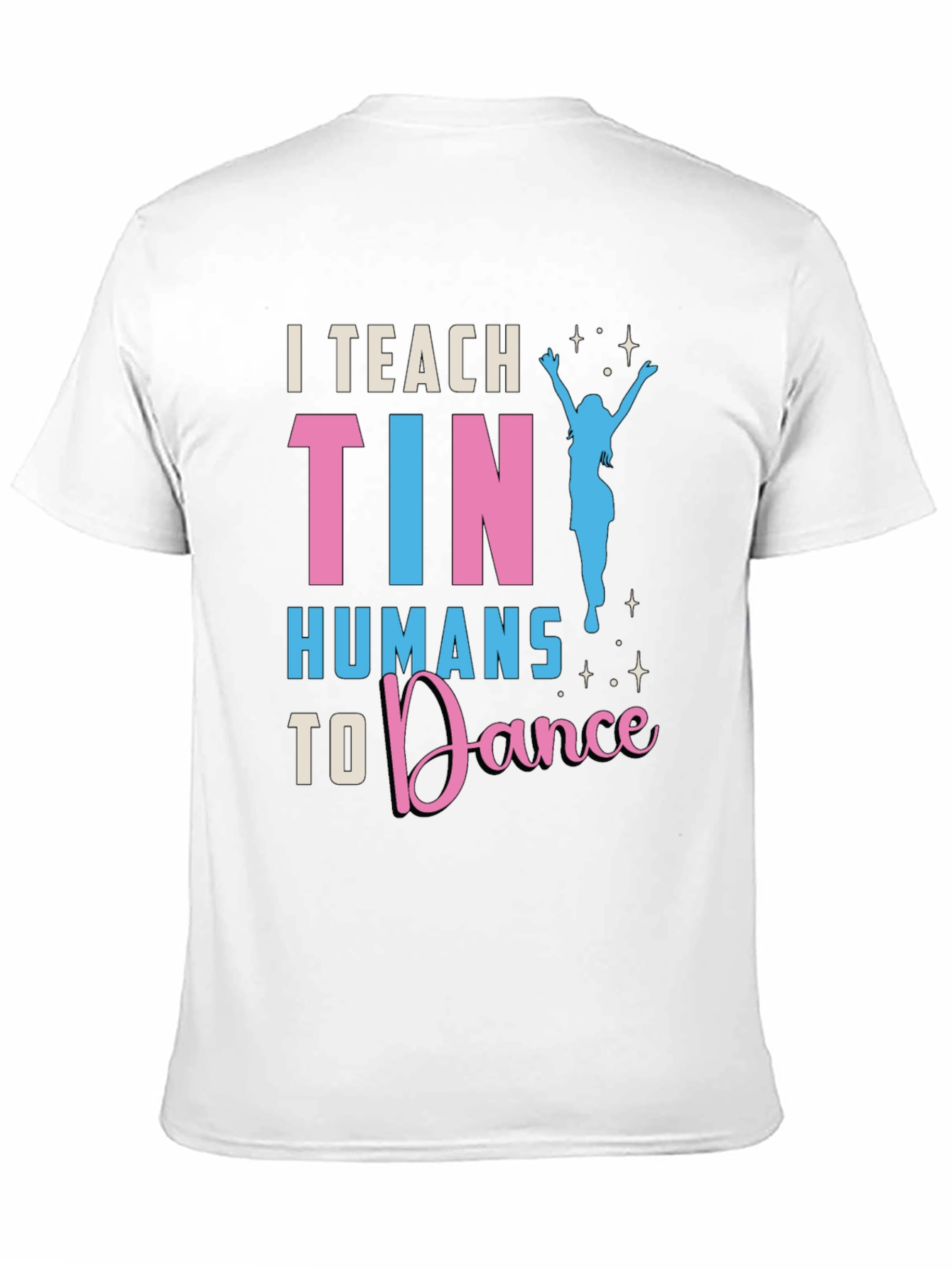 Luce esta divertida camiseta negra con el texto 'I Teach Tiny Humans to Dance' en llamativos colores rosa y celeste. El diseño incluye una silueta de bailarina, ideal para profesores de danza o cualquier persona que ame bailar. Fabricada con materiales cómodos y duraderos, esta camiseta es perfecta para usar en clases de baile, eventos informales o simplemente para expresar tu pasión por el baile en tu día a día. Destaca entre la multitud con este diseño único y muestra tu amor por la danza. ¡Una excelente opción para un regalo original!
