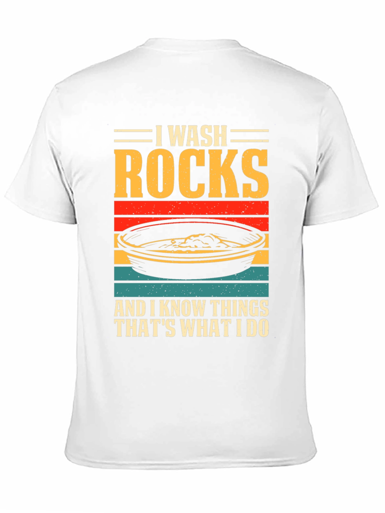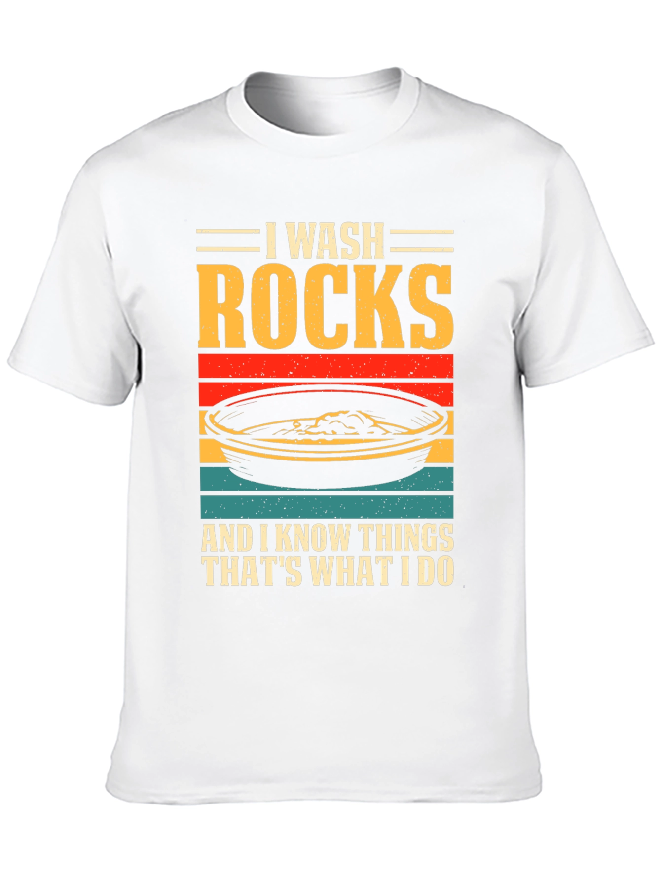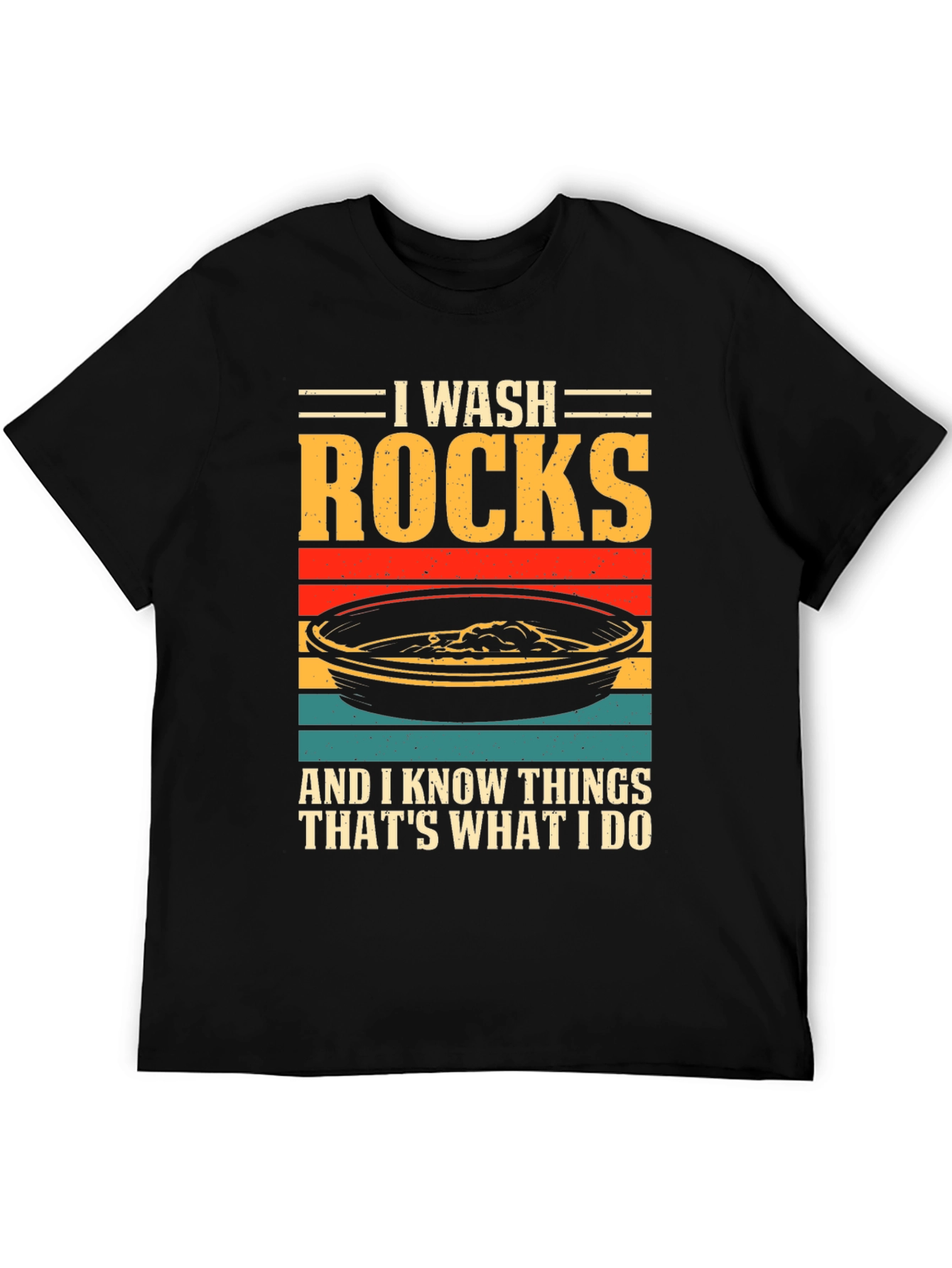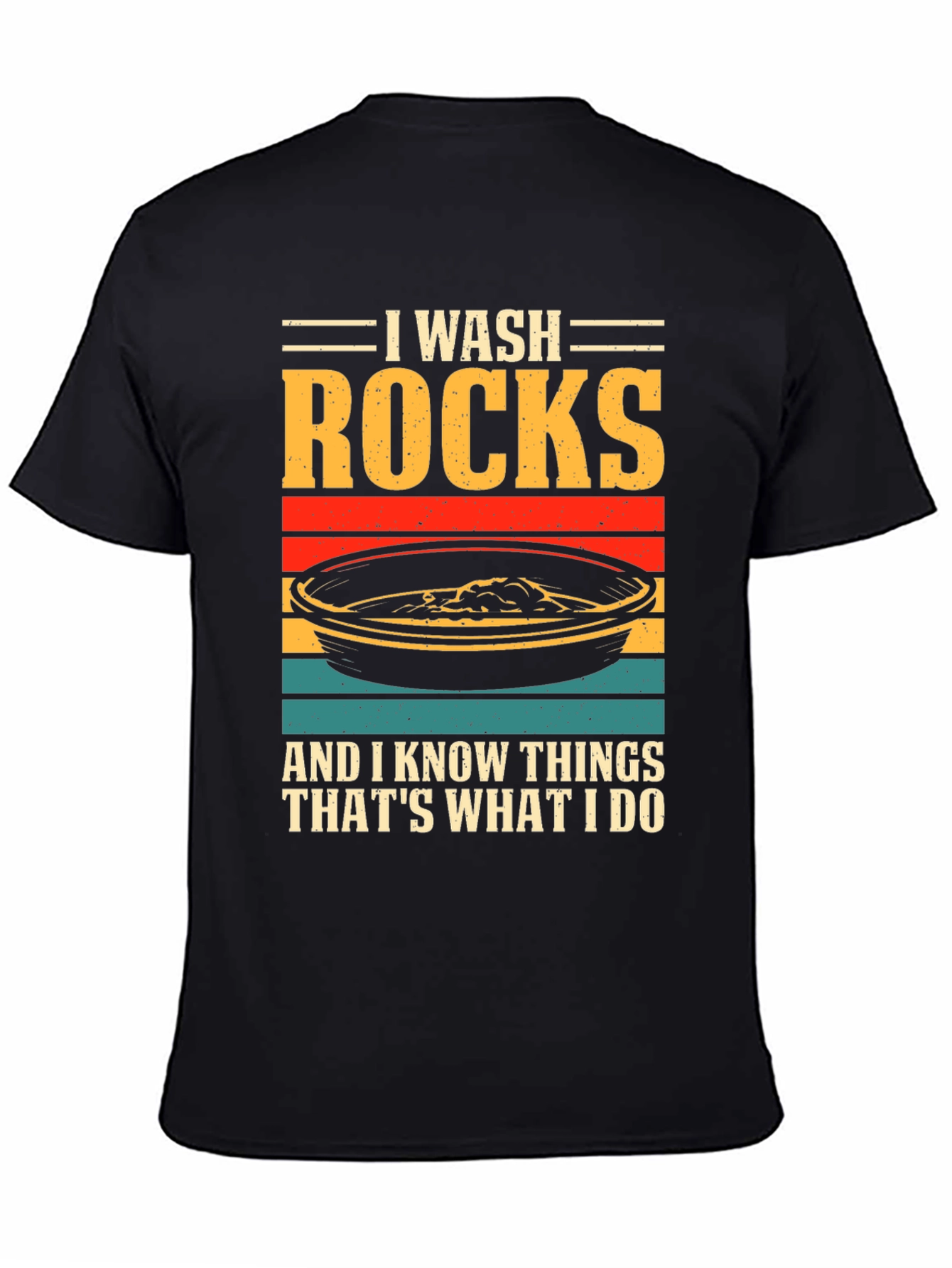 ¡Luce tu pasión por la geología con esta original camiseta! Presenta un diseño llamativo con el texto "I WASH ROCKS AND I KNOW THINGS THAT'S WHAT I DO" sobre una imagen estilizada de una batea de oro con franjas de colores retro. Confeccionada en tejido de algodón suave y cómodo, esta camiseta de manga corta y cuello redondo es perfecta para el día a día. Ideal para geólogos, buscadores de oro o cualquier persona que disfrute explorando la naturaleza. Destaca tu sentido del humor y tu amor por las rocas con esta prenda única. ¡Consigue la tuya y muestra al mundo tu afición!