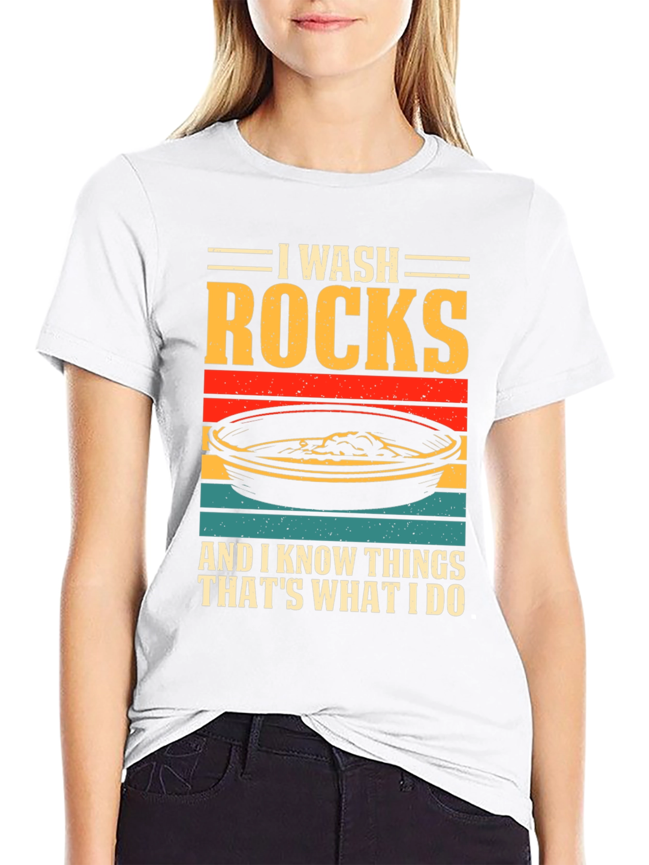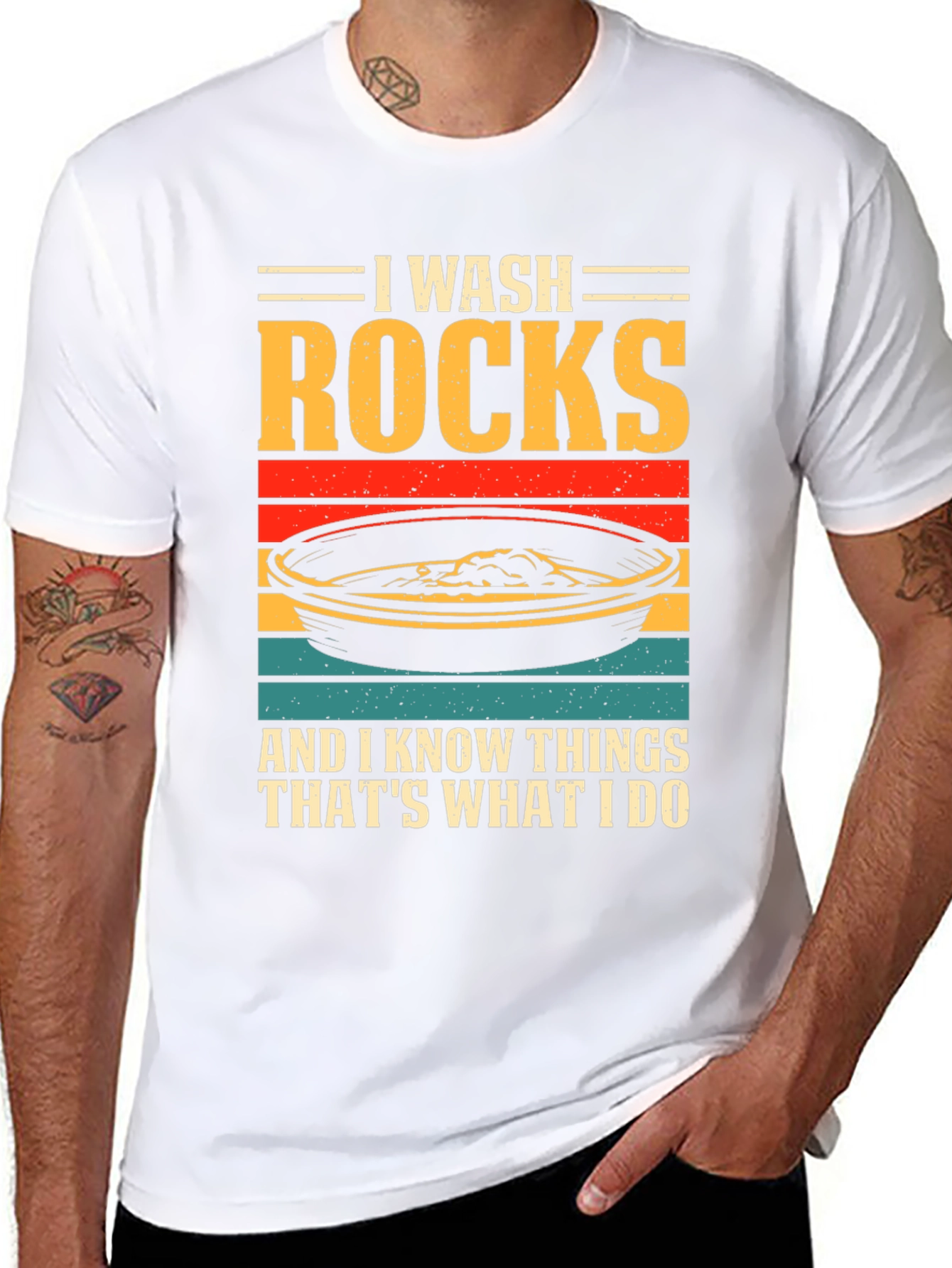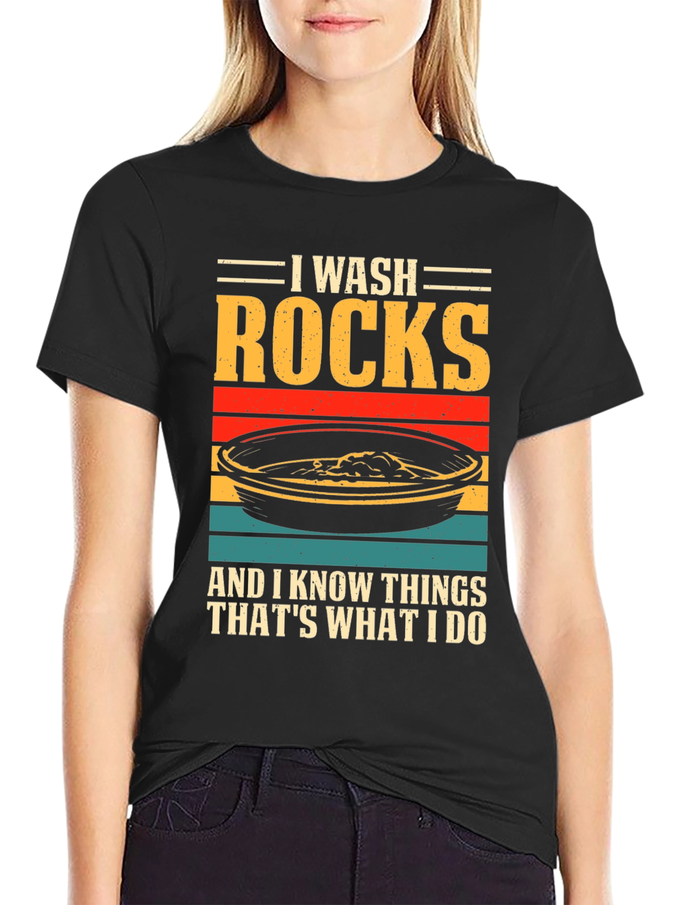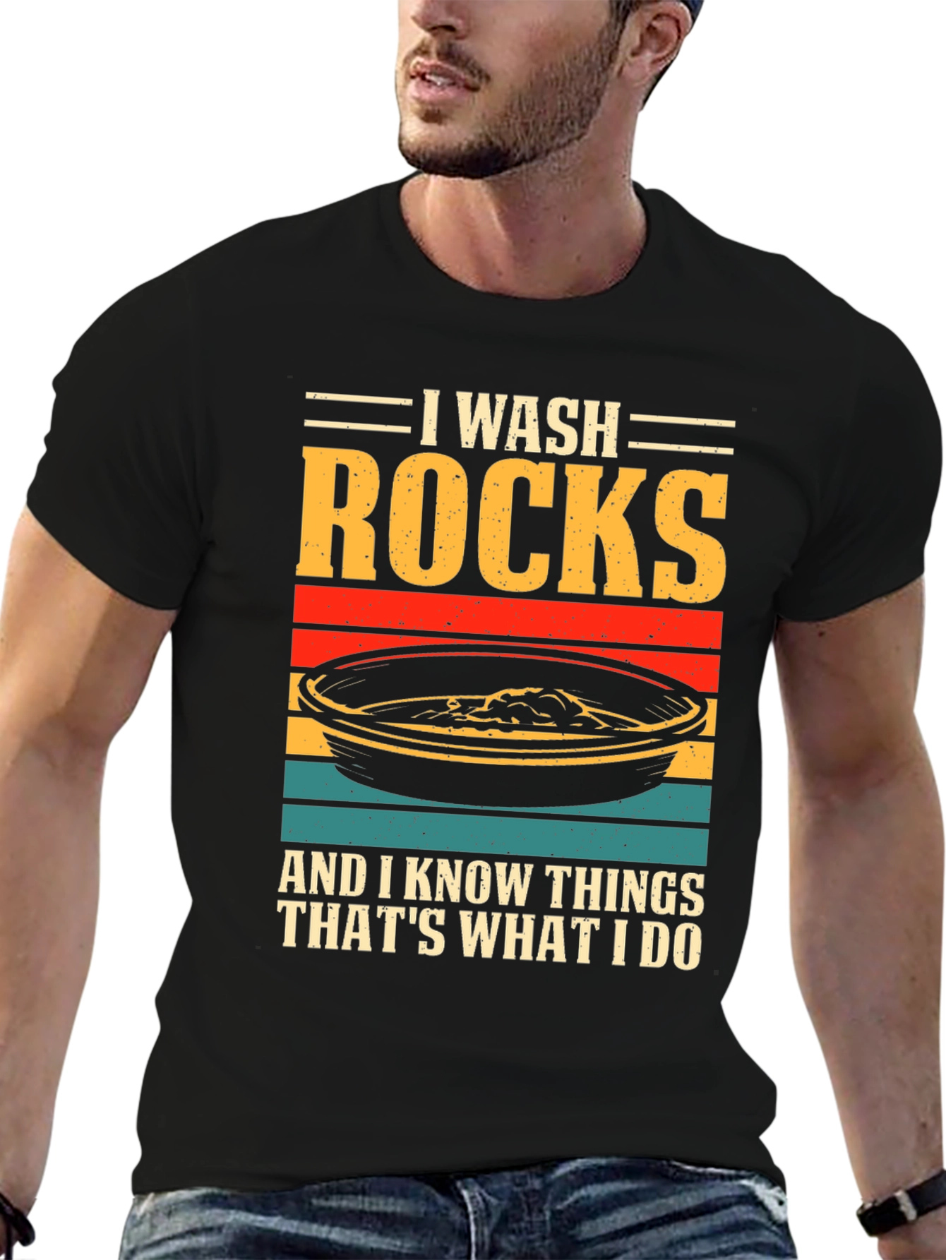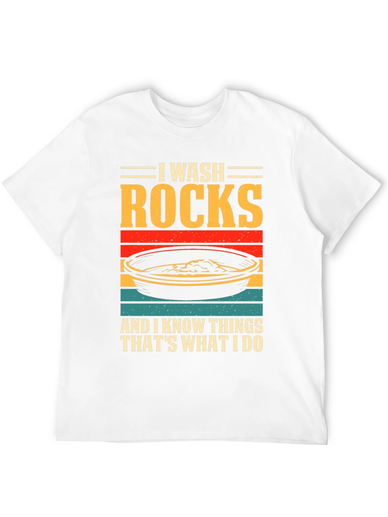 ¡Luce tu pasión por la geología con esta original camiseta! Presenta un diseño llamativo con el texto "I WASH ROCKS AND I KNOW THINGS THAT'S WHAT I DO" sobre una imagen estilizada de una batea de oro con franjas de colores retro. Confeccionada en tejido de algodón suave y cómodo, esta camiseta de manga corta y cuello redondo es perfecta para el día a día. Ideal para geólogos, buscadores de oro o cualquier persona que disfrute explorando la naturaleza. Destaca tu sentido del humor y tu amor por las rocas con esta prenda única. ¡Consigue la tuya y muestra al mundo tu afición!