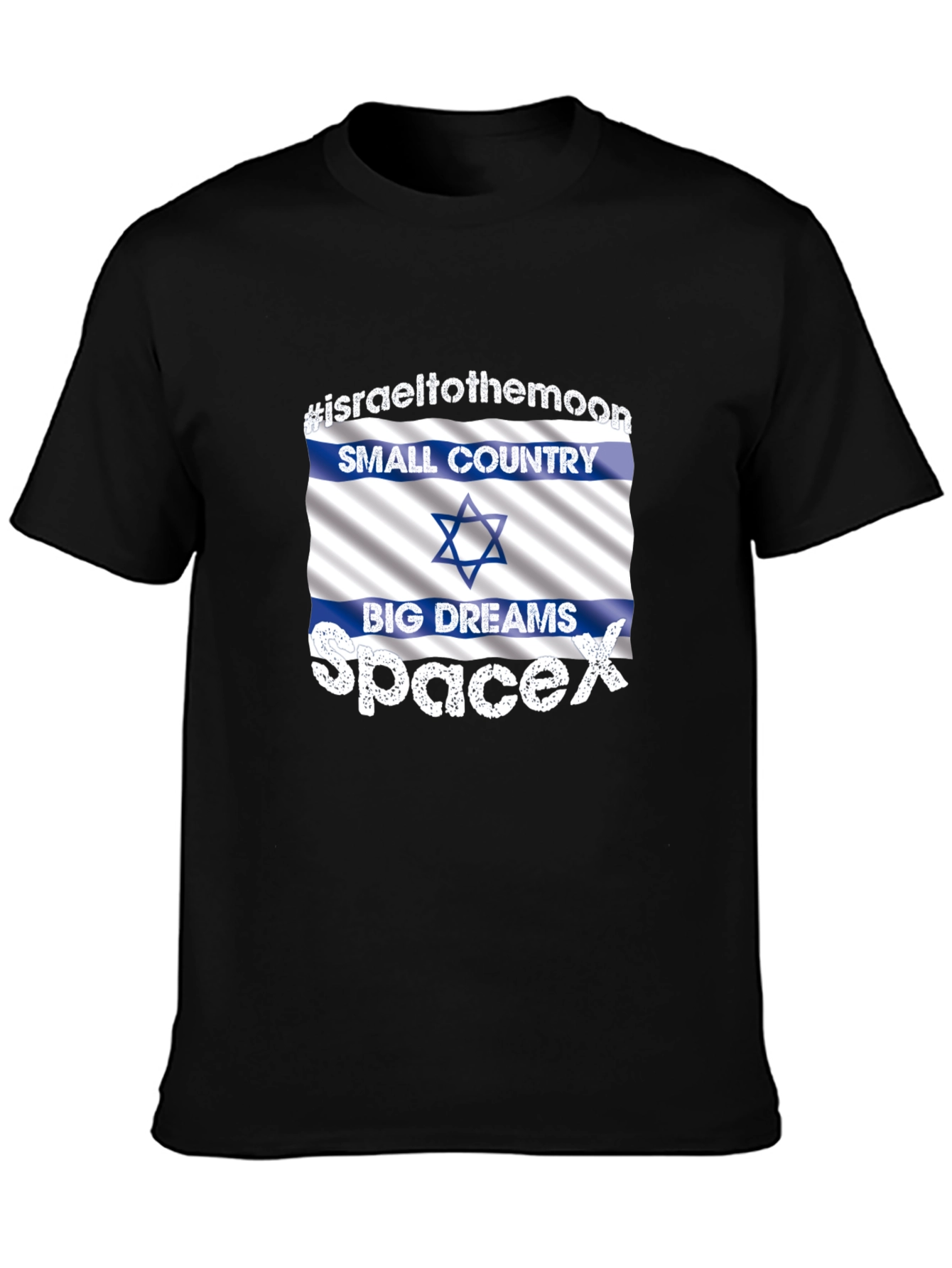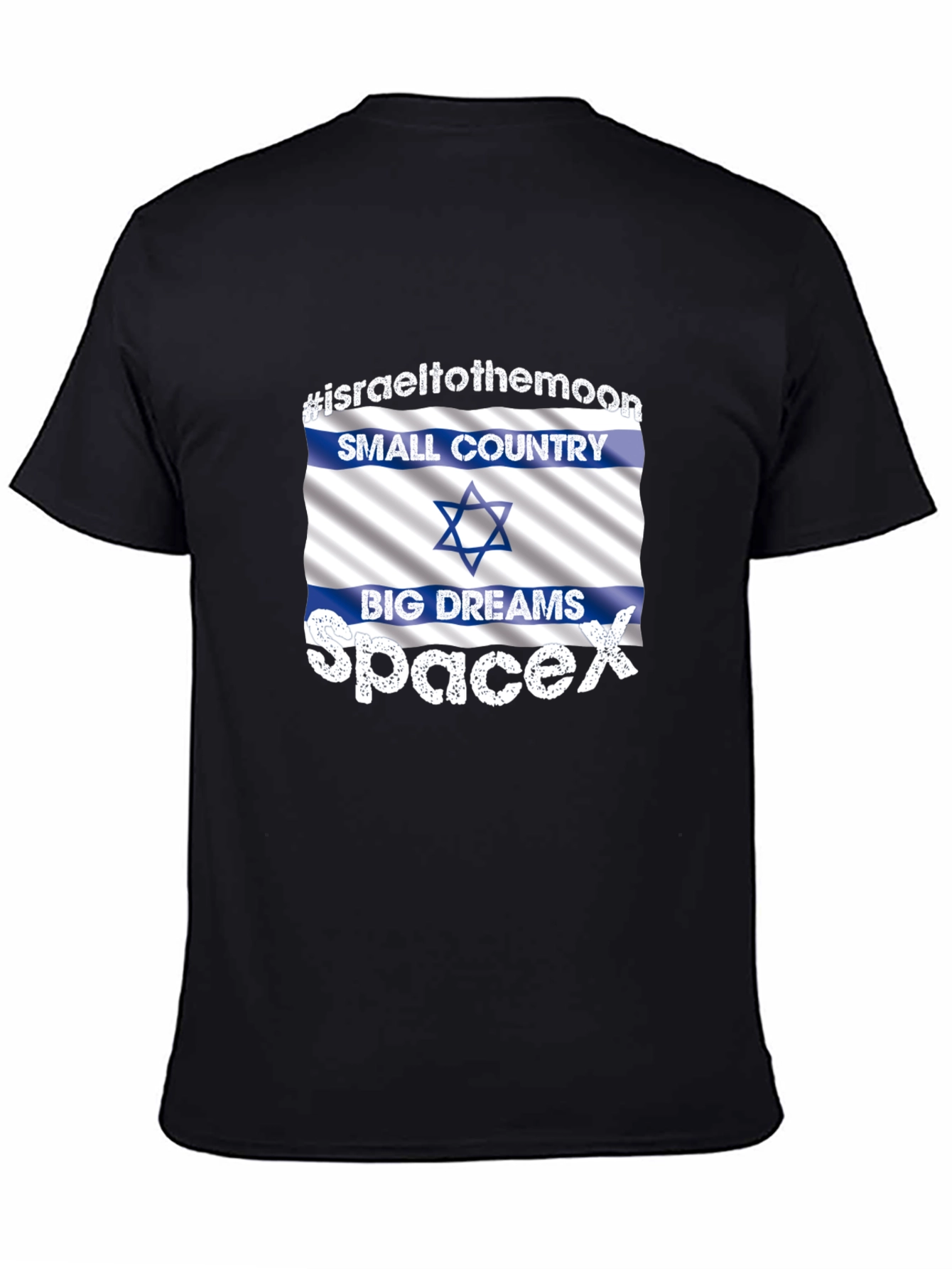 Luce con orgullo esta camiseta negra que celebra la ambición de Israel de llegar a la luna, con un diseño patriótico y futurista. En el centro, la bandera israelí sirve de fondo para las frases "SMALL COUNTRY", "BIG DREAMS" y el logo de "SPACEX", todo en un estilo moderno y atractivo. Perfecta para mostrar tu apoyo a la innovación y la exploración espacial. Ideal para uso diario, eventos especiales o como un regalo original para entusiastas de la ciencia y la tecnología. Confeccionada con materiales de alta calidad para asegurar comodidad y durabilidad.