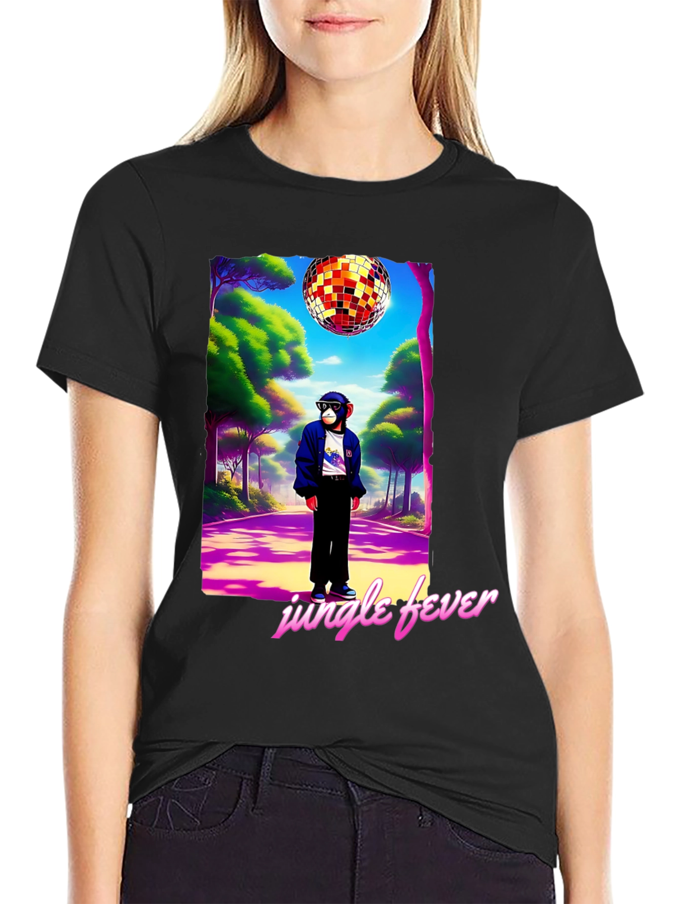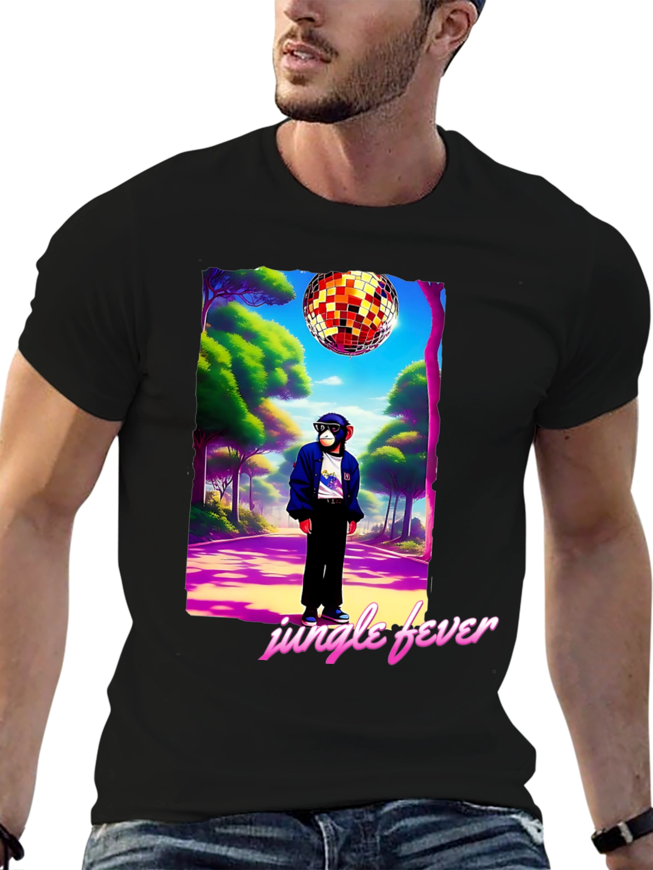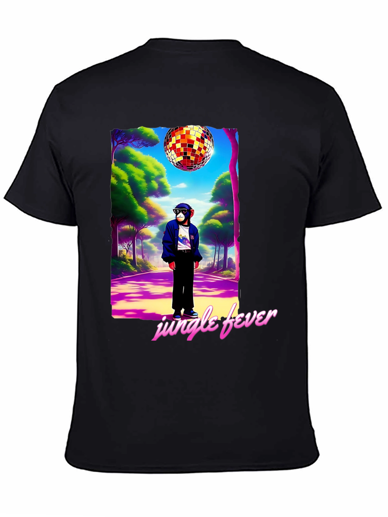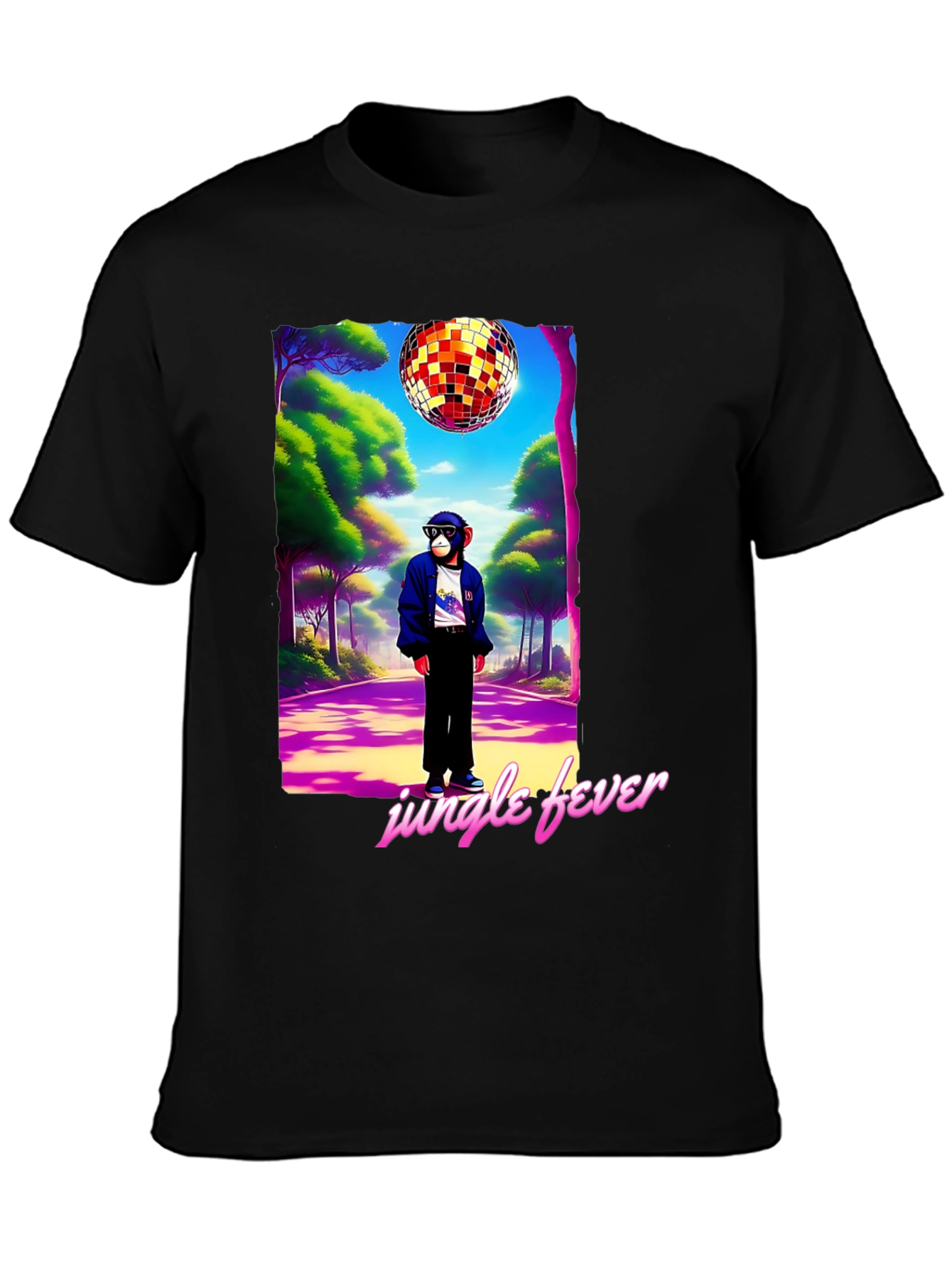 Descubre la originalidad de esta camiseta negra, adornada con un llamativo diseño artístico. En el centro, destaca una ilustración vibrante que evoca una atmósfera de jungla psicodélica, con un mono elegante bajo una bola de discoteca. La inscripción "jungle fever" añade un toque divertido y moderno. Perfecta para quienes buscan expresar su individualidad y estilo único. Confeccionada en un material suave y cómodo, ideal para el uso diario, esta camiseta se convertirá en una pieza clave de tu guardarropa. Combínala con tus jeans favoritos o una chaqueta de cuero para un look casual pero impactante. ¡Atrévete a destacar con esta prenda llena de personalidad!