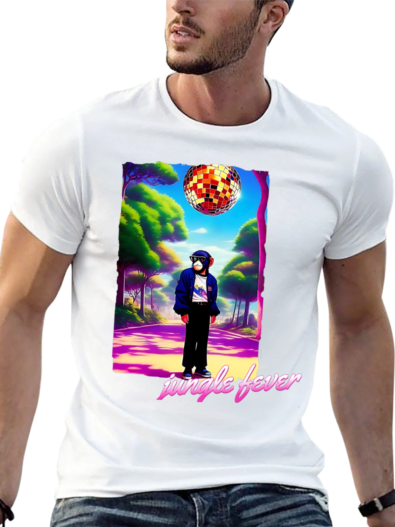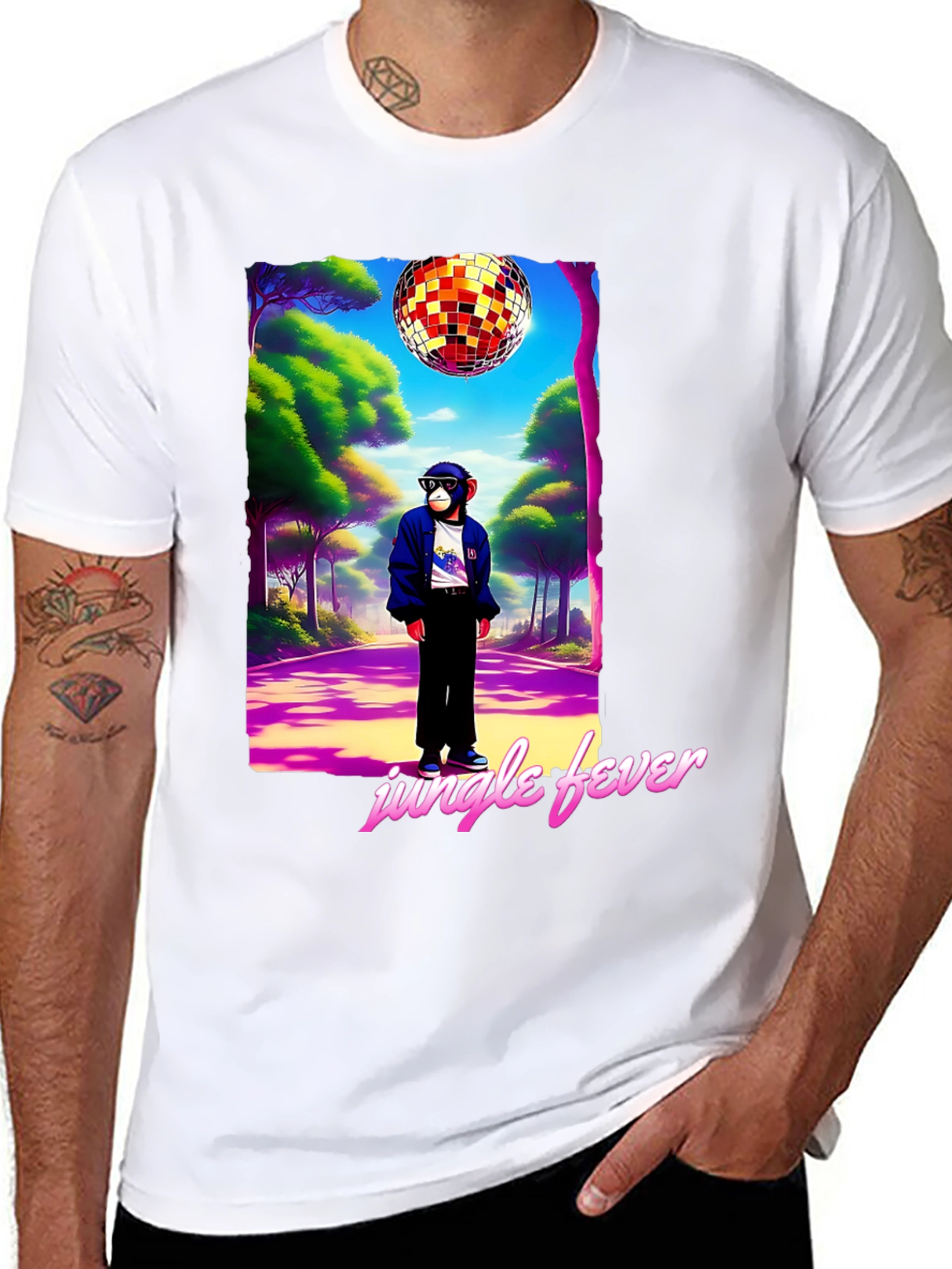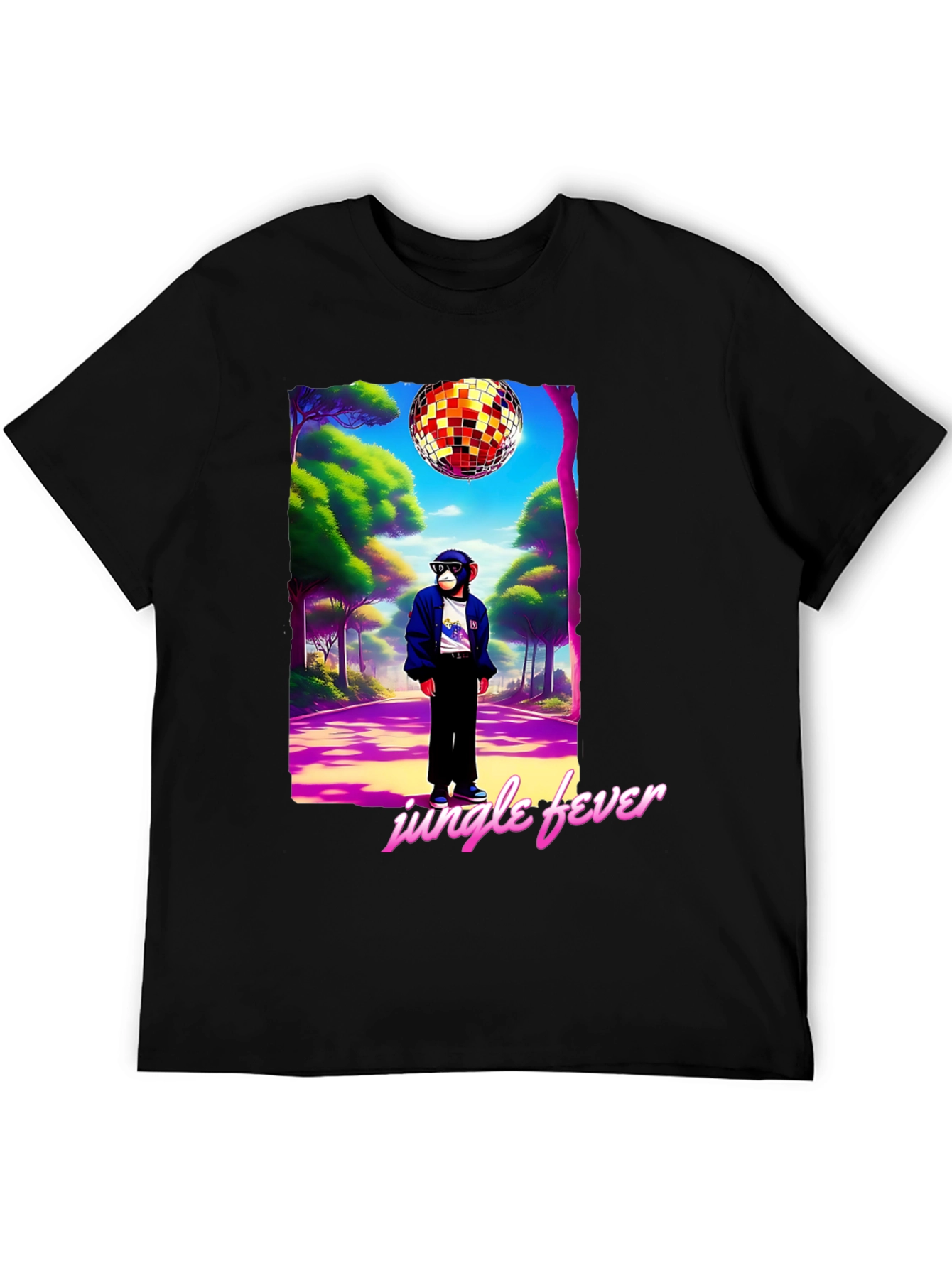 Descubre la originalidad de esta camiseta negra, adornada con un llamativo diseño artístico. En el centro, destaca una ilustración vibrante que evoca una atmósfera de jungla psicodélica, con un mono elegante bajo una bola de discoteca. La inscripción "jungle fever" añade un toque divertido y moderno. Perfecta para quienes buscan expresar su individualidad y estilo único. Confeccionada en un material suave y cómodo, ideal para el uso diario, esta camiseta se convertirá en una pieza clave de tu guardarropa. Combínala con tus jeans favoritos o una chaqueta de cuero para un look casual pero impactante. ¡Atrévete a destacar con esta prenda llena de personalidad!