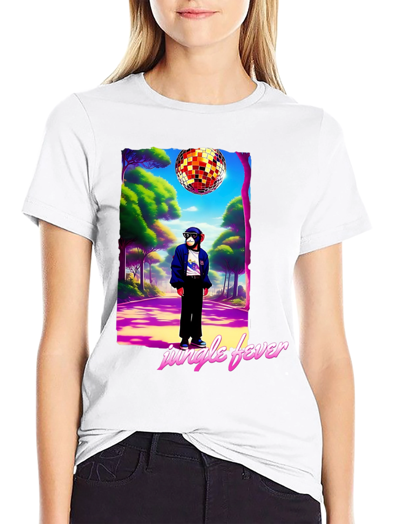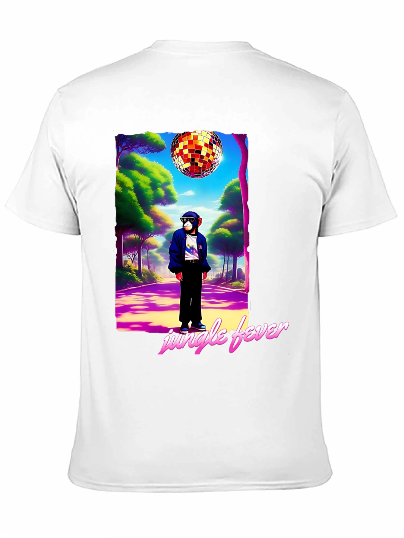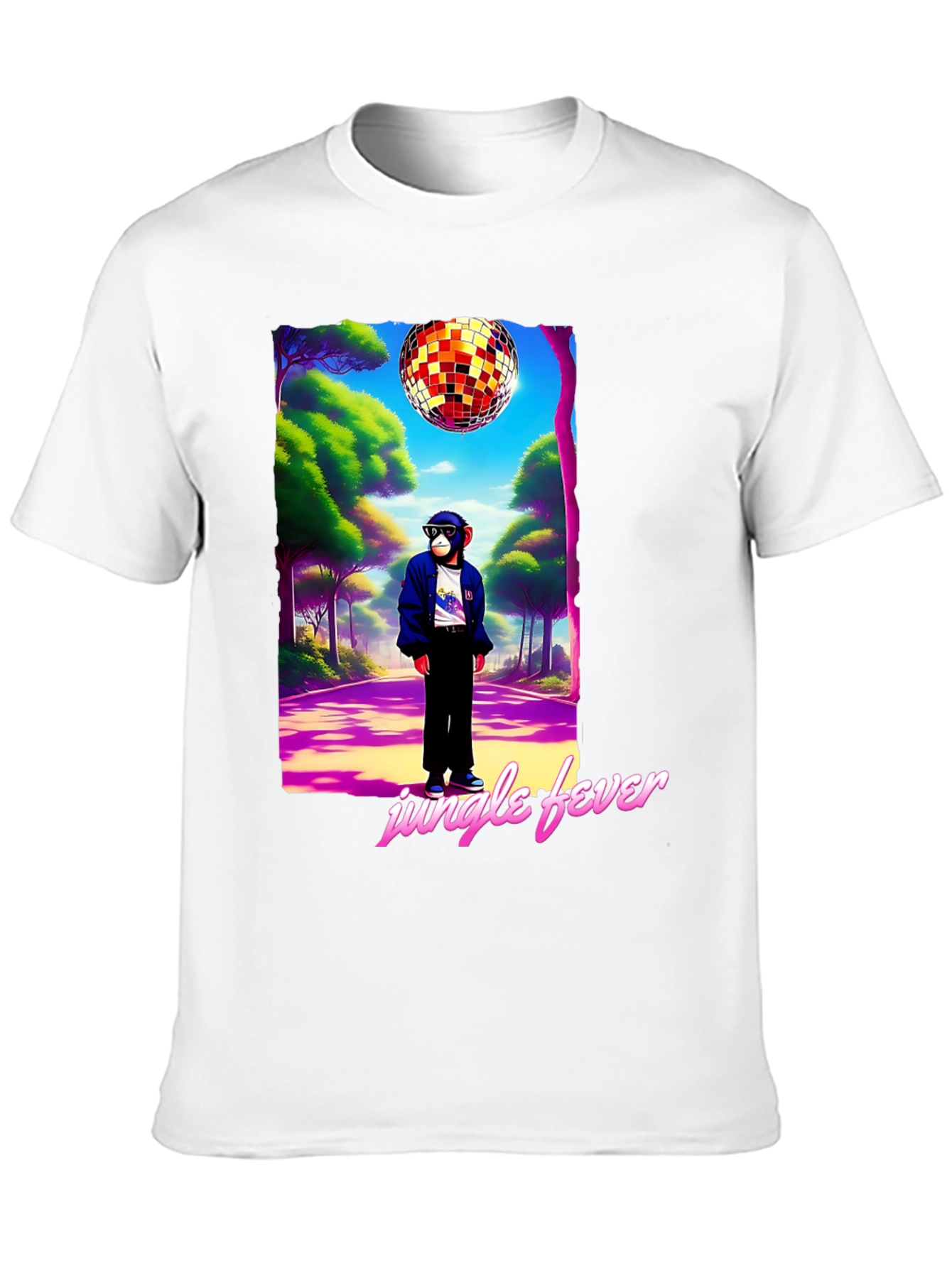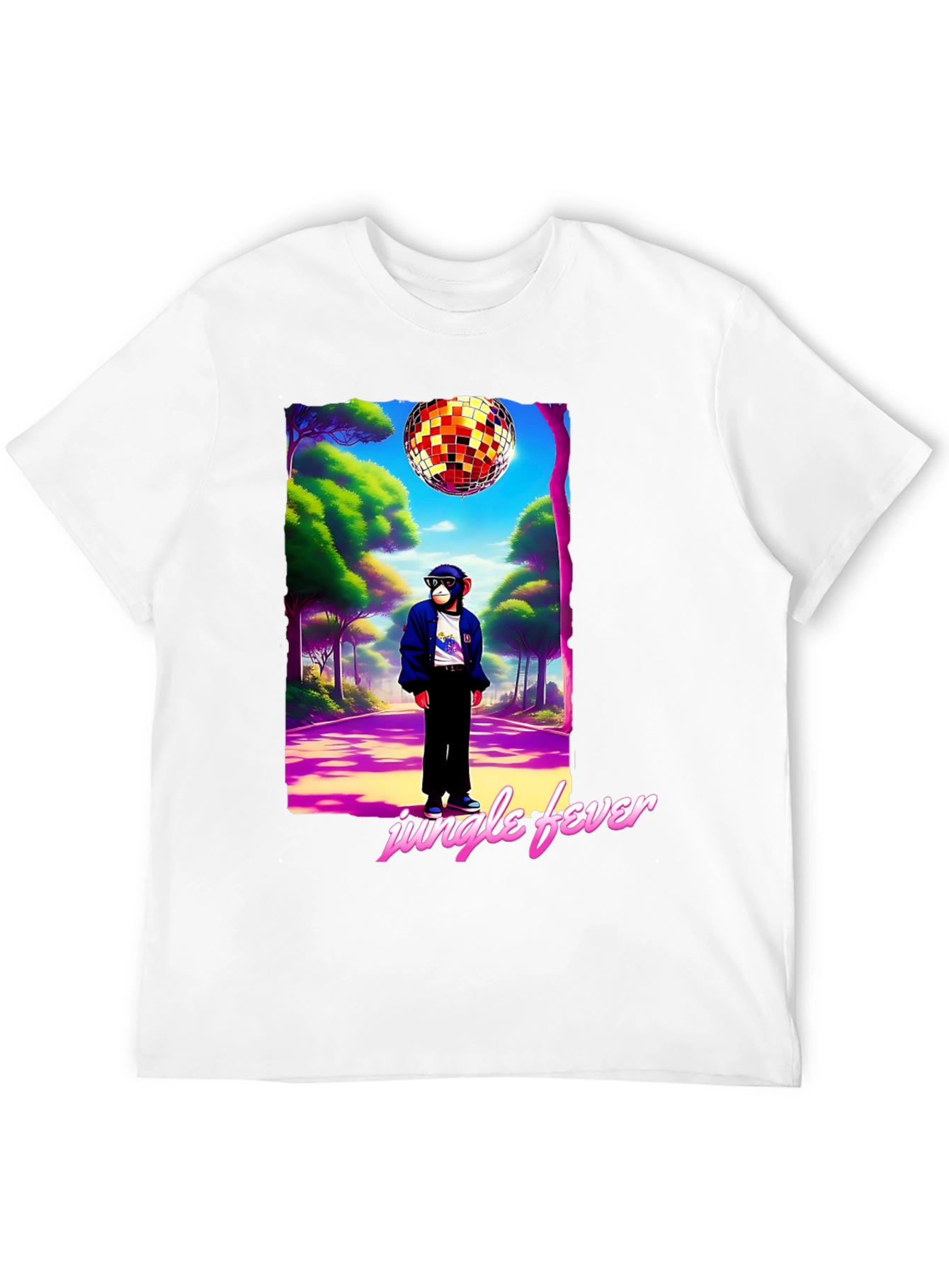 Descubre la originalidad de esta camiseta negra, adornada con un llamativo diseño artístico. En el centro, destaca una ilustración vibrante que evoca una atmósfera de jungla psicodélica, con un mono elegante bajo una bola de discoteca. La inscripción "jungle fever" añade un toque divertido y moderno. Perfecta para quienes buscan expresar su individualidad y estilo único. Confeccionada en un material suave y cómodo, ideal para el uso diario, esta camiseta se convertirá en una pieza clave de tu guardarropa. Combínala con tus jeans favoritos o una chaqueta de cuero para un look casual pero impactante. ¡Atrévete a destacar con esta prenda llena de personalidad!