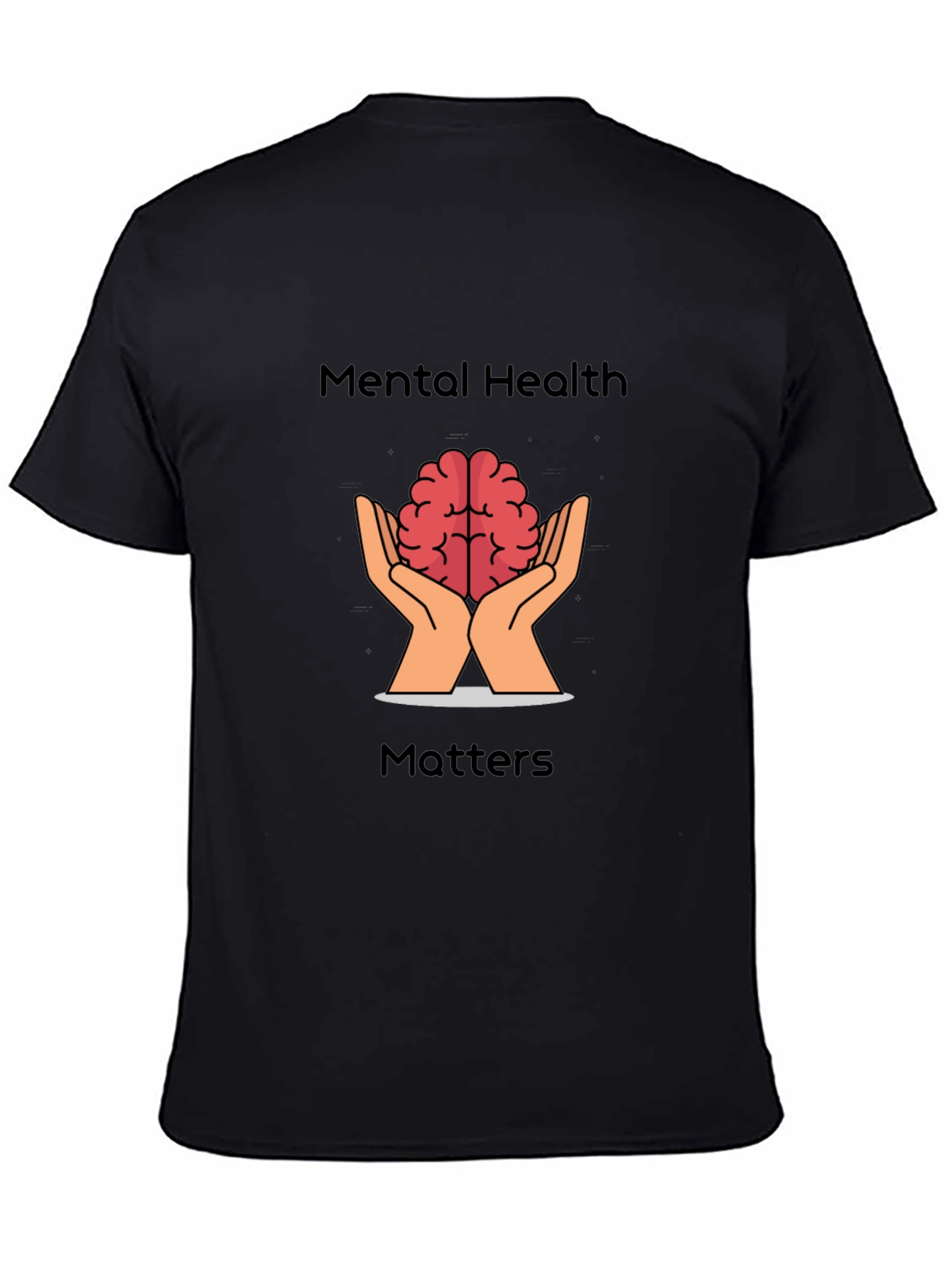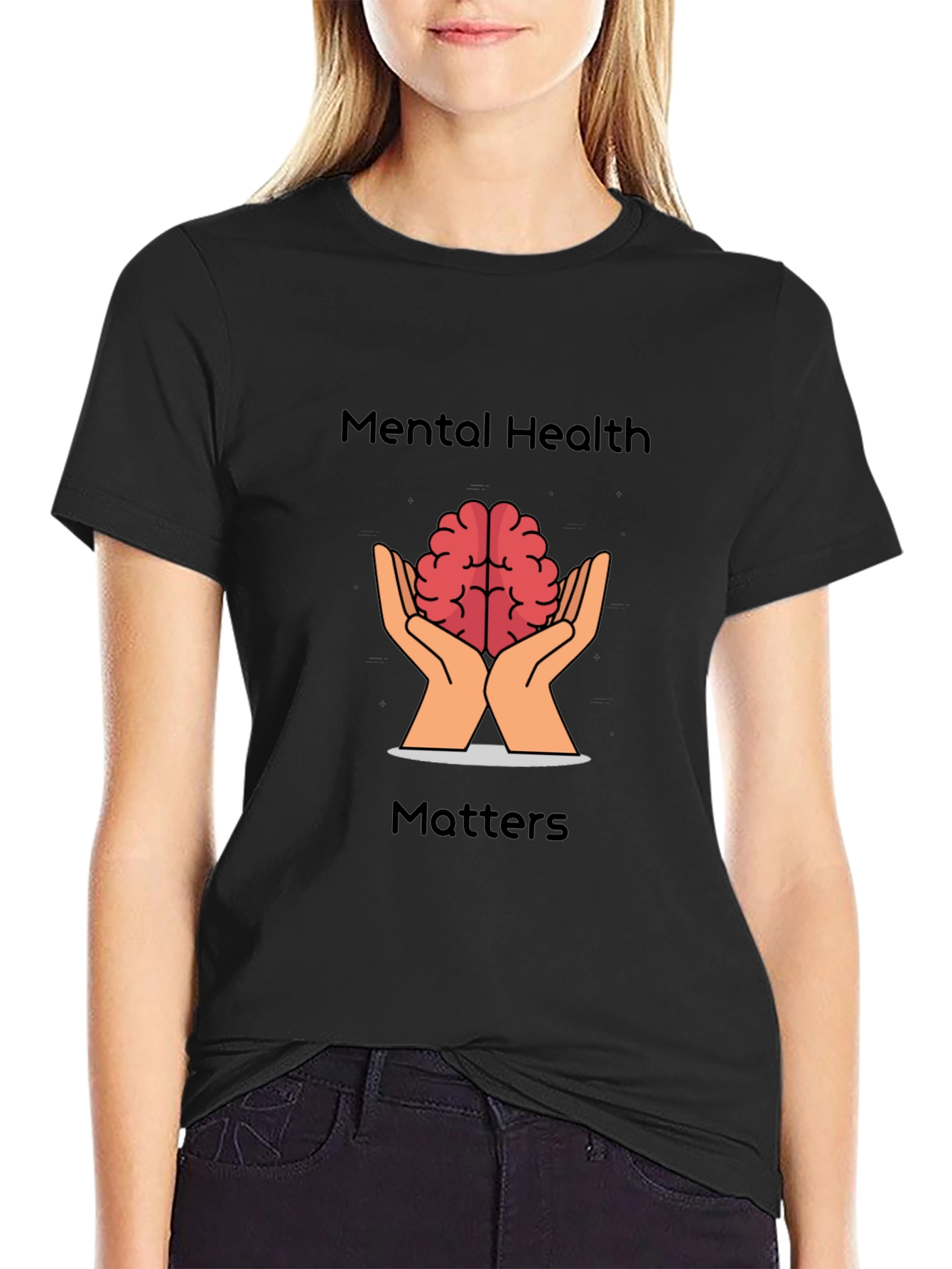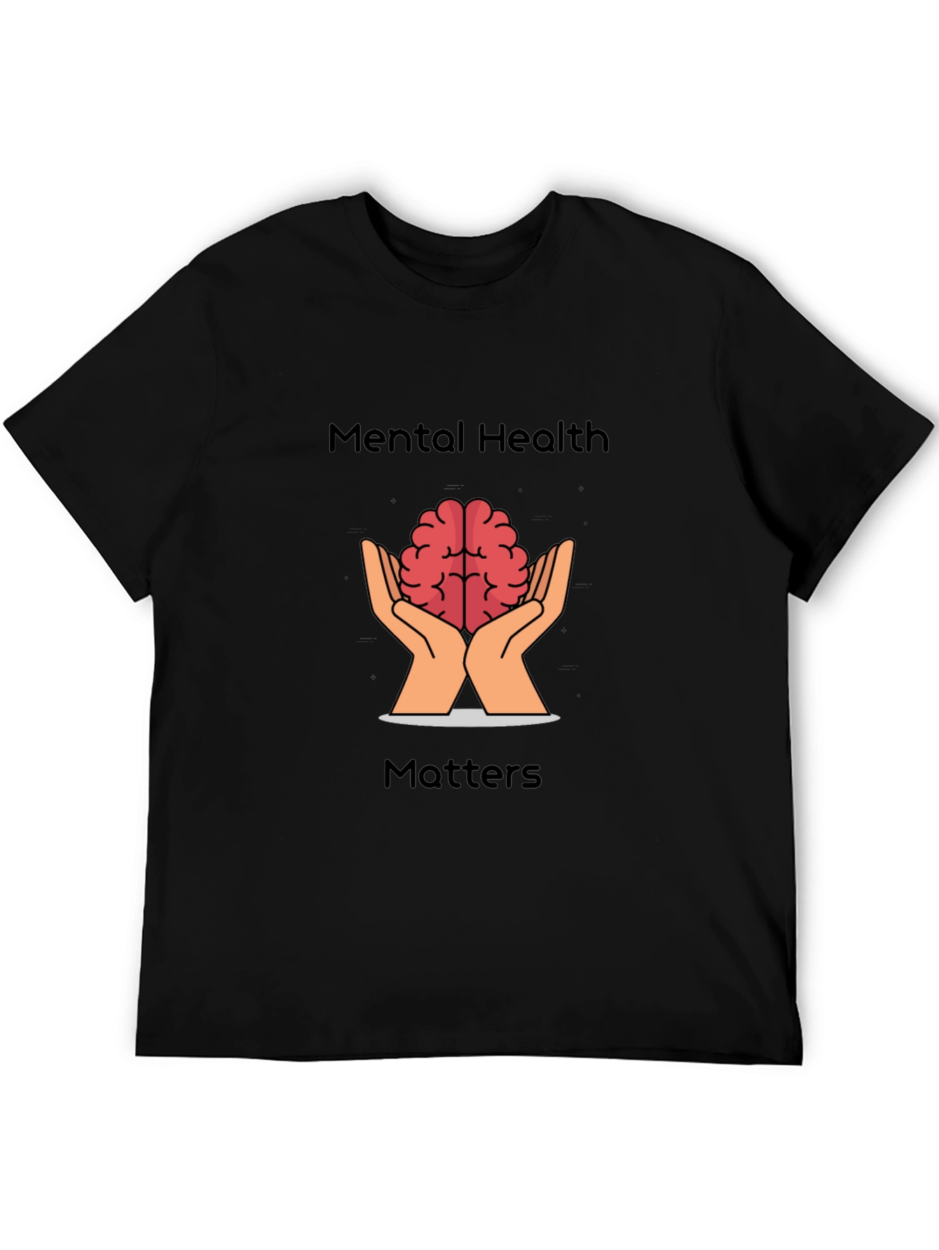 Esta camiseta negra de manga corta presenta un diseño impactante y significativo. En el centro, se muestra un cerebro estilizado de color rojo, sostenido por dos manos color piel, simbolizando cuidado y apoyo. El texto "Mental Health" (Salud Mental) se ubica en la parte superior, mientras que "Matters" (Importa) se sitúa debajo, reforzando el mensaje central. Ideal para crear conciencia y mostrar tu apoyo a la salud mental. Fabricada con un tejido cómodo y suave, esta camiseta es perfecta para el uso diario, eventos benéficos o simplemente para expresar tus valores. Un diseño llamativo y con propósito que seguro generará conversación.