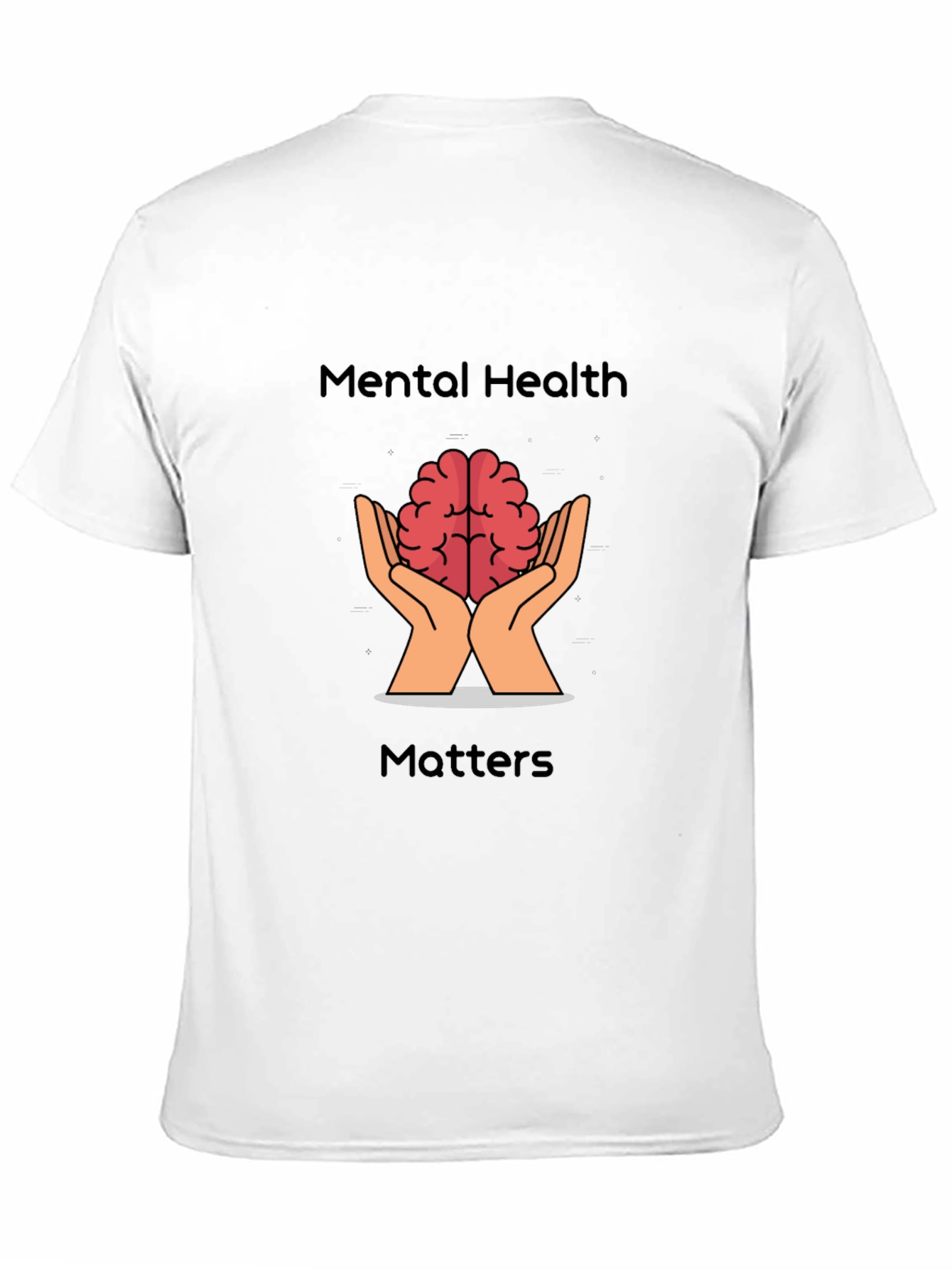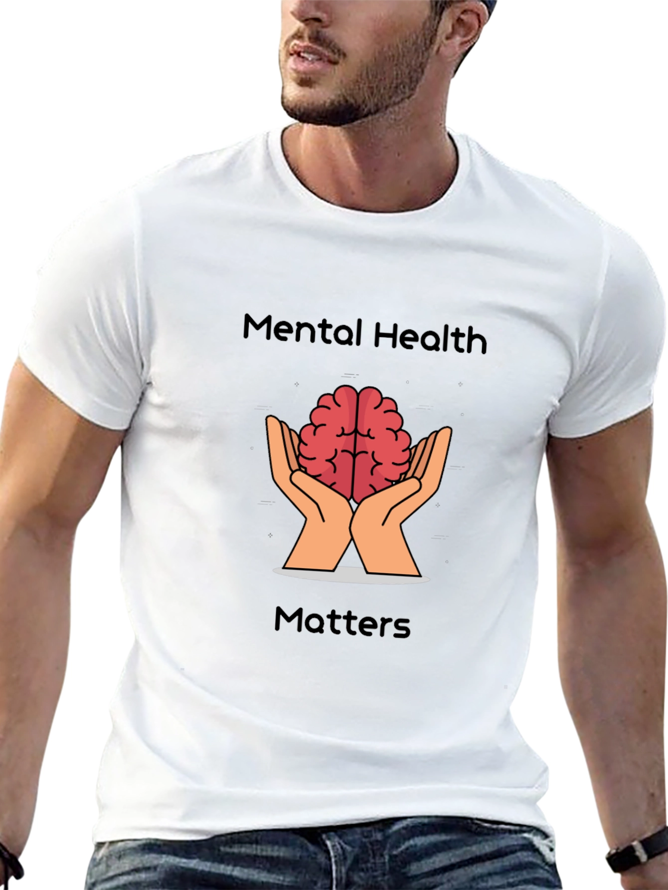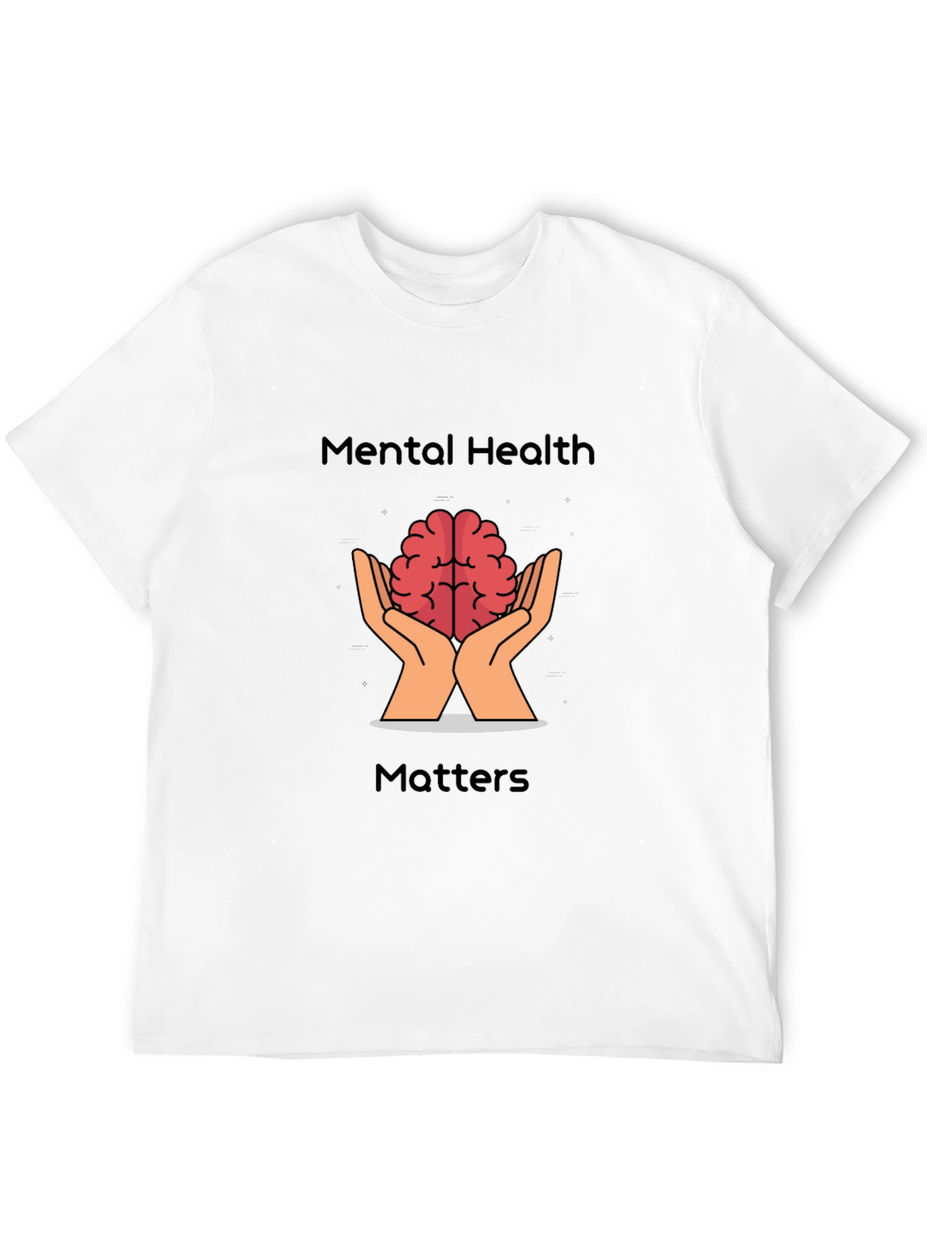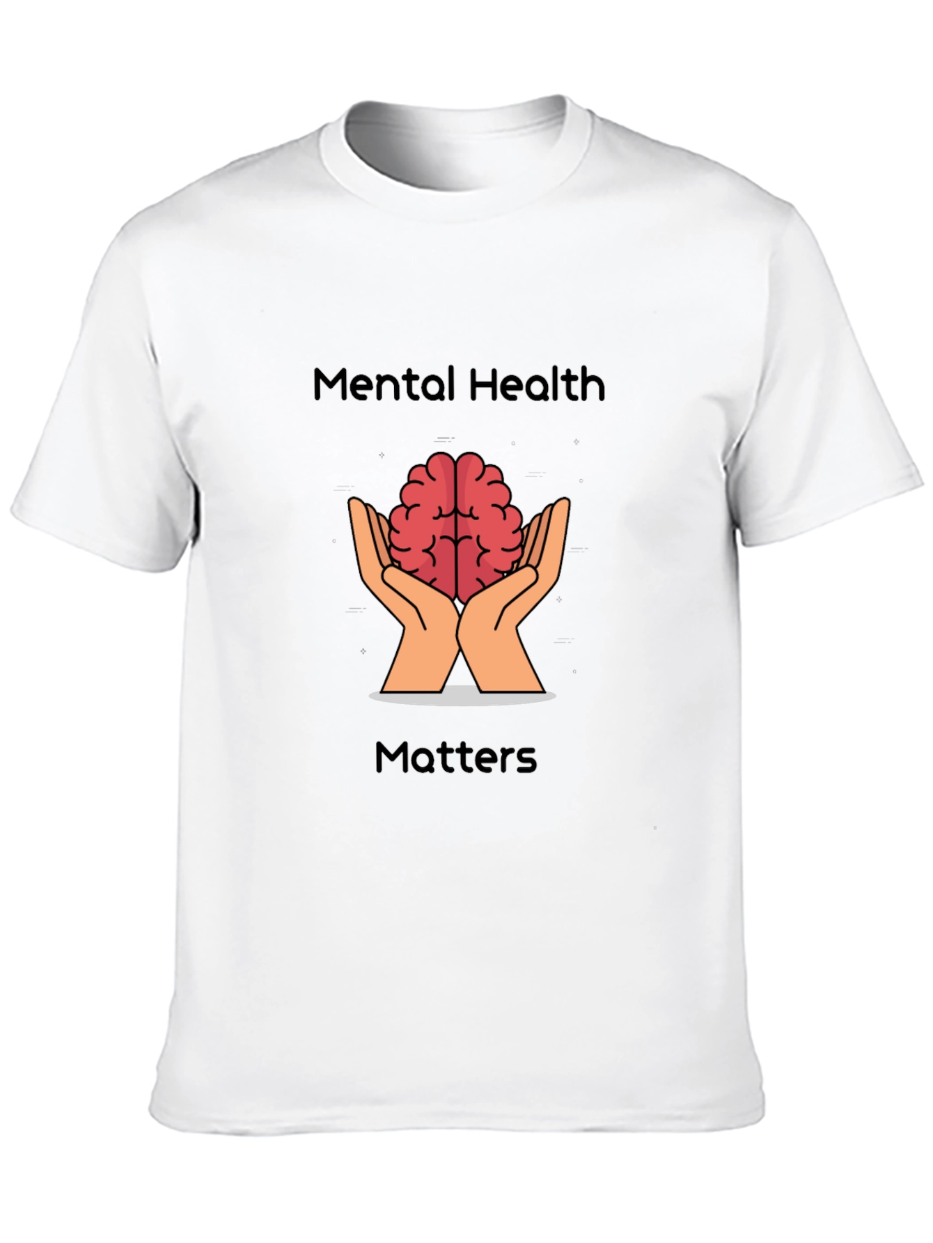 Esta camiseta negra de manga corta presenta un diseño impactante y significativo. En el centro, se muestra un cerebro estilizado de color rojo, sostenido por dos manos color piel, simbolizando cuidado y apoyo. El texto "Mental Health" (Salud Mental) se ubica en la parte superior, mientras que "Matters" (Importa) se sitúa debajo, reforzando el mensaje central. Ideal para crear conciencia y mostrar tu apoyo a la salud mental. Fabricada con un tejido cómodo y suave, esta camiseta es perfecta para el uso diario, eventos benéficos o simplemente para expresar tus valores. Un diseño llamativo y con propósito que seguro generará conversación.