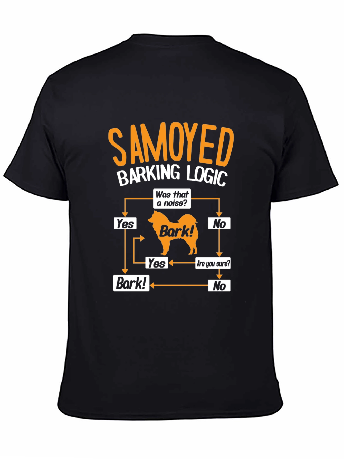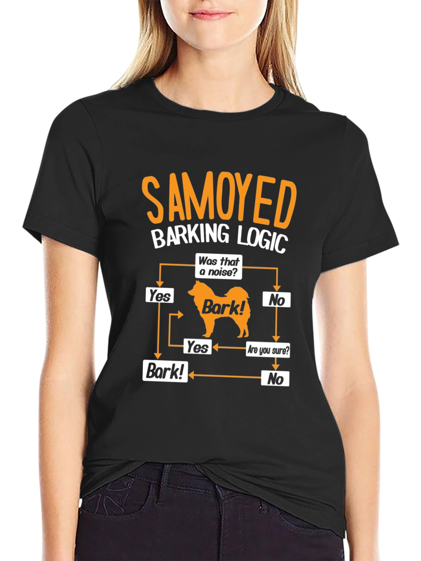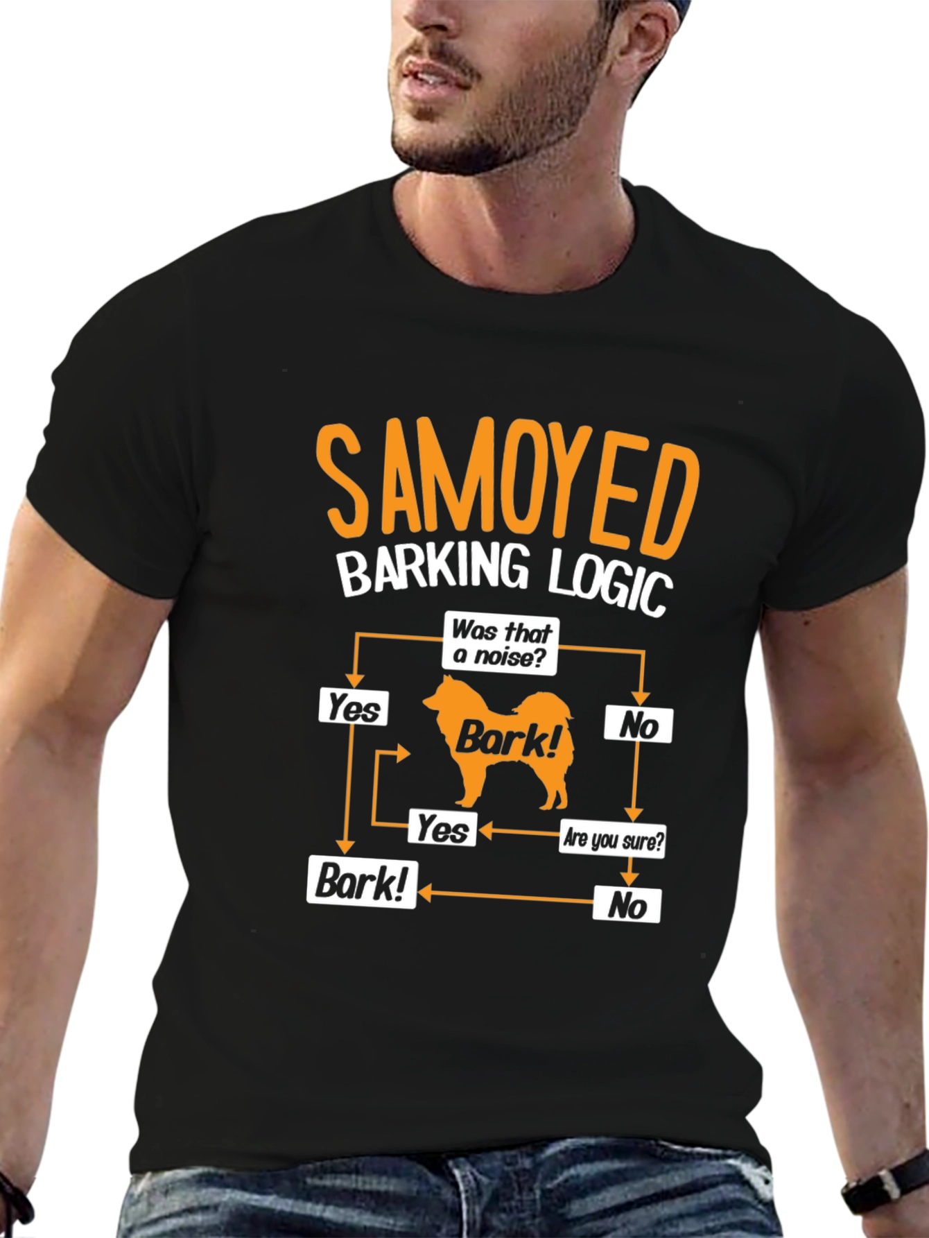 Muestra tu amor por los Samoyedos con esta divertida camiseta negra. Presenta un diagrama de flujo cómico titulado "Lógica de Ladridos Samoyedo" en color naranja y blanco, ilustrando el proceso de pensamiento de un Samoyedo al decidir si ladrar. Perfecta para dueños de Samoyedos, amantes de los perros, o cualquier persona con sentido del humor. Su diseño único la convierte en una excelente opción para usar a diario, paseos por el parque o reuniones informales. ¡Consigue la tuya y presume tu pasión por esta adorable raza!