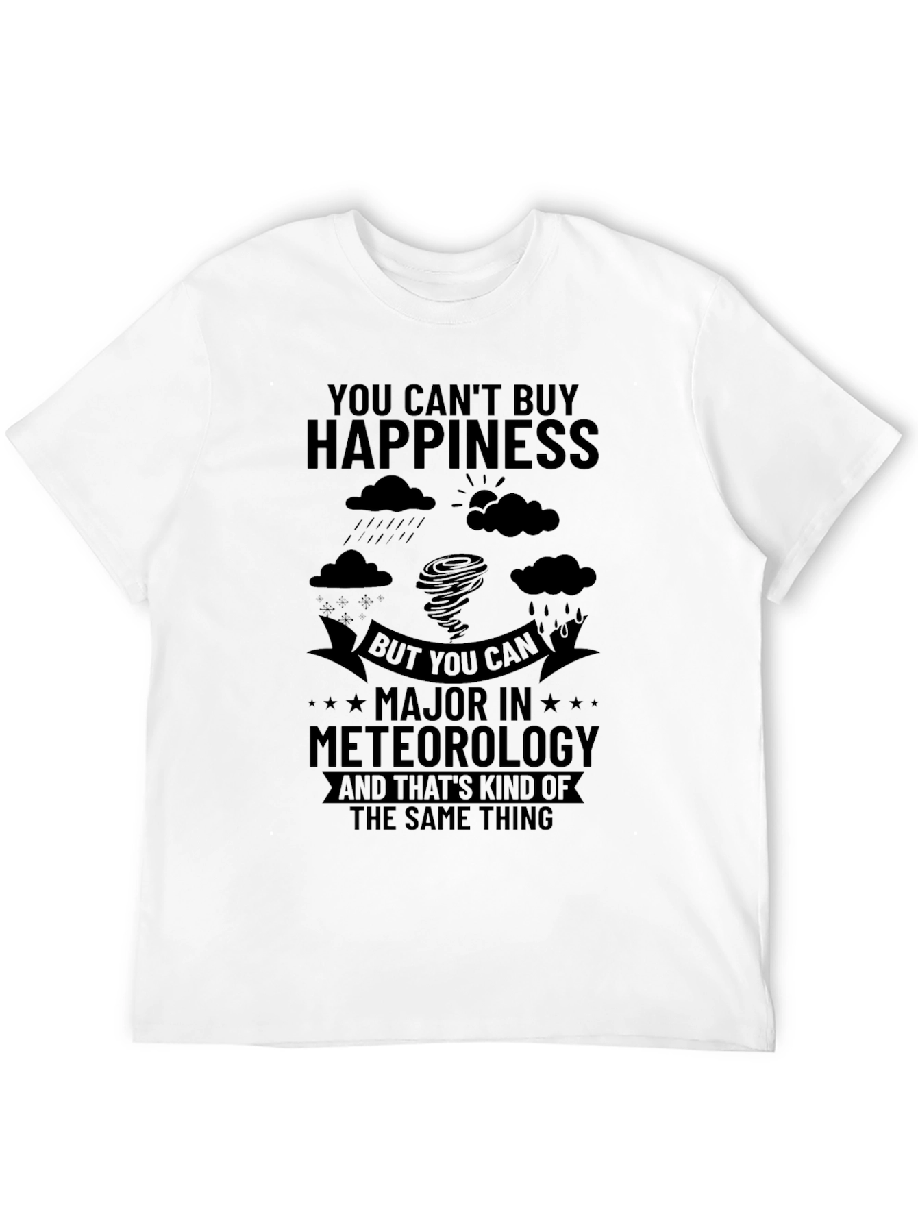 Luce esta divertida camiseta negra que celebra la meteorología. Con un diseño ingenioso que combina imágenes de clima, como nubes, lluvia y un tornado, junto a la frase "You can't buy happiness but you can major in meteorology and that's kind of the same thing", es perfecta para estudiantes, profesionales o aficionados de la ciencia del clima. Su tejido suave y corte cómodo la hacen ideal para el uso diario. Muestra tu pasión por la meteorología con estilo y humor. Una prenda única que te hará destacar y sonreír.
