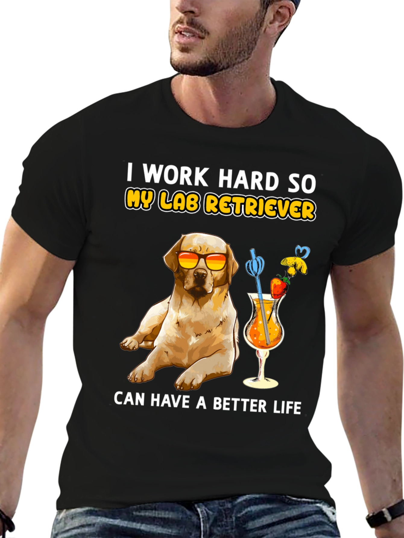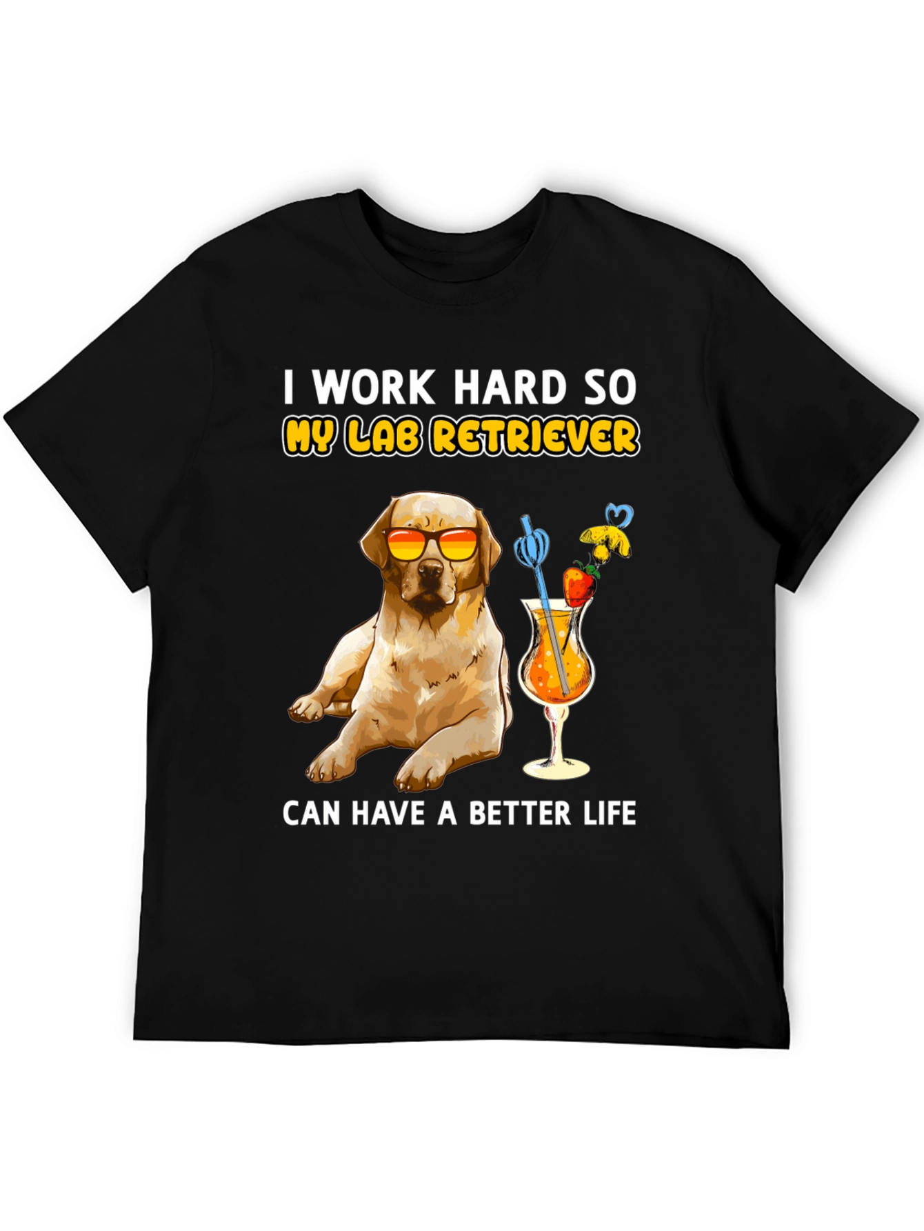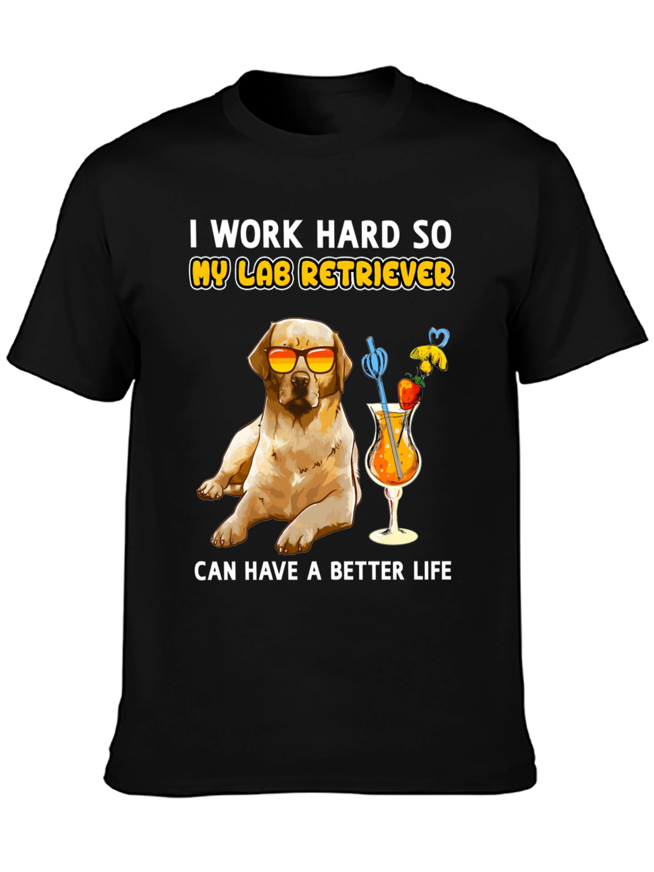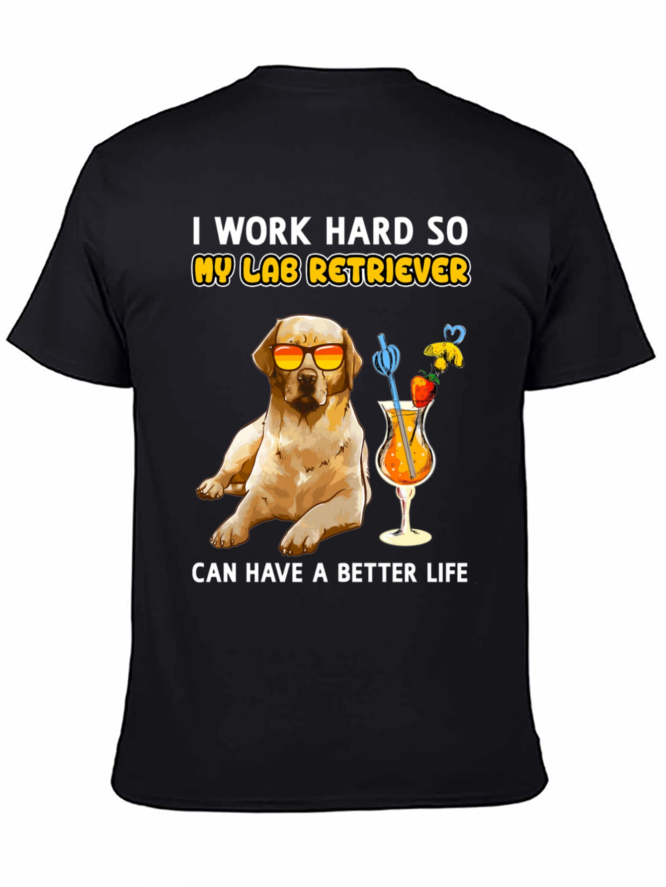 Esta camiseta negra presenta un adorable diseño de un labrador retriever con gafas de sol, disfrutando de un cóctel frutal. La frase "I work hard so my lab retriever can have a better life" (Trabajo duro para que mi labrador retriever tenga una vida mejor) añade un toque divertido. Confeccionada con un tejido suave y cómodo, esta camiseta es perfecta para los amantes de los perros que disfrutan de un estilo relajado y divertido. Ideal para usar en salidas informales, paseos por el parque o simplemente para expresar tu amor por tu mascota. Un regalo perfecto para cualquier dueño orgulloso de un labrador.