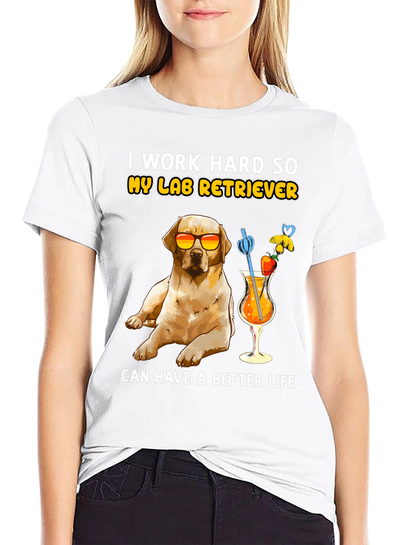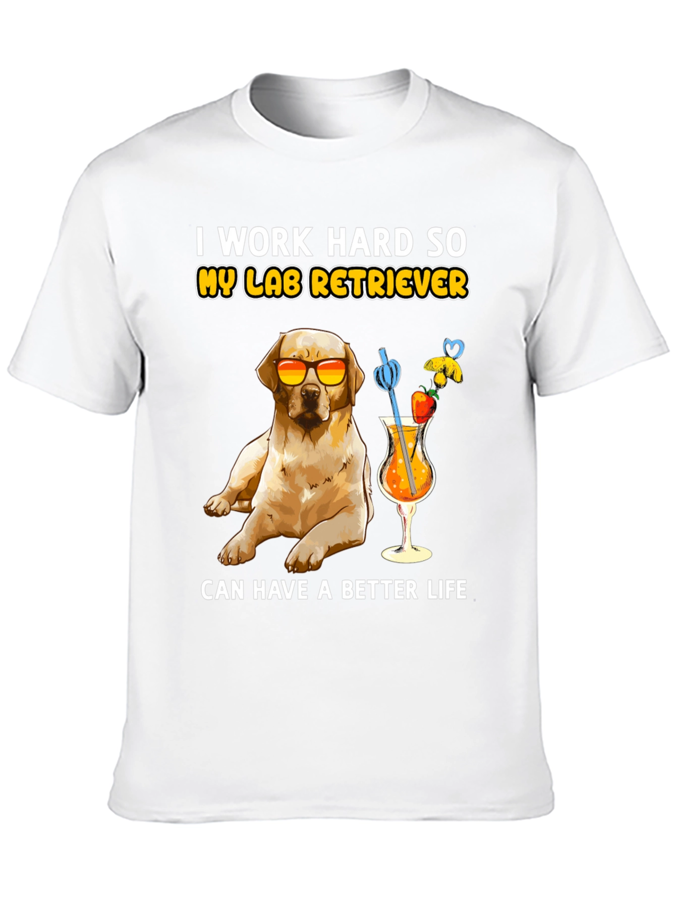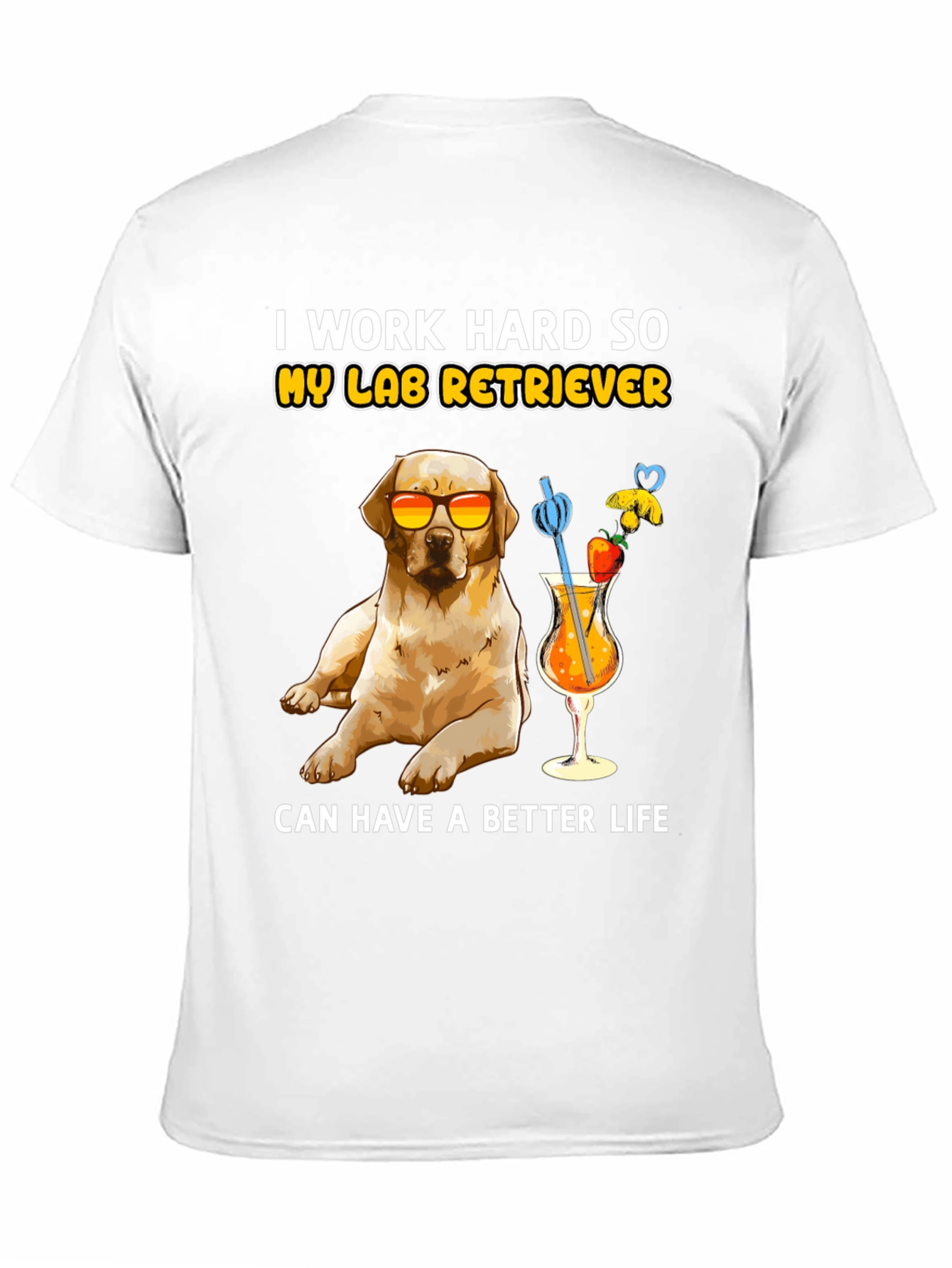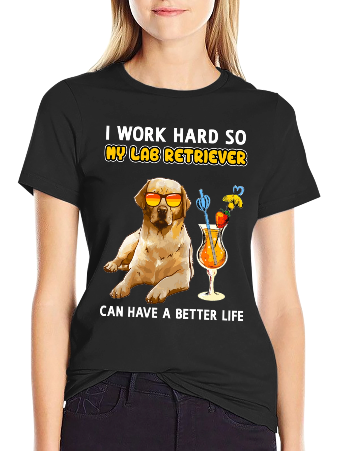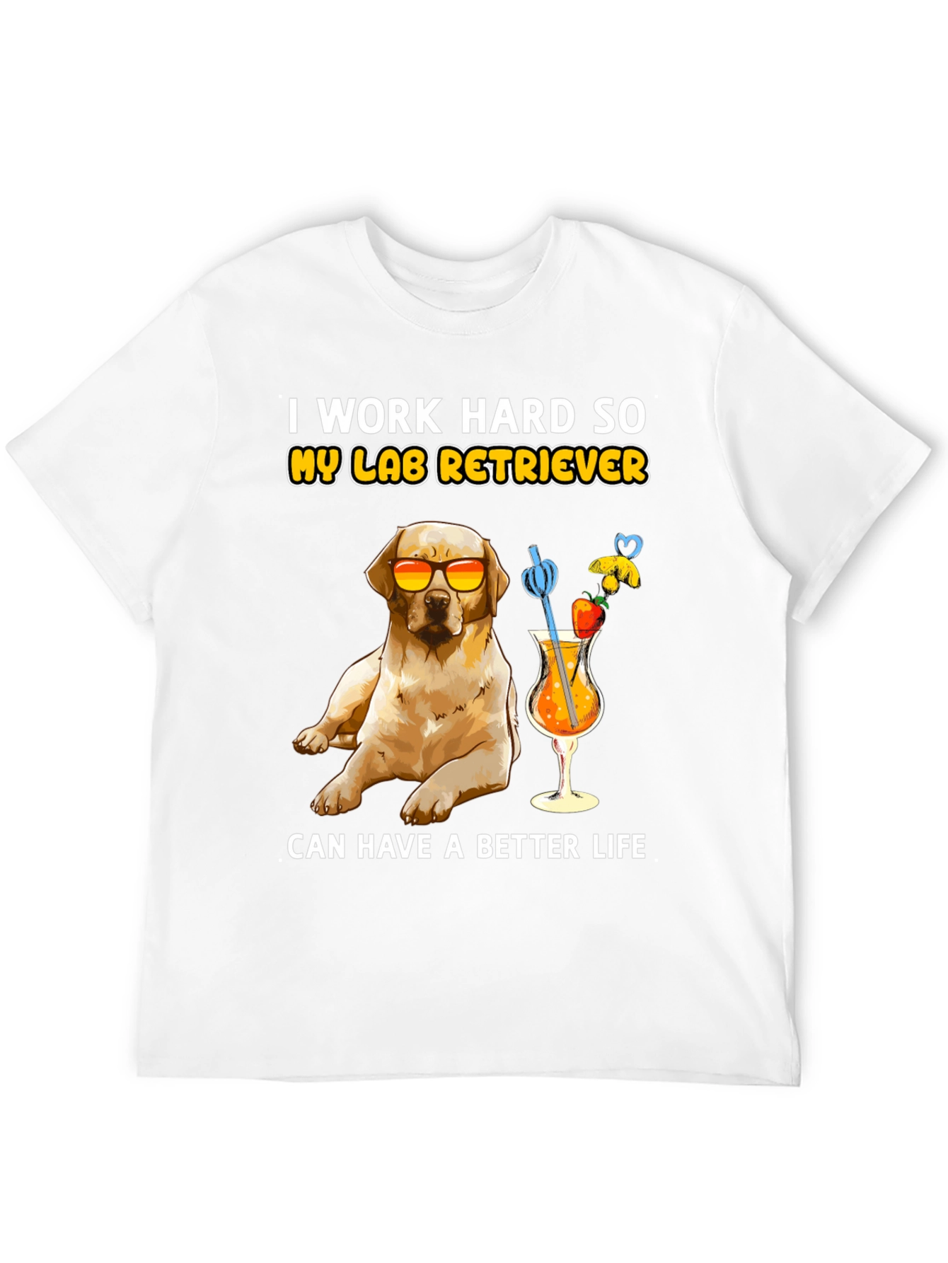 Esta camiseta negra presenta un adorable diseño de un labrador retriever con gafas de sol, disfrutando de un cóctel frutal. La frase "I work hard so my lab retriever can have a better life" (Trabajo duro para que mi labrador retriever tenga una vida mejor) añade un toque divertido. Confeccionada con un tejido suave y cómodo, esta camiseta es perfecta para los amantes de los perros que disfrutan de un estilo relajado y divertido. Ideal para usar en salidas informales, paseos por el parque o simplemente para expresar tu amor por tu mascota. Un regalo perfecto para cualquier dueño orgulloso de un labrador.