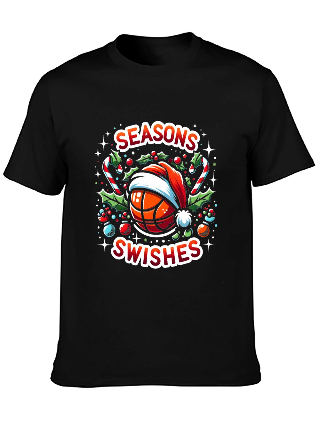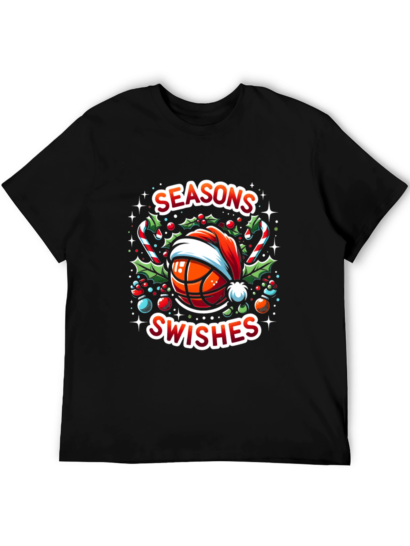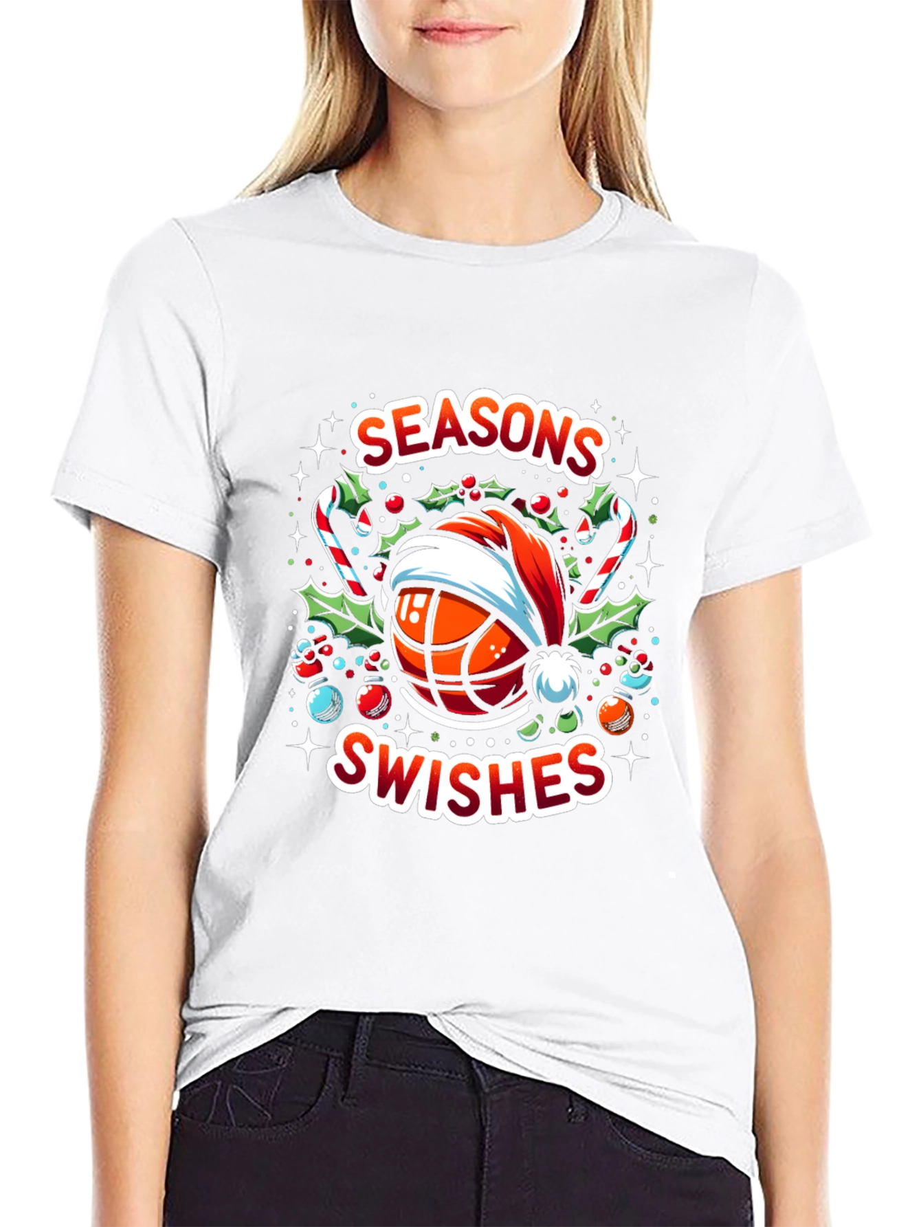 Celebra la temporada navideña con esta divertida camiseta negra. Presenta un diseño festivo que incluye un balón de baloncesto con un gorro de Papá Noel, bastones de caramelo y adornos navideños. La frase "Seasons Swishes" añade un toque deportivo y alegre. Perfecta para los amantes del baloncesto que desean mostrar su espíritu navideño con estilo. Ideal para usar en fiestas navideñas informales, entrenamientos de baloncesto temáticos o como un regalo original para un fanático del baloncesto. ¡Destaca en estas fiestas con esta camiseta única y llena de espíritu navideño!
